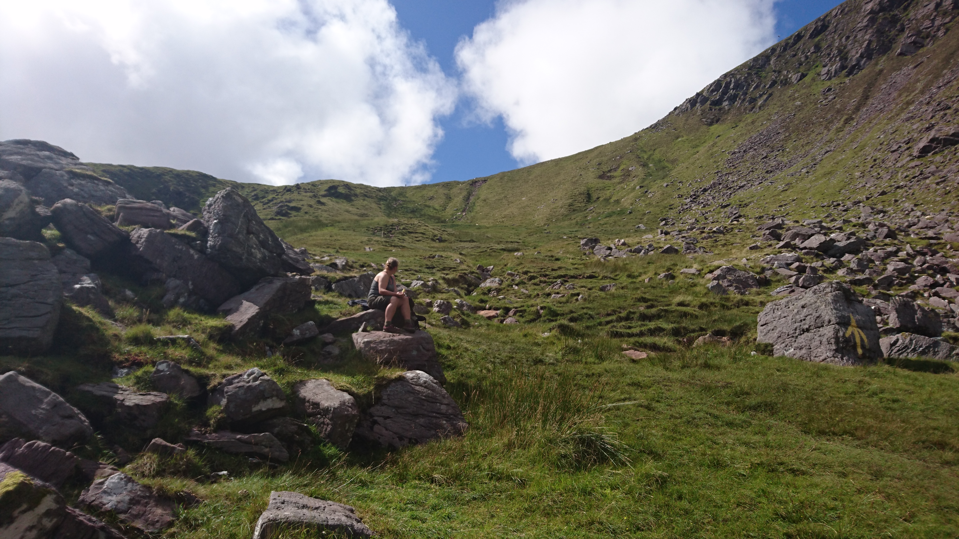 650m geht es hinauf auf ein Joch unterhalb des Mt. Brandon, der mit seinen 950m durchaus eine imposante Erscheinung hier ist. Irgendwann wird es kalt, windig und wir können die Wolken anfassen. Es ist glasklare Luft heute und wir können bis Skellig Michael zurückblicken, wo wir vor mehr als einer Woche in Waterville bereits waren. Auf der Kimme schließlich offenbart sich uns die komplette nördliche Küste bis hinunter nach Tralee, wo der Dingle Way offiziell beginnt und endet. Ich kann genau sehen, wo es morgen und übermorgen langgeht. Gewaltig sieht das aus. Auf meinem Gerät sieht die Halbinsel immer so klein und berechenbar aus. Zwei Wanderpärchen, die uns gestern schon begegnet sind, überholen uns, beide Mitte 20. Beim einen Pärchen käbbelt er sie, bis sie genervt ist. Er hingegen kann es überhaupt nicht ab, wenn sie ihn antreibt, weil er zu langsam ist. Da wird er zickig und fühlt sich gegängelt, vor allem in unserer Hörweite hat sie das bitte zu unterlassen. Wir lassen sie schön überholen. Das zweite Pärchen macht uns konditionstechnisch mal so richtig einen vor. Beeindruckend, wie schnell sie den Bergkamm erreichen. Sie ist drahtig und trägt eine von diesen Cheerleader-Hotpants, die eine ganze Menge Bein preisgeben. Viele kleine Irinnen haben die hier auch an, egal wie kalt es ist, egal wie stark der Regen peitscht. Der Unterschied ist, sie hier oben hat dafür die adäquate Siebenmeilenarchitektur, die 2m lange Schritte offensichtlich zulässt, so schnell wie sie vor uns hochmarschiert. Ihr Begleiter ist ein Vollbart-Bär mit ein paar Rock-am-Ring-Bändern am Handgelenk, der ihr in Sachen Kondition in keinem Deut nachsteht und uns wieder ein schnelles "Hi folks! How're ewe doin'?" zuschmettert. In so perfektem irischen Stil macht er das, dass er sich schon gestern beim ersten Mal beim Stop&Shop sofort als deutscher Student enttarnt hat. So irisch grüßt kein Ire. Es wirkt abgeguckt lässig. Sag nächstens doch "Hello!" und ich kann dich als einen der Iren annehmen, denk ich mir.
