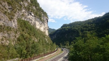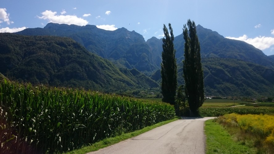 Fahrrad hochschieben kann seeeehr anstrengend und schweißtreibend werden. Da zahlen sich jetzt Frances Zumba und mein Gejogge aus. 3 Liter Wasser leichter kommen wir langsam und gemächlich an. Was uns erwartet entschädigt für das gestrige Ende. Das Tal ist schmal, gesäumt von Laubwäldern und Pinien und ein glasklarer Fluss plätschert durch viele kleine Dörfchen, die so ganz anders aussehen als in Südtirol. Dass Trentino, Südtirol und Tirol mal eins waren, würde ich nicht vermuten. Kaum zu glauben, dass bis in die 60er noch von beiden Seiten der Grenze Anschläge und Widerstand geführt wurde, um Tirol wieder zu vereinen. Die Europaregion Tirol und die EU haben das kulturell wie wirtschaftlich eigentlich überflüssig werden lassen. Hoffentlich weiß das der ein oder andere Wutbürger zu schätzen.