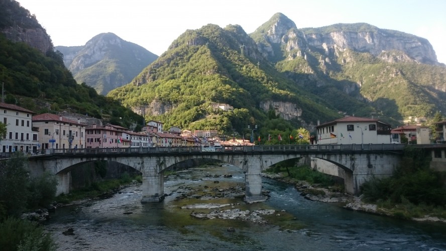 An vielen Stellen kann man in den Fluss springen. Es ist herrlich. Der Radweg mündet schließlich in die alte Hauptstraße, die sich als überbreiter Radweg bis Bassano schlängelt, während die eigentliche Schnellstraße zumeist irgendwo in den Bergen verläuft und der Verkehr so aus dem Tal verbannt wurde. Kurz vor Bassano machen wir Verschnaufpause. 90km sind wieder gefahren. Wo ist eigentlich unser Hotel? Fragen wir doch mal in diesem Hotel... Oh, das ist ja unser Hotel. Hehe. Sehr gut, wir Glückseligen wir. Eine lautstarke italienische Fahrradgruppe macht vor dem Hotel ein hochambitioniertes Workout. Biker willkommen. Und alles wird gut, was gestern doof war. Da ist er. Mein super edler Saunabereich! Alles meins!.... Denkste. Die italienische Gruppe takes part of the experience. Wir haben unseren Spaß. 12 Italiener entdecken lautstark Sauna. Wie geht das? Warum ist das denn so heiß? Kann man hier sonst nur liegen oder duschen? Nur drei Plätze in der Sauna. Wir sind aber 12! Na dann stellen wir uns halt rein. 12 Italiener stehen tropfnass in der Sauna wie Schüler morgens in der überfüllten E9 Hauptbahnhof. Dann eine Dusche mit Minzgeschmack in blauem LED Schein. Uuuuuuuh die ist aber kalt! Ooooooh! Aaaaaah! Frances flüchtet. Ich beömmel mich noch etwas. Und dann auf zum Pizza essen. Man kann ja nachts nochmal rein und die Minzdusche leertrinken.