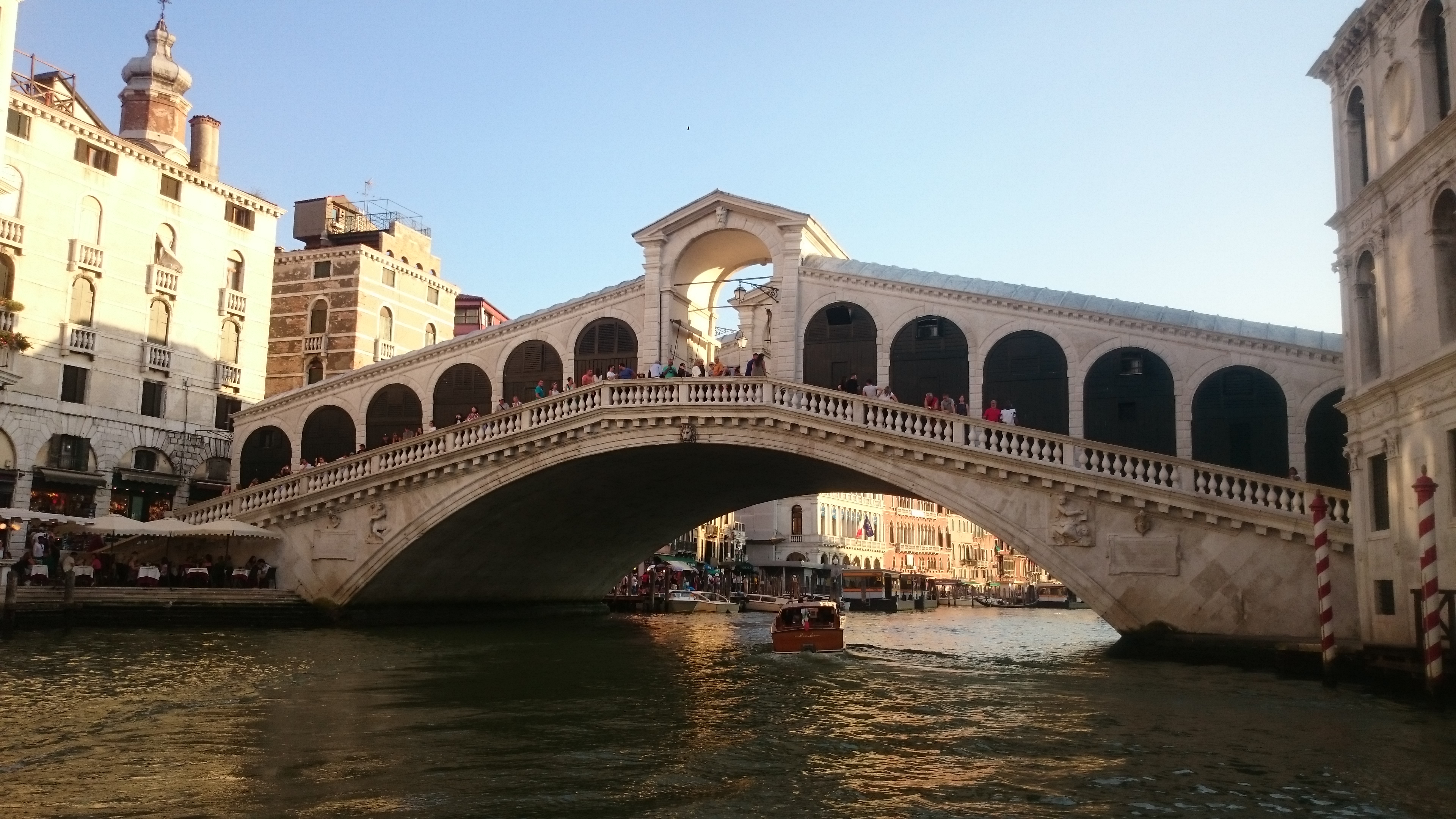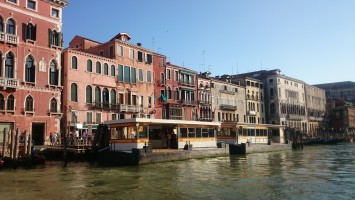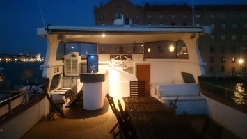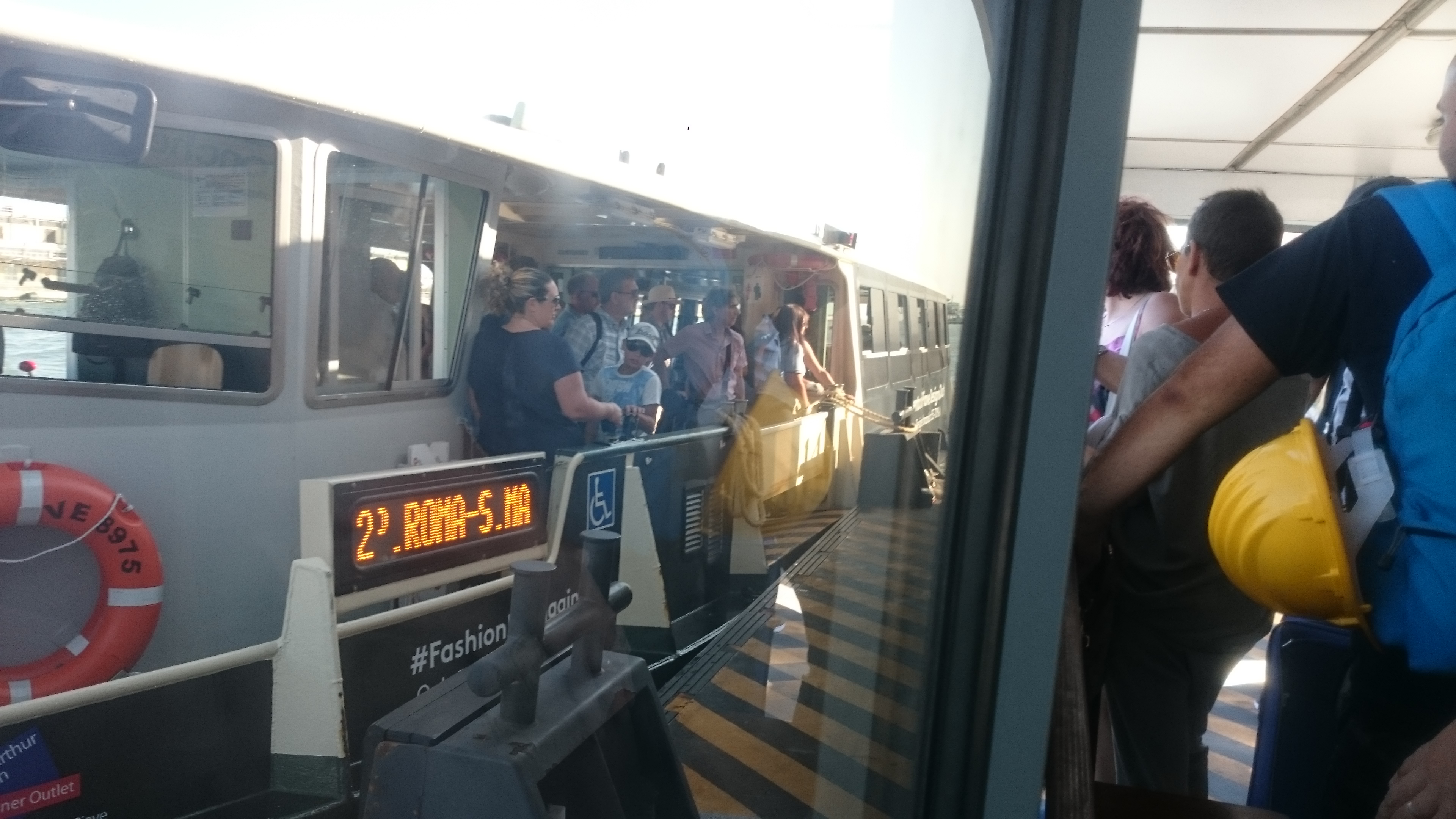Aber wir müssen noch rüber! Mit Fahrrad ein Desaster. Man kommt nicht drauf. Die Team nimmt uns nicht mit. Per Zufall entdecken wir neben der Schnellstraßenauffahrt einen halbfertigen Fahrradweg, der schließlich neben der Straße hinüberführt. Wow. Muss man wissen. Wir mussten erst wieder ein Stück Autobahn fahren, um das zu begreifen. Dann ein übergroßes Ortsschild. Venezia. Wir sind da. Uns begrüßen Parkhäuser. Fahrrad abstellen. Nur wo? Im Parkhaus nicht erlaubt? Na toll. Wir Deppen sind die einzigen mit Fahrrad hier? Bei einer Wasserbushaltestelle namens Tronchetto werden wir fündig. Ein schmaler Streifen. Hier sollen wir das anketten? Mir ist etwas mulmig dabei. Aber gut. Wir kaufen Zweitagestickets für die Wasserbusse. Die Linie 2 soll uns direkt zu unserem "Zuhause" auf der Isola Sacca Fisola führen. Nur eine Station! Wir steigen ein. Entgegengesetzte Richtung. Egal. Warum nicht. Und so schippern wir 1,5 Stunden in der Abendsonne von Station zu Station über den Canale Grande bis zur vorgelagerten Insel Lido und zurück. Wir sind beide ziemlich platt. Venedig ist doch schon ganz schön anders als alles Andere. Wir müssen das alles erstmal aufsaugen und verarbeiten. Es ist sowieso schon eine eigenartige Vorstellung, hoch aus den Alpen hier runter geradelt zu sein. Und so kommen wir in der Dämmerung gut durchgeschaukelt auf der Isola gegenüber der Hauptinsel an. Das "normale" venezianische Volk scheint hier zu wohnen. Normale Mietshäuser. Viele alte Menschen. Und an einem Steg am Rand festgetäut, die Sarah Island, unser Ziel. Wir haben uns auf einer kleinen Yacht eingemietet. Fand ich viel schöner als ein schnödes Hostel irgendwo in einer engen Gasse. Hotels sind momentan unbezahlbar mit 250 Euro und aufwärts. Wenn man mit dem Schaukeln klarkommt, hätte man aus meiner Sicht kaum gemütlicher in Venedig unterkommen können. Und so haben wir uns bis Nachts mit Käse und Weintrauben vom Supermarkt gegenüber auf der Hauptinsel eingedeckt aufs Deck gekuschelt und Schiffen beim Schaukeln zugeschaut, bis wir müde wurden.