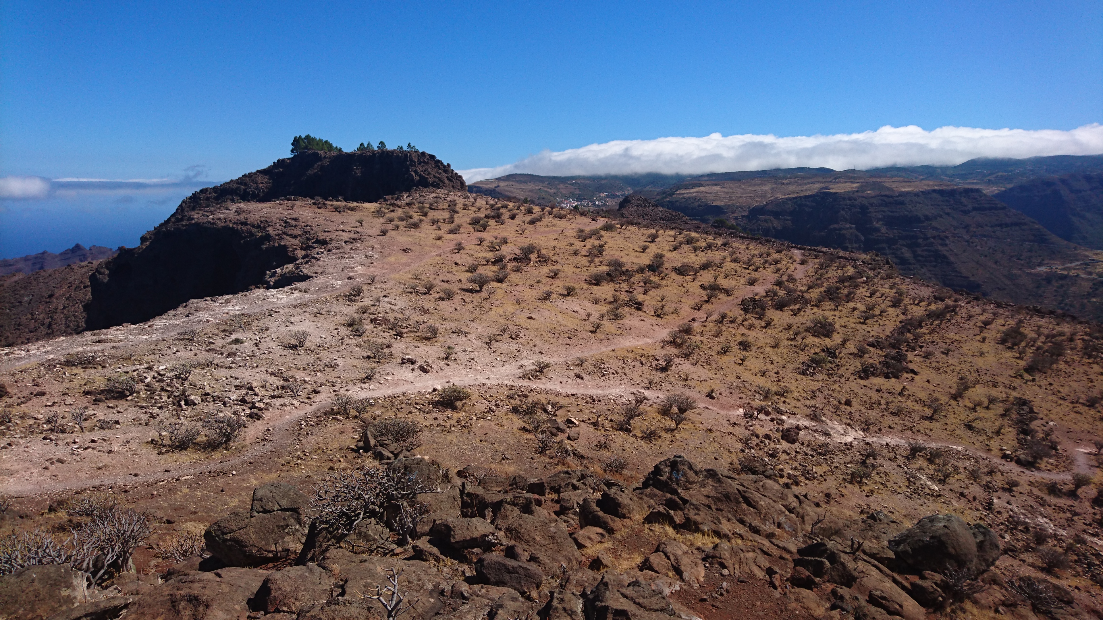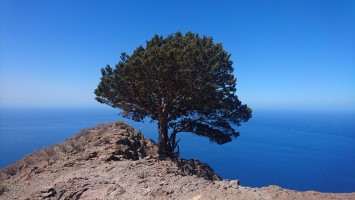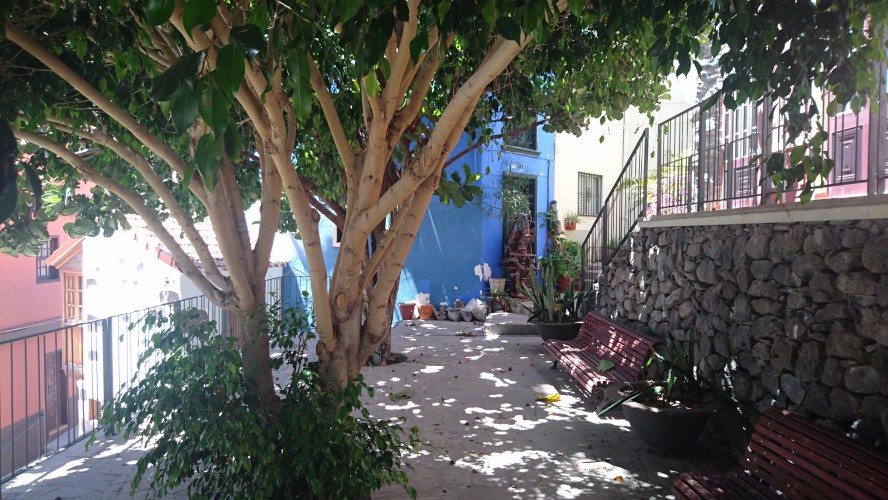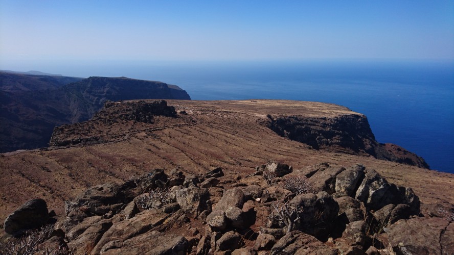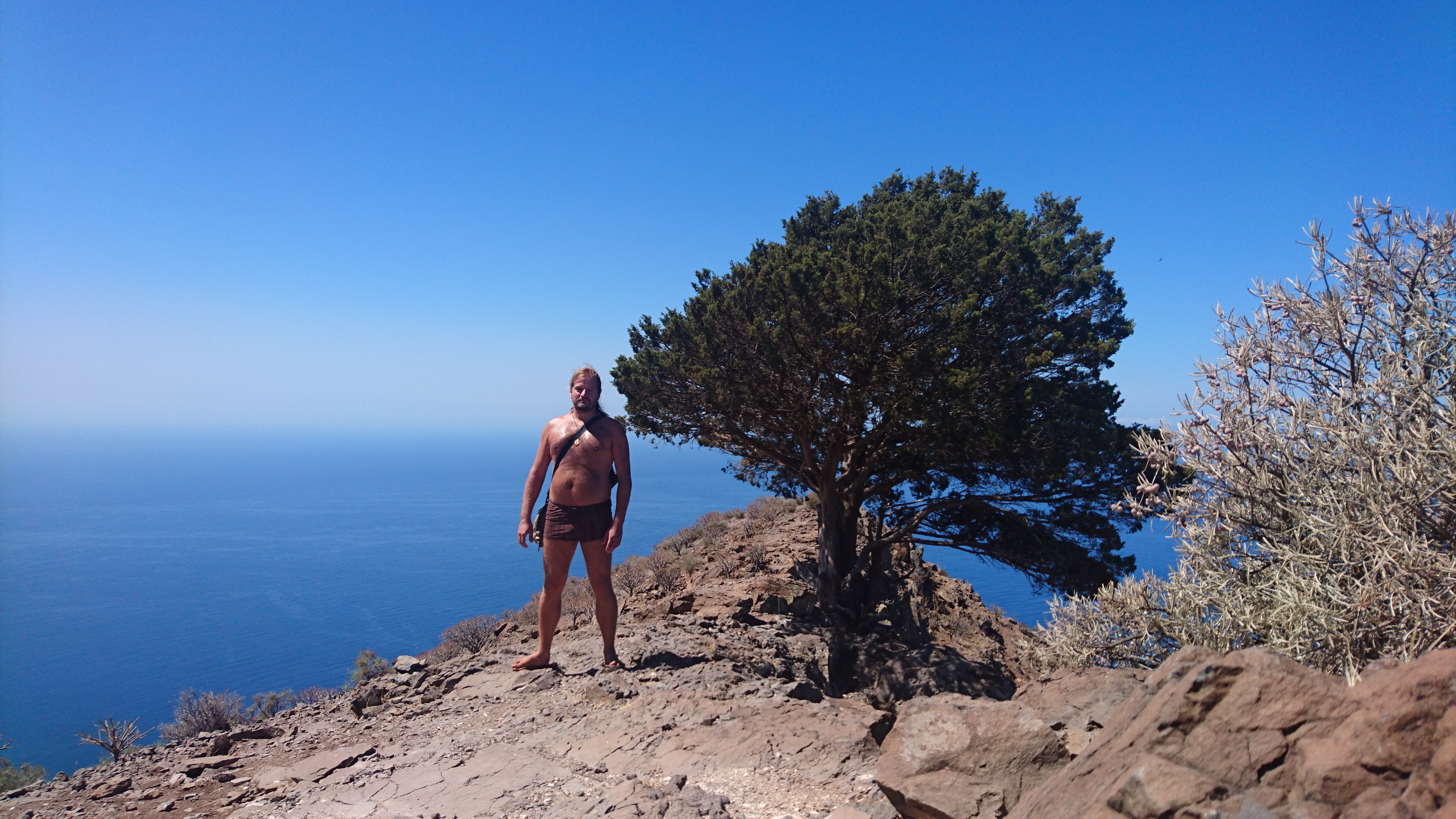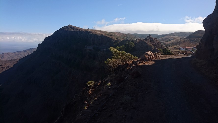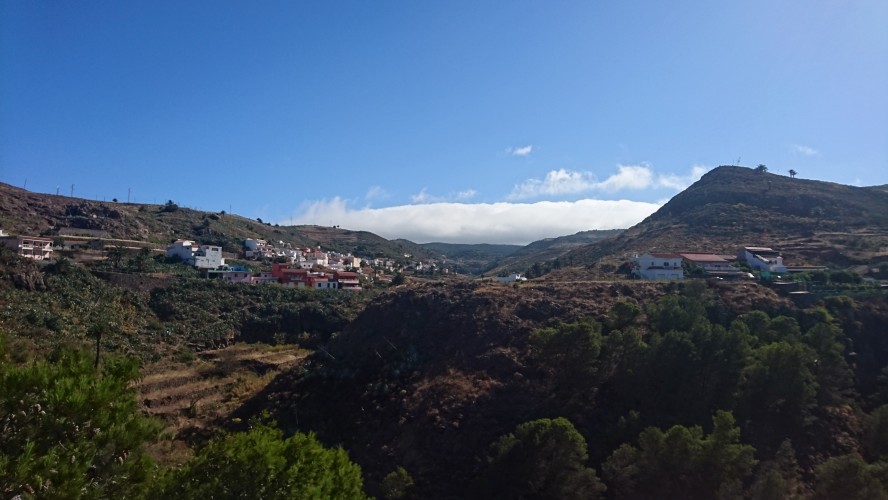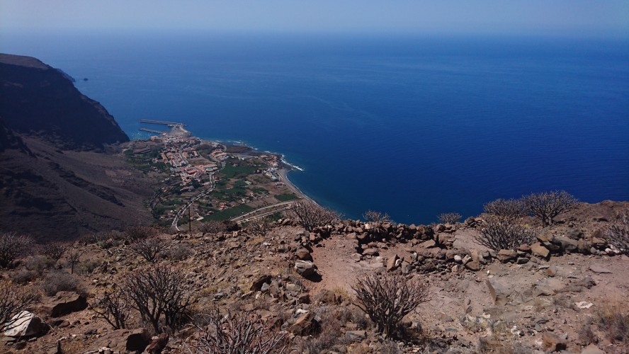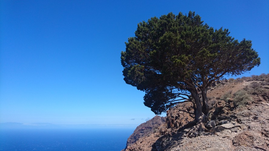 In der Nacht bricht hier oben der Sturm los und es wird kalt. Es passt zu der Vorstellung, hier direkt an der Klippe zu wohnen. Bis zum Morgen nimmt der Wind nicht ab und so gehe ich 10 Uhr... (endlich hab ich begriffen, dass ich 5 Tage lang uhrzeitmäßig ne Stunde zuviel abgezogen hab... komisch, dass ich die Fähre aber bekommen hab)... weiter in Richtung Valle Gran Rey. 6,5 Km. 4 Stunden plane ich mir ein. Dann gibts keine böse Erkenntnis. Es geht wieder zur Steilwand, die jetzt gepaart mit dem Wind eine Herausforderung wird. Zum Glück gehts nur geradeaus und unweit der Einstiegsstelle lugt weit unten bereits der Touristenort durch die Talkerbe hervor. Je näher ich komme, desto mehr versuche ich bekannte Anhaltspunkte von vor 18 Jahren zu identifizieren. Auf der gegenüberliegenden Seite schlängelt sich die Hauptstraße in Serpentinen hinab. Das kenne ich noch. Ich selbst steuere auf eine Art Gipfel zu. 912m sagt das Navi. Ja hey. Toll. Wo ist der Gipfelstempel? Langweilig. Im Umkreis erstreckt sich ein Hochplateau mit einer aufgegebenen Finka. Terassenfelder selbst an den Steilwänden. Wer wollte denn hier den Winden den Kampf ansagen und womit? Über die Ebene hinweg dem Wind folgend ziehen die Wollen ebenfalls weg von der Insel hin zu einer weiteren, scheinbar im Himmel schwebenden Doppelinsel mit riesigem Wolkenfeld dazwischen. Na wenn das nicht La Palma ist und der Wolkenfang die Kaldera. Auch schon wieder 10 Jahre her, dass ich mit Corinna dort war. Hier oben wächst nichts über Bodennähe. Außer eins. Direkt an der Klippe steht ein Eremit von Baum. Den kenn ich auch. Wir sind hier damals hochgestiegen. Er thront auf dem Berghang und ist bis hinunter ins Tal deutlich zu sehen. Das ist für bisher mein persönliches Gipfelkreuz. Da muss ich natürlich hin. Gesagt getan.... so... nochn Ich-war-hier-Selfie... und ab nach unten, ich krieg Hunger! 2,6 km. Das dauert dann auch noch einmal zwei Stunden. Mir grauts imsgeheim vor der Etappe nach Valle Gran Rey. 22,6 km inkl. Berge. Da muss ich mir noch was einfallen lassen. Zeit genug hab ich dafür. Mein Ziel - und das für die nächsten vier Tage - ist für meine Verhältnisse schon fast dekadent. Das Hotel Gran Rey. Mit Pool auf dem Dach. Sieht aus wie ein gestrandetes Kreuzfahrtschiff und war lange Zeit das einzige Hotel hier. Heute sieht das etwas anders aus. Aber der Ort hat seinen Charme einer vom Tourismus links liegen gelassenen SloMo-Oase nicht verloren. Nur der damalige Sandstrand ist komplett verschwunden und dicken Wackersteinen gewichen. Ich meine mich zu erinnern, dass der nur im Frühjahr vorhanden ist.