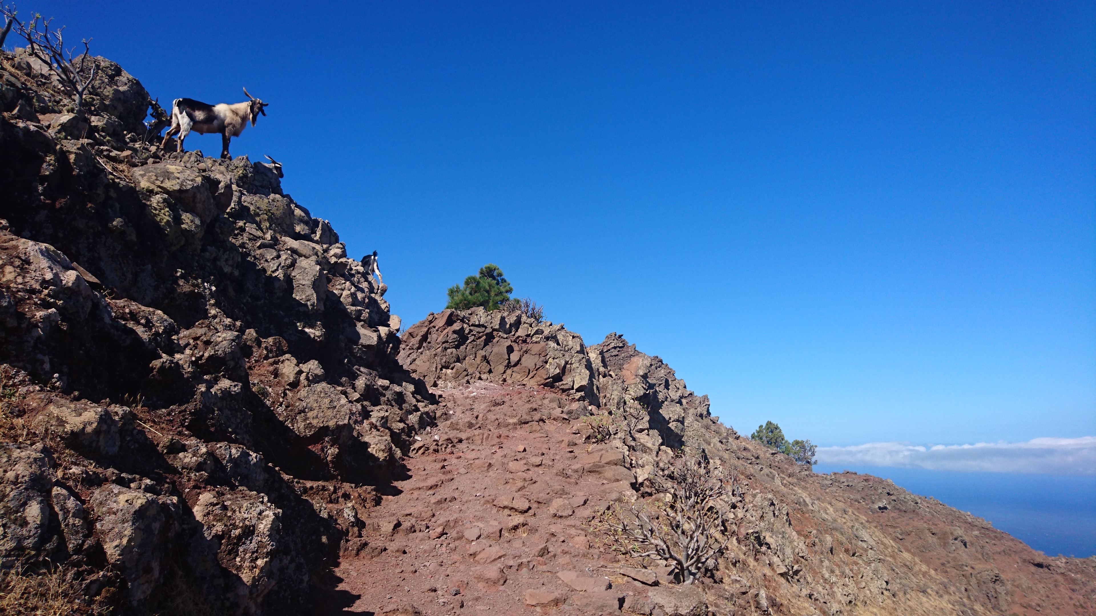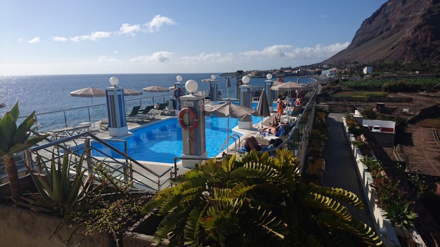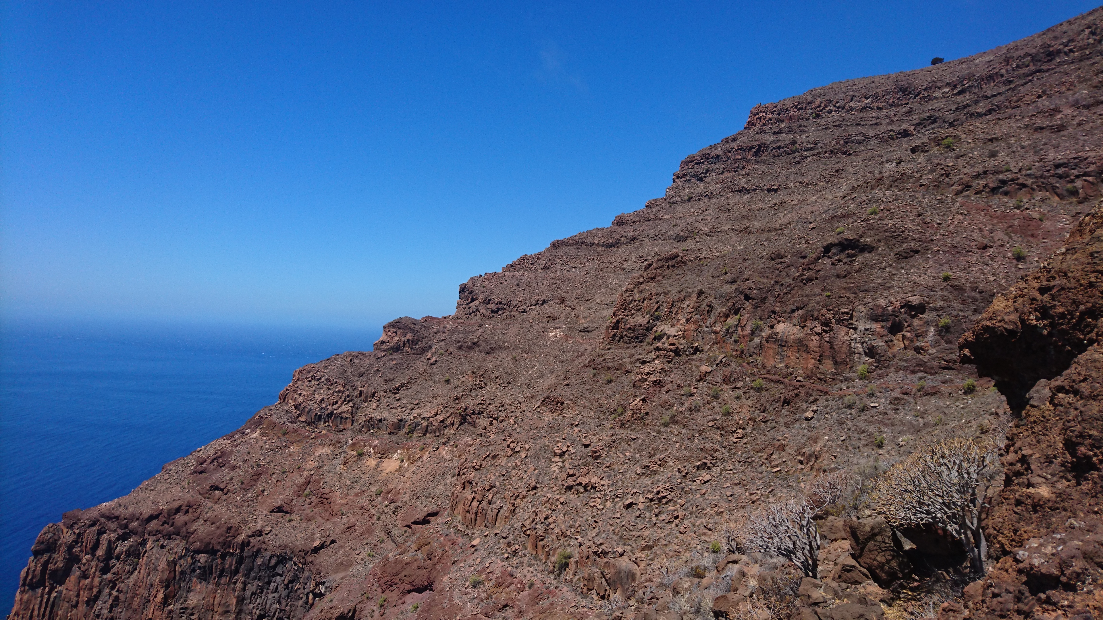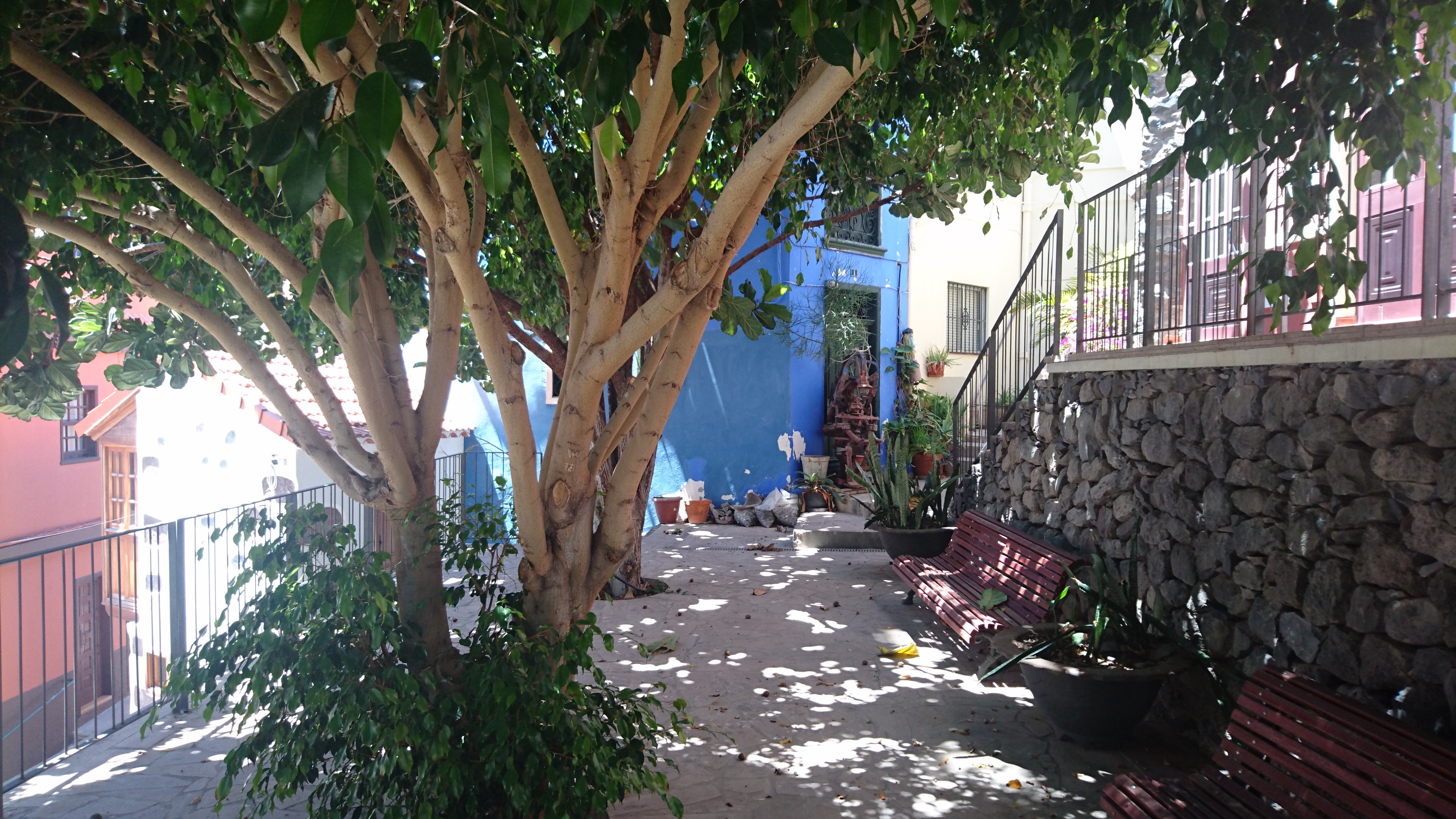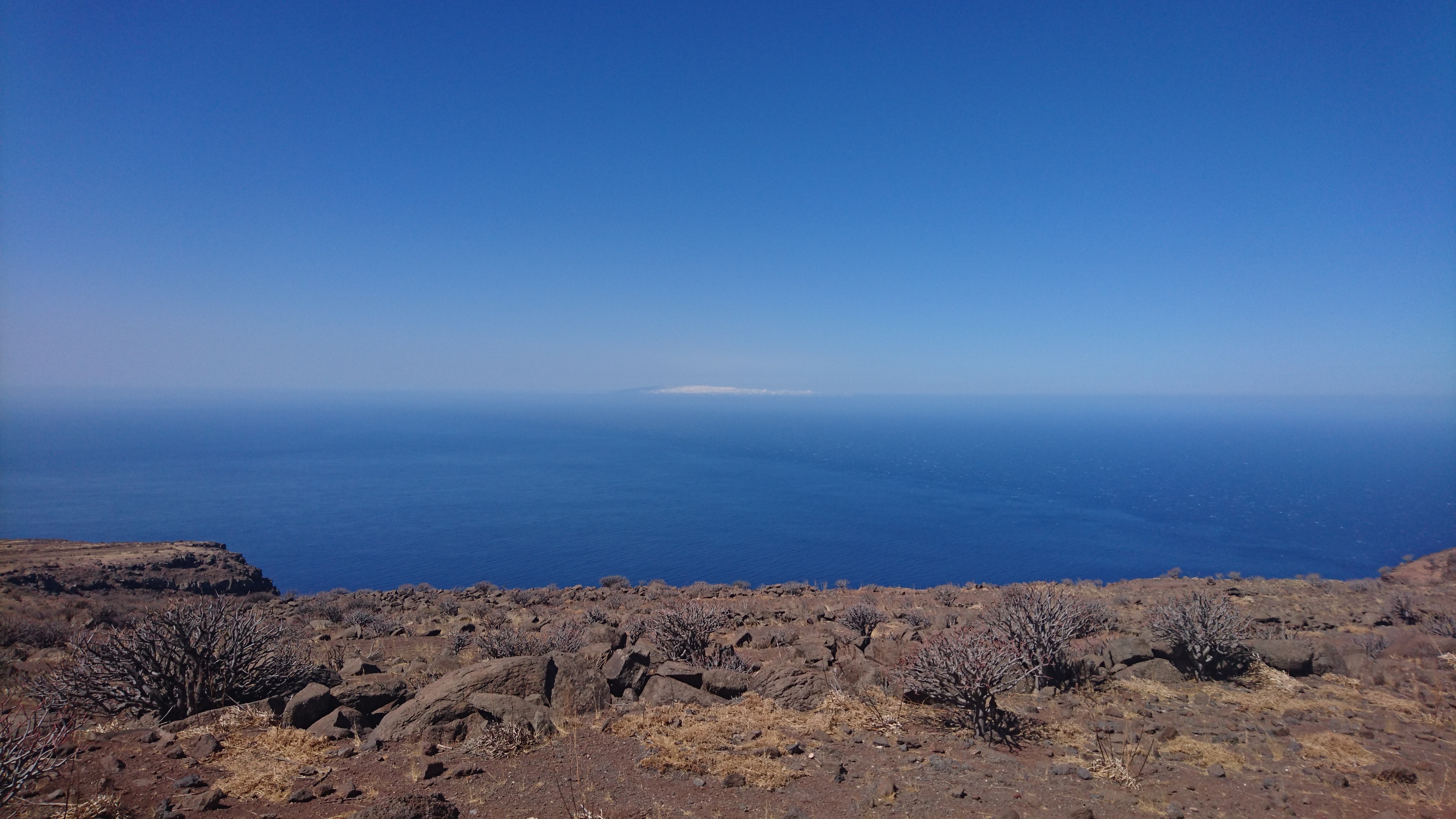 In der Nacht bricht hier oben der Sturm los und es wird kalt. Es passt zu der Vorstellung, hier direkt an der Klippe zu wohnen. Bis zum Morgen nimmt der Wind nicht ab und so gehe ich 10 Uhr... (endlich hab ich begriffen, dass ich 5 Tage lang uhrzeitmäßig ne Stunde zuviel abgezogen hab... komisch, dass ich die Fähre aber bekommen hab)... weiter in Richtung Valle Gran Rey. 6,5 Km. 4 Stunden plane ich mir ein. Dann gibts keine böse Erkenntnis. Es geht wieder zur Steilwand, die jetzt gepaart mit dem Wind eine Herausforderung wird. Zum Glück gehts nur geradeaus und unweit der Einstiegsstelle lugt weit unten bereits der Touristenort durch die Talkerbe hervor. Je näher ich komme, desto mehr versuche ich bekannte Anhaltspunkte von vor 18 Jahren zu identifizieren. Auf der gegenüberliegenden Seite schlängelt sich die Hauptstraße in Serpentinen hinab. Das kenne ich noch. Ich selbst steuere auf eine Art Gipfel zu. 912m sagt das Navi. Ja hey. Toll. Wo ist der Gipfelstempel? Langweilig. Im Umkreis erstreckt sich ein Hochplateau mit einer aufgegebenen Finka. Terassenfelder selbst an den Steilwänden. Wer wollte denn hier den Winden den Kampf ansagen und womit? Über die Ebene hinweg dem Wind folgend ziehen die Wollen ebenfalls weg von der Insel hin zu einer weiteren, scheinbar im Himmel schwebenden Doppelinsel mit riesigem Wolkenfeld dazwischen. Na wenn das nicht La Palma ist und der Wolkenfang die Kaldera. Auch schon wieder 10 Jahre her, dass ich mit Corinna dort war. Hier oben wächst nichts über Bodennähe. Außer eins. Direkt an der Klippe steht ein Eremit von Baum. Den kenn ich auch. Wir sind hier damals hochgestiegen. Er thront auf dem Berghang und ist bis hinunter ins Tal deutlich zu sehen. Das ist für bisher mein persönliches Gipfelkreuz. Da muss ich natürlich hin. Gesagt getan.... so... nochn Ich-war-hier-Selfie... und ab nach unten, ich krieg Hunger! 2,6 km. Das dauert dann auch noch einmal zwei Stunden. Mir grauts imsgeheim vor der Etappe nach Valle Gran Rey. 22,6 km inkl. Berge. Da muss ich mir noch was einfallen lassen. Zeit genug hab ich dafür. Mein Ziel - und das für die nächsten vier Tage - ist für meine Verhältnisse schon fast dekadent. Das Hotel Gran Rey. Mit Pool auf dem Dach. Sieht aus wie ein gestrandetes Kreuzfahrtschiff und war lange Zeit das einzige Hotel hier. Heute sieht das etwas anders aus. Aber der Ort hat seinen Charme einer vom Tourismus links liegen gelassenen SloMo-Oase nicht verloren. Nur der damalige Sandstrand ist komplett verschwunden und dicken Wackersteinen gewichen. Ich meine mich zu erinnern, dass der nur im Frühjahr vorhanden ist.