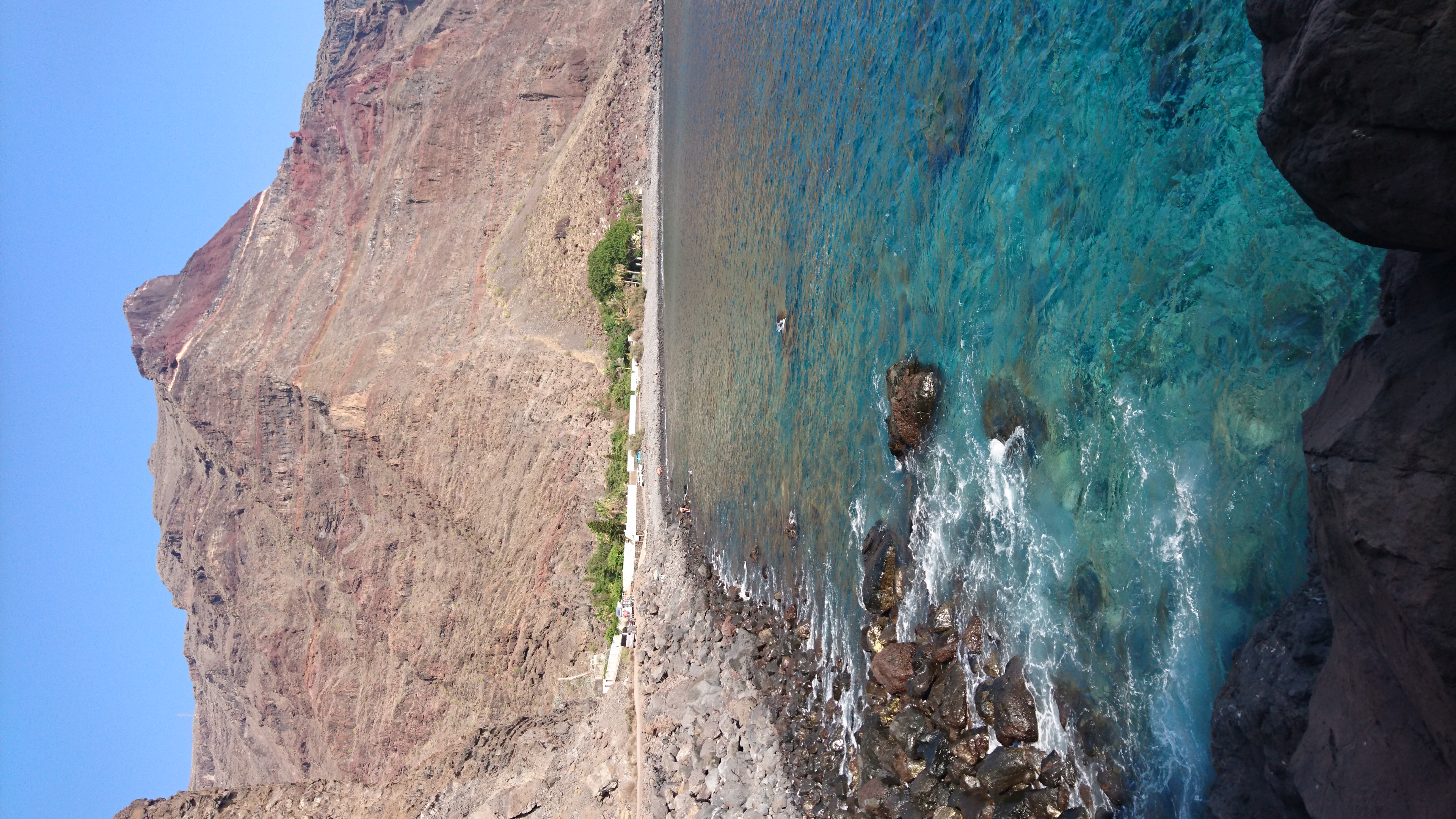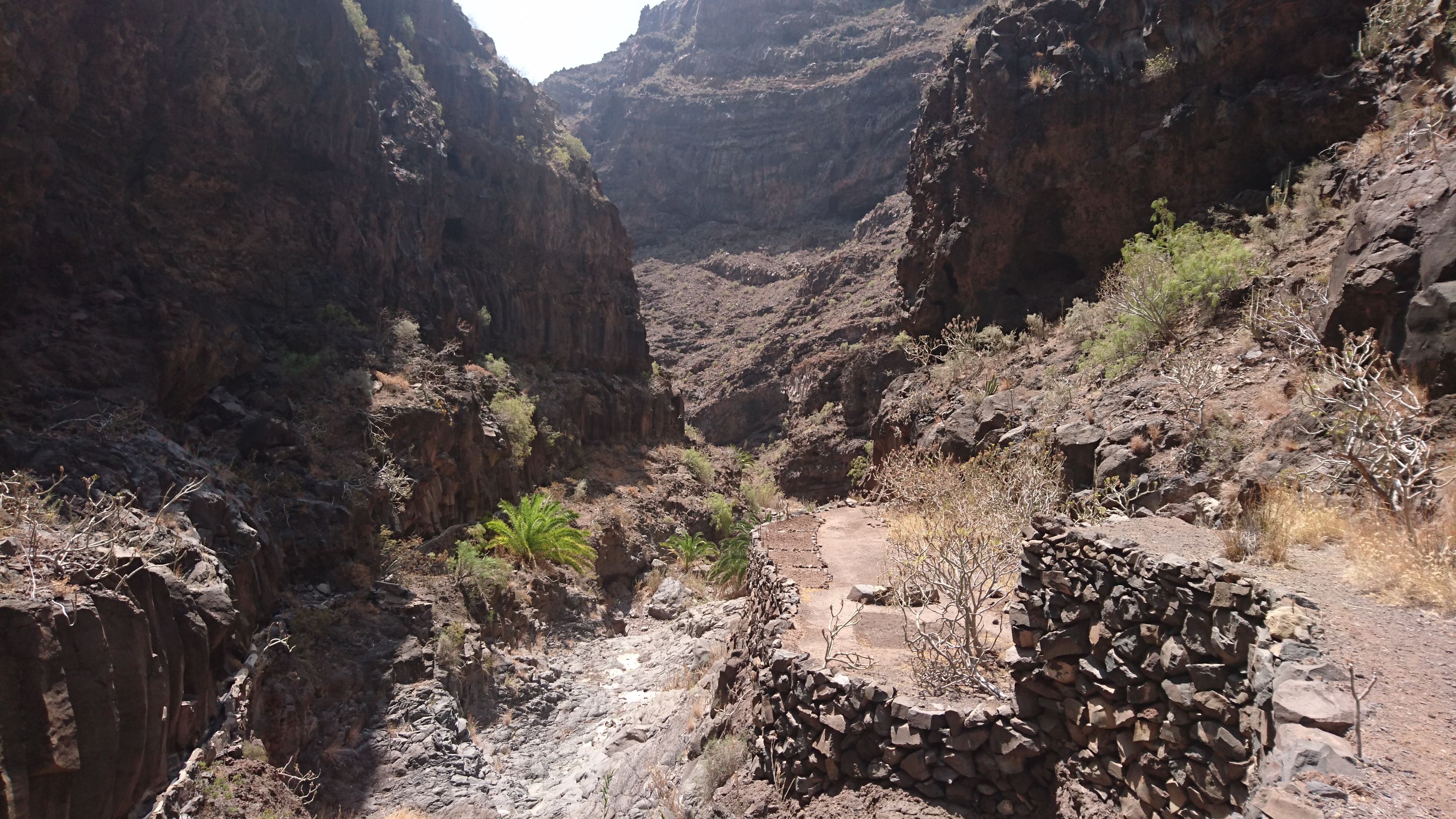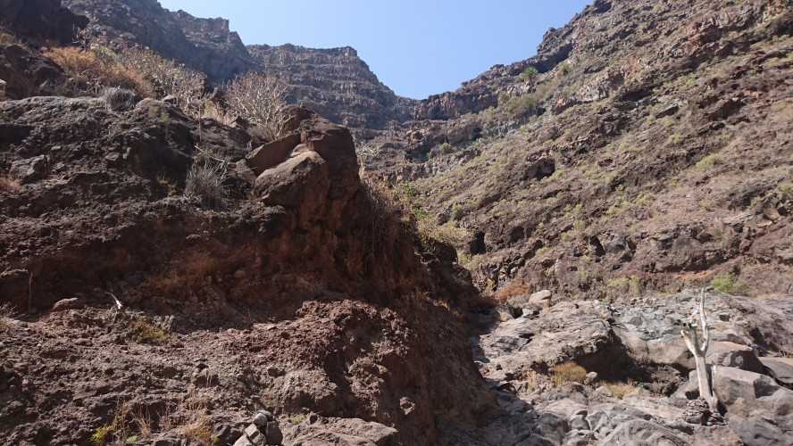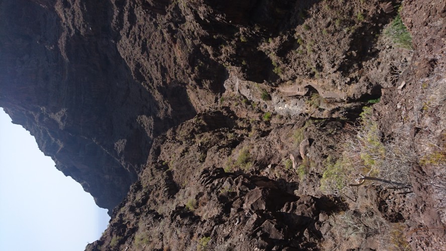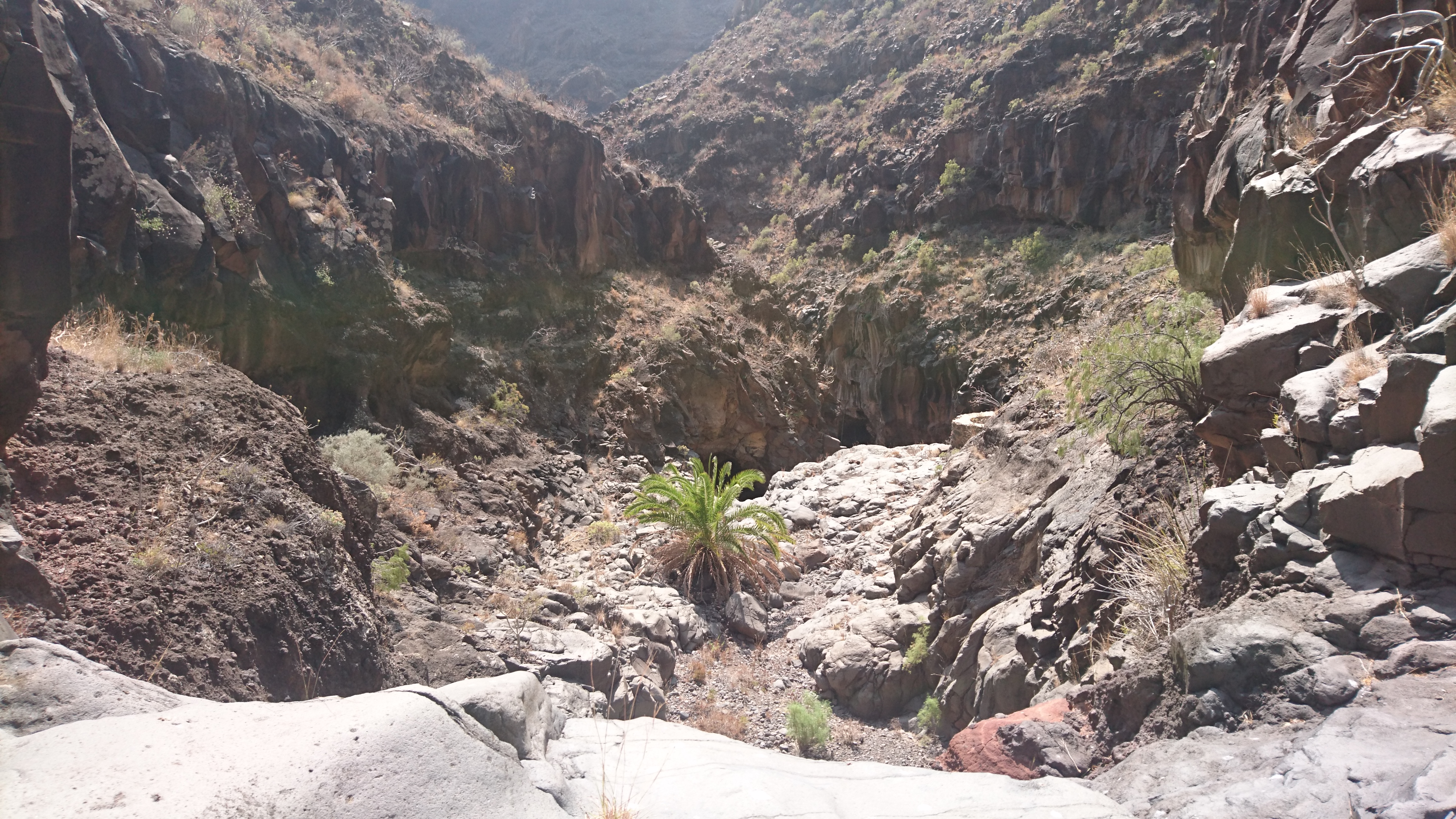 Mag sein, dass man nur ein Medium und den Umständen ausgeliefert sein kann, denk ich mir so, als ich eine Schlucht am Ostende von Valle Gran Rey besteige. Aber das ändert nichts daran, dass die Tat vom Medium ausgeführt wird. Und in unserer Gesellschaft wird man dafür bewertet, was man tut und nicht wie und durch wen man dort hingekommen ist. Vielleicht in der B Note. Ein Held hat, finde ich jedenfalls, immer eine gesellschaftliche Verantwortung, die er unwillkürlich mittragen muss als Person im öffentlichen Leben. Ich finde, dass kurioserweise Star Trek in dem 80ern und 90ern die Verantwortung eines Helden durch Picard perfekt inszeniert. So sehr, wie ich lese, dass über den Führungsstil als Vorbild für Führungskräfte doziert wird. Eigentlich könnte das doch langweilig sein. Ist ein impulsiver Kirk nicht viel spannender? Ich finde nicht. Er wirkt stumpf. Und meines Erachtens funktionieren deswegen auch die drei neuen Filme nur noch durch klischeebeladene, bunte Bilder. Der Geist ist weg. Ich fand Picard schon als Kind faszinierend in seiner Funktion als Kapitän, der ein 786m langes Forschungsraumschiff mit 42 Decks und 1200 Menschen mit ganzen Familien an Board lenkt und leitet und nicht ständig in sinnlosen Außendienstmissionen auf Plastikwelten Konflike mit dem Phaser löst. So kann ich mir wirklich das 24. Jahrhundert als gesellschaftliche Idee vorstellen, auch wenn ich in heutiger Zeit nicht mehr so technikgläubig bin und weiß, dass ein Warpantrieb die Energie mehrerer Sonnen benötigen würde. Vor einem Monat wurde bekannt, dass der mittlerweile 78jährige Patrick Stewart tatsächlich für eine Serie noch einmal in diese Rolle schlüpft. Das funktioniert, glaube ich, nachdem ich ihn vor zwei Jahren im Windham Theater in London zusammen mit Ian McKellen spielen gesehen habe. Wer, wenn nicht er. Na dann weiß ich ja, wen ich heute Abend male, wenn ich mich in diesem Tal nicht verlaufe. Eigentlich wollte ich testen, ob ich hier morgen gut weitergehen kann. Meine Karte sagt, Kletterpartie, 3. Grad. Und die Karte hat Recht. Ich muss viel klettern und balancieren und es ist schweißtreibend. Ein Wasserschlauch gurgelt hallend durch das Tal und versorgt die unten liegenden Häuschen im Kerbtal. Irgendwann nach 2 Stunden wird mir klar, das ist keine Alternative, um die morgige Monsteretappe bis Gerián zu verkürzen. Ich erreiche einen toten Baum mit Gebetsfähnchen daran, der mitten im ausgetrockneten Flussbett aufgestellt ist. Ein Garten mit Gemüse auf einer alten Terasse. Ein Zelt. Wohnt hier wer mitten im Nichts? Ja. Ein Mann schaut heraus und begrüßt mich. Deutscher, schätzungsweise 60. Ich habe nichts an, während ich hier hochlaufe. Er schenkt dem augenscheinlich keine Beachtung und stellt nur fest, dass es barfuß anstrengend ist, wieder herunterzukommen. Was macht der hier? Ich hatte mit niemandem gerechnet, erst recht nicht mit einem Aussteiger. Wir kommen ins Gespräch. Ob ich noch hoch will. Weiß nicht. Ists denn noch weit? Ja, hab etwa 1/4 geschafft. Hätte mit viel mehr gerechnet. Das besiegelt, dass der Weg keine Alternative ist. Ich frage, ob er Wasser hat. Hat er. Er hat sich einen Wasserkrahn an den Plastikschlauch gebohrt und weiß auch mittlerweile, wo die Quelle ist. Mittlerweile? Ja, er wohnt seit 5 Monaten hier oben in der Schlucht im Zelt. Ob er eine Wohnung hat? Gerade nicht. Vielleicht im Winter. Er wohnt seit 10 Jahren auf La Gomera. Meist als Schluchteremit. Ich bin platt, lasse meine Flasche am Schlauch auffüllen und mache mich auf den Rückweg. Er auch, er will einkaufen und ein Bier trinken gehen. Ich frage, warum er hier ist, aber er weicht aus und weg ist er. Deutlich schneller als ich. Er macht das offensichtlich nicht zum ersten Mal.