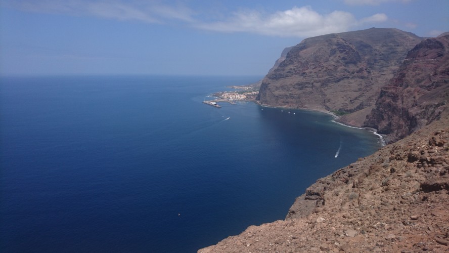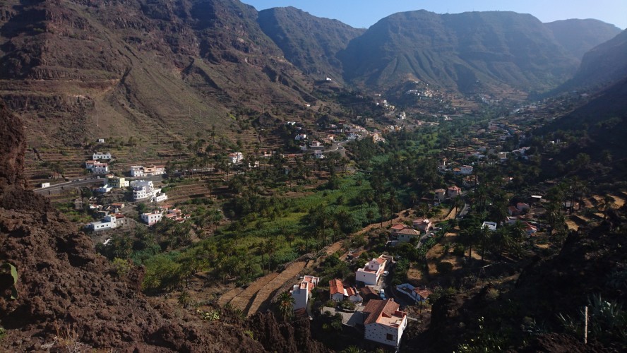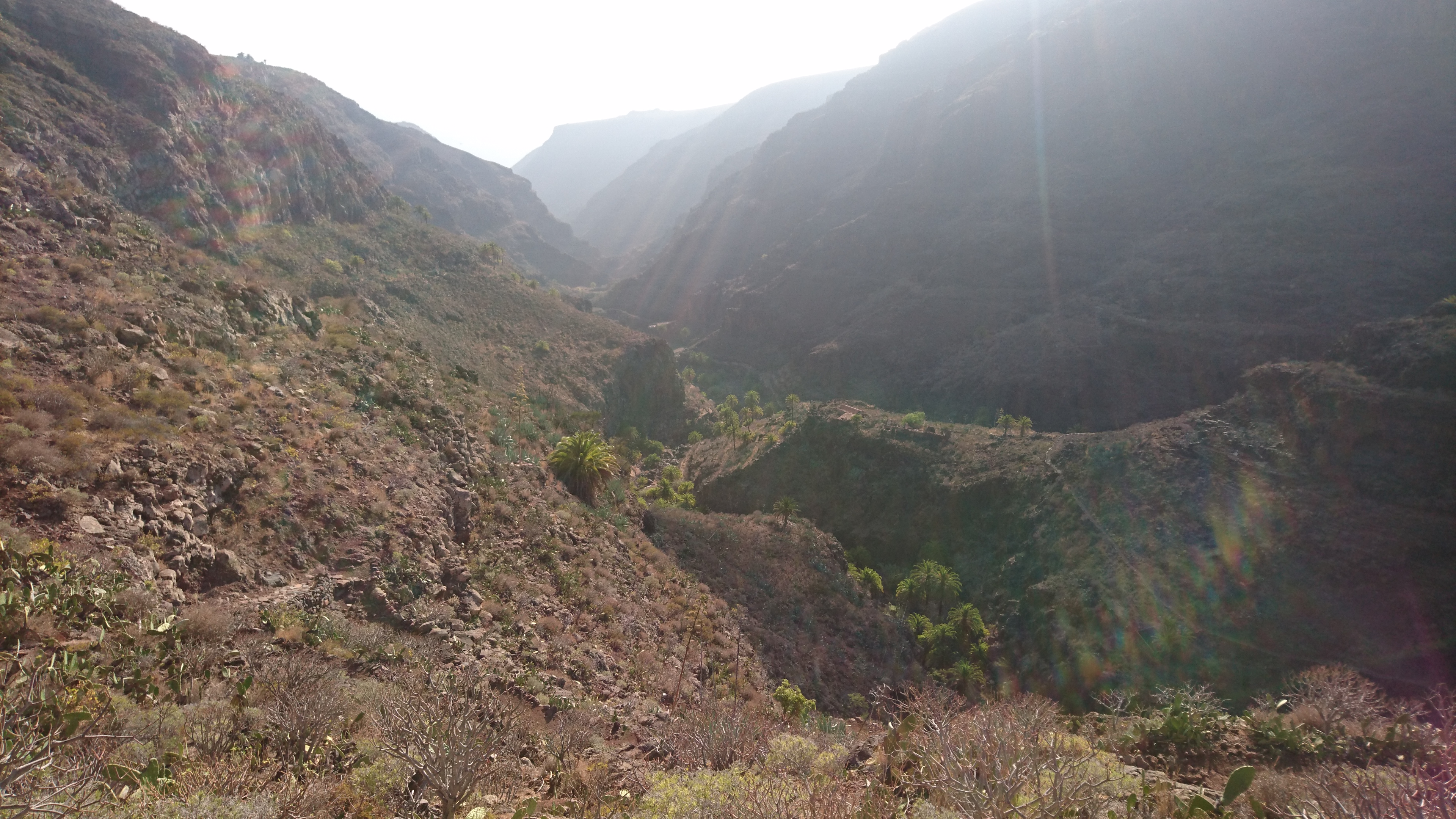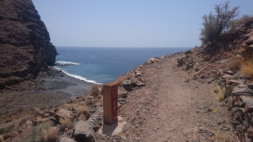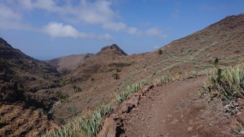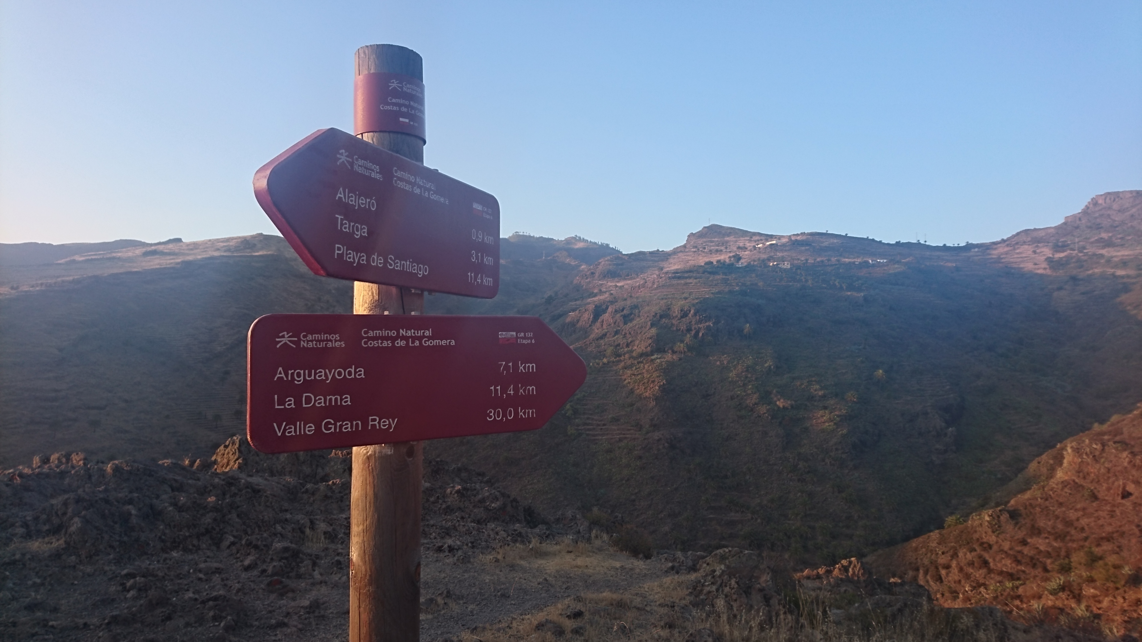 40km, 14 Stunden, 3000 Höhenmeter. Langsam begreife ich, warum der GR132 nicht frequentiert wird. Er ist entspannterweise nicht zu packen. Zwar sagt die Karte, dass man nur bis La Dama und Alajeró laufen soll. Ist aber auch nur ne nette Idee, wenn es vor Ort keine Unterkunft gibt. Wenigstens sowas wie ein Wanderheim, wo man sich den Schlüssel an der örtlichen Bar abholt oder so, wäre schon hilfreich. Da ist Kreta besser erschlossen. Die Landschaft ist toll, aber so ging sie mir nach 20km nur noch auf den Sack. Jeder Stein ist irgendwann zum Verfluchen, weil man ständig konzentriert sein muss. Man kann nicht einfach gedankenlos so drauflos gehen, dann wär alles super. Trotz allem brauchts nicht mehr als eine durch Riemen gehaltene Vibramsohle. Wie auch immer das geht. Seit Kreta lauf ich mit diesen Nicht-Schuhen herum und sie haben keinen Abrieb. Und ich bin dank LF50 trotz Dauersonne nicht verbrannt. Jaja. Das richtig harte Zeug für Kleinkinder von DM für 2,29€. Ich frag mich, warum man da noch Alternativen mit weniger Schutz anbietet.