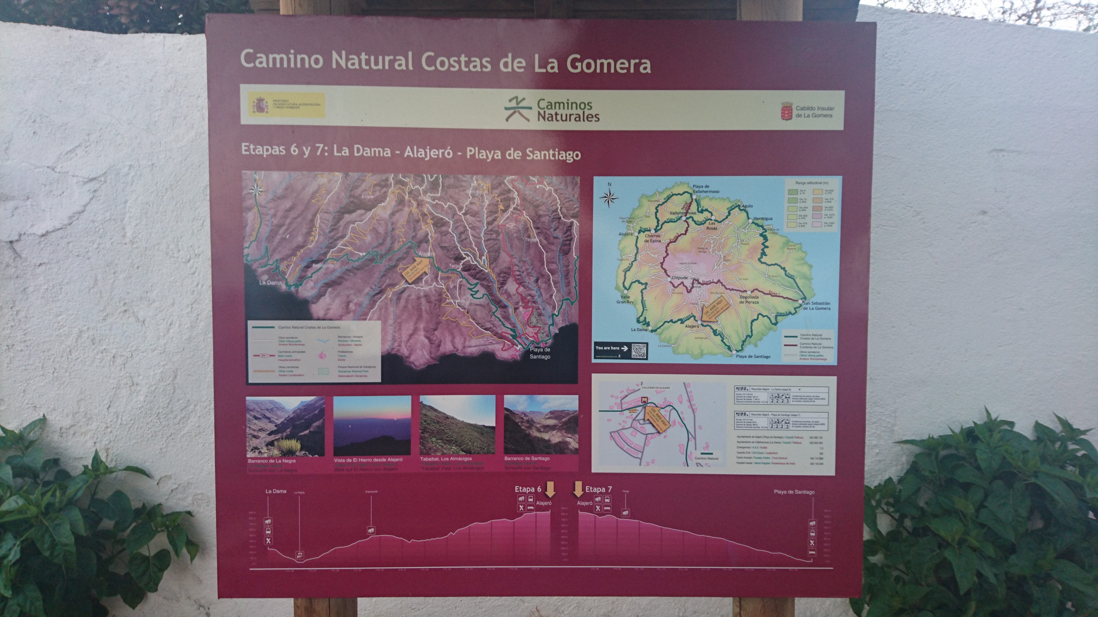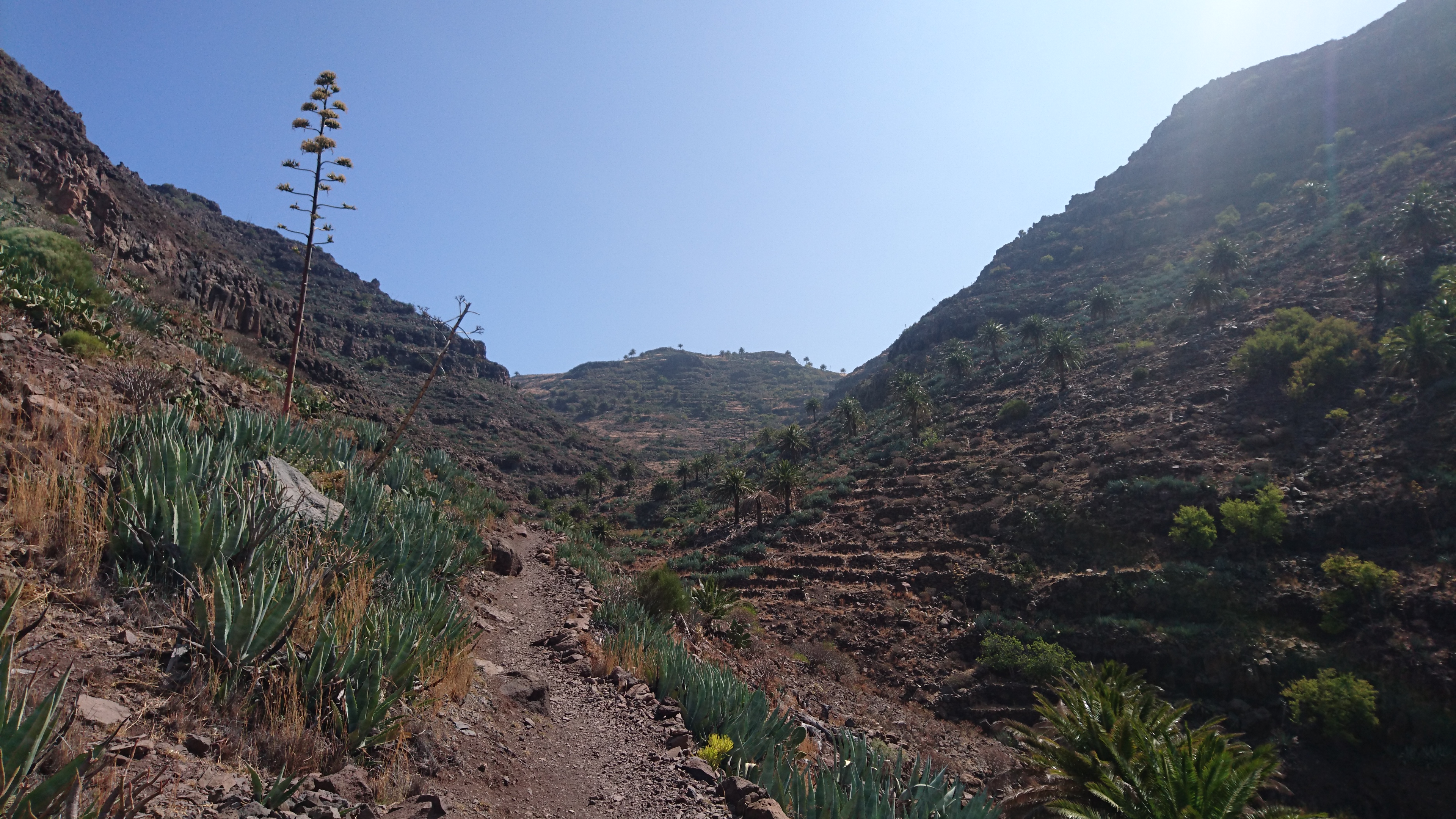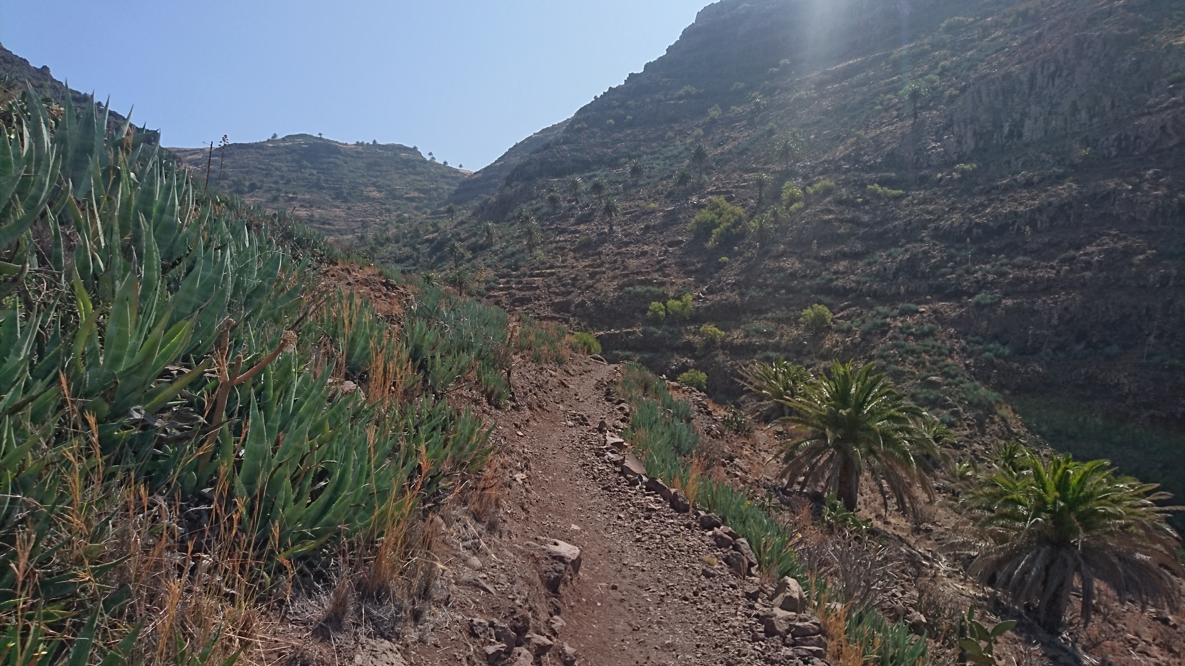 40km, 14 Stunden, 3000 Höhenmeter. Langsam begreife ich, warum der GR132 nicht frequentiert wird. Er ist entspannterweise nicht zu packen. Zwar sagt die Karte, dass man nur bis La Dama und Alajeró laufen soll. Ist aber auch nur ne nette Idee, wenn es vor Ort keine Unterkunft gibt. Wenigstens sowas wie ein Wanderheim, wo man sich den Schlüssel an der örtlichen Bar abholt oder so, wäre schon hilfreich. Da ist Kreta besser erschlossen. Die Landschaft ist toll, aber so ging sie mir nach 20km nur noch auf den Sack. Jeder Stein ist irgendwann zum Verfluchen, weil man ständig konzentriert sein muss. Man kann nicht einfach gedankenlos so drauflos gehen, dann wär alles super. Trotz allem brauchts nicht mehr als eine durch Riemen gehaltene Vibramsohle. Wie auch immer das geht. Seit Kreta lauf ich mit diesen Nicht-Schuhen herum und sie haben keinen Abrieb. Und ich bin dank LF50 trotz Dauersonne nicht verbrannt. Jaja. Das richtig harte Zeug für Kleinkinder von DM für 2,29€. Ich frag mich, warum man da noch Alternativen mit weniger Schutz anbietet.