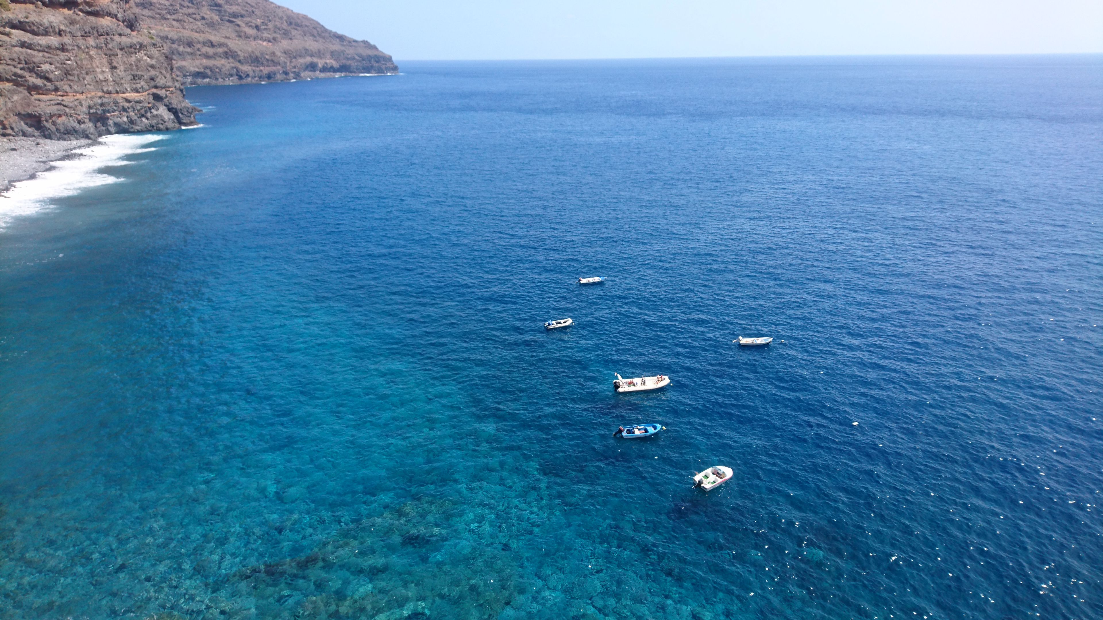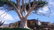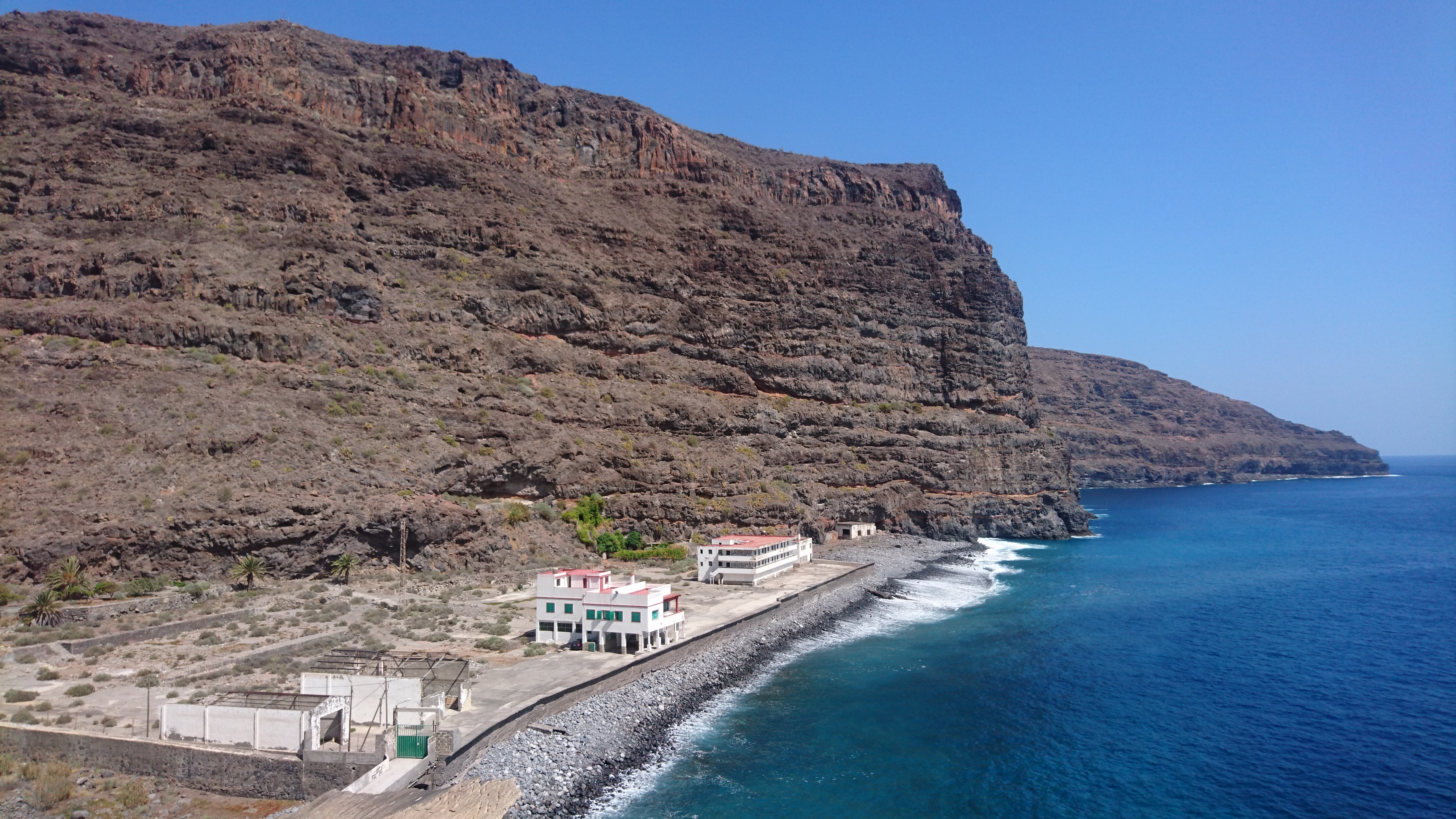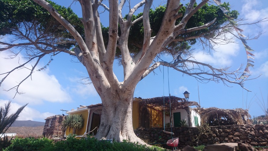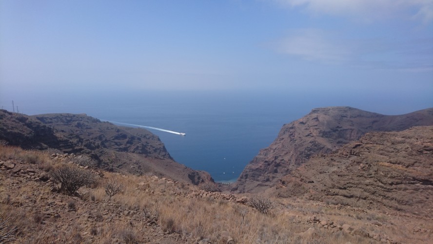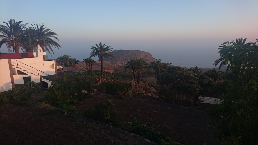 Ich hab jetzt x mal hin und herüberlegt, wie ich am geschicktesten weiterlaufen sollte. Ja gut. Ich könnte die Fähre nehmen. Aber dafür bin ich nicht hier. Dazwischen kommt aber nichts, was auf einer Straße direkt erreichbar wäre. Immer muss man durch tiefe Schluchten. Also entschließe ich mich mit einem mulmigen Gefühl dafür, mich mental auf viele tiefe Schluchten einzustellen, frühstücke um halb 8 und laufe los. Den alten Kirchenpfad entlang, durch die Bergsiedlung ohne Straße, wo ich schon war und dann hinauf. Die obgligatorischen 800 Höhenmeter, kann man sagen. Landschaftlich bleibts jetzt Steppe, hier auf der trockenen Südseite der Insel. Viele Palmen dennoch, vor allem entlang oder in den ausgetrockneten Flussläufen der vielen Schluchten. Gerián ist das erste Zwischenziel. Ein Nichts im Nichts auf einem Hochplateau. Aber ein Ferienhaus zum mieten steht hier mit Pool. Ich bin schon wieder 2 Liter Wasser ärmer. Aber diesmal war ich schlau und hab zwei Flaschen dabei. Eine davon landet jetzt im Örtlichen Mülleimer. Okay was sagt das Navi, bin bestimmt schon... nen Dreck bin ich. 6km von 40. Also weiter... und heureka! Ein echter Inselumrundungswanderer kommt mir entgegen! Der erste! Er kommt von Alajeró und ist seit 6 Uhr unterwegs. Wir haben 13 Uhr. Au weia. Mit meinen Barfußschlappen bin ich naturgemäß langsamer, weil man durch die dünne Sohle gezwungen wird vorsichtiger zu laufen. Ich frag ihn, ob er mir sein Schuhsohlenmuster zeigen kann. Man kann leicht einen falschen Weg nehmen, der 100m höher dann lediglich auf eine aufgegebene Anbauterasse führt. Das ist nicht nur ärgerlich, das kann ich mir heute nicht leisten. Drei Striche und 6 Punkte sind darauf. Leicht zu erkennen, wie ich im Folgenden merke. Es geht weiter, vorbei an einer alten Finka, die offensichtlich durch einen deutschen gekauft und zweckentfremdet wurde. Er hat versucht ein Paradies daraus zu basteln, in dem das, was fehlt, einfach bunt an die Wände gepinselt wird. Im Garten stehen verblichene Sofas herum. An einem Baum hängt eine Paradiesschaukel und auch sonst soll viel verkünden, dass hier jemand mächtig stolz auf sein Aussteigerglück ist. Schlussendlich bleibt der Eindruck einer zweckentfremdeten, aufgegebenen Finka, deren umliegende Terassenfelder, Zisternen und die Lastenseilbahn verfallen. Es ist irgendwie bekloppt hier oben zu wohnen. Auf einem kargen Hochplateau, 800m über dem Meer. Spätestens nach 2 Tagen wollte ich wieder nach Hause. Aber gut. Der Eremit gestern macht das Monate lang und verliert dabei nur langsam aber sicher seine Zähne. Es geht wieder runter zu einer einsamen Meeresbucht mit verlassenem Fischerhäuschen, die bereits auf der Aussteigerfinkaruine als Gartenpool angekündigt wurde. Ein Hippie muss auch hier gehaust haben. Es ist mit einem alten Sofa bestückt. An der Wand prangt ein fettes OM. Schöne Bucht. Einmal ins Wasser springen muss sein, bevor es wieder 800m hochgeht nach La Dama. Wahnsinn, GPS sagt, ich bin 3km Luftlinie von Valle Gran Rey entfernt. Sehr ermutigend. Ich erreiche den ersten wirklichen Ort um halb 4. Es gibt eine Bar. Wasser!!! Die Besitzerin schenkt mir noch zwei Bananen. Na die werde ich auch brauchen. Sagenhafte 13km hab ich. Nicht drüber nachdenken, ist nur schädlich für die mentale Verfassung. Weiter gehts zu einer Kapelle, die laut Karte an einer weiteren Strandbucht liegt. Tut sie auch. 800m darüber. Also in Serpentinen wieder hinab. Unten steht ein Kiosk und ein Planschbecken. Ein paar Touristen mit Boot legen hier an. Die Mole ist ein Überbleibsel von einer aufgegebenen Strandinfrastruktur samt Hotelruine. Lost Place Athmosphäre. Für ein lecker Eis reichts noch. Das Wasser ist herrlich klar. Halbzeit. Was folgt, war auf der Karte nicht erkennbar. Drei weitere Kerbtäler mit entsprechendem auf und ab. Jetzt gehts langsam aufs Gemüt. Zum Glück finde ich eine Wasserquelle. Nicht mehr als ein dünnes Rinnsal aus einem Fels aber es reicht aus, um auf Terassenfeldern davor fette, gelbe Kürbisse sprießen zu lassen. Ich hab die Nase voll. Zum Glück bin ich zeitlich nicht an die Unterkunft gebunden. Meine Schlüssel soll ich aus irgendeinem Kasten vor Ort entnehmen, weil sonntags eh keiner da ist. Das beruhigt mich etwas. Bei Sonnenuntergang um halb 9 erreiche ich Alajeró. Der Wanderweg mündet, wieder mal auf 800m, umvermittelt in einer Astphaltstraße. Alles kribbelt. Und es ist ein Segen keine Steine mehr unter den Füßen zu spüren, sondern einfach mal laufen zu können. 30km liegen hinter mir. Wenn ich zu Fuß nach Playa de Santiago will, kann ich den Wanderweg nicht weiter nehmen. Eine Hauptstraße führt vorbei am Inselflughäfchen dort hin. Mit weißen Streifen. Okay. Das klappt noch. Irgendwie. Also los. Eine Frau kommt mir entgegen. Ob ich Pflaumen will. Wie jetzt? Ja hier! Ich bin doch ein starker Mann, da bräuchte ich die. Wenn sie wüsste, wie Recht sie hat. Genial. Also vier Pflaumen in den Mund und weiter. Es wird dunkel. Und hier auf La Gomera heißt dunkel wirklich dunkel. Über mir erstreckt sich eine riesige, gekrümmte Milchstraße. Krass. Die Krümmumg hab ich noch nie gesehen... denk ich mir und renne vor eine Leitplanke. Gerade mal die weißen Streifen sind schemenhaft erkennbar. Wenn ich jetzt in irgendsomem Kerbtal hängen würde, wär ich aufgeschmissen. Da hätte ich nur noch Handybeleuchtung. Gegen 23 Uhr erreiche ich mein Domizil Santa Ana, auf einer Klippe direkt über Playa de Santiago, finde den Schlüssel in der Box. Neben der auch ein Automat mit Haribo und Hühnchensandwiches steht. Ich hab ja sowas von Glück. Ich kaufe den halben Automaten leer und beziehe mein Häuschen, gehe noch lautlos eine Runde im Pool drehen, um das Kribbeln aus den Beiden zu bekommen, leg mich ins Bett und bin sofort weg.