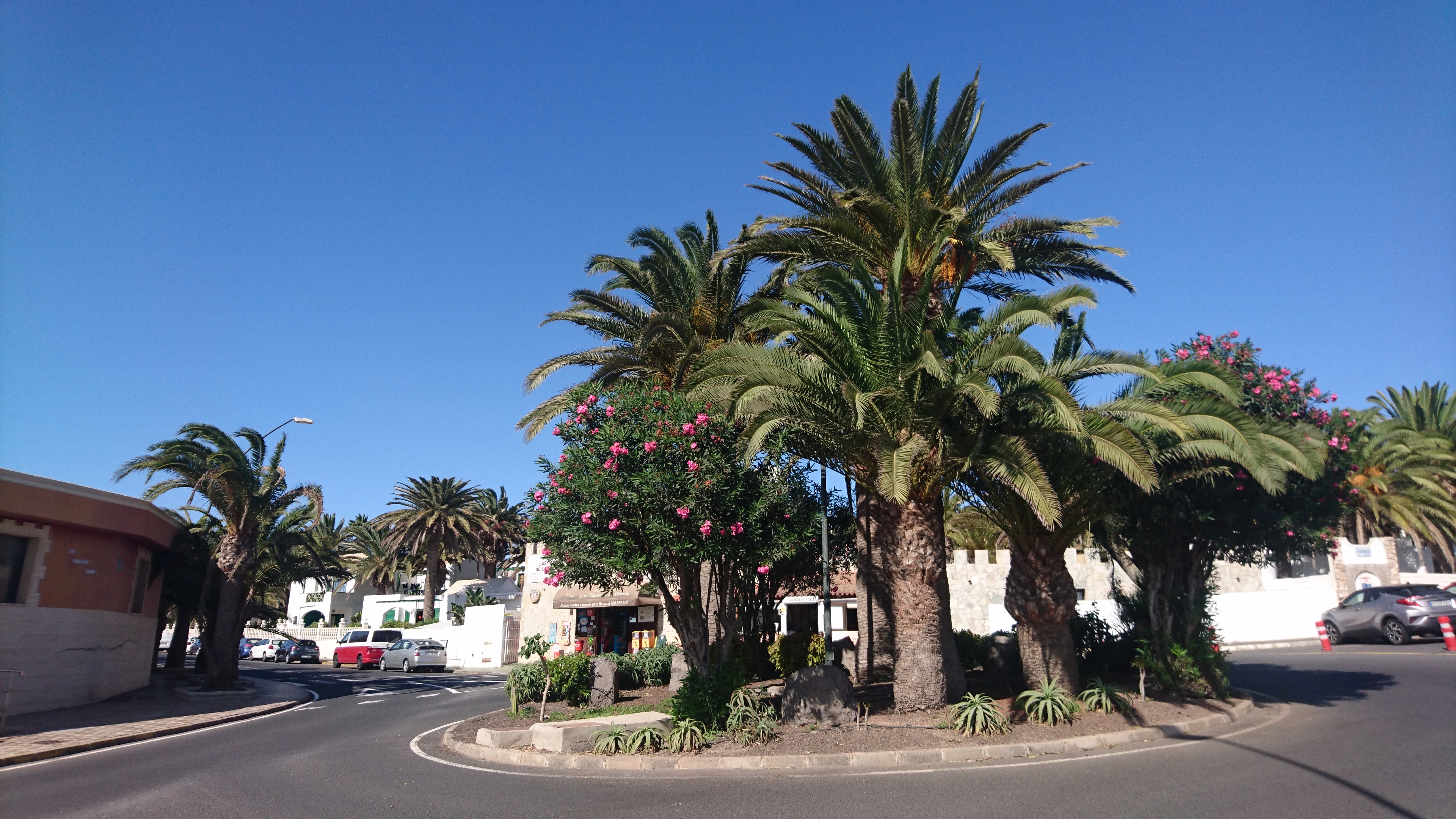 Irgendwann um 13:30 kommt die 5 nach Costa Calma. Nadann, auf der Suche nach 90er Kindheitserinnerungen... Mann, es sieht nicht gut aus. Gut, der "Ort" ist immer noch der Grünste der Insel. Seit 30 Jahrem wird im wahrsten Sinne des Wortes ein Wald mit Scheiße am Leben erhalten, der stetig gewachsen ist, 2 Kilometer ist er lang geworden. An seinem Ursprung am Plaza de Hapag Lloyd bröckelt die Fassade jedoch gewaltig. Allein der Name ist Historie. Der Ursprüngliche Kern von 1994 bei Cañada del Rio ist touristisches Ödland geworden. Santa Ursula, in der wir drei mal waren, existiert zur Hälfte noch in Form einer eingemauerten Eigentumswohnungsanlage. Die andere Hälfte ist abgerissen und ein Loch klafft im Boden. Duzende 90er Jahre Anlagen im unmittelbaren Umkreis hat das selbe Schicksal getroffen. Petes Music Park ist völlig zweckentfremdet. Früher ging man da zum Tanzen hin oder zum Bingo oder zum Cats Musical, das Gäste während ihres Aufenthalts mit Animateuren einstudierten... welches Appartment hatte denn schon einen Fernseher. Jetzt ist das alles sowas wie eine... ja was denn... Flipflopsupermarktbar, keine Ahnung, was der Käse soll, aber hier sitzen tatsächlich ein paar ältere Leute in den alten Animationsruinen herum und genießen sowas wie Urlaub?! "Wir kommen schon seit 100 Jahren hierhin und das bleibt auch so!" Viel Grafitti, zugemauerte Sackgassen, die früher in die Anlagen ringsum führten, verlassene Restaurants. Ich glaube, die einzige Anlage, die als solche überdauert hat, ist das Sotavento. Die Party ist 3km weiter nach Süden gezogen zu den neuen, erwartungsgerechten Anlagen. Hier kann man jetzt eigentlich mit dem Bagger drüberrollen. Das Bild des Orts ergänzt eigentlich gut den Eindruck des Windparks am Berghang.