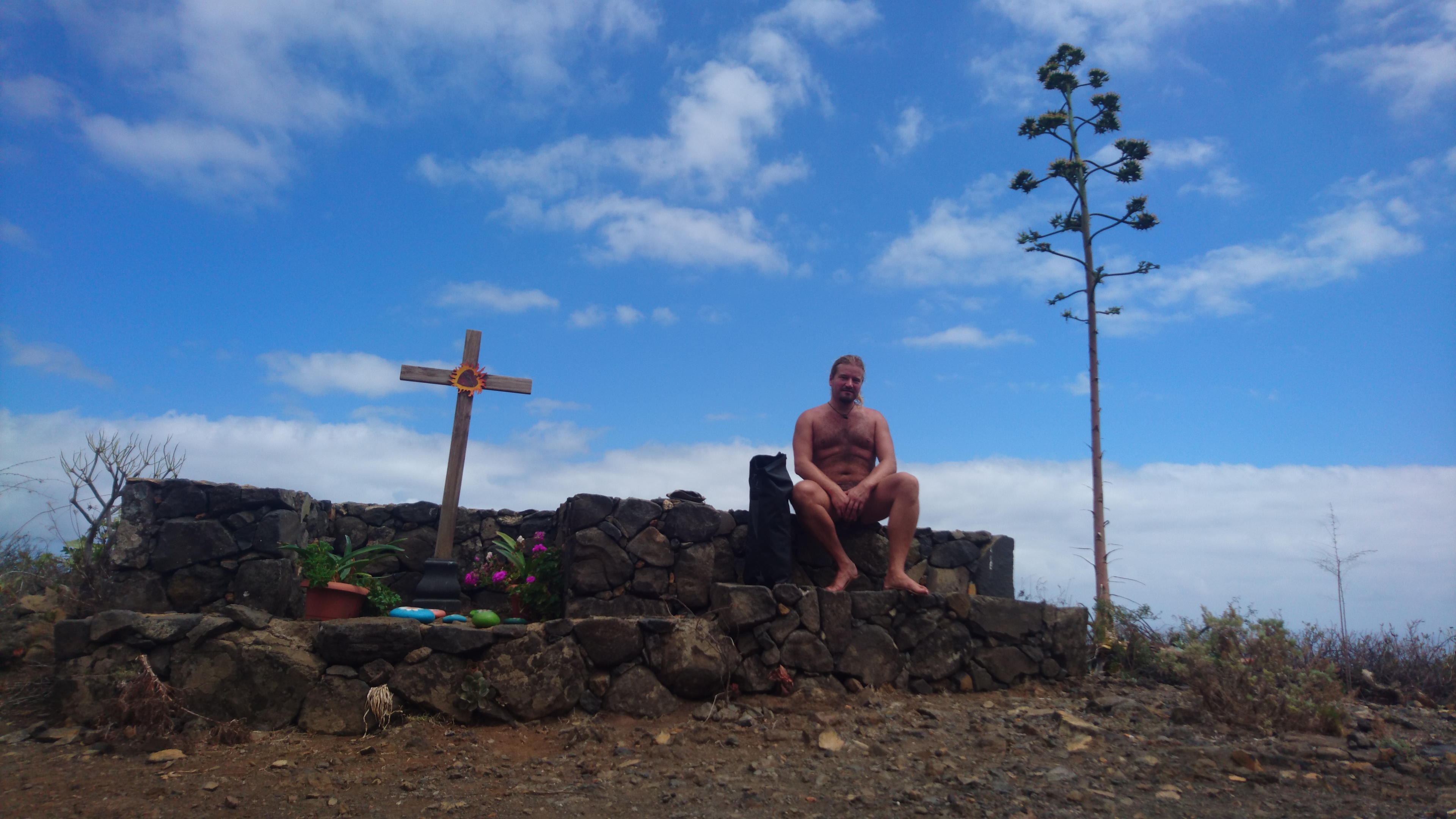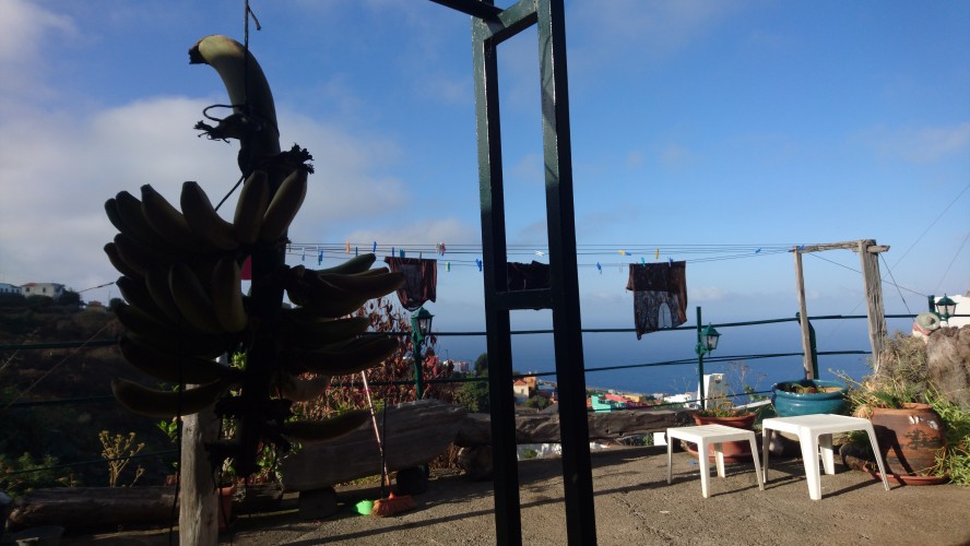 Das Laufen fällt mir aber schwer. Ich weiß nicht genau wieso. Eigentlich ist alles wie immer, nur will mein Kopf nicht so recht. Heute Abend gehts zu jemanden privat ins Haus, den ich nicht mehr erreichen konnte. Ich merke, dass mich eine unklare Ankunftssituation träge macht. Am vermeintlichen Zielort als GPS-Koordinate finde ich mich auf einer Straße mit 30% Gefälle, aber ohne Haus wieder. Ein Mann spricht mich an, ohne mich anzuschauen. Ich bin verwirrt und versteh kein Wort. Eine alte Frau kommt dazu, der Mann spricht weiter und dreht sich weg. Hmm... muss 'ne Verhaltensstörung sein. Ich frage die alte Frau nach einer habitación und wow, sie versteht mein Spanisch. Das ist toll! Aber 'ne Wohnung hat sie trotzdem nicht. Also rufe ich noch einmal die Nummer meiner Nimmerlandsunterkunft an und es geht endlich jemand ran. Nur Spanisch. Ich mache ihm klar, wo ich stehe. 5 Minuten später steht ein 40 Jahre alter Minilaster samt Hund neben mir und lädt mich ein. Es geht rauf in die Berge. "¿De dónde eres?" Oh das verstehe ich. Paderborn! "Ah! Frankfurt?" ...nähm... Sí. Irgendwann sind wir auf einer kleinen Finca angekommen. Ich wohne unterhalb seines Hauses in einer großen Wohnung und blicke hinunter ins Tal auf den großen Brückenbogen vor Los Sauces. Der Besitzer Diego hängt mir eine Bananenstaude vor die Tür und weist auf seine Tomatenstauden im Garten. Genial, der Weg zum Supermarkt erübrigt sich für heute. Wir quasseln noch ein bisschen Spenglisch über Corona und wie doof das ist, da erreichen mich schon die ersten Whatsapp-Nachrichten, dass das Auswärtige Amt nun auch vor den Kanaren warnt. "Die Kanaren sind ab sofort tabu", sagt der WDR. Hmm... muss zugeben, dass sich das jetzt doch etwas komisch anfühlt in der Tabuzone zu sitzen. Gleichzeitig bin ich froh, gerade noch so rausgekommen zu sein, ohne dass ich mir Gedanken über Lohnfortzahlung machen muss. Arbeiten geht ja auch prima im Homeoffice, wie uns Corona eindrucksvoll gelehrt hat. Die Kameras an den Laptops sind nicht nur als Klebestelle für Plaster da.