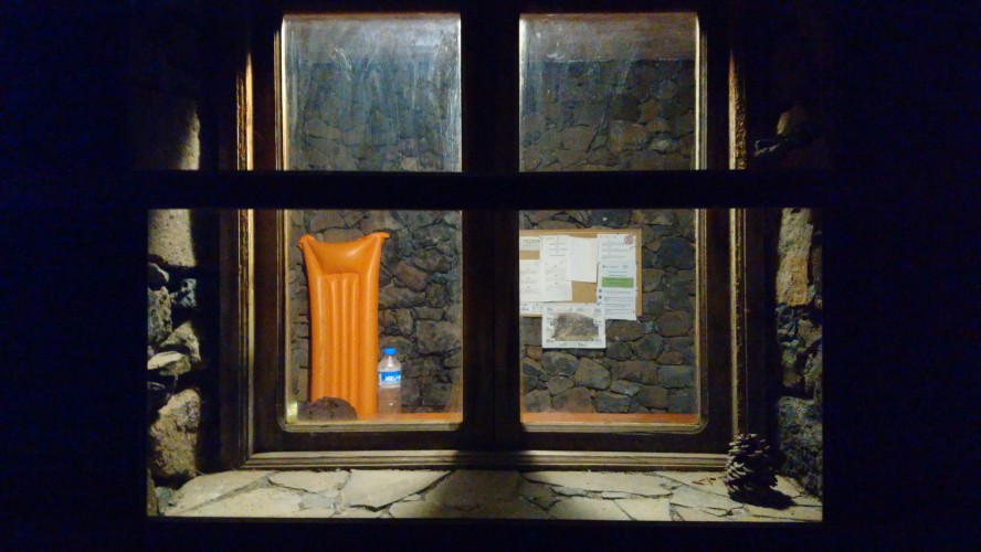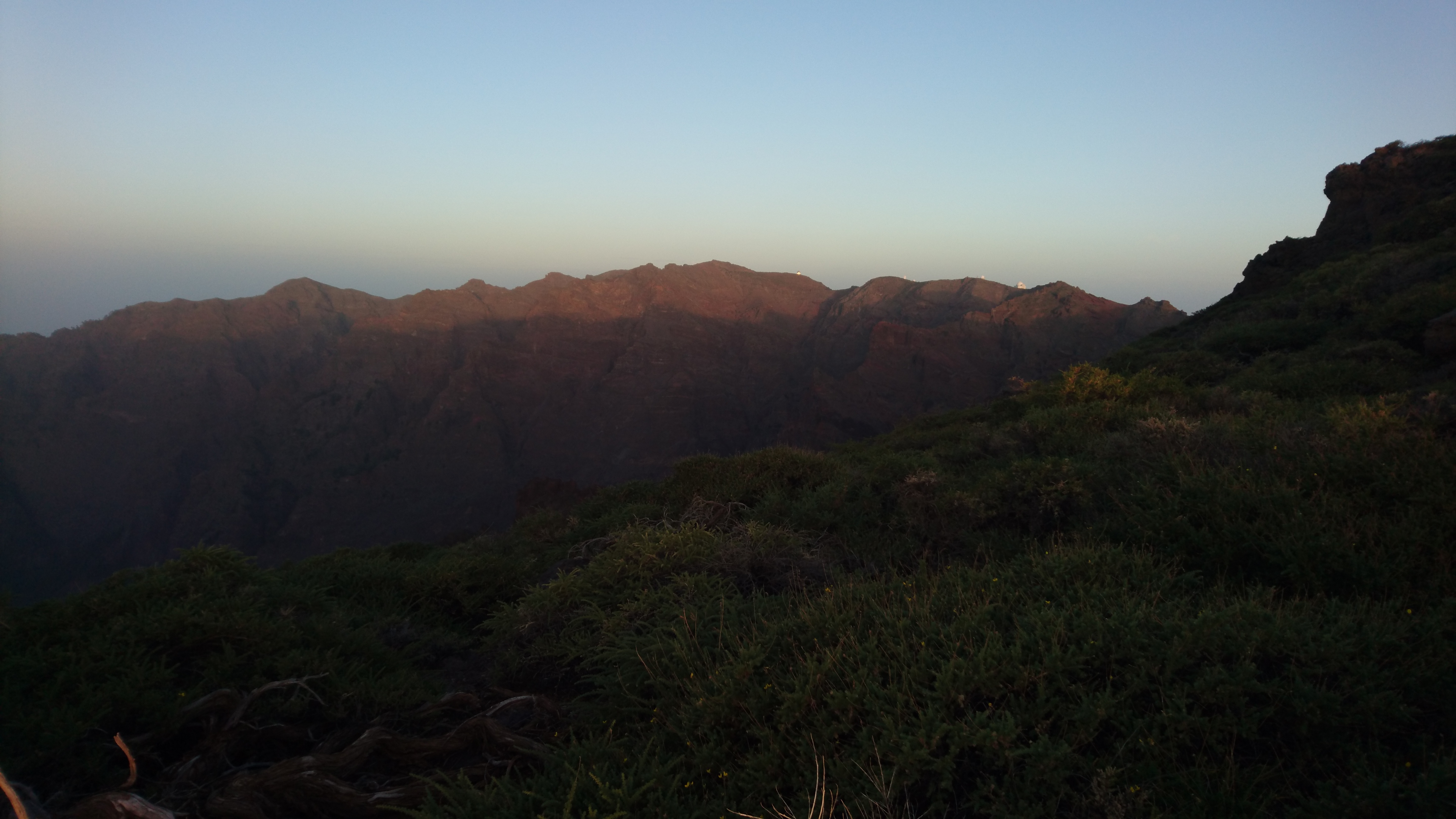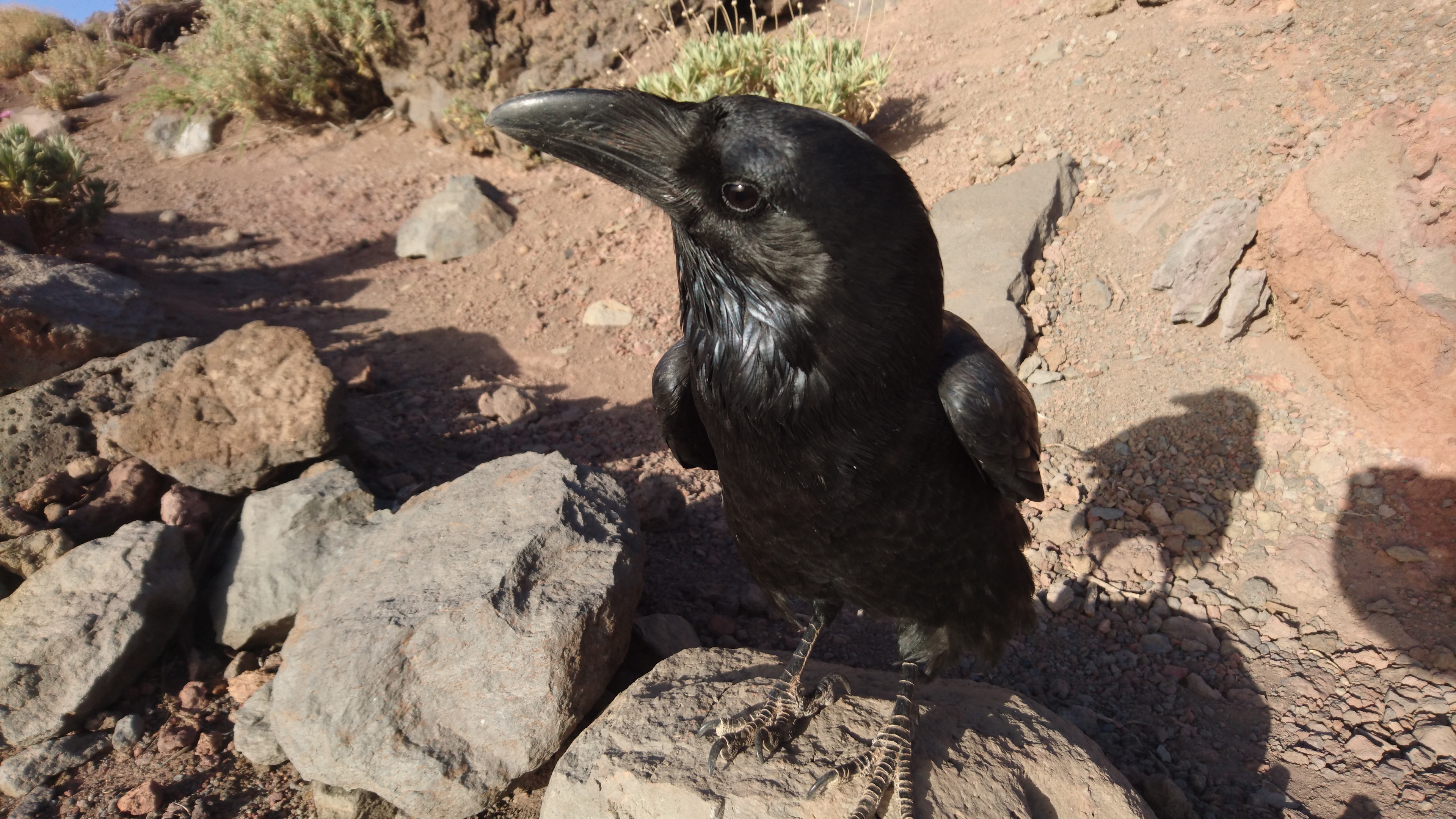 Ich entscheide mich trotz der Wetterwarnung zum Weitergehen. Meine heutige Etappe bleibt über der Baumgrenze und verläuft 3 Stunden lang weiter direkt auf dem Grat der Caldera. In dieser Zeit kommen mir wie im Zeitraffer rückwärts Wegweiser hinunter zu Küste mit allen Ortschaften entgegen, durch die ich die letzten Tage bekommen bin. Immer etwa 13 Fußkilometer weit von mir entfernt. Mein Rabe ist auch wieder da. Toll anzusehen, aber bleibt der jetzt?! Ein paar Bauarbeiter bessern Wegstücke vor mir aus, rauchen Zigarette... die Wetterwarnung ist wohl nur für Touristen?! Also Wanderer wie ich werden heute sicherlich kein Feuer auslösen. Ich frage mich ohnehin worin der Sinn besteht, bei Hitze einfach das komplette Wandernetz der Insel offiziell dicht zu machen. Es wird wohl Versicherungsgründe haben. Aber der Rabe findet Bauarbeitermenschenmengen größer Eins zum Glück erfolgversprechender, um Frühstück abzustauben. Ich komme zügig durch, werde tatsächlich immer noch nicht müde oder kaputt und erreiche kurz vor Mittag das Refugio Punta de los Roques. Ein Trockenmauerhäuschen, das an einem Fels direkt am Ende des Calderakraters klebt mit bombastischem Ausblick auf den Roque de Los Cuervos, den ich morgen anpeilen will. Das Haus ist für 12 Personen ausgelegt. Holzpritschen mit Luftmatratzen. Es ist keiner da. Ein Regenwassertank sichert die Wasserversorgung. Boah, soll ich hier echt nur Pause machen? Ich berechne mittels GPS den Weg bis zur morgigen Kreuzung des GR 130 mit 29 Kilometern, verhältnismäßig geringer Höhenvarianz und ohne Kerbtäler. Das traue ich mir zu. Die nächste Übernachtungsmöglichkeit in 10 Kilometern wäre wieder ohne Haus. Ich bleibe hier. Lieber schlafen. Morgen hab ich ein Hostel gebucht.