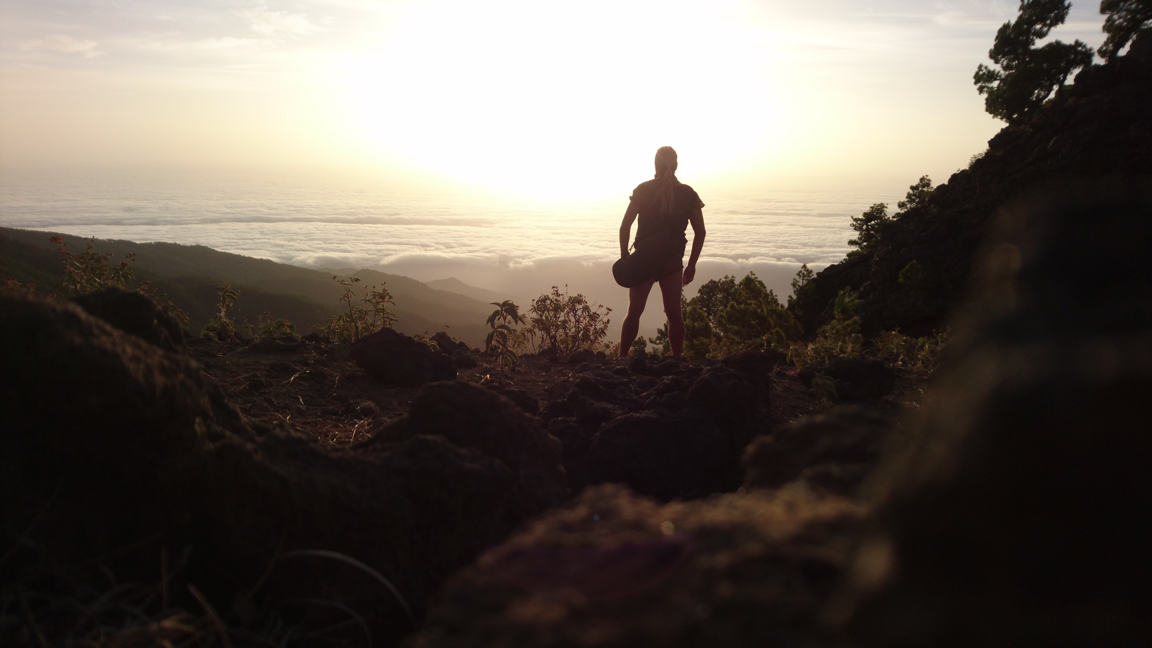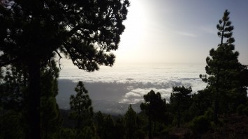 Die drei Tage hier oben über den Wolken sind erholsam, so anstrengend der Weg bei Sonnenhitze und stetiger Wasserknappheit auch ist. Von der 34-Grad-Schwüle der Küste ist hier oben nichts zu spüren. Dafür saugt die Trockenheit einem bei jedem Atemzug das Wasser aus der Kehle. In Anbetracht der kommenden, zweiten Hälfte des Wegs ist die Strecke bis El Pilar reine Pflicht. Ich muss gut durchkommen, wenn ich vor Supermarktschluss im Süden ankommen will. 10-11 Stunden plane ich ein. Aber es kommen keine Barranco-Überraschungen. Lediglich die Flora ändert sich schlagartig von Kiefern in einen moosüberwucherten Laubwald. Also fließen hier tatsächlich die Wolken über den Kamm, der sie offensichtlich absaugt.