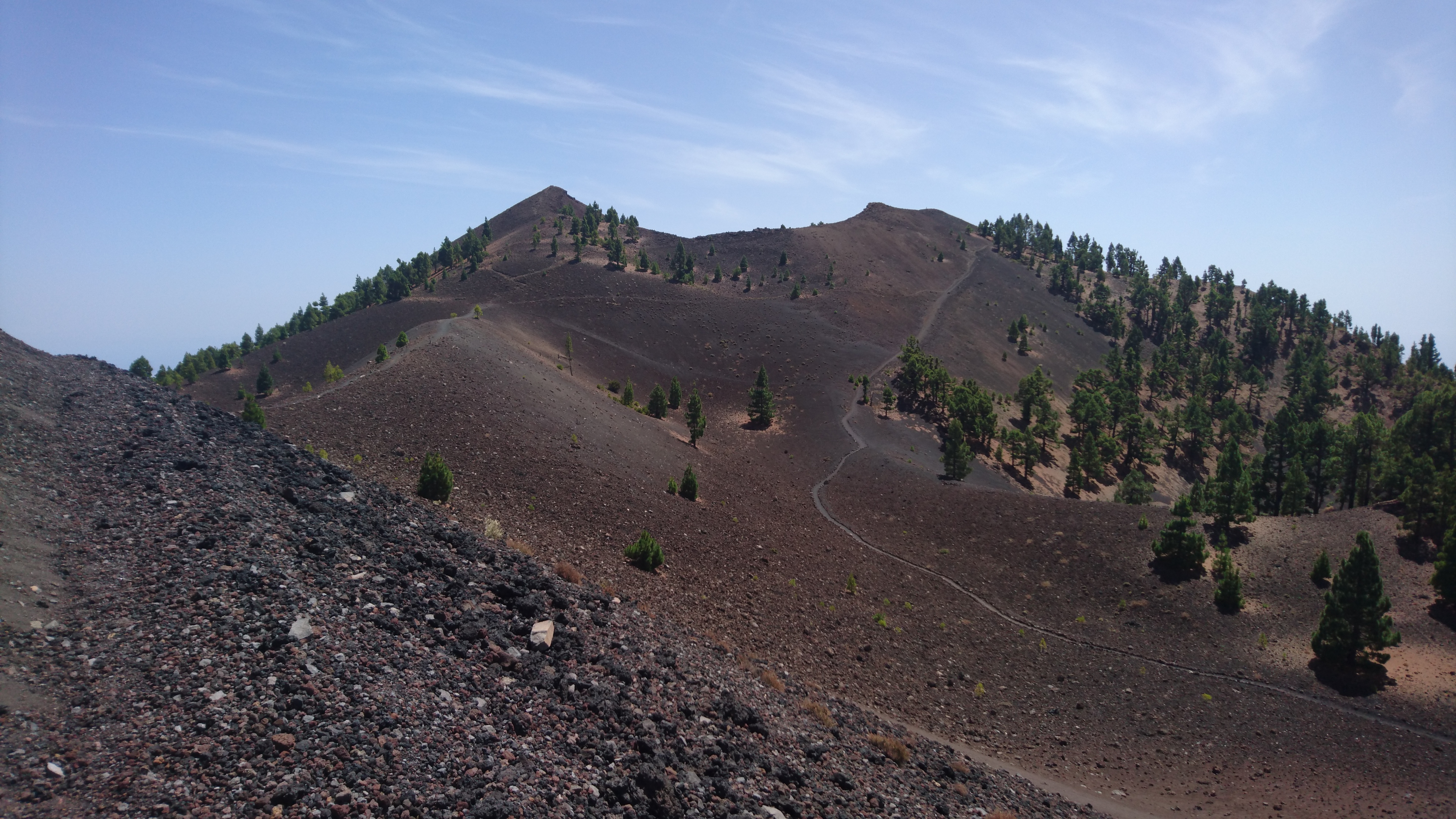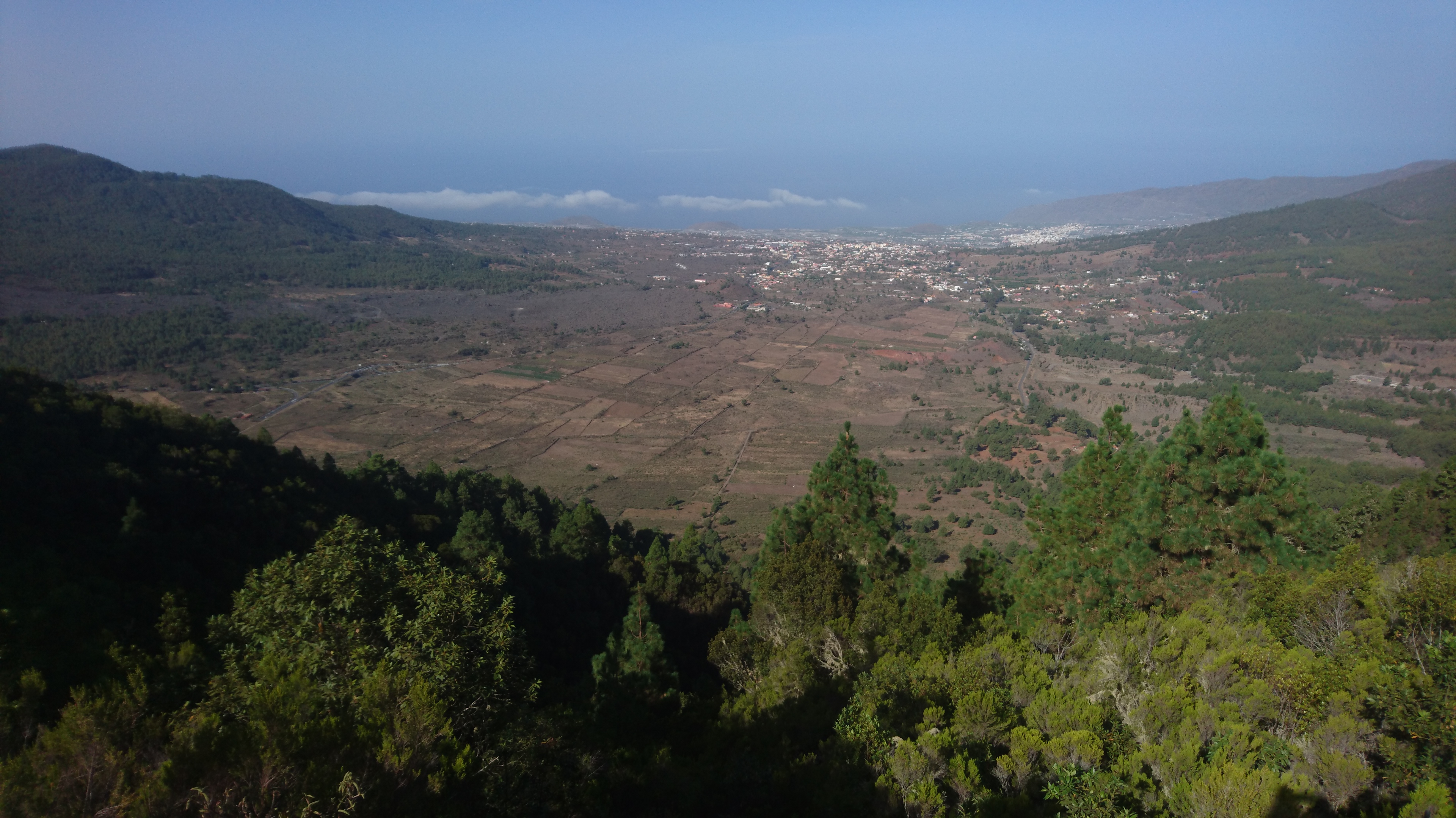 Keine Rückenschmerzen, kein Kopfweh, nichts. Ich glaube mir selbst nicht so ganz und bleibe liegen, bis das Universum um halb 8 Uhr das Licht anschaltet. Ich schaue im fahlen Morgenlicht aus der Tür auf erste Hälfte meines heutigen Wegs bis zum Freizeitplatz El Pilar auf einem 1440 Meter hohen Joch. Der Weg führt über den gesamten Bergkamm bis hinüber zum zweiten Teil des Wegs, der Vulkanroute im Süden. Das muss der Bergrücken sein, über den von Zeit zu Zeit von Ost nach West die Nebelschwaden ins Tal bei Los Llanos fließen. Heute nicht. Die Luft hier oben ist und bleibt heiß und furztrocken. Also lieber noch zwei Flaschen aus der Regenwasserzisterne füllen und auf geht's.