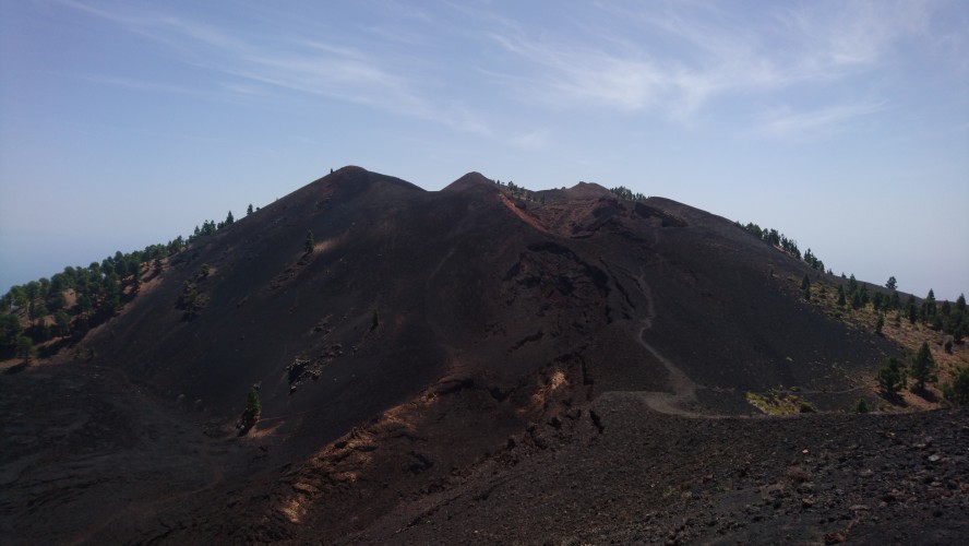 El Pilar ist coronabedingt komplett verriegelt. Normalerweise ist es ein lebhafter Ort für Alltagstouristen der Insel, Camper und viele Wanderer wie meiner einer. "Die Vulkanroute ist der beliebteste Wanderweg der Insel. Sie werden nicht alleine sein.", sagt die Wegtafel des GR 131 am Ende der Umleitung. Die Apokalypse im Nacken sieht das anders aus. Außer des stetigen Kiefernwindes ist hier niemand. Schlückchen für Schlückchen wasserspare ich mich hinauf zu den Vulkanen. 6er im Lotto, würde ich mal sagen. Das wünscht sich doch eigentlich jeder! Viele Fußspuren, viele Kiefernnadeln, die hier wohl niemals verrotten und 500 Meter höher stehe ich am ersten Krater. Hier war ich schon vor 12 Jahren. Einmal mit Regengischt, ein paar Tage später noch einmal bei Wetter wie heute: Heiß und trocken. Die schwarze Vulkanasche macht es nicht besser und erfordert meine Hochsicherheits-Huaraches. Den schwärzesten der Krater möchte ich mir ansehen. Hier liegen kunterbunt schillernde Steinchen herum. Ha, ein Schatz! Mitnehmen. Ich drehe mich um und sehe die gesamte Caldera mit den Küsten rechts und links. Puh, ist das schon weit weg und da oben auf der Kante steht ganz winzig und eigentlich nicht erkennbar, wenn man es nicht weiß, das Refugio. Genau in der Mitte noch viel winziger der Pico mit seiner Wetterstation. Links liegt La Punta am Berghang. Alle drei Tage im Blick und eine ganz konkrete Vorstellung von der eigentlichen Dimension der Insel. "Da warste jetzt überall"... 10 Sekunden wirken lassen.......... Auf in den Süden.