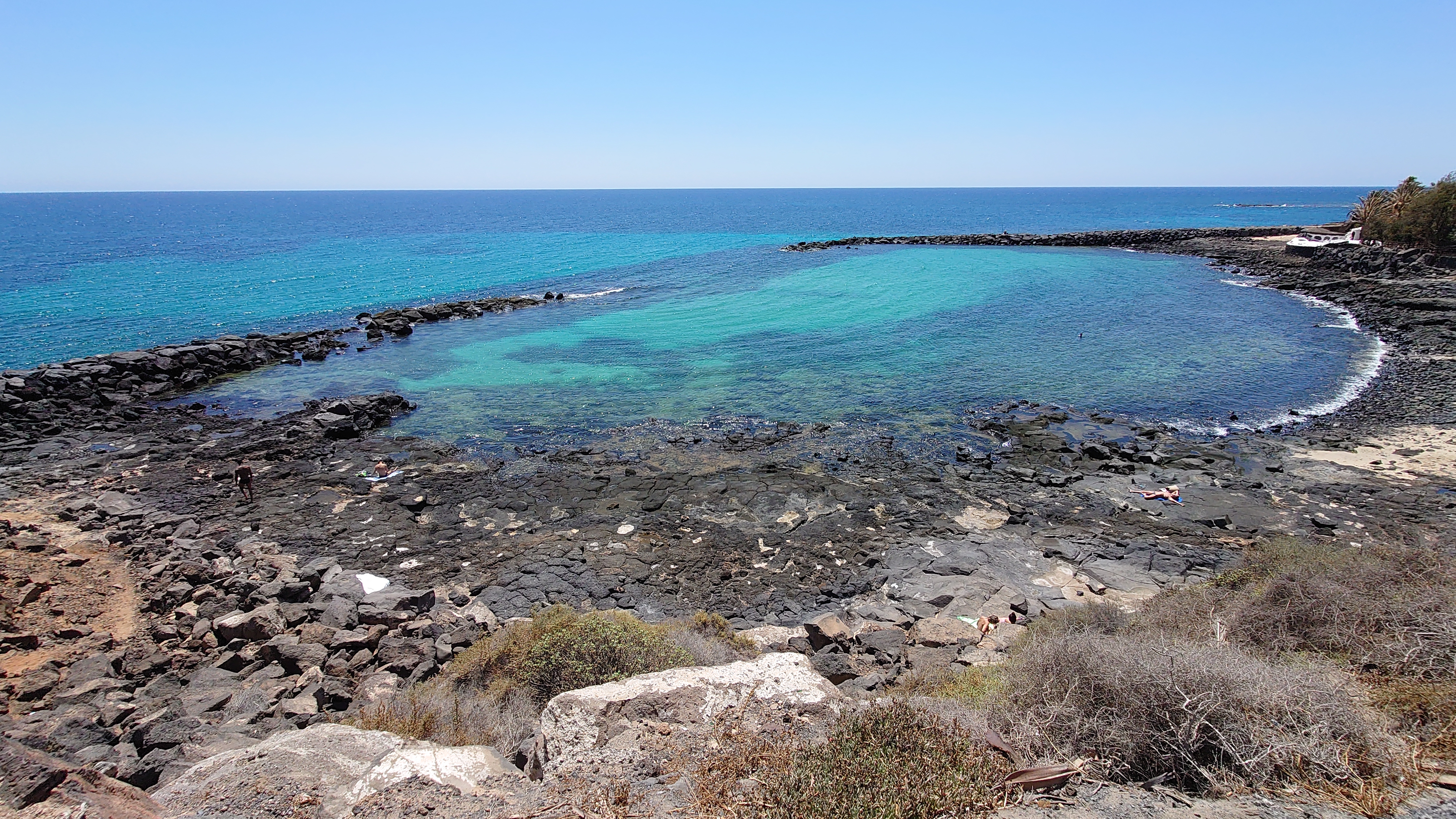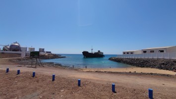 Hier stand vor 25 Jahren das einzige Hochhaus der Insel, ein 1994 abgebranntes Grand Hotel, das schon zu Zeiten meiner Eltern 1972 existierte. Es wurde gebaut, bevor der Inselkünstler César Manrique durchsetzte, dass auf Lanzarote nurmehr weiße, zweistöckige Gebäude mit grünen Fensterläden gebaut werden dürfen. Wie auf Hiddensee eigentlich. Auch dort steht ein dreistöckiges Hotel, das wie dieses vor sich hinrottete, anstatt abgerissen zu werden. Schließlich hätte man es in der Höhe nie wieder neu errichten dürfen. Direkt an der Küste steht es hier auch immer noch. Es wurde tatsächlich renoviert, mit Glas verkleidet und ist auch wieder zu einem Grand Hotel mit Spa geworden, das in dieser Form Unikat auf der Insel bleiben wird... hoffentlich. Das mit dem grünweiß und zweistöckig... naja... da scheint es eine Menge touristischer Ausnahmen zu geben mittlerweile. Aber es tut dem Antlitz der Stadt gut. Das ist gar nicht so unhässlich hier.Es geht weiter entlang des Marinehafens und des Inselkraftwerks. Viele kleine Buchten gibt es hier mit zweifelhaftem Ausblick auf die Hafenanlagen und sogar auf ein beeindruckendes Schiffswrack. Aber mit Duschen, ganz zu meiner Freude: Seesack weg, planschen, duschen, weiter. Aaaah! Mehr davon.