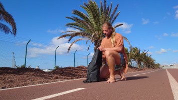 So stehe ich hinter der automatischen Arrival-Ausgangstür bei trockenen 31 Grad, ziehe meine Alibi-Sandalen aus, atme den Gestank von parkenden Bussen und Kerosin ein, aktiviere meinen selbst gesteckten GR 135 auf Orux Maps und setze den ersten Schritt nach rechts in Richtung Arrecife. 20 Kilometer liegen heute noch vor mir, aber es wird super. Alleine hier zu sein ist super. Vom Flughafen aus führt ein brandneuer Fußgänger- und Fahrradweg bis zu meinem Zielort Costa Teguise. Ich kann wahrscheinlich den ganzen Rundweg zu Fuß vom und bis zum Flughafen laufen. Das gefällt dem perfektionistischen Ich-Teil, der die Insel kompromisslos und vollständig umwandern will. Der andere Teil freut sich über den unperfekten Dreck und die Vulkanansche unter den Fußsohlen und der Salzluft auf der Haut, die jenseits des Rollfeldes langsam aber sicher das Kerosin verdrängt.