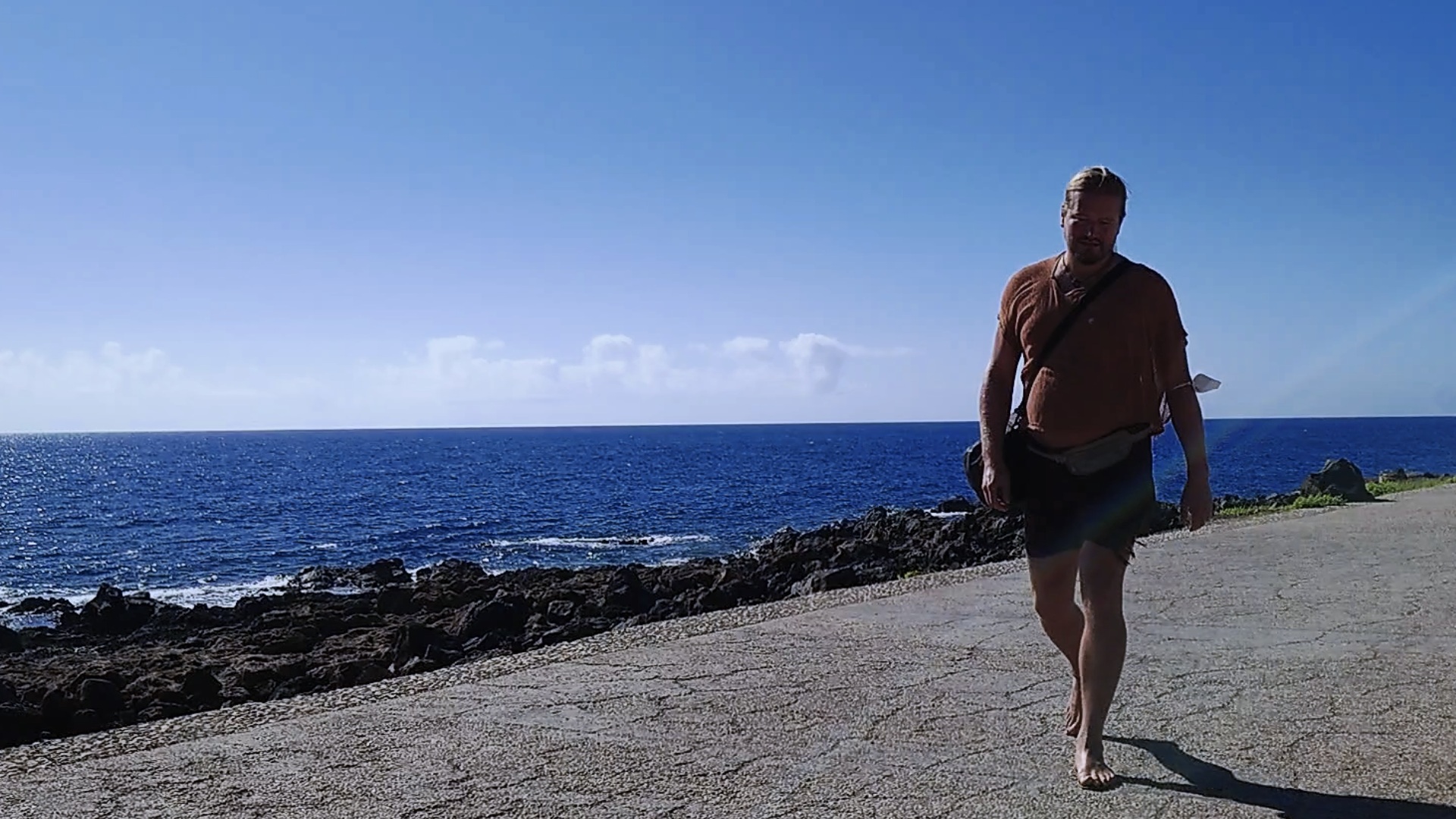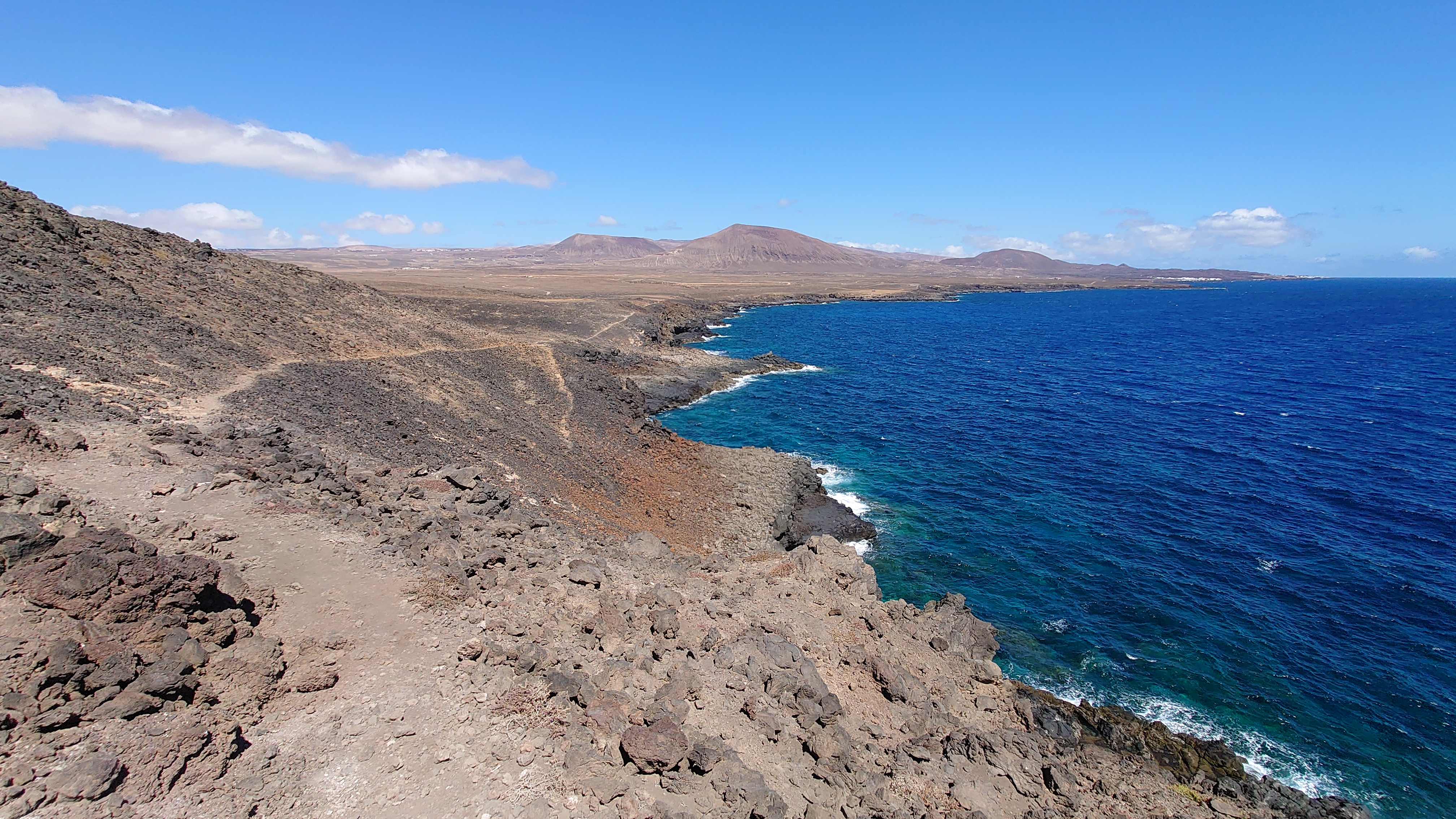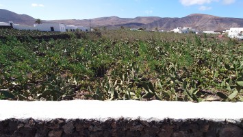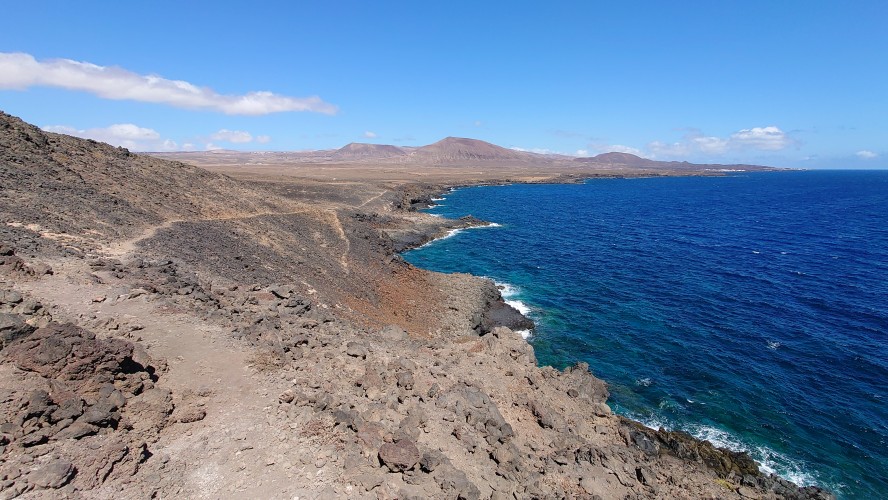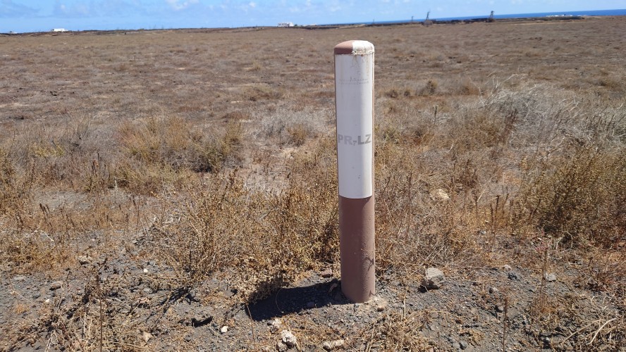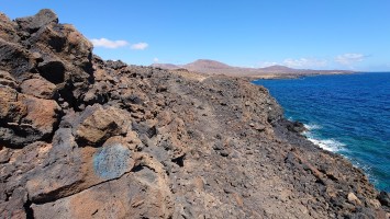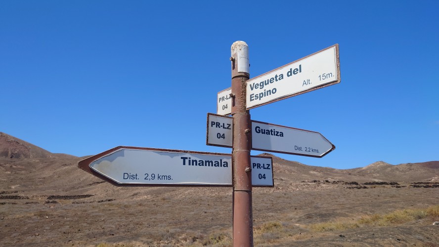 Die Piste und die Seitenabstecher führen allesamt ins Nichts. Trotzdem sind viele Spuren darauf zu sehen. Von Quads augenscheinlich. Kaum gedacht, kommt mir eine Kolonne von 5 Quads entgegen mit jungen Leuten, die Skibrillen und GoPros aufhaben und eine Menge Staub aufwirbeln. Mir gefällt das actionlastige Urlauben irgendwie nicht. Säße ich auf so einem Ding, dächte ich die ganze Zeit, wie schön es wäre, wenn man hier wandern ginge, denke ich mir und realisiere, dass ich hier wandere. Da bin ich aber froh! Und während ich saufroh vor mich hinschländere, kommt mir ein kleiner rostiger Pfeiler entgegen. Nanu? Ist das ein Wanderschild? Das Relikt wird intensiv untersucht. Leider keine Hinweise, nur Rost. An einer Weggabelung steht ein Zweiter, an der ein kleiner Weg weg von der Piste und näher zur Küste führt. Ein Indiz: das muss ein Wanderwegweiser gewesen sein. Also folge ich dem nicht deutbaren Zeichen, bis ich tatsächlich auf einen Gradweg entlang des Küstenabbruchs stoße, der verdächtige, GR-architektonische Merkmale aufweist: Steinmännchen und zur Seite geschobene Steine, ein paar künstliche Treppenstufen. Das muss er sein! Zwei drei Kilometer später dann zeigen schließlich verwitterte, blaue Farbkleckse auf größeren Steinen den Weg an. Hmmm... blaue Punkte passen nicht. Sie müssten Rotweiß sein. Aber das hier war definitiv ein offizieller Wanderweg, der aber nicht in Schuss gehalten wird. Immer wieder kommen stellen, an denen der Weg nur noch durch leichte Farbunterschiede des Sandes zu erahnen ist. Spannend. Er stößt kurz vor meinem Zielort Guatiza, der auf einer Anhöhe liegt, wieder auf eine Piste. Wieder ein verwitterter Pfeiler, diesmal aber mit fast gänzlich verblichener Plakette, die tatsächlich eine Wegbezeichnung verrät: PR-LZ 04. Kein GR also, aber ein Kleiner, der allem Anschein nach Teilstück des GR sein könnte. Soll mir Recht sein. Ich umrunde die Insel auch gerne auf aufgegebenen Teilstücken. Jedenfalls bestätigen sich die Bilder von Google Earth, die offensichtlich Wege entlang der Küste erahnen lassen und geben mir Mut, dass es so weitergehen kann. Im von Kakteenfeldern durchsetzten Örtchen Guatiza angekommen steuere ich den Supermarkt für kaltes Blubberwasser und Kekse an, mit denen ich mich auf einem weißen Betonplatz vor der Kirche in den Schatten setze und die Zeit abwarte. 16 Uhr kann ich in die Unterkunft. Zeit genug, um auf den Betonbänken Löcher in den blauen Himmel zu starren. Hmm... Kanaren lieben Beton. Bodenversiegelung... das spielt hier keine Rolle, so wenig, wie es regnet. Das Dorf hier ist toll hergemacht worden mit all dem Beton und sieht so geschlossen und kompakt aus, wie ein gigantisches Haus ohne Dach. Der Wind weht heiß umher. Niemand ist hier. Ich probiere die neuen Funktionen meines Handys erstmal alle aus. Ich musste schweren Herzens mein altes Z5 aufgeben, nur weil es softwaretechnisch als unbrauchbar diffamiert und damit zu Edelschrott deklassiert wird. Es funktioniert. Aber der kapitalistische Gedanke hinter dem technischen Fortschritt will, dass es nicht mehr funktioniert. Sonst könnte man ja merken, dass Handys 20 Jahre anstatt 3-4 Jahre standhalten können. Doch ich realisiere, dass ich zur Aufgabe gezwungen bin, denn abkoppeln will ich mich auch nicht von informatorischer und digitaler Veränderung. Das geht alles so rasend schnell, da kann Verachtung dessen sehr schnell gefährlich alt werden lassen. Und ich habe beschlossen, als 80-jähiger jung und schrullig in der Mitte der nächsten Generationen zu enden.