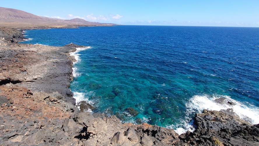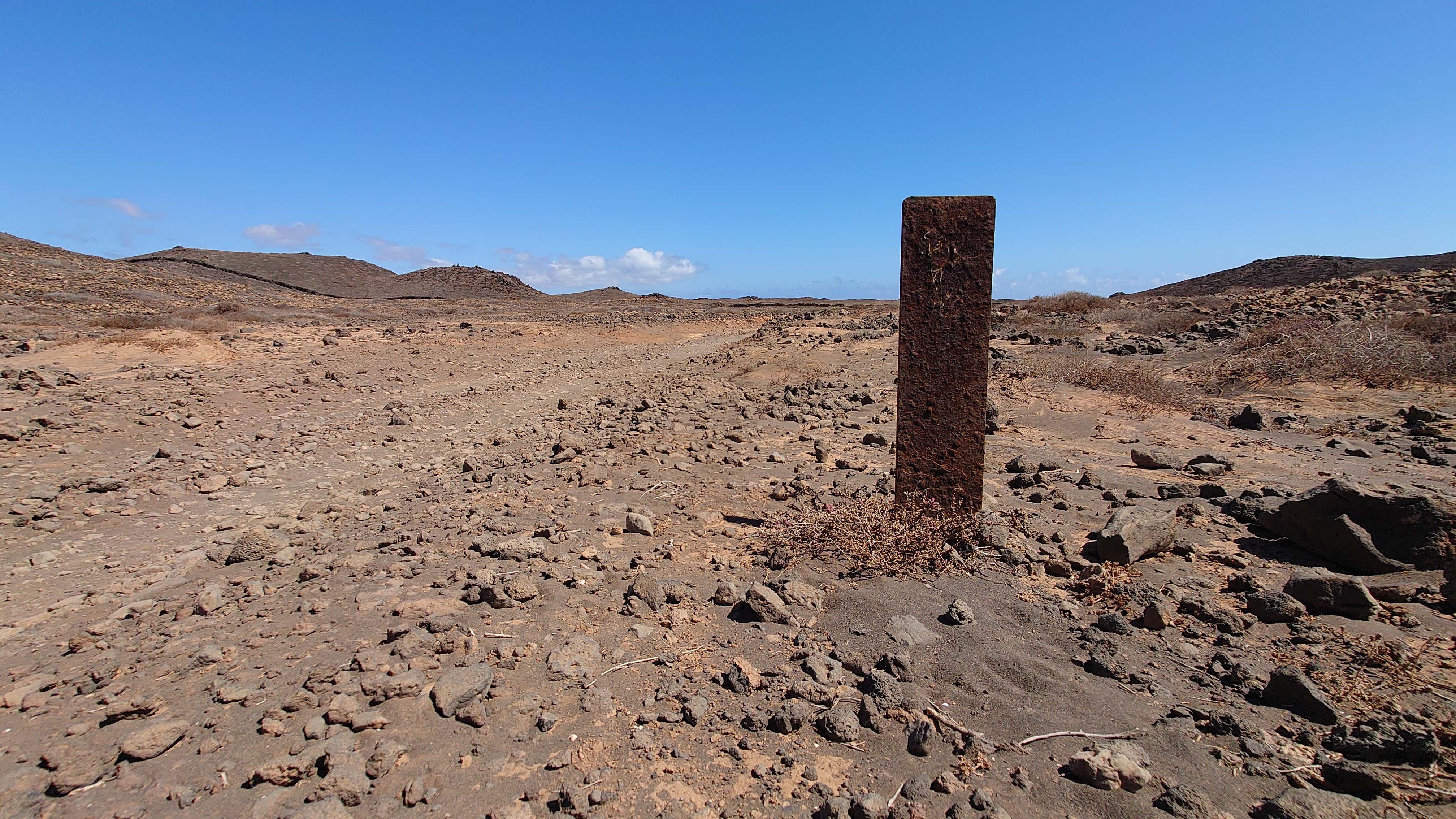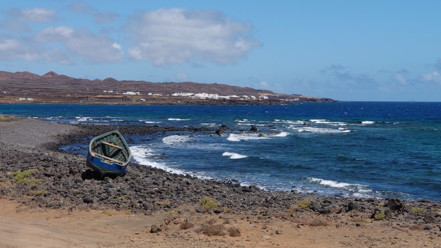 Zum Glück lasse ich heute die Plastikgirlande hinter mir. Nach ein paar Bauruinen der Nuller Jahre am Ortsrand tauche ich endlich in die bekannte Wüstenlandschaft ein. Es unterscheidet sich kaum von Fuerteventura, nur dass mir die rotweißen Markierungen dann doch fehlen. Eine Piste schlängelt sich entlang der Ostküste und ebnet mir den Weg weiter in Richtung Norden und ich bin allein. Also Klamotten aus, Sonnencreme an. Ich nehme mir Zeit. Ich habe mich regelrecht nach Staubigem, heißer Sonne und Kargheit gesehnt, merke ich. Das war auf den letzten Inseln nicht unbedingt so. Ich denke, der Alltag ist manchmal eine spur zu bunt geworden.