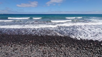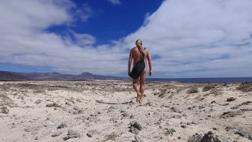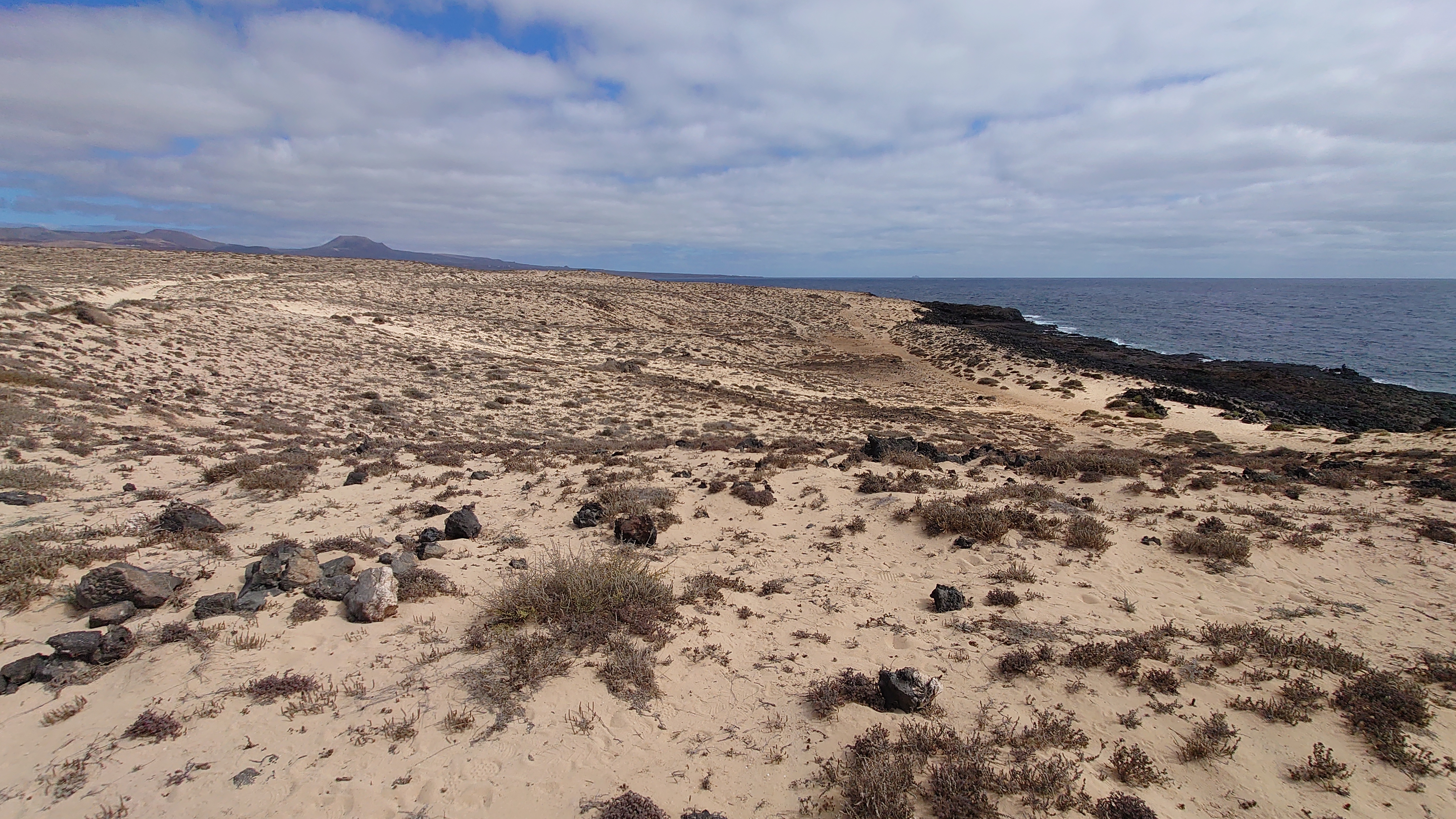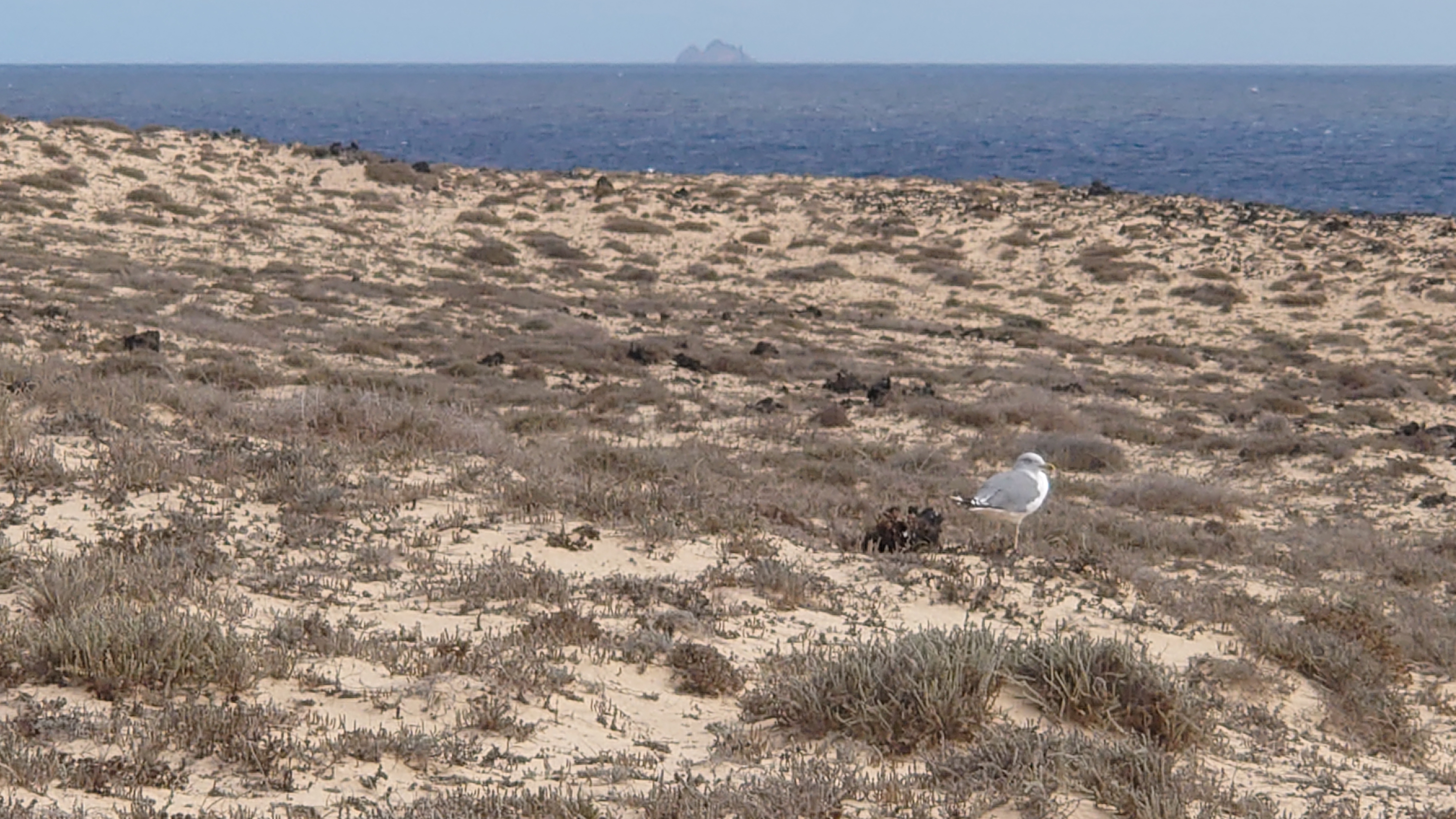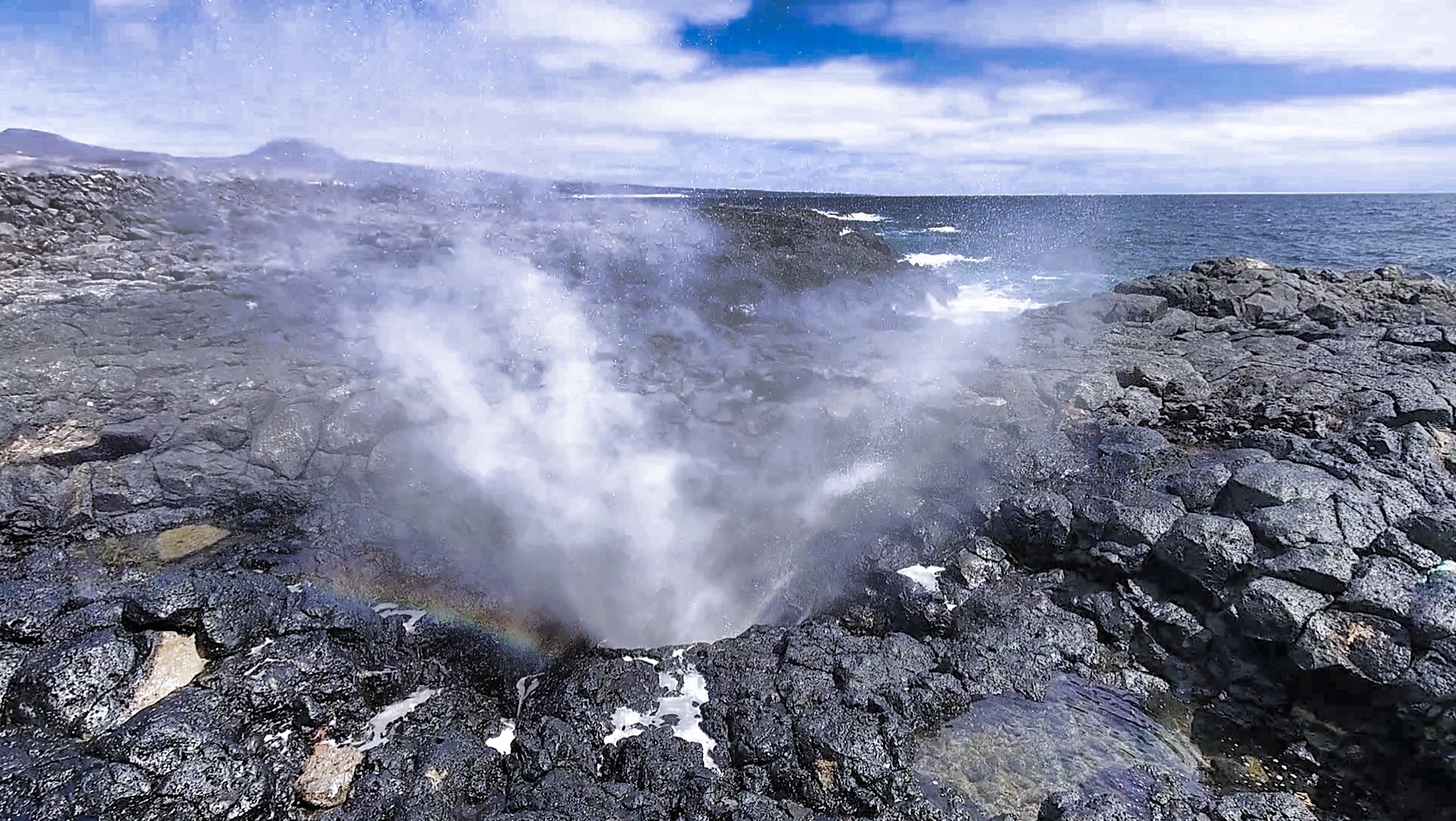 Ich passe mich an, ziehe auch blank und schlender weiter entlang der Küste in die Wüstenlandschaft und Richtung Norden. Das Farbspiel nach Verlassen der Siedlung lässt sich am ehesten als russischer Zupfkuchen beschreiben. Hinter einer schwarzen Lavakrustenküste hat sich quietschgelber Sand zu Dünen aufgetürmt, der so gar nicht zum Inselcoleur passen will. Hmmm... ob das wohl Sandablagerungen der Saharawinde sind? Es macht jedenfalls das Barfußlaufen deutlich angenehmer. Nur zum Wasser gelangt man nicht ohne immense Verletzungsgefahr. Sanddünen toll! Sandstrand sucht man vergebens, nur pechschwarzes, scharfes Lavagestein. Auch ein Indiz dafür, dass der Sand vom Festland hierher emmigriert ist. Viele Löcher haben sich entlang der Küste gebildet, die wie gewaltige, erkältete Nasen schnauben und Gischt niesen. Ich wage mich an eine der Nasen heran. Das will ich filmen! Es dauert drei Minuten, bis ich in Form eines mit einem Gischtregenbogen überspannten, überdimensionalen Hatschis mit Wasser vollgespritzt werde und fast umfliege. Das hat ne Kraft!