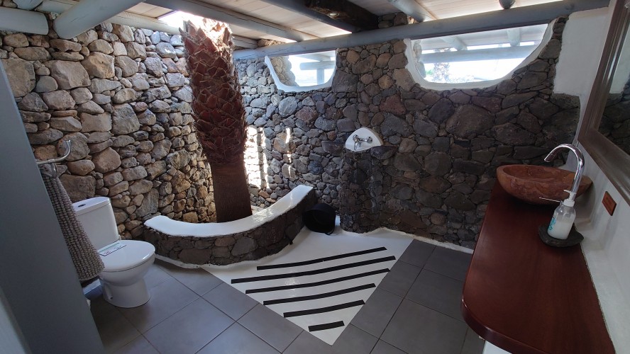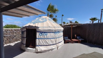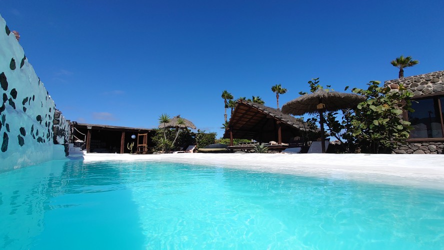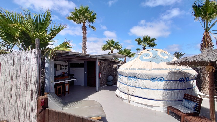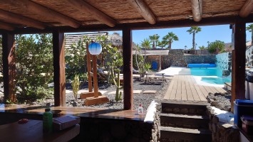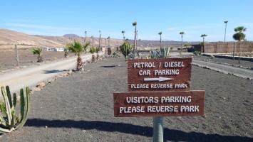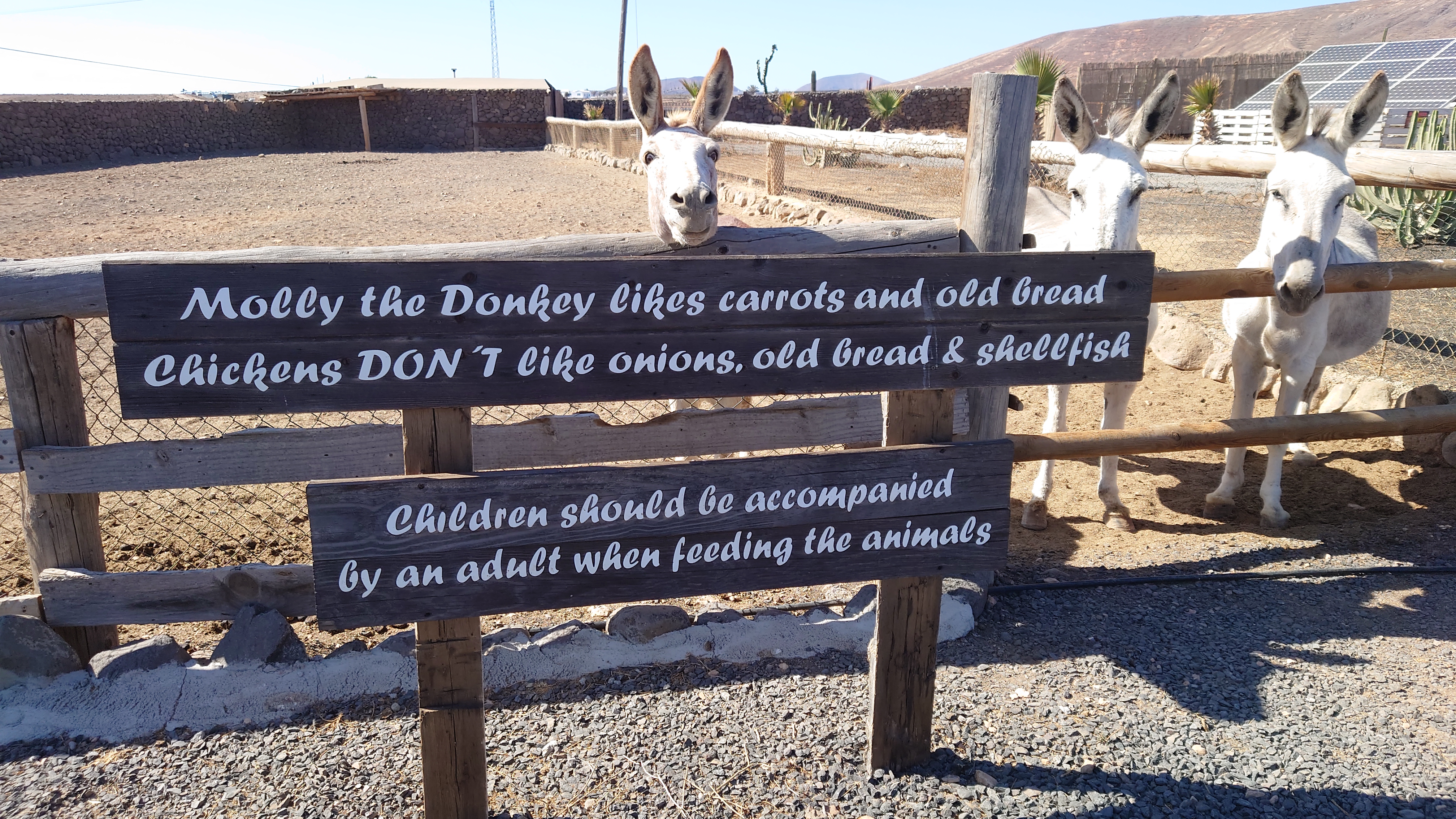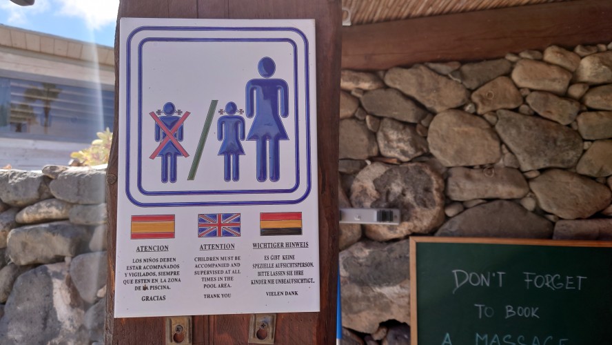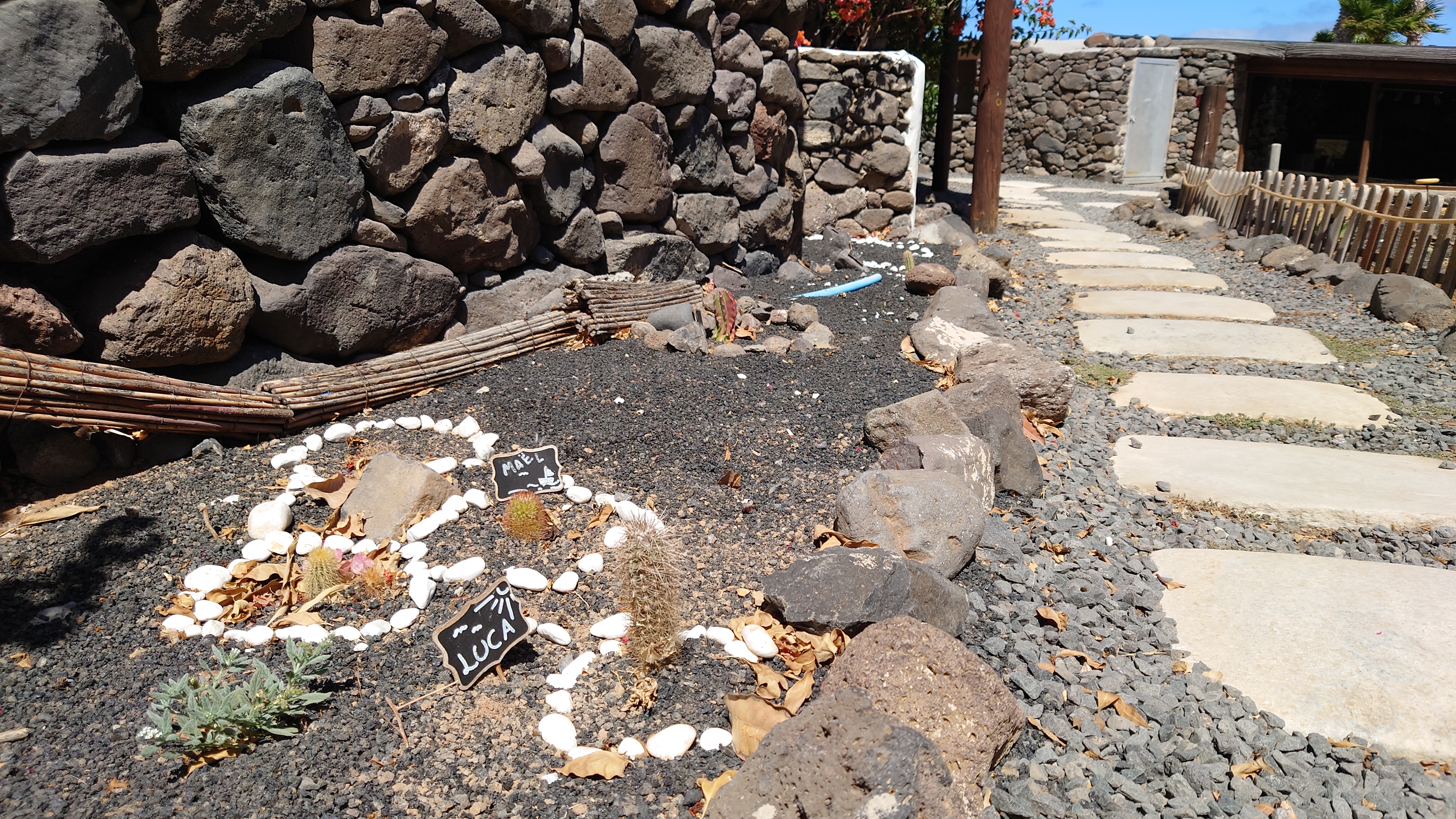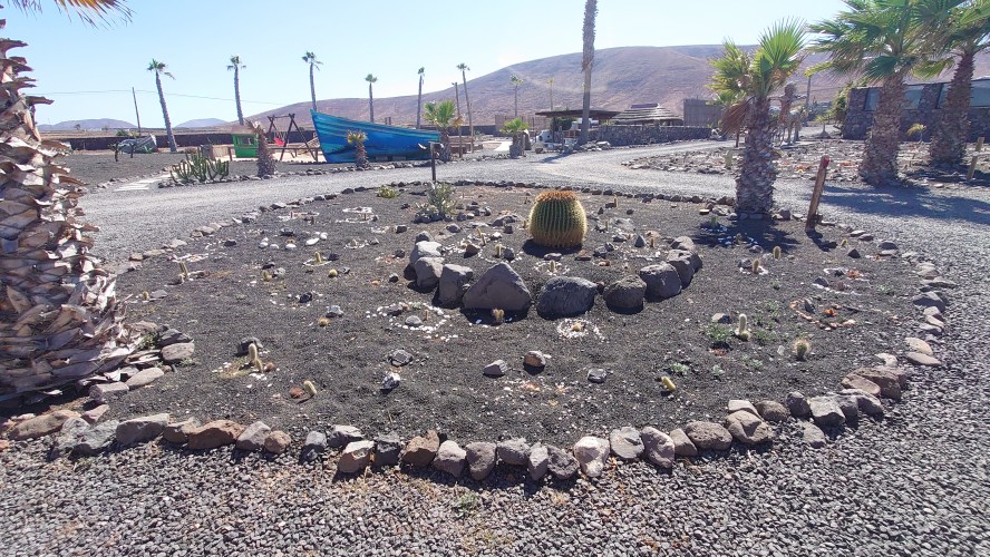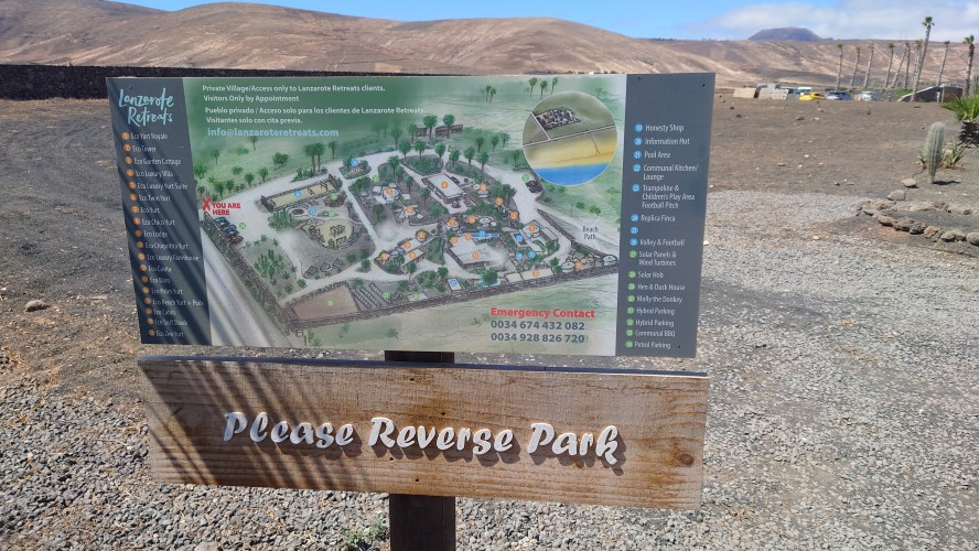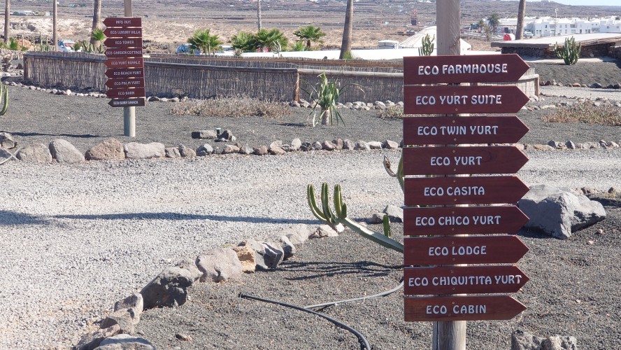 Weiter nördlich eröffnet sich schließlich eine riesige Meeresbucht und der gelbe Sand weicht abrupt dem üblichen, staubigen Farbgemenge Lanzarotes. Zwei Ortschaften strahlen weiß und zweistöckig am gegenüberliegenden Ende der Bucht. Mein Ziel für heute ist jedoch ein vorgelagerter, langer, menschenleerer Kieselstrand. Nur drei vereinzelte Wohnmobile stehen individualistisch herum. Hier oben im Norden ist das Wasser deutlich rauher geworden, aber es ist durch den fehlenden Sand glasklar wie das Mittelmeer. Und ungewöhnlich warm ist es auch, schätzungsweise 25 Grad. Ab in die Fluten! Zwei Stunden lang. Mein Domizil für heute nacht, die Finca de Arrieta, liegt direkt hinter dem Strand. Erstmal den Eingang finden dort... Irgendwann ist er gefunden und ich betrete eher eine Art Freizeitpark. Es wirkt, als wolle jemand ein Miniatur-Phantasialand auf Öko errichten. Schilder säumen den Park mit Tonnen von Hinweisen, als müssten hier hunderte Besucher ordnungsgemäß durchgeschleust werden. Nur bin ich alleine hier. Dieselfahrzeuge haben direkt am Ausgang zu bleiben wie Hunde vor den Läden. Danach sind nur noch E-Fahrzeuge erlaubt, die mit maximal 10km/h weiter zum Hybrid-Parkplatz fahren dürfen. Aber bitte rückwärts einparken, zur Sicherheit der Kinder! Und keinen Müll in die Gegend werfen. So wird man um das halbe, fußballfeldgroße Areal herum geführt, bis weitere Wegweiser ins Innere führen, wo viele Jurten stehen und ein Türmchen. Ein akribisch gepflegter Kaktengarten umsäumt die Gebäude. Auf kleinen Schildchen wird jede Gattung beschrieben. Wieder ist es so still wie in dem Örtchen eben. Verwirrt frage ich einen umherhuschenden Gärtner wo die Rezeption ist und werde an einer offenen Küche entlang zu einem mit Hinweisschildern übersäten Häuschen geführt. Eine blonde Britin grinzt mich durch ein Fenster an. Ich hätte es mir denken können. Permanente Fremdbestimmung durch Tafeln, Schilder und jegliche andere Form der diskreten Warnung und Zurechtweisung, als wäre Mündigkeit eine stets zu reglementierende Unberechenbarkeit des Menschen, das ist irgendwie irisch/britischer Stil.