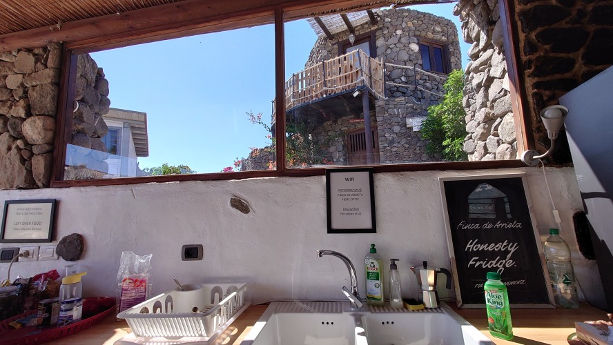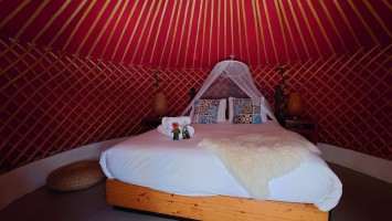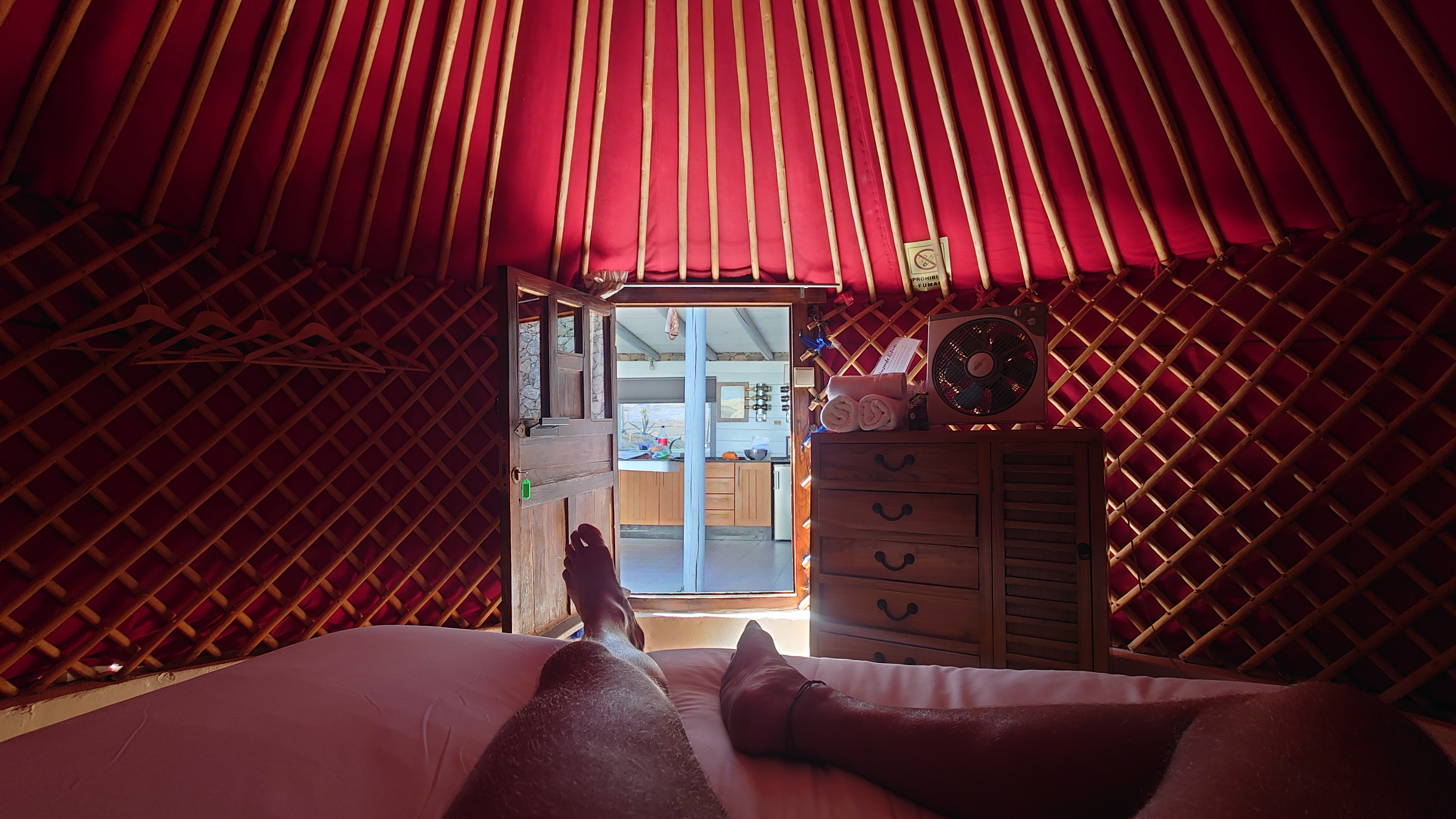 Im krassen Gegensatz dazu steht die Freundlichkeit der Besitzerin und das in die Besucher gesteckte Vertrauen, die überall vefügbaren Dinge und Lebensmittel, die man aus dem Honesty Fridge und dem Honesty Shop einfach entnehmen kann, doch bitte freiwillig auf einem Strichzettel aufzuzählen und am Ende abrechnen zu lassen. Alles hat hier Namen. Alle fangen mit Eco an. Eco Kitchen, Eco Tower, Eco Yurt. Ich bekomme die Eco Yurt Chico, die wie alle Jurten hier in einer kleinen Art Schräbergärtchen stehen. Daneben ein Badezimmer, aus dem eine Palme herauswächst, sowie eine Küche, die eher eine möblierte, überdachte Terasse ist. Was daran öko ist, erschließt sich mir nicht ganz, aber es ist in jedem Falle höchst individuell, das alles hier. Eigenartiges Konzept, das wie ein wahr gewordener Sim-Park-Kindertraum wirkt. Ich liebe es 🌈! So sitze ich jetzt in einem über 30 Grad warmen Pool mit Warnschild, man möge bitte beim Aussteigen den Schotterweg nutzen, weil der weiße Beckenrand rutschig ist und schreibe meine heutige Etappe auf. Die Honesty-Fridge versorgt mich mit phantaistisch schmeckenden Aloe-Vera-Drinks mit Stückchen drin aber ohne Kalorien. Ich habe einen Gasofen in der Open-Air-Küche stehen und backe mir heute Abend eine leckere Öko-Fertigpizza aus dem Honesty Shop, bevor ich meine Jurte entweihe, die direkt aus den Kammern Lord Baelishs in Königsmund entsprungen sein könnte...
