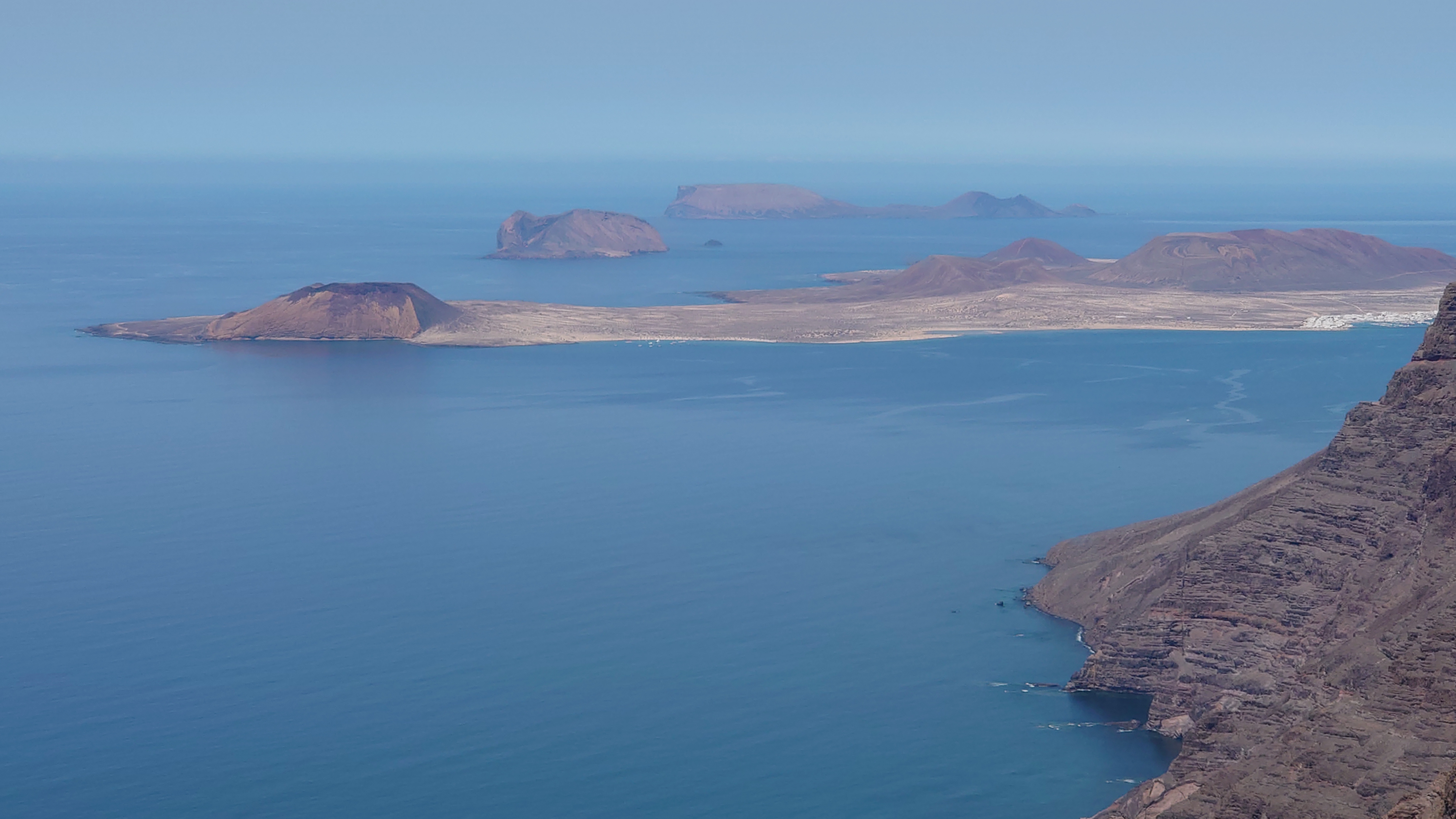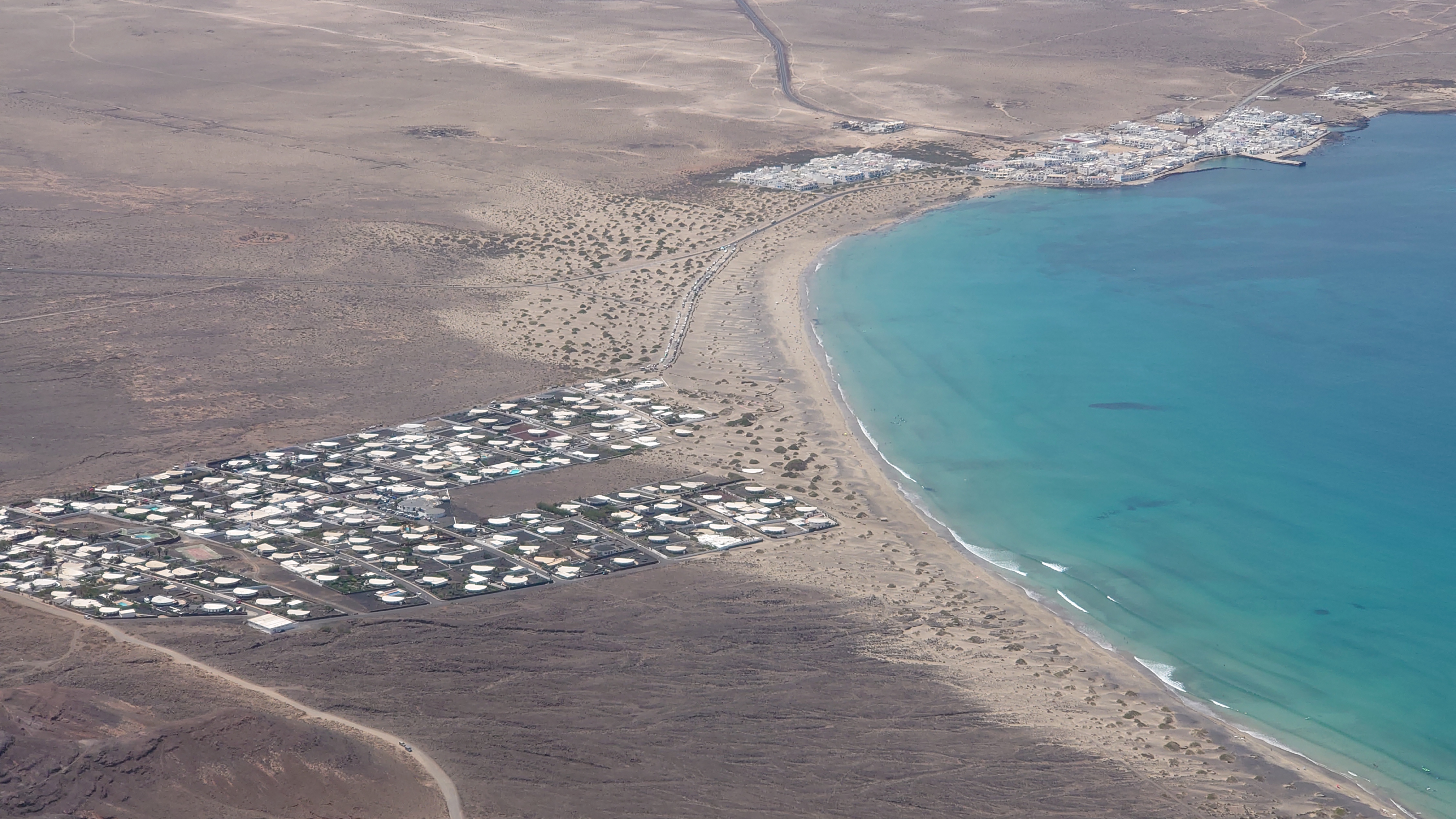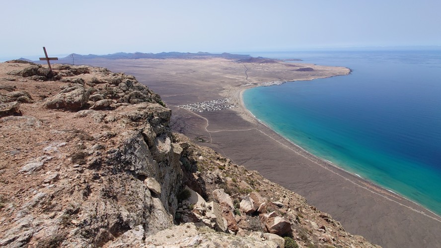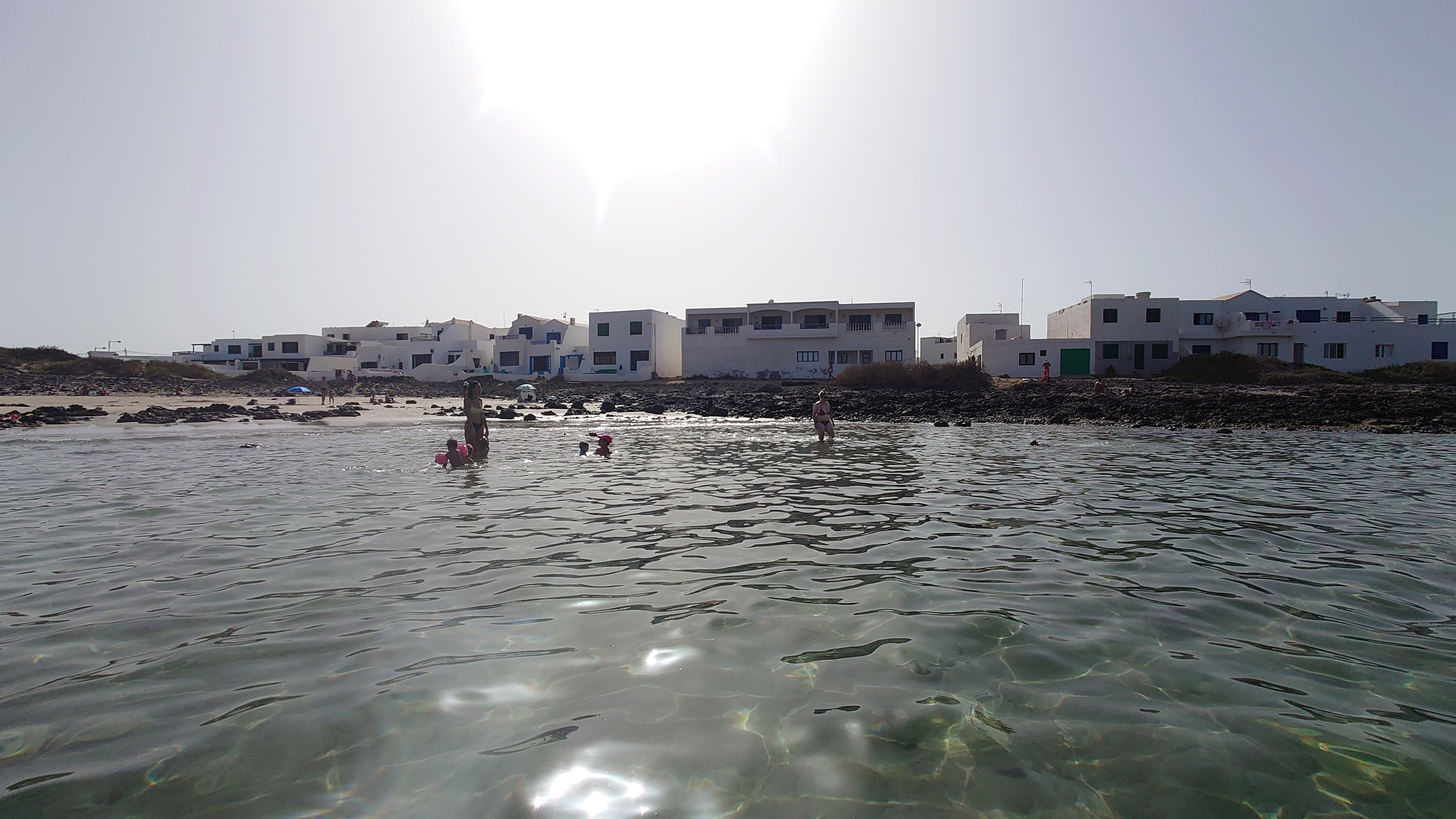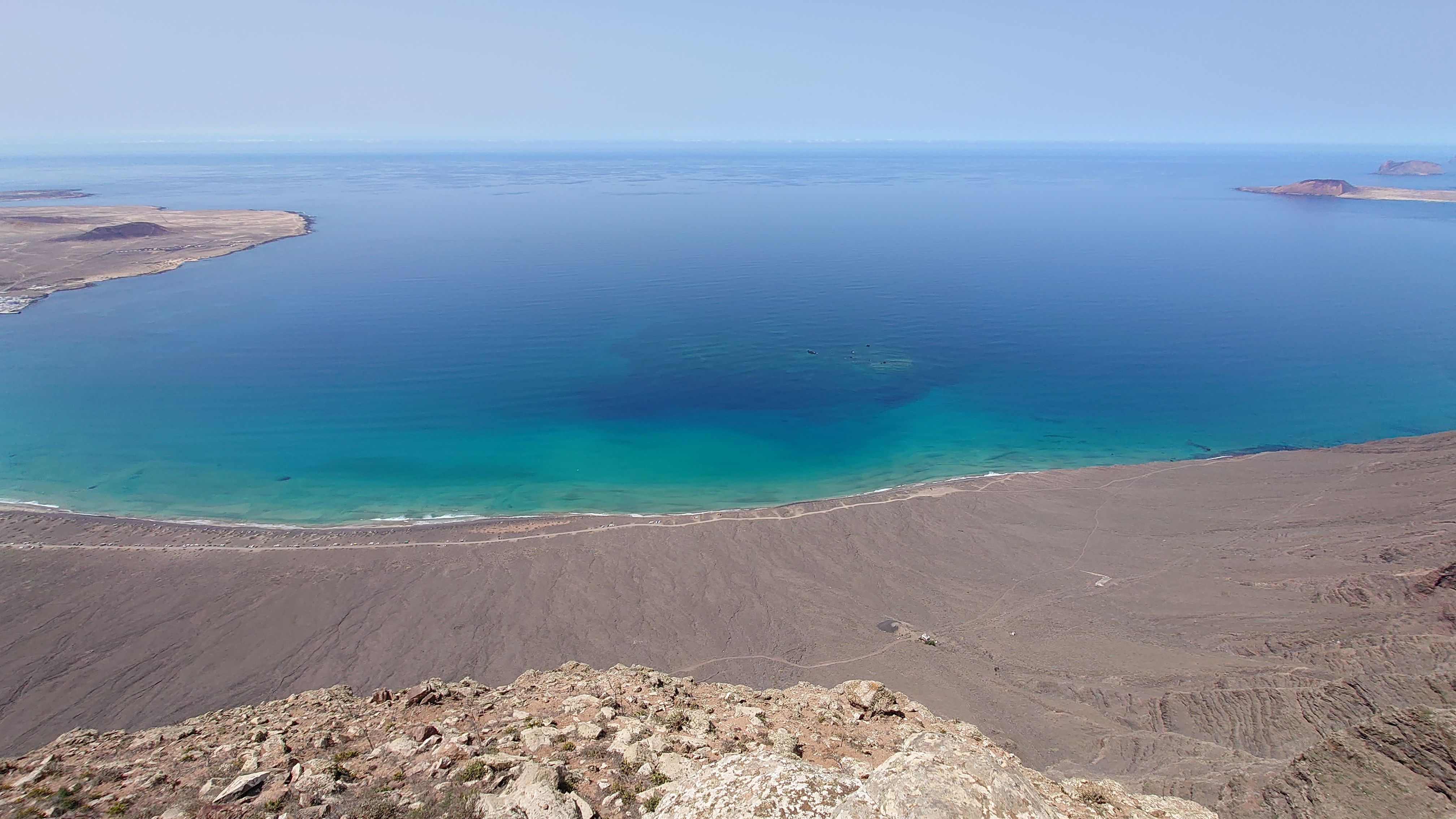 Mich zieht es weiter an die Steilwand zur Erhebung El Castillejo. Hier hoffe ich auf einen spektakulären Blick 615 Meter hinunter nach Famara. Und der Blick ist heftig. Senkrecht unter mir tut sich die riesige Strandbucht als türikses Band entlang der Steilküste auf und weiter hinten La Graciosa. Vor 25 Jahren war hier stetig heftige Brandung. Jetzt, wahrscheinlich jahreszeitbedingt, ist es fast glatt. Miniaturautos stehen hier und da an einer Piste. Strandburgen aus Wackersteinen, die von oben wie Minivulkänchen aussehen, zeugen von den hiesigen Vorlieben für das Ausleben eingepferchter Nacktheit. Im flachen Wasser schwimmen manchmal unscharfe, schwarze Flecken, die sich teilen, um danach wieder zusammenzufinden. Was ist das denn?! Kurios. Ich muss hier erst einmal herunter kommen. Und ein erschreckter Blick in die Wasserflasche lässt mich innerlich mit den Augen rollen. Mal wieder zu wenig Trinken. Famara sieht echt noch weit weg aus von hier oben und Wasser brauche ich hier nicht zufällig erwarten. Nadann, du weißt ja, wie das geht: Mund zu und ab dafür. Glücklicherweise ist mein virutell erkannter Weg im Gegensatz zu dem gesterigen wirklich ein guter Wanderweg hinab zur Küste. Erstaunlich grün ist es hier. Es wird wohl das einzige Kerbtal auf meiner Route sein. Soll mir recht sein. Mit den zu erwartenden Dehydrierungskopfschmerzen erreiche ich die alte, norwegische Ferienanlage mit ihren Halbmondhäuschen, die mittlerweile gänzlich in viele private Hände aufgeteilt wurde. Ich brauch Trinken. Wo ist Trinken? Ein durchrostetes Supermercadoschild am oberen Ende der Siedlung sagt "da lang". Denkste, vor 30 Jahren vielleicht. Jetzt ist "da" eine riesige Sanddüne und eine Betonruine. Am Ortsrand vom eigentlichen Famara ist er dann schließlich. 3 Liter Blubberwasser später kann ich wieder klar denken und widme mich dem Strand. Voll ist es hier. Tonnenweise Mietwagen. Alle sind da. Aber es verteilt sich an der gewaltigen, kilometerlangen Bucht. Ich spring ins Wasser. Schweiß wegschwmimmen und Küste vom Wasser aus ablichten. Direkt vor mir taucht unvermittelt eine dieser schwarzen Wolken im Wasser auf und kommt wie ein waberndes Monster auf mich zu. Es ist ein riesiger Fischschwarm! Potztausend. Die Kinder quietschen erschreckt und laufen weg. Ich halte drauf. Sowas hab ich noch nie gesehen.