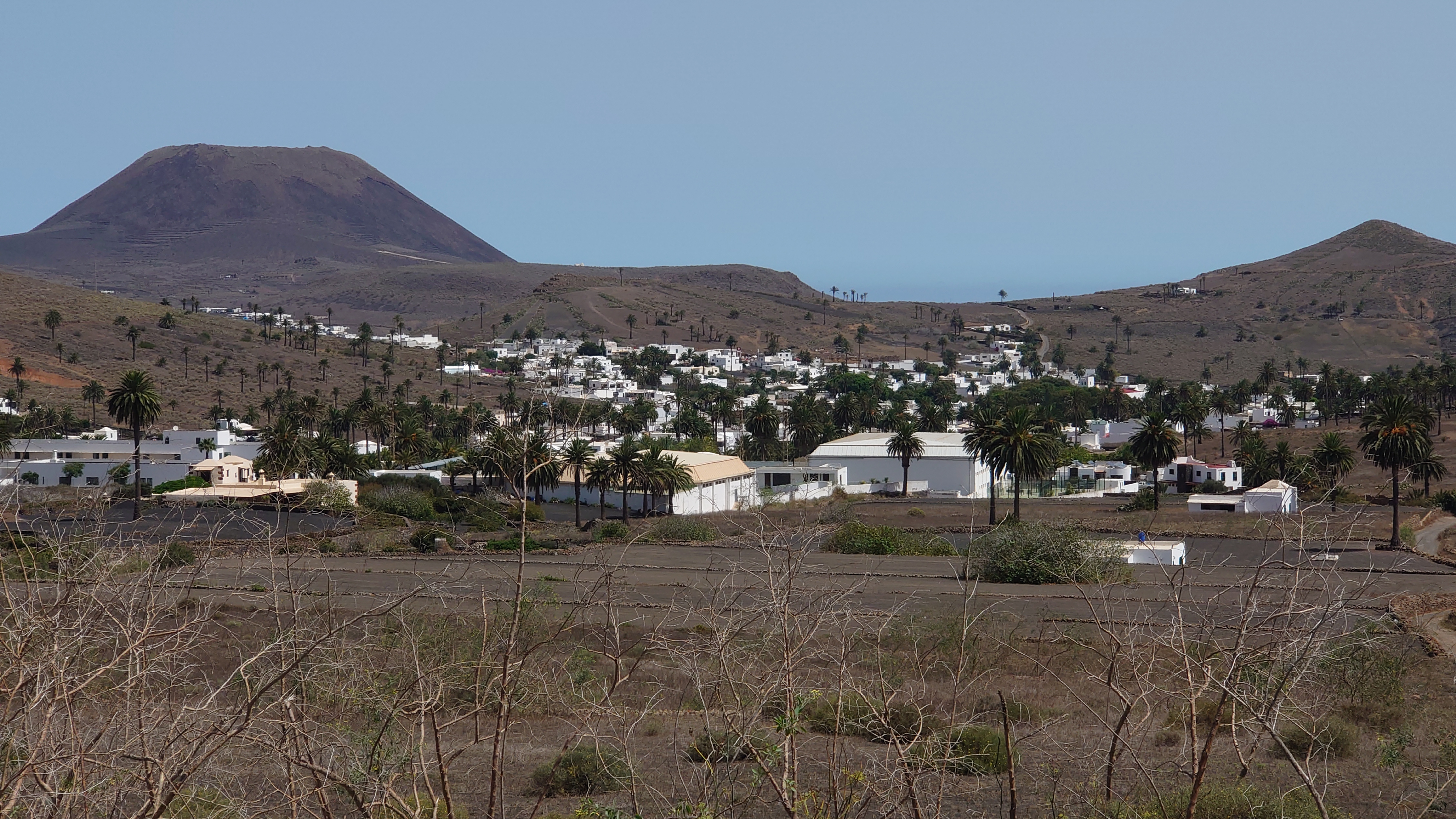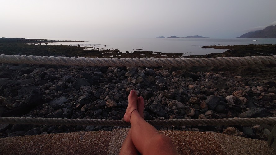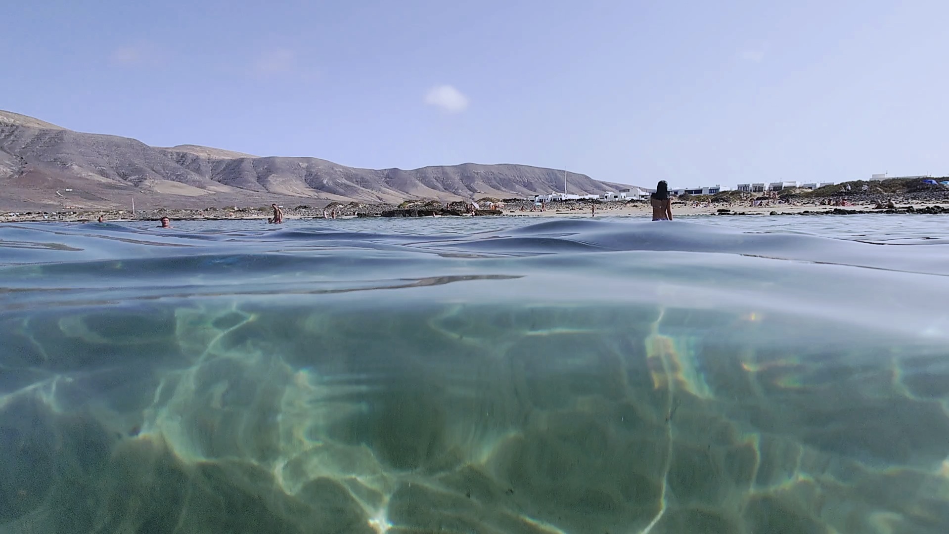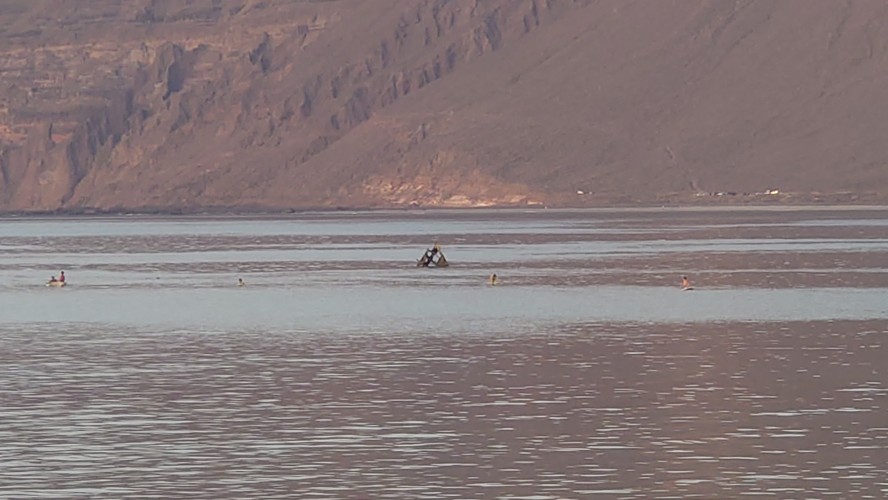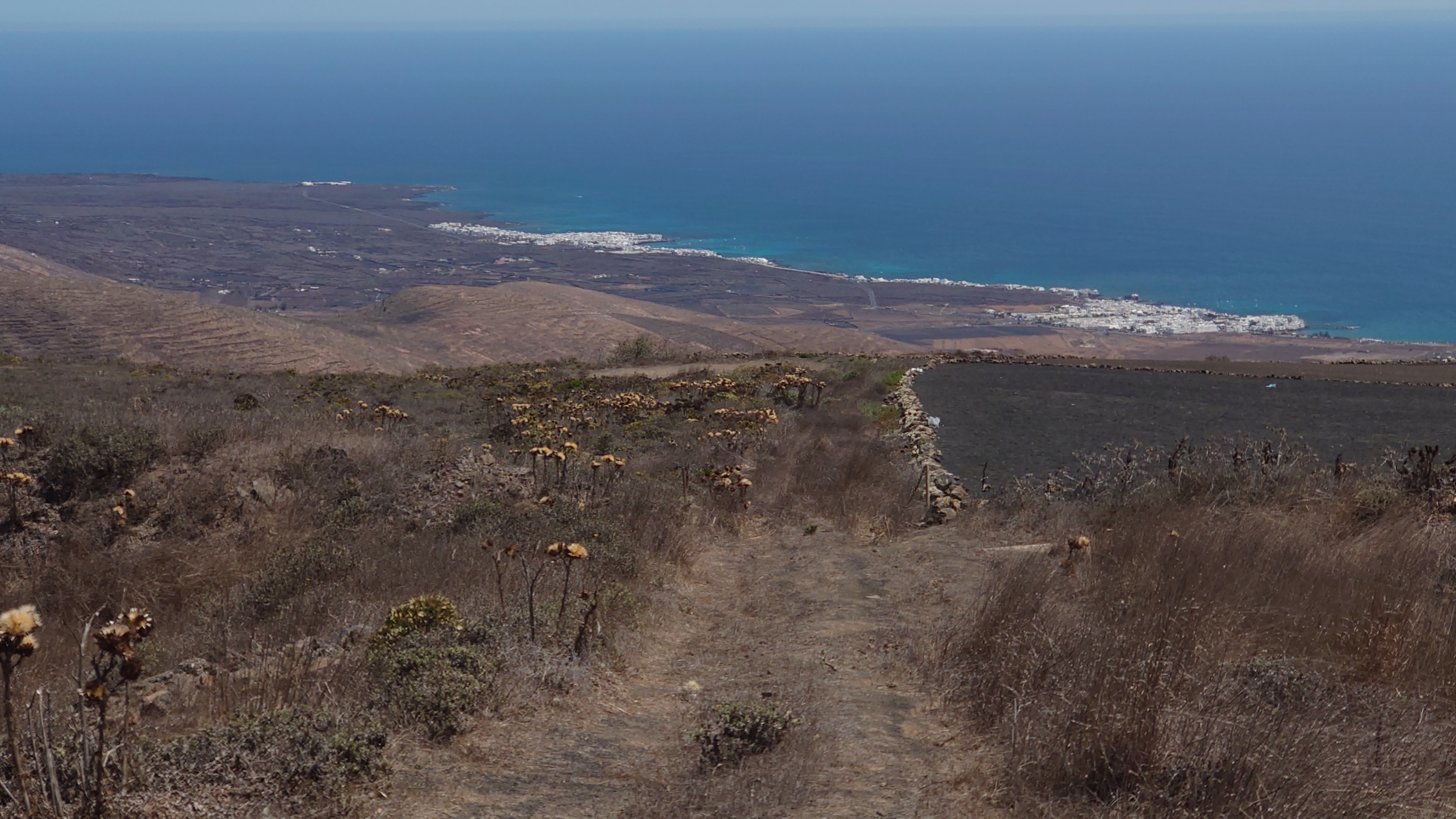 Mich zieht es weiter an die Steilwand zur Erhebung El Castillejo. Hier hoffe ich auf einen spektakulären Blick 615 Meter hinunter nach Famara. Und der Blick ist heftig. Senkrecht unter mir tut sich die riesige Strandbucht als türikses Band entlang der Steilküste auf und weiter hinten La Graciosa. Vor 25 Jahren war hier stetig heftige Brandung. Jetzt, wahrscheinlich jahreszeitbedingt, ist es fast glatt. Miniaturautos stehen hier und da an einer Piste. Strandburgen aus Wackersteinen, die von oben wie Minivulkänchen aussehen, zeugen von den hiesigen Vorlieben für das Ausleben eingepferchter Nacktheit. Im flachen Wasser schwimmen manchmal unscharfe, schwarze Flecken, die sich teilen, um danach wieder zusammenzufinden. Was ist das denn?! Kurios. Ich muss hier erst einmal herunter kommen. Und ein erschreckter Blick in die Wasserflasche lässt mich innerlich mit den Augen rollen. Mal wieder zu wenig Trinken. Famara sieht echt noch weit weg aus von hier oben und Wasser brauche ich hier nicht zufällig erwarten. Nadann, du weißt ja, wie das geht: Mund zu und ab dafür. Glücklicherweise ist mein virutell erkannter Weg im Gegensatz zu dem gesterigen wirklich ein guter Wanderweg hinab zur Küste. Erstaunlich grün ist es hier. Es wird wohl das einzige Kerbtal auf meiner Route sein. Soll mir recht sein. Mit den zu erwartenden Dehydrierungskopfschmerzen erreiche ich die alte, norwegische Ferienanlage mit ihren Halbmondhäuschen, die mittlerweile gänzlich in viele private Hände aufgeteilt wurde. Ich brauch Trinken. Wo ist Trinken? Ein durchrostetes Supermercadoschild am oberen Ende der Siedlung sagt "da lang". Denkste, vor 30 Jahren vielleicht. Jetzt ist "da" eine riesige Sanddüne und eine Betonruine. Am Ortsrand vom eigentlichen Famara ist er dann schließlich. 3 Liter Blubberwasser später kann ich wieder klar denken und widme mich dem Strand. Voll ist es hier. Tonnenweise Mietwagen. Alle sind da. Aber es verteilt sich an der gewaltigen, kilometerlangen Bucht. Ich spring ins Wasser. Schweiß wegschwmimmen und Küste vom Wasser aus ablichten. Direkt vor mir taucht unvermittelt eine dieser schwarzen Wolken im Wasser auf und kommt wie ein waberndes Monster auf mich zu. Es ist ein riesiger Fischschwarm! Potztausend. Die Kinder quietschen erschreckt und laufen weg. Ich halte drauf. Sowas hab ich noch nie gesehen.