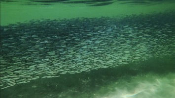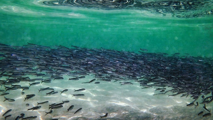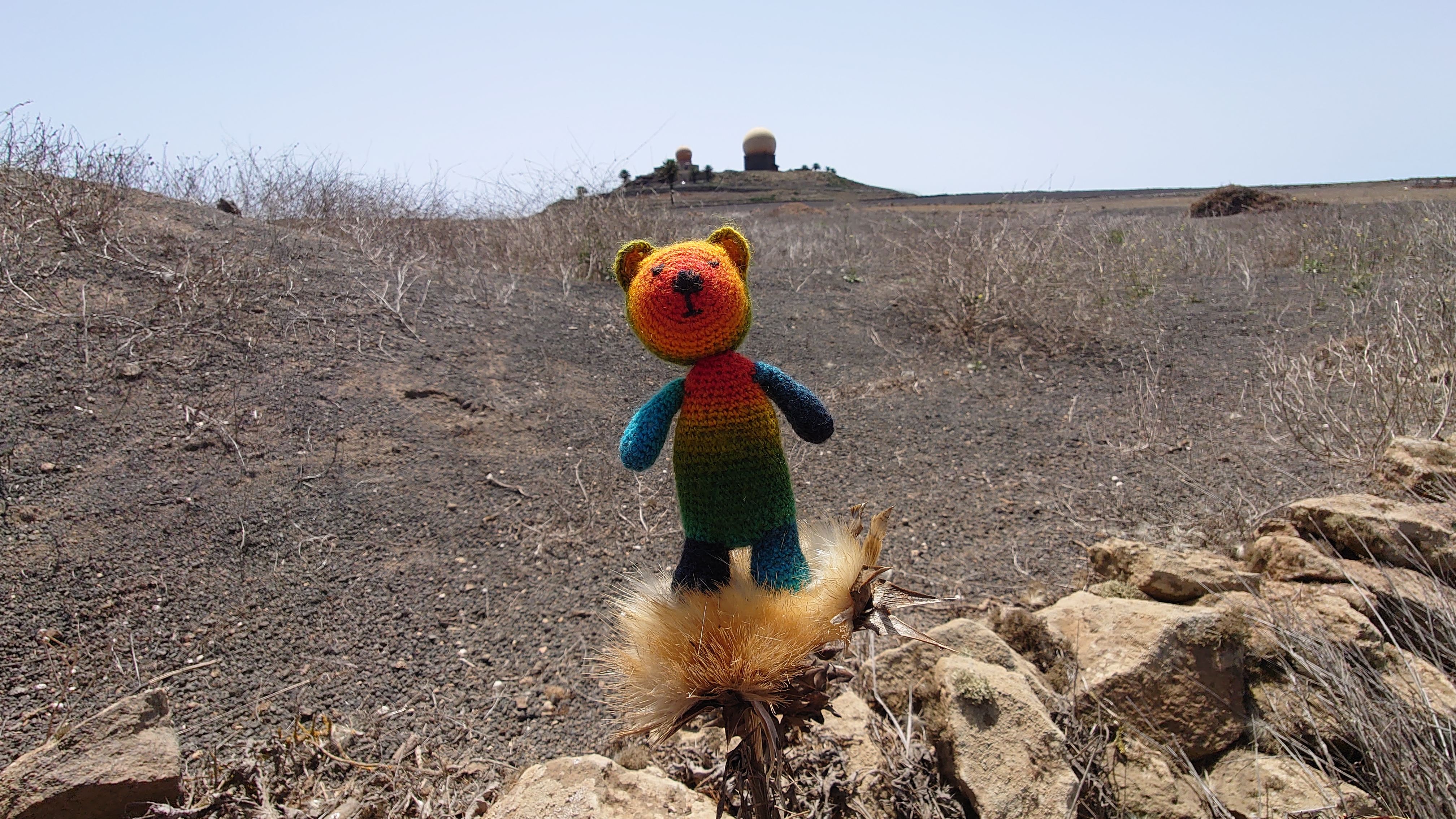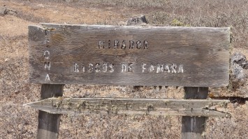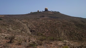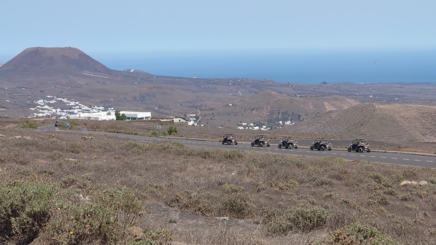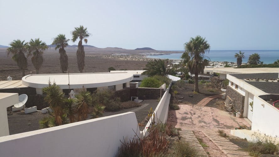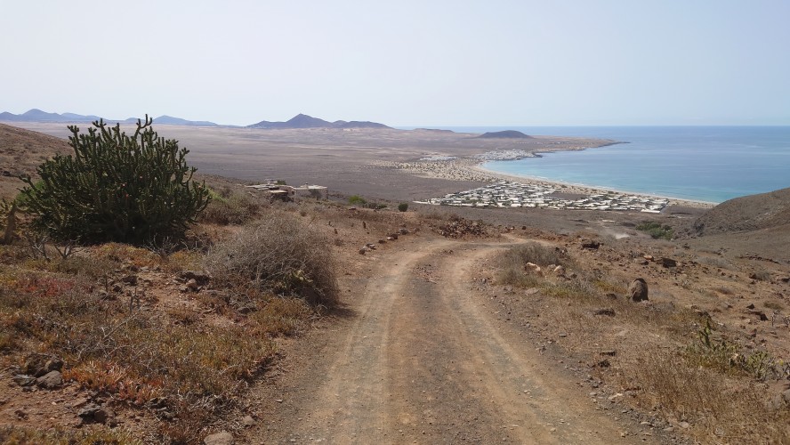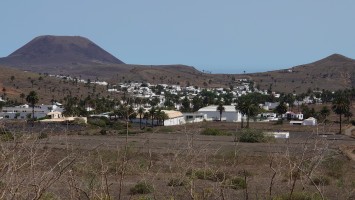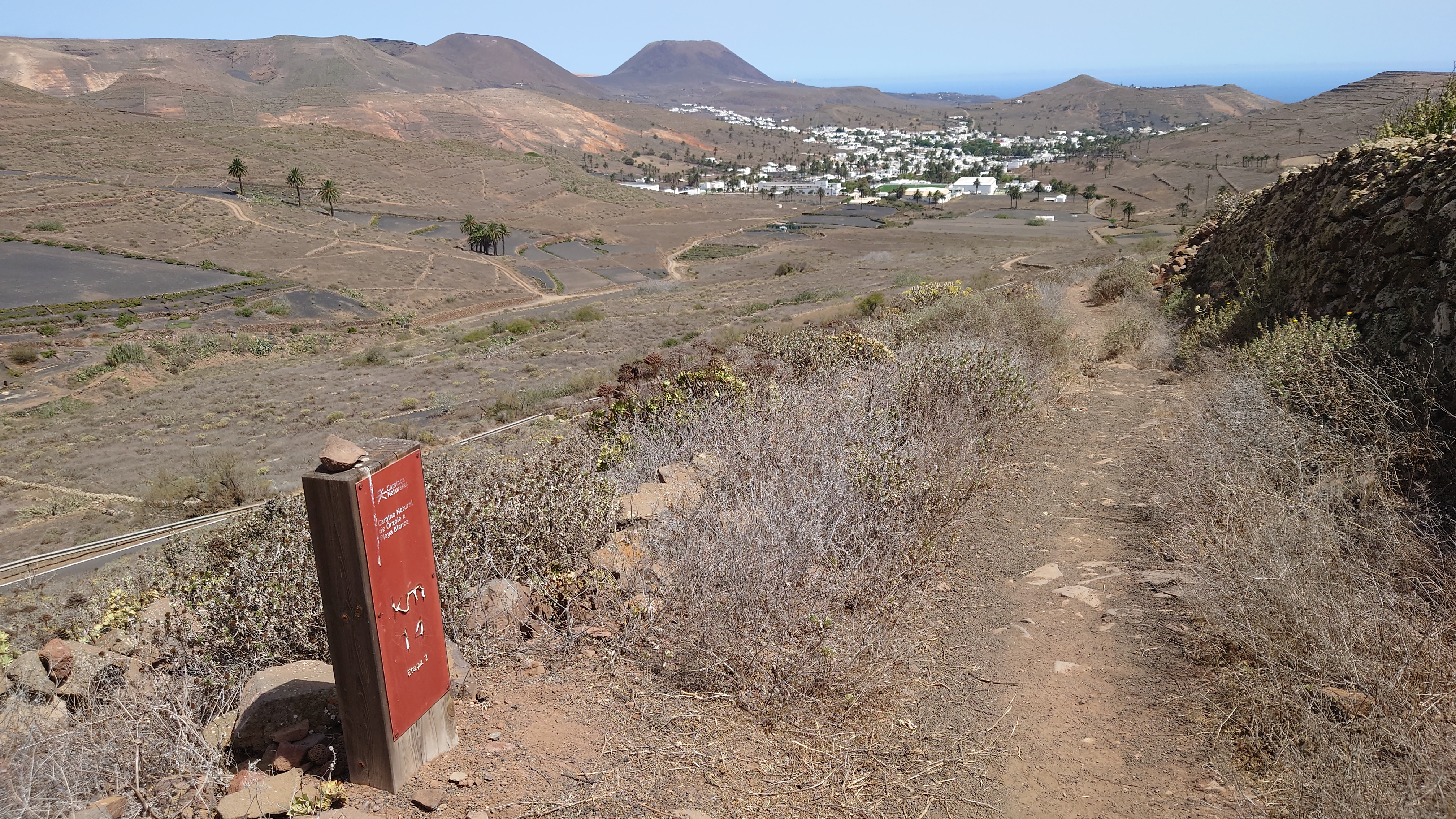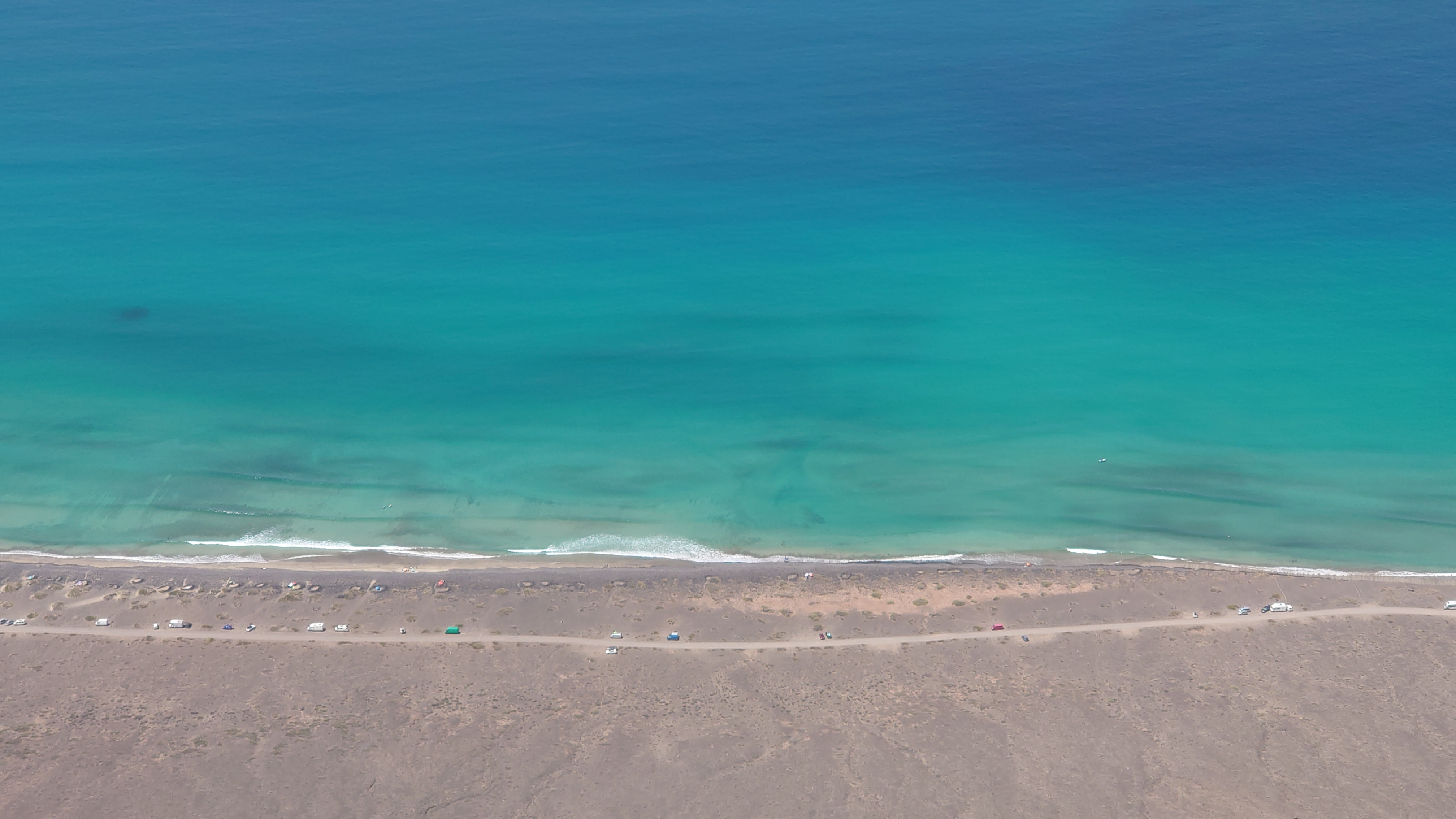 Mich zieht es weiter an die Steilwand zur Erhebung El Castillejo. Hier hoffe ich auf einen spektakulären Blick 615 Meter hinunter nach Famara. Und der Blick ist heftig. Senkrecht unter mir tut sich die riesige Strandbucht als türikses Band entlang der Steilküste auf und weiter hinten La Graciosa. Vor 25 Jahren war hier stetig heftige Brandung. Jetzt, wahrscheinlich jahreszeitbedingt, ist es fast glatt. Miniaturautos stehen hier und da an einer Piste. Strandburgen aus Wackersteinen, die von oben wie Minivulkänchen aussehen, zeugen von den hiesigen Vorlieben für das Ausleben eingepferchter Nacktheit. Im flachen Wasser schwimmen manchmal unscharfe, schwarze Flecken, die sich teilen, um danach wieder zusammenzufinden. Was ist das denn?! Kurios. Ich muss hier erst einmal herunter kommen. Und ein erschreckter Blick in die Wasserflasche lässt mich innerlich mit den Augen rollen. Mal wieder zu wenig Trinken. Famara sieht echt noch weit weg aus von hier oben und Wasser brauche ich hier nicht zufällig erwarten. Nadann, du weißt ja, wie das geht: Mund zu und ab dafür. Glücklicherweise ist mein virutell erkannter Weg im Gegensatz zu dem gesterigen wirklich ein guter Wanderweg hinab zur Küste. Erstaunlich grün ist es hier. Es wird wohl das einzige Kerbtal auf meiner Route sein. Soll mir recht sein. Mit den zu erwartenden Dehydrierungskopfschmerzen erreiche ich die alte, norwegische Ferienanlage mit ihren Halbmondhäuschen, die mittlerweile gänzlich in viele private Hände aufgeteilt wurde. Ich brauch Trinken. Wo ist Trinken? Ein durchrostetes Supermercadoschild am oberen Ende der Siedlung sagt "da lang". Denkste, vor 30 Jahren vielleicht. Jetzt ist "da" eine riesige Sanddüne und eine Betonruine. Am Ortsrand vom eigentlichen Famara ist er dann schließlich. 3 Liter Blubberwasser später kann ich wieder klar denken und widme mich dem Strand. Voll ist es hier. Tonnenweise Mietwagen. Alle sind da. Aber es verteilt sich an der gewaltigen, kilometerlangen Bucht. Ich spring ins Wasser. Schweiß wegschwmimmen und Küste vom Wasser aus ablichten. Direkt vor mir taucht unvermittelt eine dieser schwarzen Wolken im Wasser auf und kommt wie ein waberndes Monster auf mich zu. Es ist ein riesiger Fischschwarm! Potztausend. Die Kinder quietschen erschreckt und laufen weg. Ich halte drauf. Sowas hab ich noch nie gesehen.