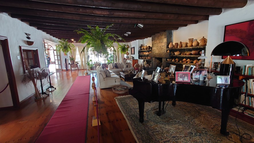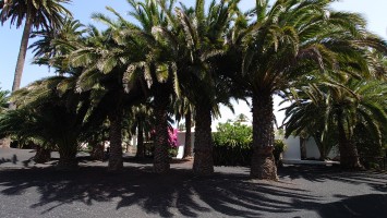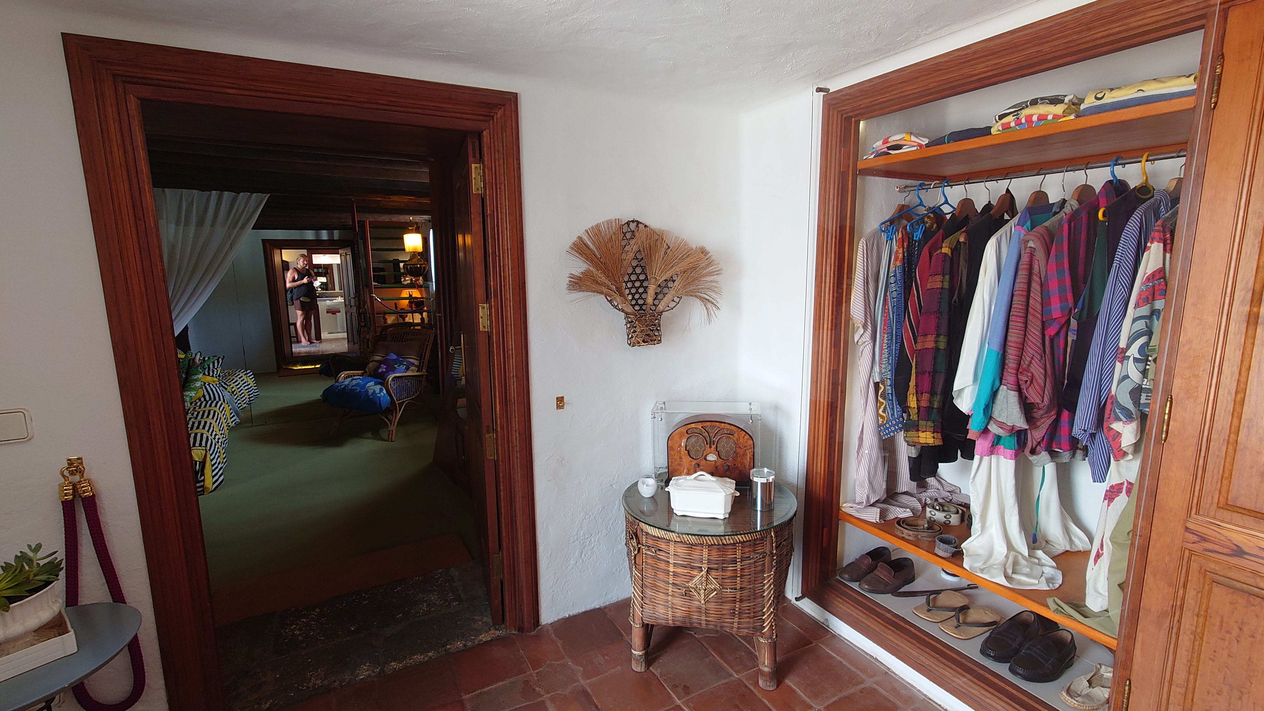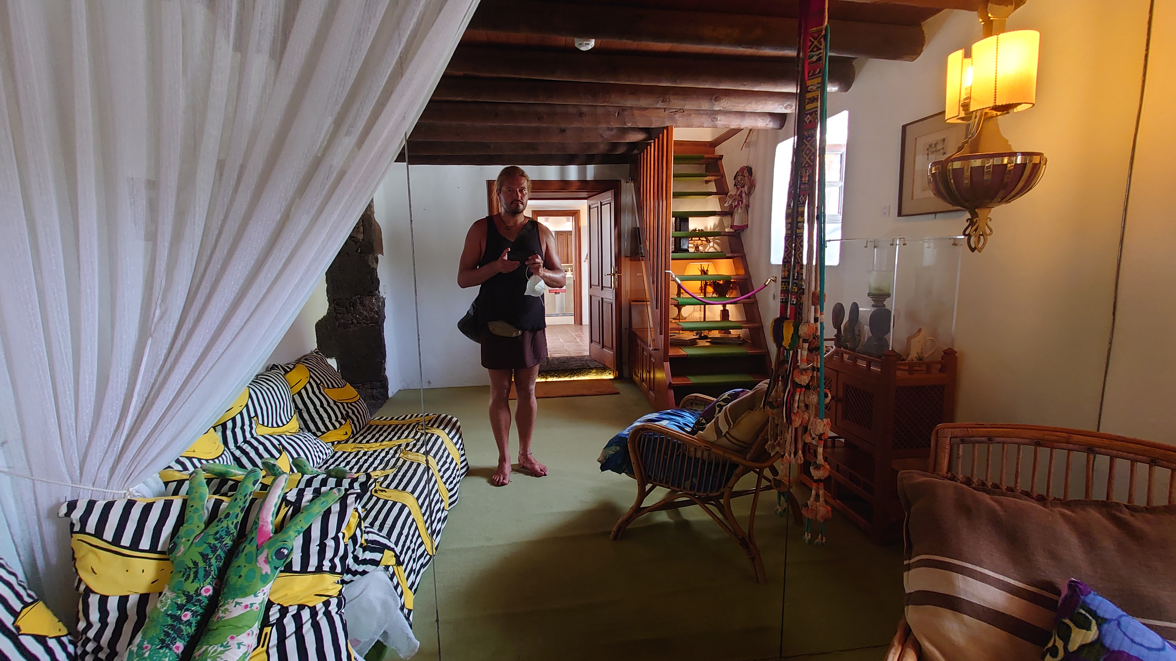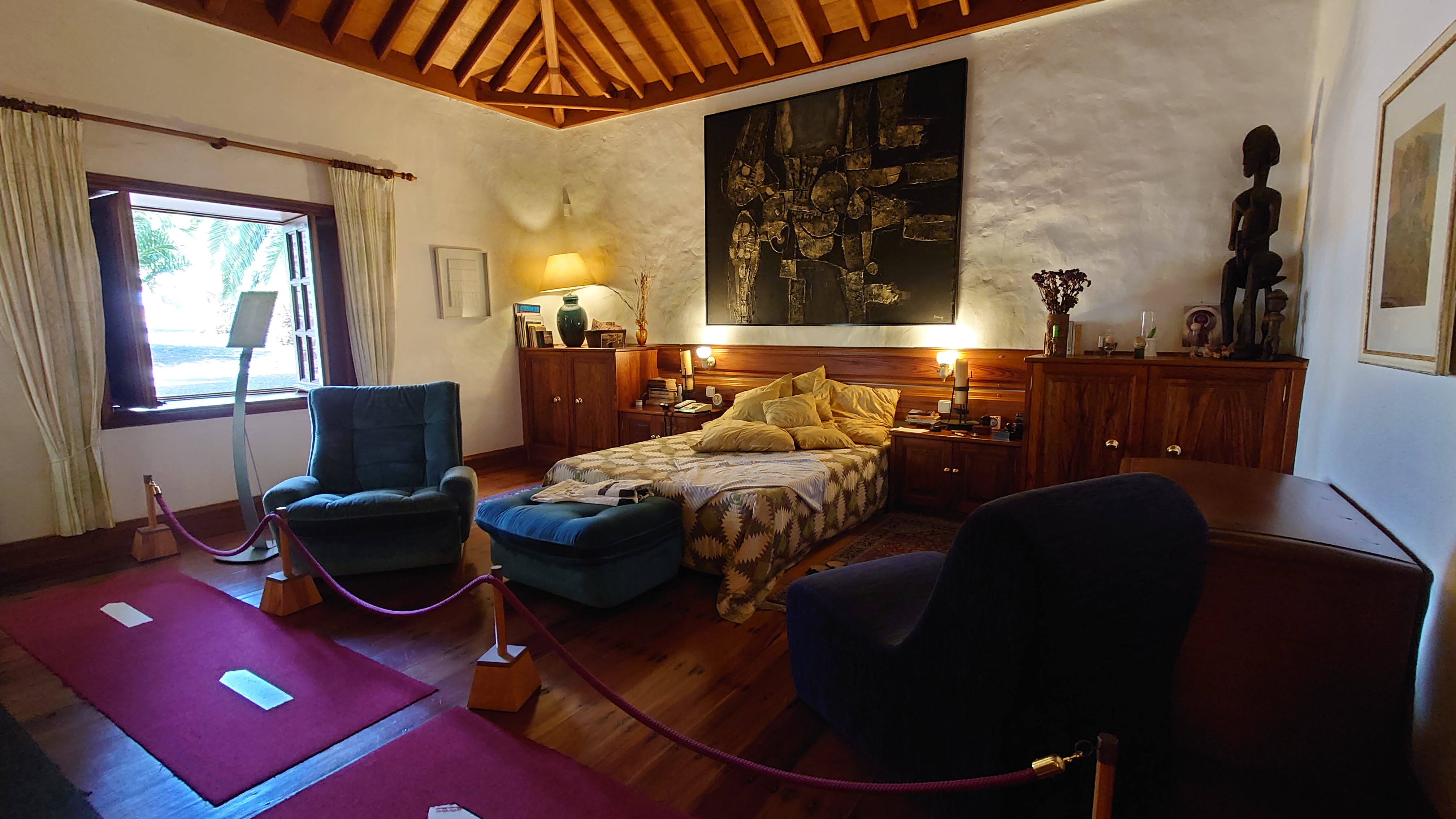 Nächster Halt: Haria. (menno, mein Handy kann kein Apostroph auf dem i. Also Obacht bezüglich der Pronunciación, ne. Beim ó gehts. Pöh.). Das Örtchen liegt in einem Talkessel, flankiert von der Steilküstenwand im Westen und den Vulkanen im Osten. Es ist glaube ich der bislang im Stile Manriques am strengsten gepflegte Ort. Am südlichen Ortsende erfahre ich auch warum: Direkt am GR 131 liegt völlig unscheinbar in Palmen versteckt Manriques Wohnhaus. Na was für ein Zufall. Es ist mittlerweile ein Museum. Nadenn, ich wollte schon immer wissen, wie so ne Künstlertoilette aussieht, also rein. Die üblichen 10 Euro später stehe ich in seinem Badezimmer und bestaune eine Toilette. Daneben sein Schlafzimmer, das Wohnzimmer, die Küche, ein Klo in einem Spiegelzimmer, den Pool und sein Atelier. Hmm... ziemlich normal und relativ bescheiden das alles hier im Vergleich zu seinen Touristenträumen in den Lavastromlöchern. Er hat viel gemalt und auch sonst viel Interieur gestaltet, so auch sein Heim. Aber es ist gar nicht spacig, sondern saugemütlich. Abgesehen davon, dass die Sachen und die Geräte im Haus nach 30 Jahren Stillstand merklich Patina angesetzt haben, könnte er mit seinen heute eigentlich 102 Jahren glatt zur Tür hereinkommen. Es wirkt komisch, Alltagsgegenstände wie Bosch-Schraubendreher, Ölfarben mit Ablaufdatum 1999, Plastikstühle, Telefone und Sony Fernsehapparate als Museumsstücke anzusehen, die man nicht anfassen darf. Ein bisschen ehrfürchtig werde ich im Atelier, als ich bemerke, dass ich auf alten Farbklecksen auf dem Boden herumlaufe, als wären sie gerade erst hingekleckst worden. Daneben stehen unvollendete Bilder mit eben diesen Farben. Offenkundig hatte er was für Picasso übrig. Im Haus hängt einiges von ihm herum. Das spiegelt sich meines Erachtens auch in seiner Kunst wider, die auch großformatig in seinem Schlafzimmer oder auf Hauswänden und Autos prangt. Mir kommt er aber dagegen eher wie ein Künstler zum Anfassen vor. Wegweisend in Punkto Kunst... weiß nicht. Lanzarote hat(te) er aber wohl im Griff. Irgendwie ist es frevelhaft, dass so ein tolles Haus seine natürliche Funktion mit dem Tod gänzlich einbüßt und zu einer einstaubenden Pharaonenpyramide verkommt, die wohlmöglich viel länger als sein Leben genau das bleibt und langsam verwittert, wie die altersvergilbten Telefone und Klodeckel im Haus.