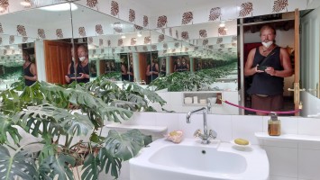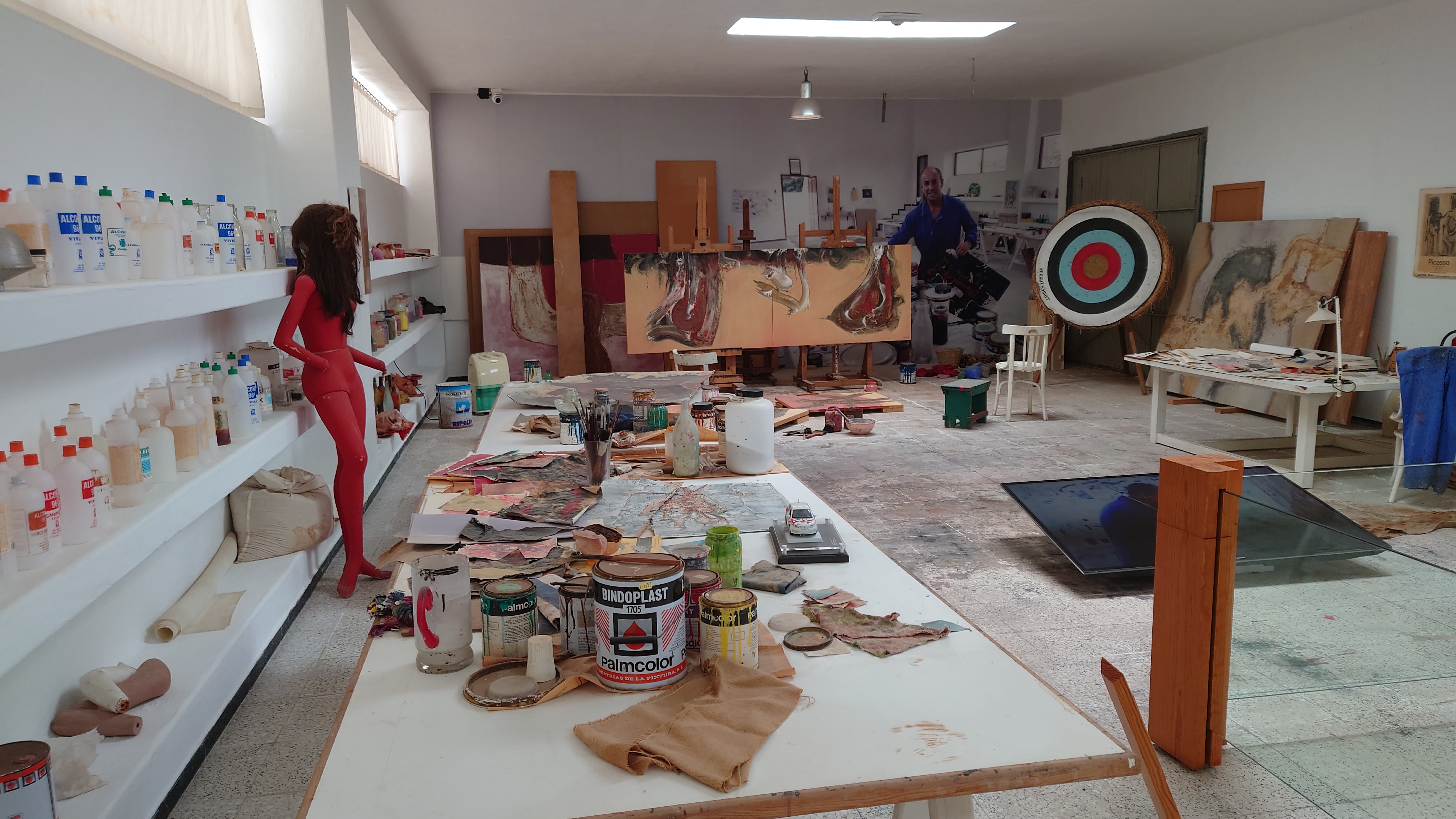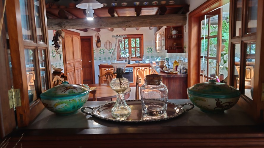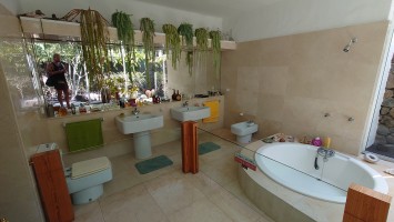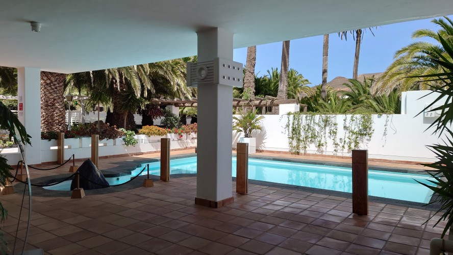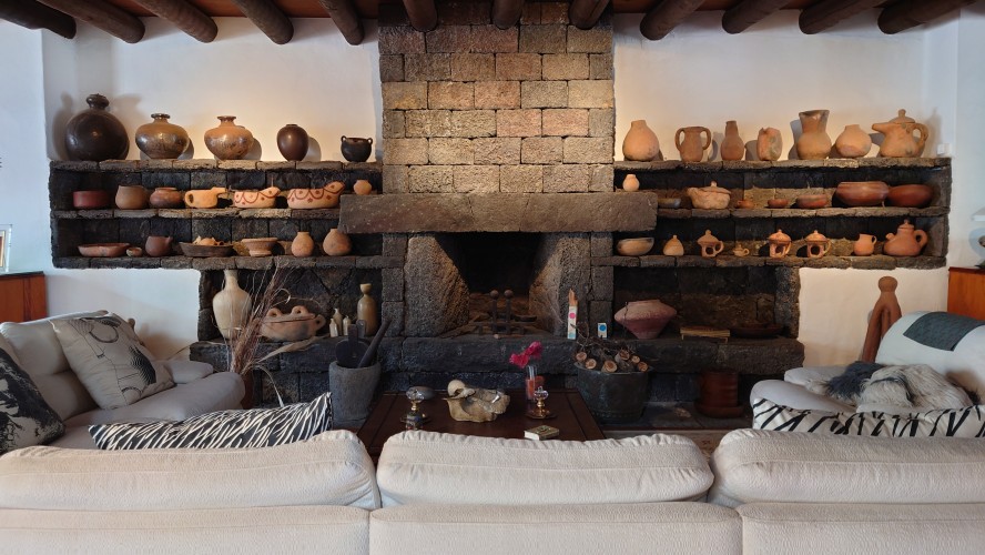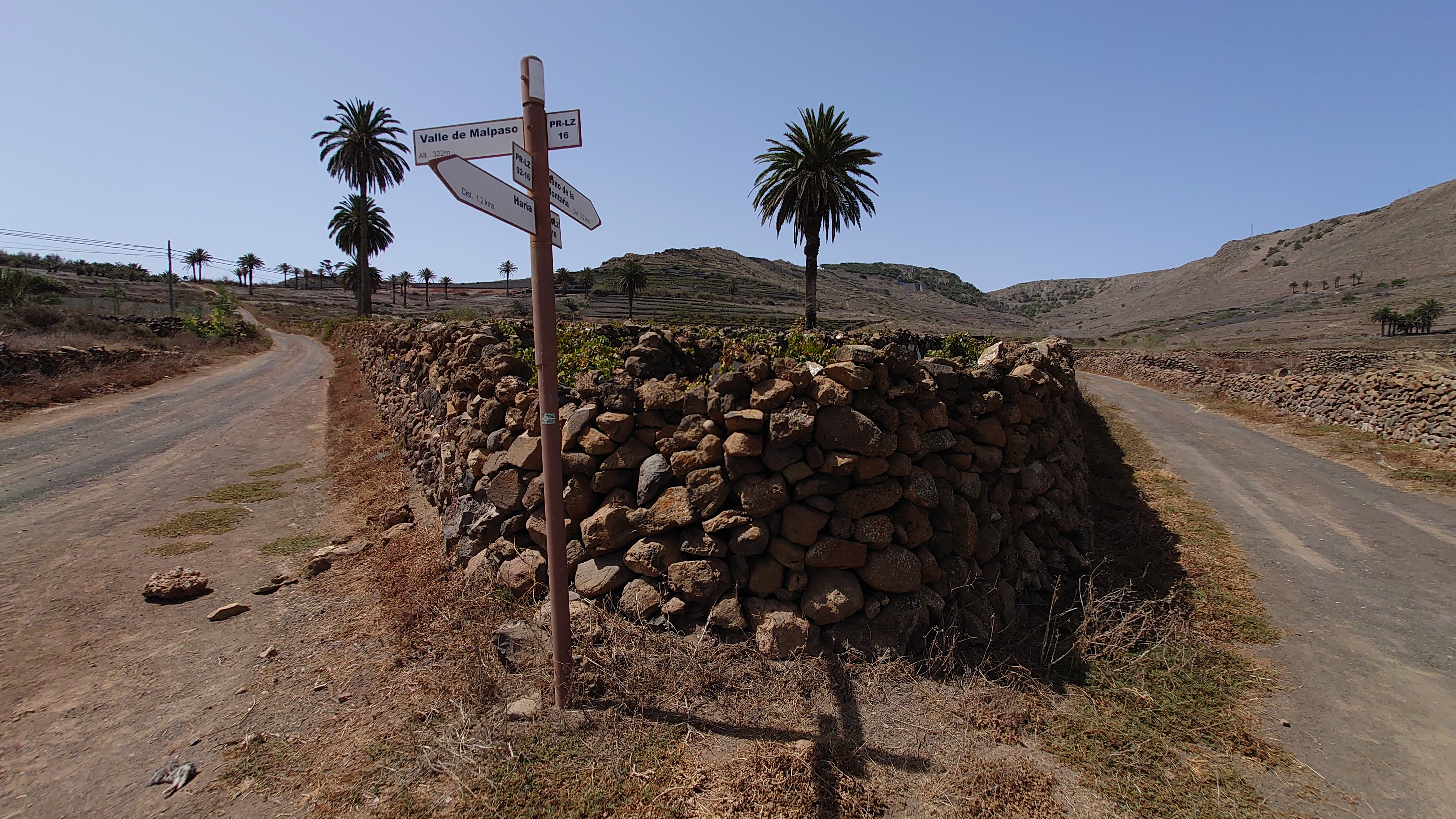 Nächster Halt: Haria. (menno, mein Handy kann kein Apostroph auf dem i. Also Obacht bezüglich der Pronunciación, ne. Beim ó gehts. Pöh.). Das Örtchen liegt in einem Talkessel, flankiert von der Steilküstenwand im Westen und den Vulkanen im Osten. Es ist glaube ich der bislang im Stile Manriques am strengsten gepflegte Ort. Am südlichen Ortsende erfahre ich auch warum: Direkt am GR 131 liegt völlig unscheinbar in Palmen versteckt Manriques Wohnhaus. Na was für ein Zufall. Es ist mittlerweile ein Museum. Nadenn, ich wollte schon immer wissen, wie so ne Künstlertoilette aussieht, also rein. Die üblichen 10 Euro später stehe ich in seinem Badezimmer und bestaune eine Toilette. Daneben sein Schlafzimmer, das Wohnzimmer, die Küche, ein Klo in einem Spiegelzimmer, den Pool und sein Atelier. Hmm... ziemlich normal und relativ bescheiden das alles hier im Vergleich zu seinen Touristenträumen in den Lavastromlöchern. Er hat viel gemalt und auch sonst viel Interieur gestaltet, so auch sein Heim. Aber es ist gar nicht spacig, sondern saugemütlich. Abgesehen davon, dass die Sachen und die Geräte im Haus nach 30 Jahren Stillstand merklich Patina angesetzt haben, könnte er mit seinen heute eigentlich 102 Jahren glatt zur Tür hereinkommen. Es wirkt komisch, Alltagsgegenstände wie Bosch-Schraubendreher, Ölfarben mit Ablaufdatum 1999, Plastikstühle, Telefone und Sony Fernsehapparate als Museumsstücke anzusehen, die man nicht anfassen darf. Ein bisschen ehrfürchtig werde ich im Atelier, als ich bemerke, dass ich auf alten Farbklecksen auf dem Boden herumlaufe, als wären sie gerade erst hingekleckst worden. Daneben stehen unvollendete Bilder mit eben diesen Farben. Offenkundig hatte er was für Picasso übrig. Im Haus hängt einiges von ihm herum. Das spiegelt sich meines Erachtens auch in seiner Kunst wider, die auch großformatig in seinem Schlafzimmer oder auf Hauswänden und Autos prangt. Mir kommt er aber dagegen eher wie ein Künstler zum Anfassen vor. Wegweisend in Punkto Kunst... weiß nicht. Lanzarote hat(te) er aber wohl im Griff. Irgendwie ist es frevelhaft, dass so ein tolles Haus seine natürliche Funktion mit dem Tod gänzlich einbüßt und zu einer einstaubenden Pharaonenpyramide verkommt, die wohlmöglich viel länger als sein Leben genau das bleibt und langsam verwittert, wie die altersvergilbten Telefone und Klodeckel im Haus.