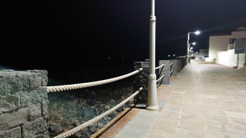 Tja und so sitze ich jetzt hier an der Hafenpromenade auf einer Bank und schaue, wie es rapide dunkel wird. Auf der gegenüberliegenden, unbebauten Seite der Bucht zieht sich eine kleine Scheinwerferkette langsam auf der Piste in Richtung Ort zurück. Wohl genug nackt gewesen für heute, der Bauch muss voll. Ob hier wohl auch Ich-wohne-hier-Schilder in die Strandburgen aufgestellt werden wie auf Fuerteventura? Morgen hab ich mir wanderfrei verordnet. Dann guck ich doch mal und schreib drunter: "Hab Hausfriedensbruch begangen, musste dringend mal auf euer Klo, sorry." Mal schauen, was mir sonst noch einfällt. Den Tisch im Restaurant von heute habe ich jedenfalls für morgen gleich reserviert, das war einfach zu gut.