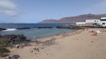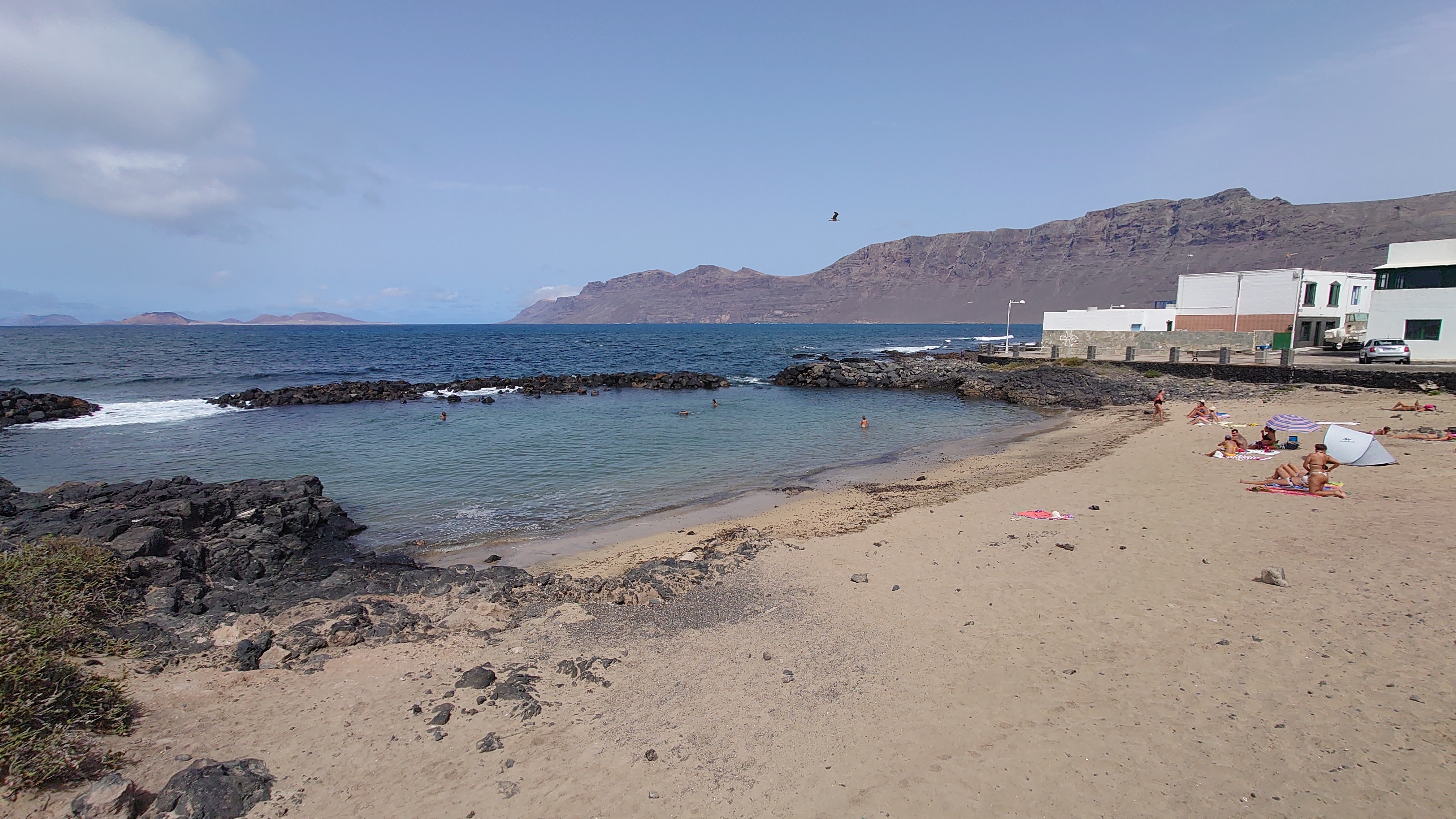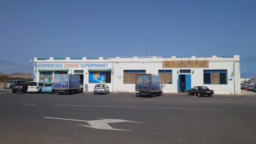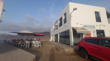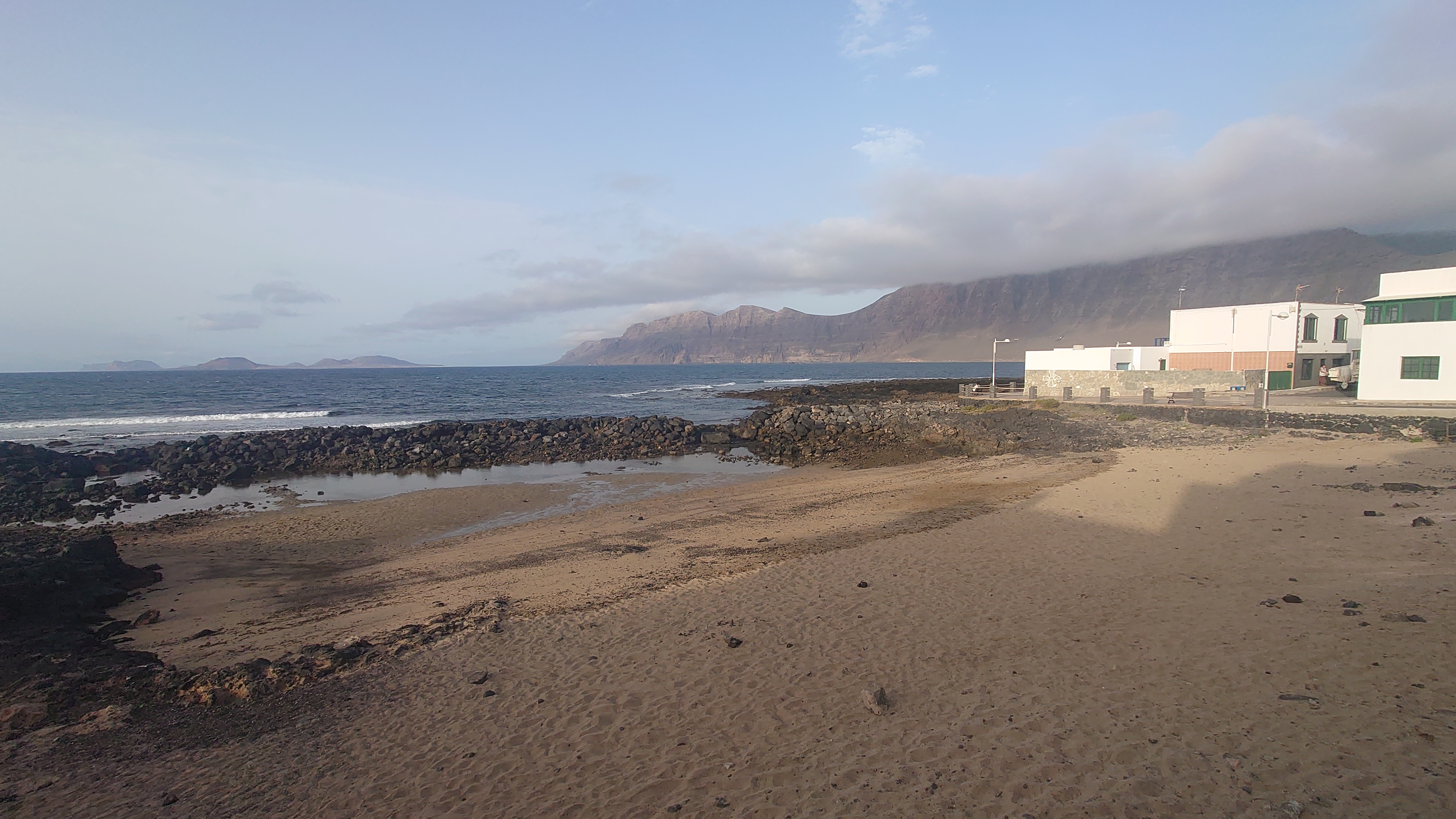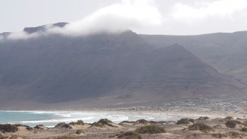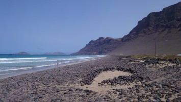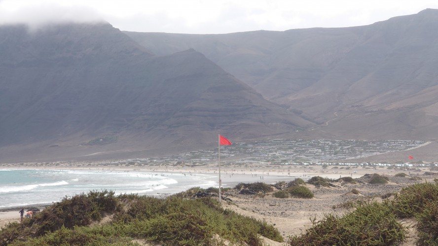Ich sitze in "meinem" Restaurant von gestern. Es windet von Norden, sodass heute die altbekannten, hohem Wellen in die Bucht branden. Mich zogs heute einfach nur die Bucht herunter bis zum Ende und wieder zurück. Die Surfer hatten heute mächtig was zu tun. Ich habe mich gefragt, ob der helle Strich quer über die Steilküste eine geologische Verwerfung ist. Aber es ist stattdessen tatsächlich ein Weg, der Camino Risco Famara, der bis hoch mach Orzola führt. Spannend. Also gibt es auch hier einen begehbaren Küstenweg?! Er wäre mir aber für einen Durchmarsch von Orzola zu lang gewesen. Und was, wenn er vielleicht gar nicht mehr vollständig an den Klippen ist. Ich muss mal googlen, ob es dazu Fotos gibt.
