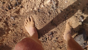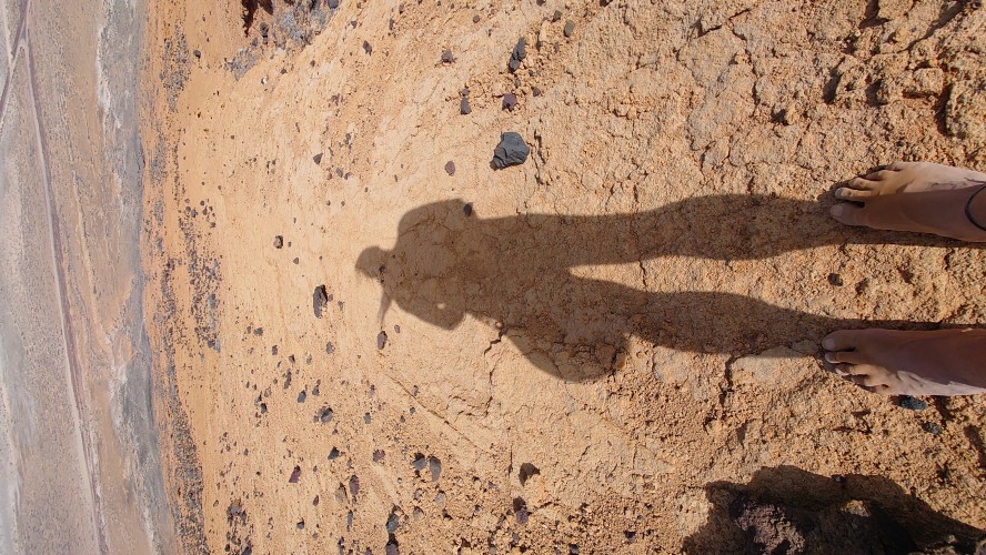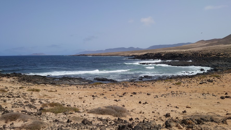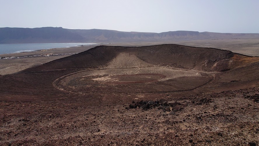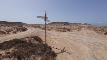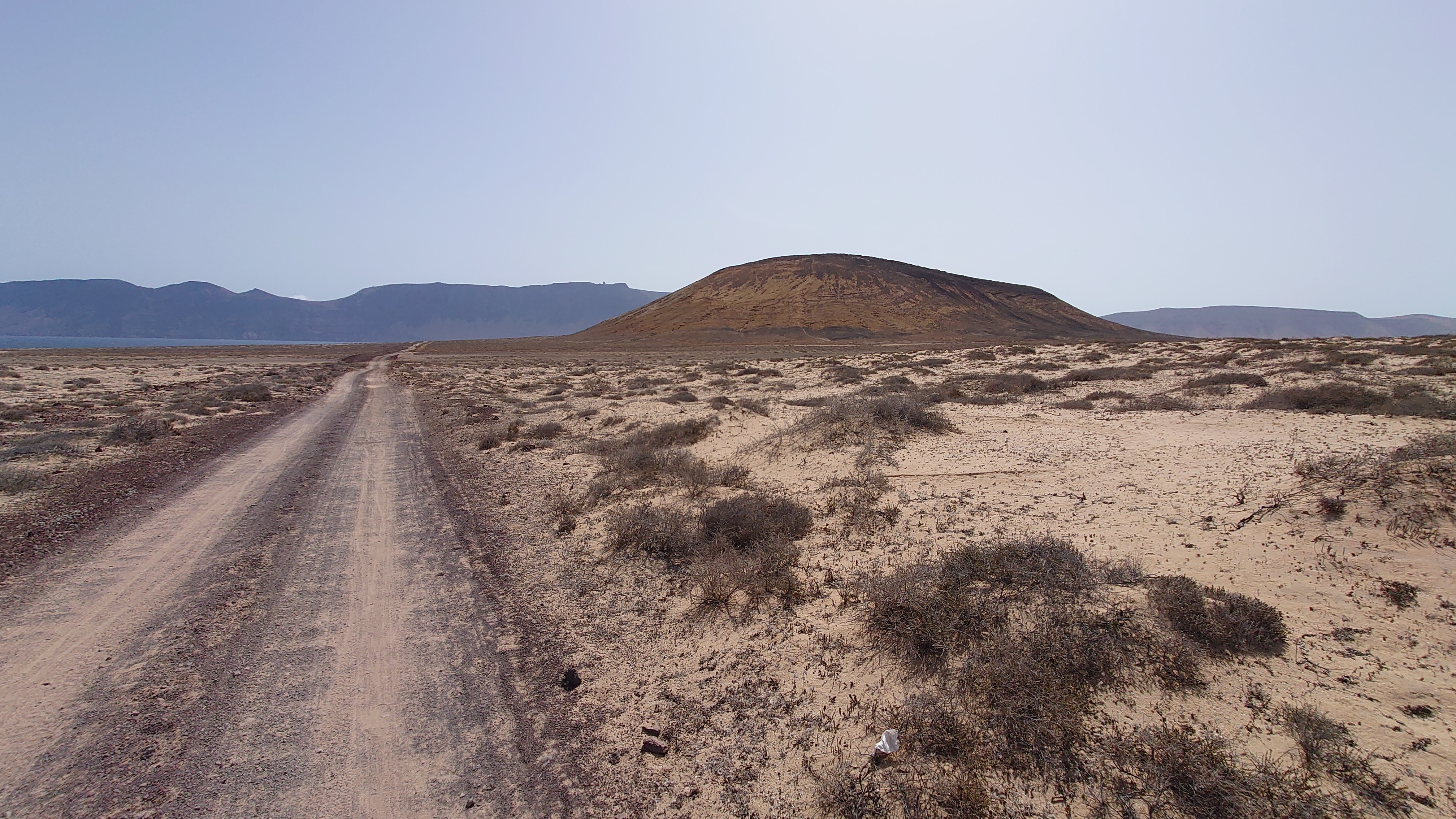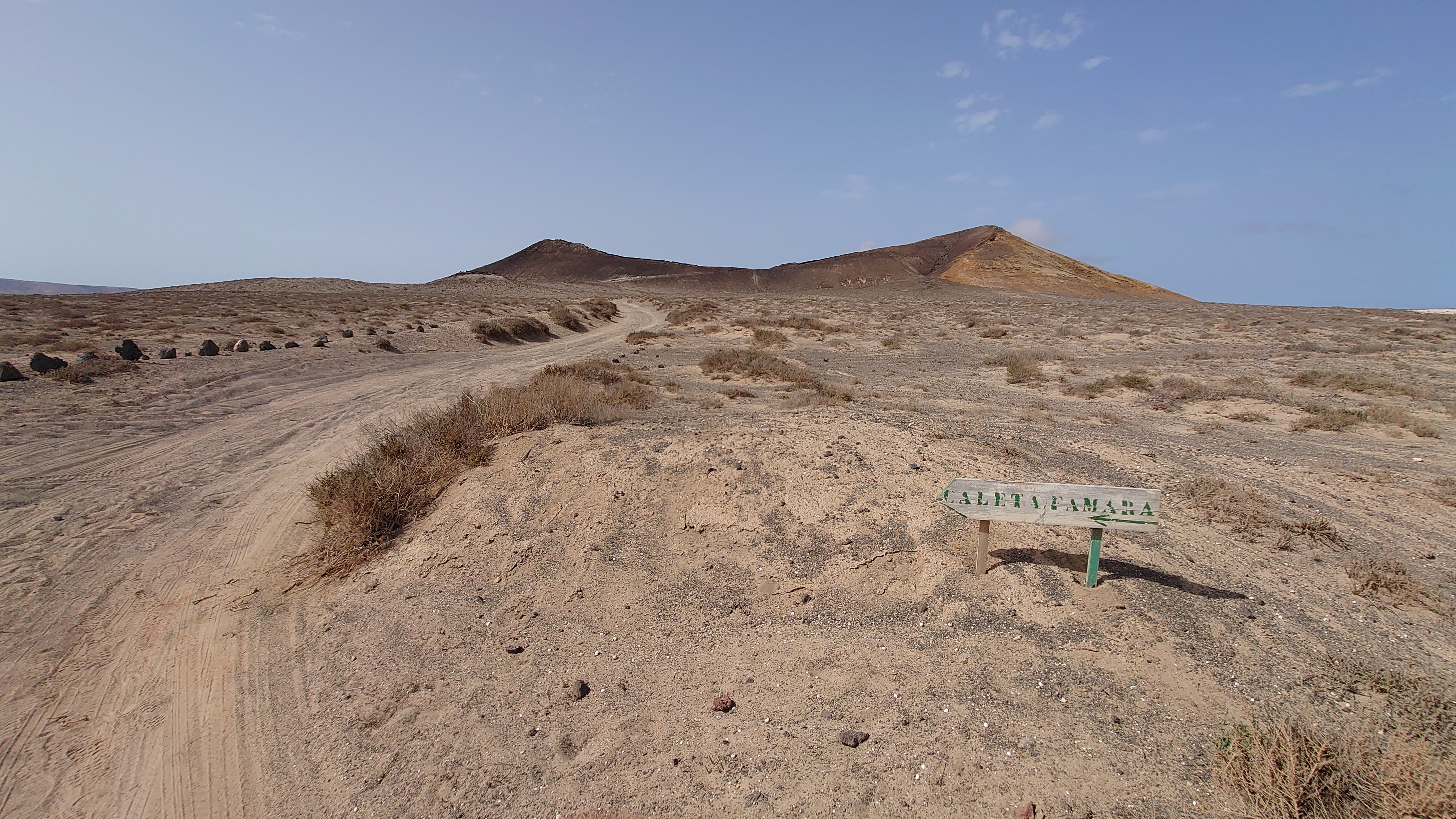 Wenn man nach dem Aufwachen an sowas denkt, muss man wohl entspannt sein, oder? Muss ich auch. Heute geht's in die Wüste. Ein langer Marsch ohne viel Abwechselung, dachte ich. Aber es kommt anders. Ein Berg taucht vor mir auf. Ein verwittertes Holzschild weist die Caleta Famara aus. Juchuuu, ein Krater! Na den Umweg nehme ich in Kauf.