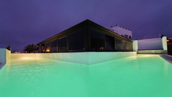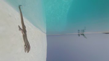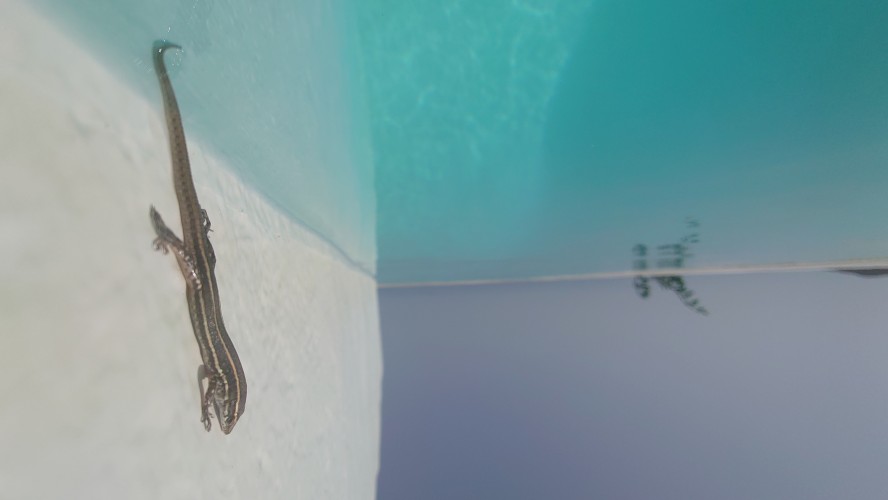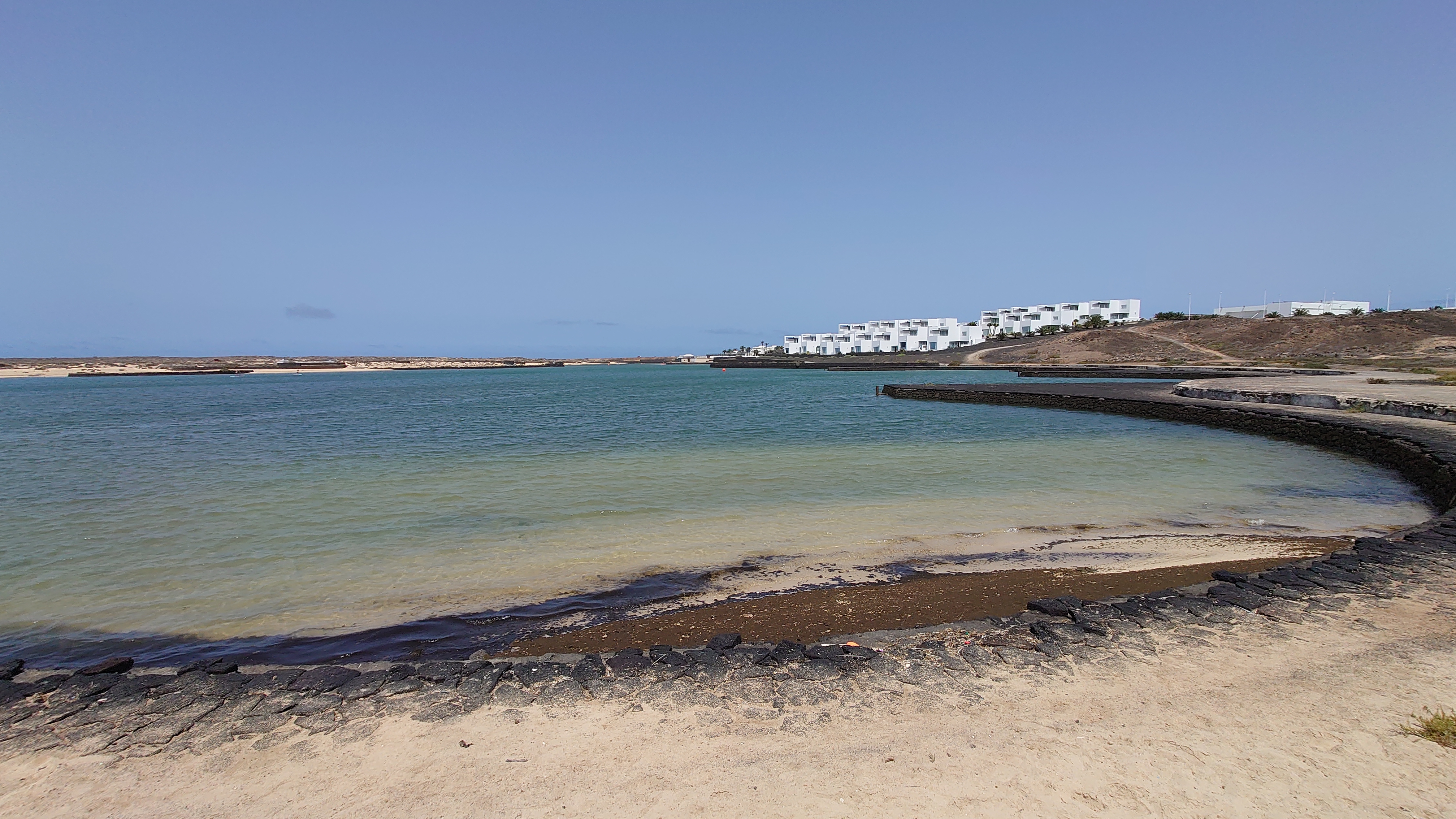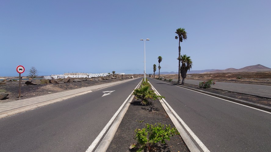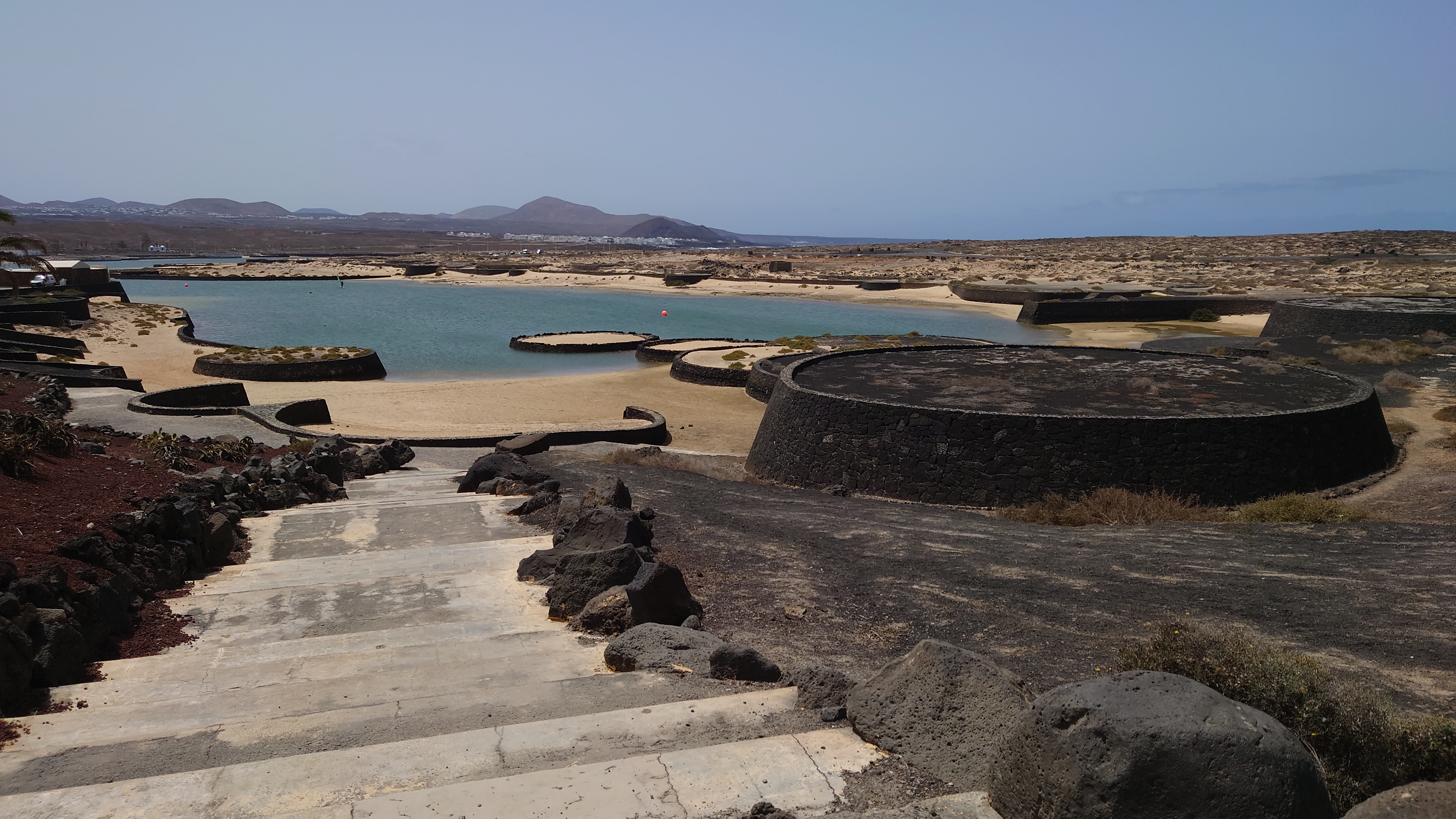 Weiter geht's durch ein Örtchen, bis schließlich bei der Fast-Insel La Isleta der Club La Santa als bolide Festung im Nichts herumsteht: ein gewaltiges Sport-Resort, das vor einer künstlichen Meerwasserlagune thront. In der Poollandschaft wimmelt es. Hier unten ist kein Mensch, obwohl das Areal sichtlich für Massen ausgelegt ist. Allein die Lagung ist sicherlich einen halben Kilometer lang. Egal, ich geh schwimmen... und stehe im Schlick. Bääh... alles klar. Das hat irgendwie nicht so richtig funktioniert, wie mir scheint. Ich habe ohnehin das Gefühl, das Areal ist mehr eine Lagunen-Ruine und viel mehr Anlagenbauten wurden geplant. Vorweg zieht sich eine lange, palmenbesäumte Promenadenstraße, ohne Häuser, ohne Autos. Überall salzerodierte Betonwege, die nurmehr Krümelpiste sind, aus denen noch hier und da gelbe Farbe blitzt. Der Club selbst ist ein abgeschottetes All-you-can-wünschdirwas mit blau-bebänderten, cremeglänzenden Leuten, die mich skeptisch von ihren Liegebänken aus beäugen, wie ich die Poolduschen und den Pool ausprobiere. Jep, ich bin der Pirat und ihr merkt das, ne?! Und husch, weg bin ich...