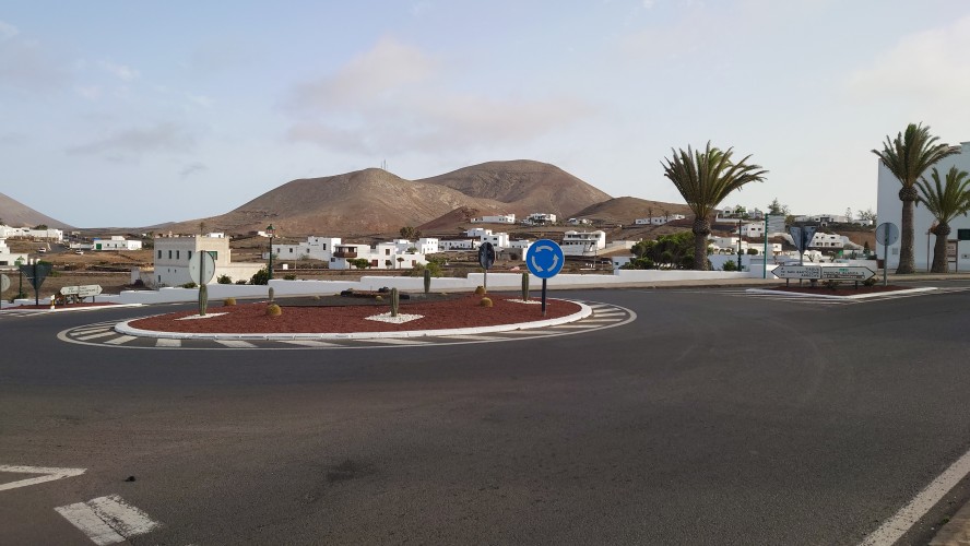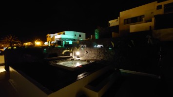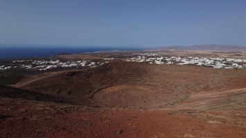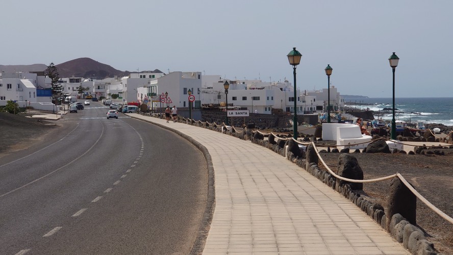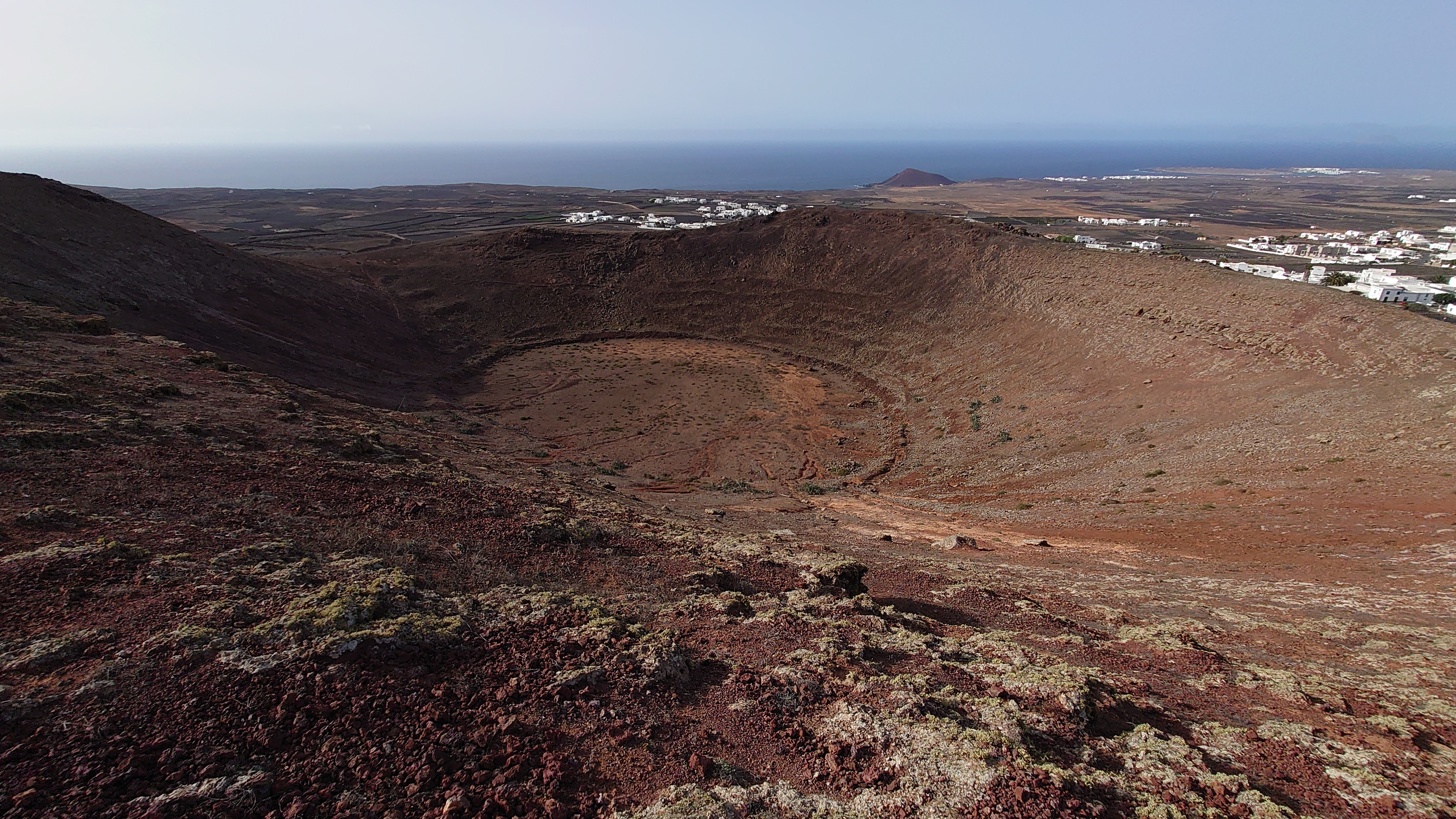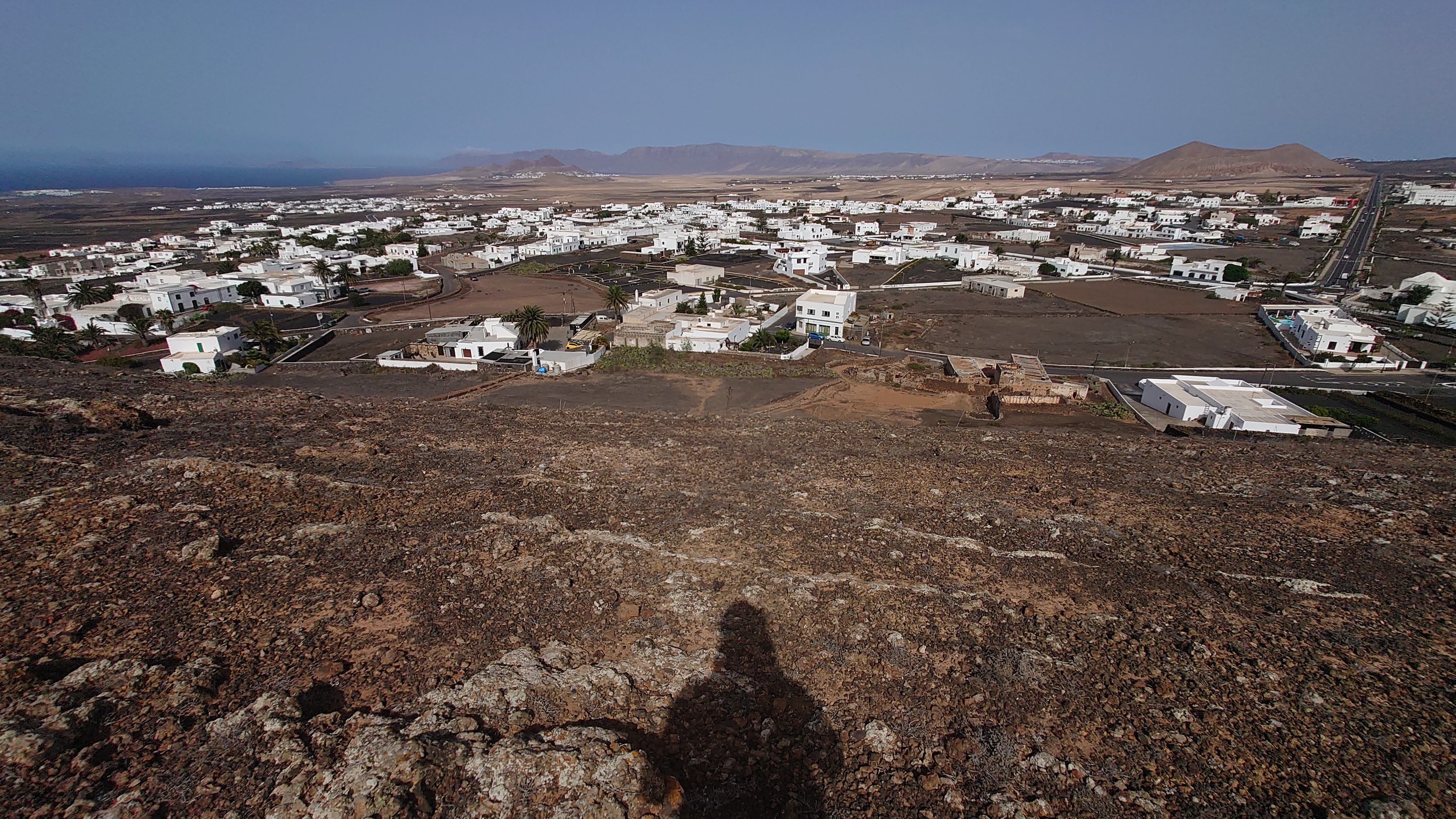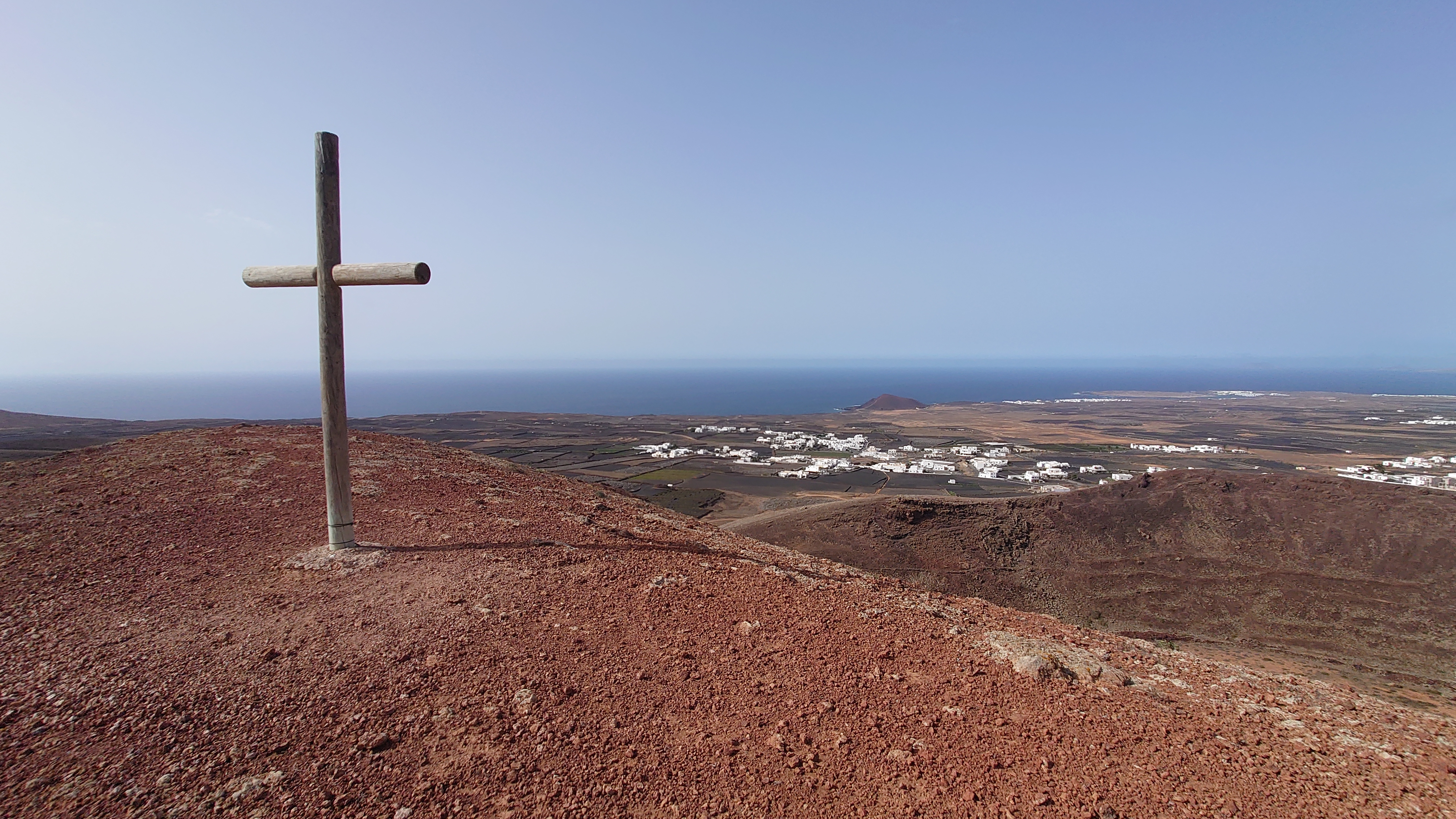 ... weiter in Richtung des Ortes La Santa. Hier walkt und biket man vom Club über die obsolete Flaniermeile rüber und wieder zurück. Für mich geht's noch ein Häuschen weiter über die Hauptstraße bis Tinjo, das sich doch tatsächlich um einen weiteren Vulkan herum erstreckt, der sogar eines Gipfelkreuzes würdig ist. Juchuuuuuu! Gipfelkreuze ziehen mich magisch an. Krater erst recht, wofür bin ich auf Lanzarote?! Oben am Kreuz bläst der Wind zum Umfallen, krass. Aber der Anblick ist wieder herrlich. So muss ein Malbuch-Vulkankrater aussehen. Meine Unterkunft liegt direkt am Fuße des Vulkans und diesmal lasse ich es krachen. Die Finca Marisa ist ein echtes Fundstück und hat was von einer Miniatur-Therme. Zwei Jaccuzis und ein Pool auf der Außenmauer mit Blick über die weite Ebene bis zur Küste müssen von mir beschwommen werden. Daraus freue ich mich schon den ganzen Tag.