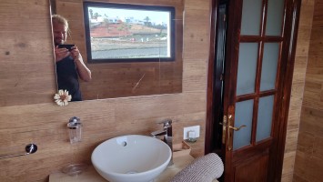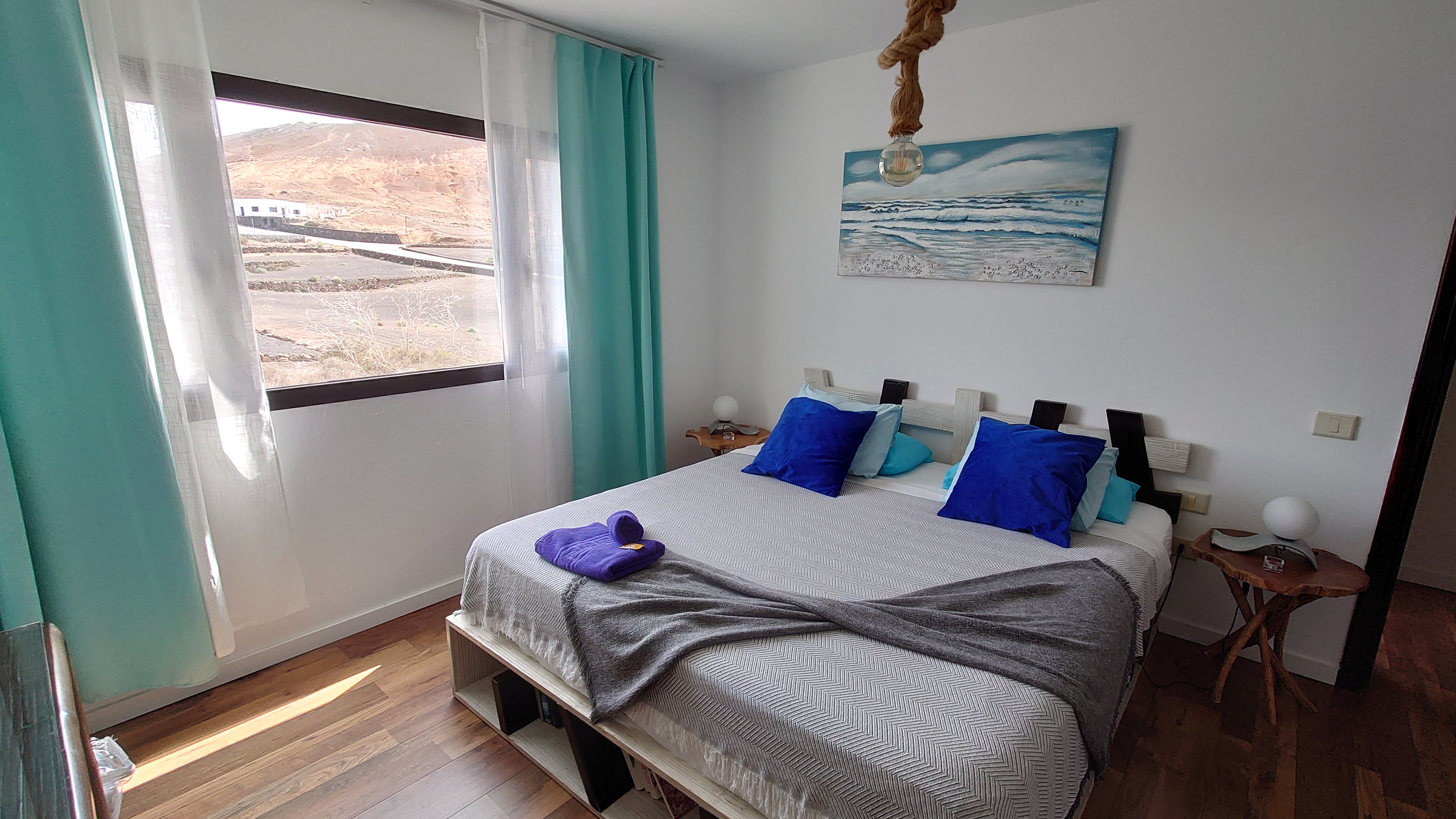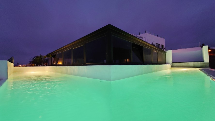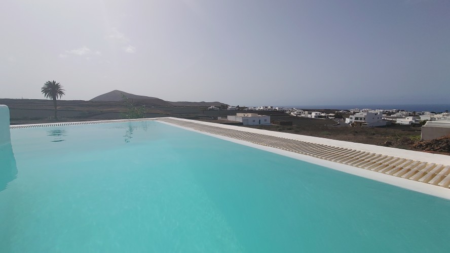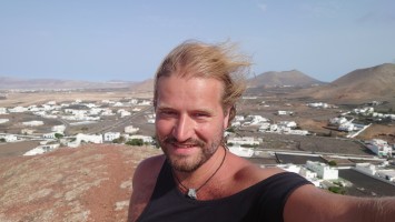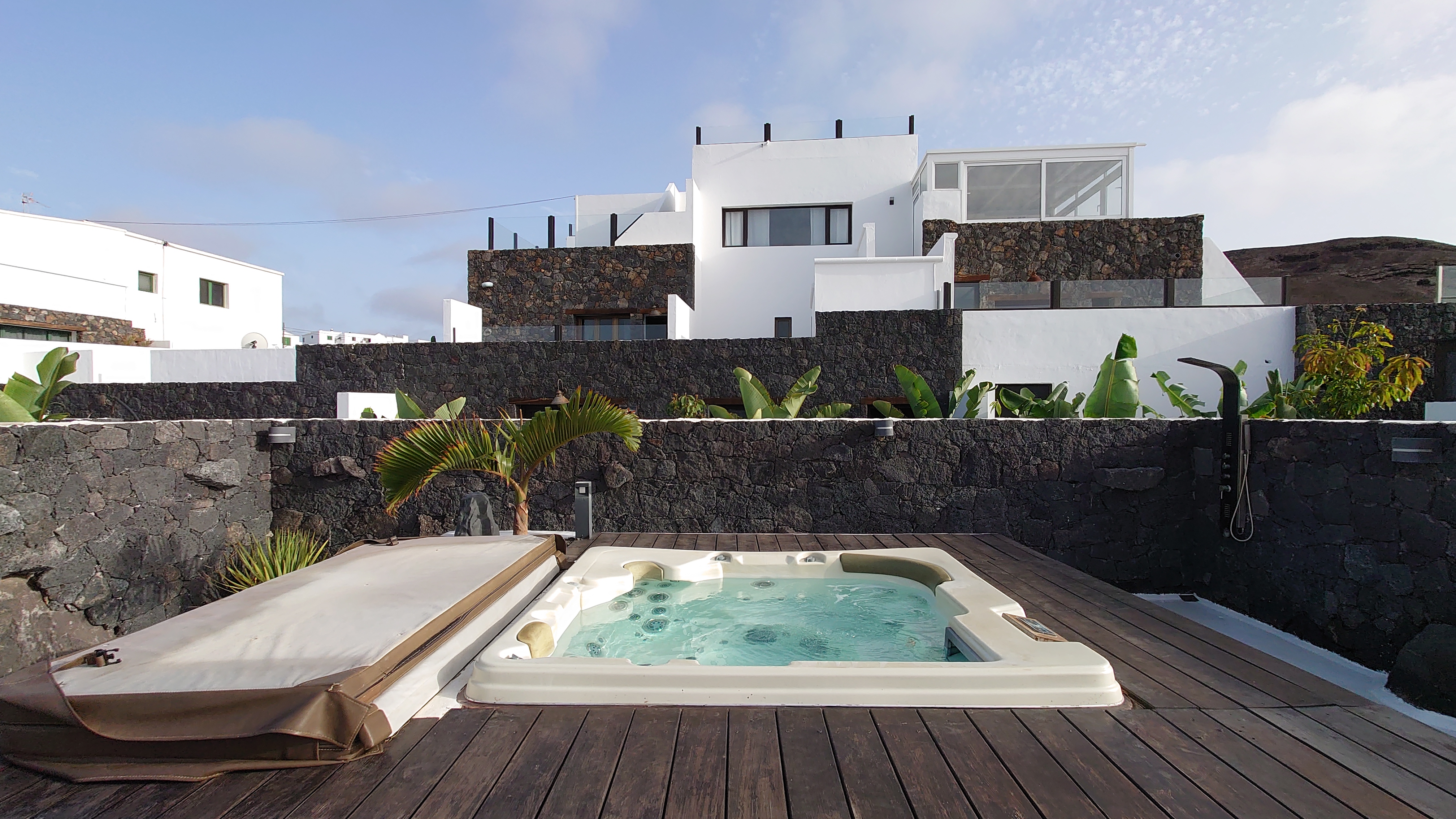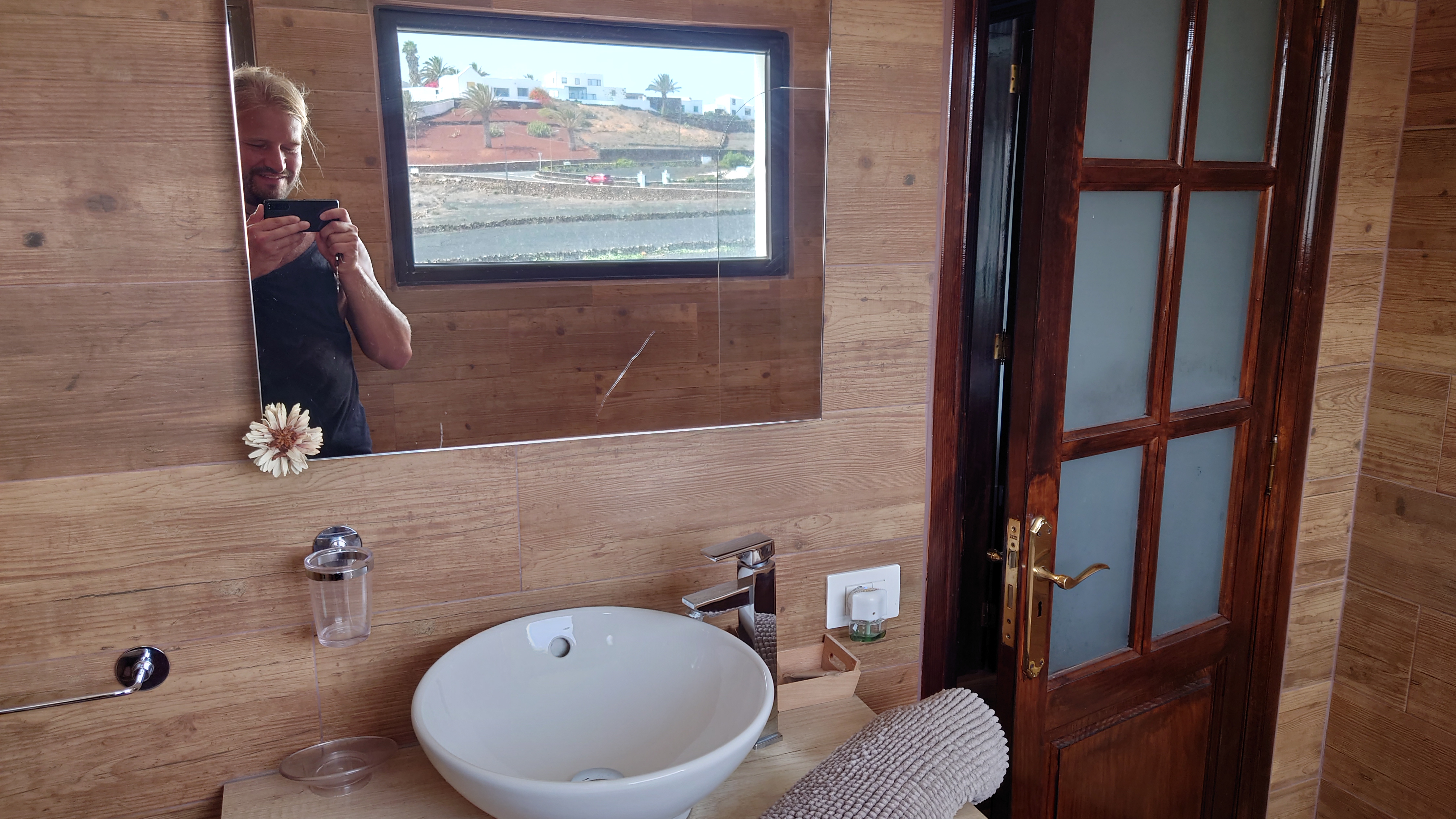 ... weiter in Richtung des Ortes La Santa. Hier walkt und biket man vom Club über die obsolete Flaniermeile rüber und wieder zurück. Für mich geht's noch ein Häuschen weiter über die Hauptstraße bis Tinjo, das sich doch tatsächlich um einen weiteren Vulkan herum erstreckt, der sogar eines Gipfelkreuzes würdig ist. Juchuuuuuu! Gipfelkreuze ziehen mich magisch an. Krater erst recht, wofür bin ich auf Lanzarote?! Oben am Kreuz bläst der Wind zum Umfallen, krass. Aber der Anblick ist wieder herrlich. So muss ein Malbuch-Vulkankrater aussehen. Meine Unterkunft liegt direkt am Fuße des Vulkans und diesmal lasse ich es krachen. Die Finca Marisa ist ein echtes Fundstück und hat was von einer Miniatur-Therme. Zwei Jaccuzis und ein Pool auf der Außenmauer mit Blick über die weite Ebene bis zur Küste müssen von mir beschwommen werden. Daraus freue ich mich schon den ganzen Tag.