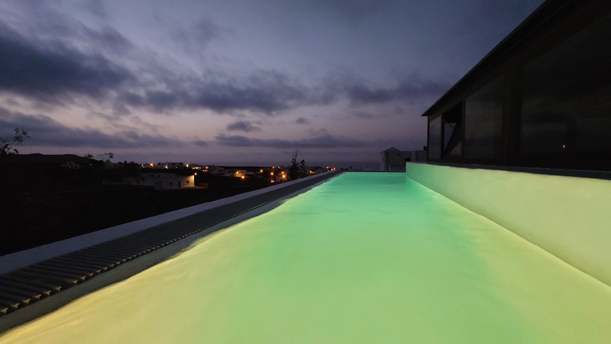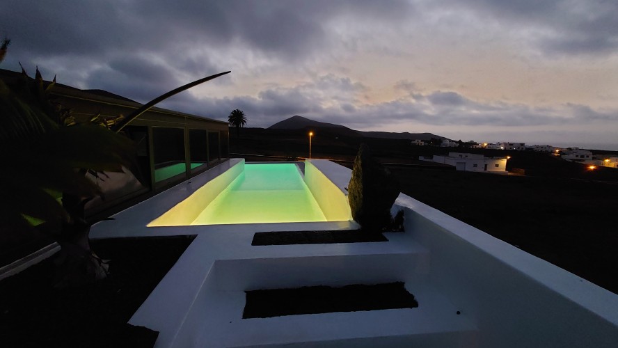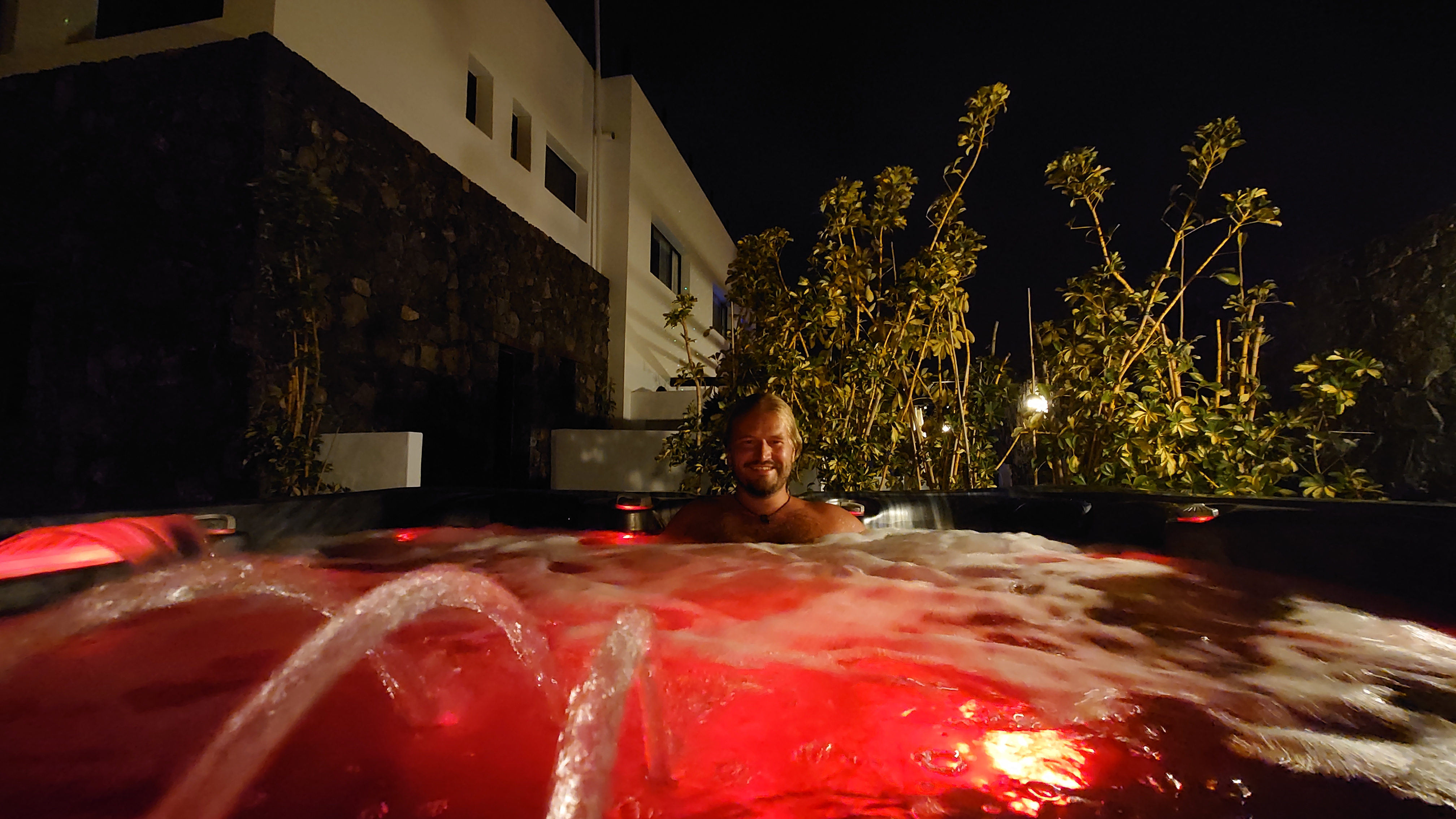 Mittlerweile ist es dunkel. Ich liege in einem 37°C warmen, rot beleuchteten Blubberpool und schreibe meine Tagesetappe auf, Morgen wird die längste Etappe auf der Insel anstehen, mehr als 25 Kilometer an der öden, schwarzen Küste des Timanfayagebiets entlang. Da kann ich heißes Wasser gut gebrauchen... mmmh... und während ich so eumliege, frag ich mich, ob das so eine gute Idee ist da morgen durchzulaufen, Das wird einfach mal nicht reizvoll, sondern nur anstrengend werden. Ob es Alternativen gibt...