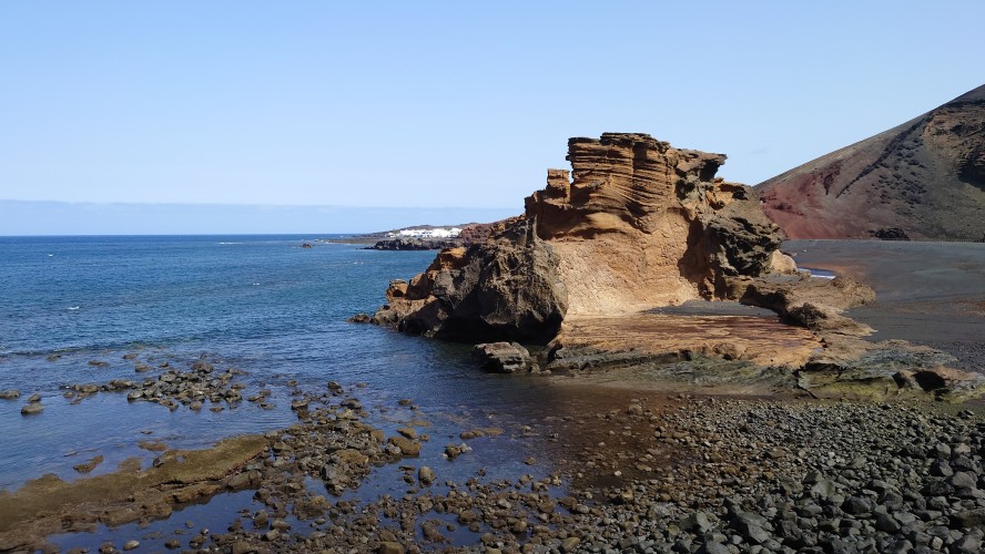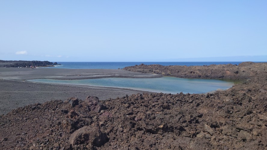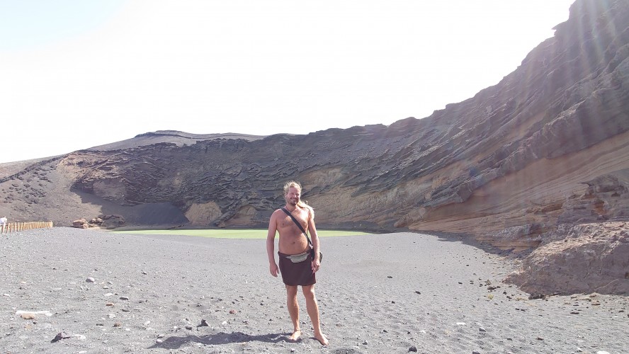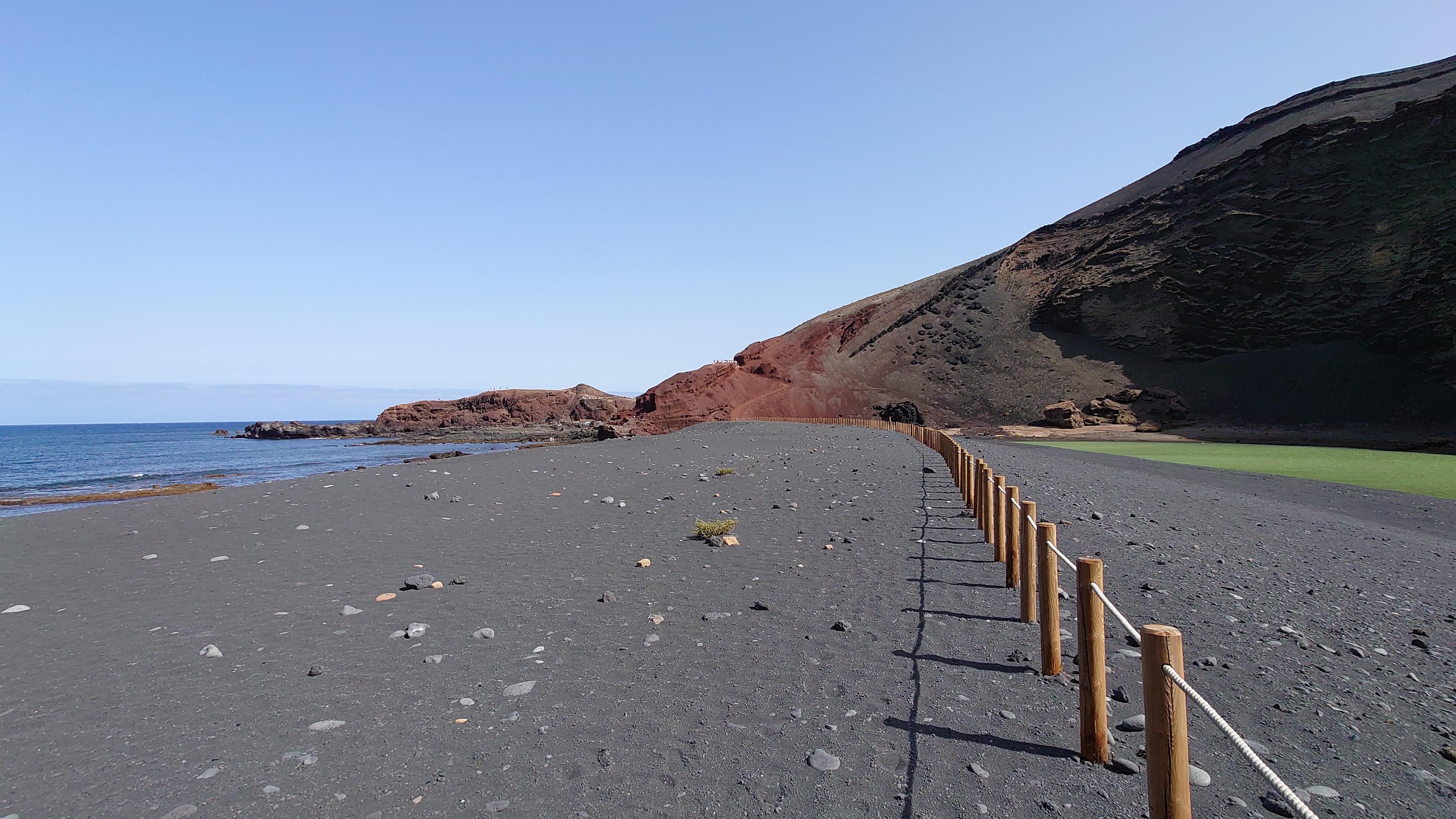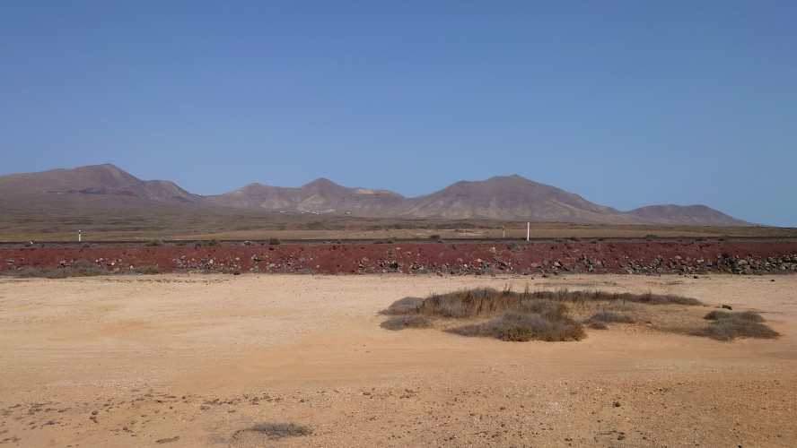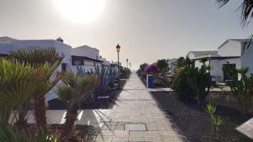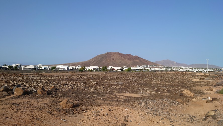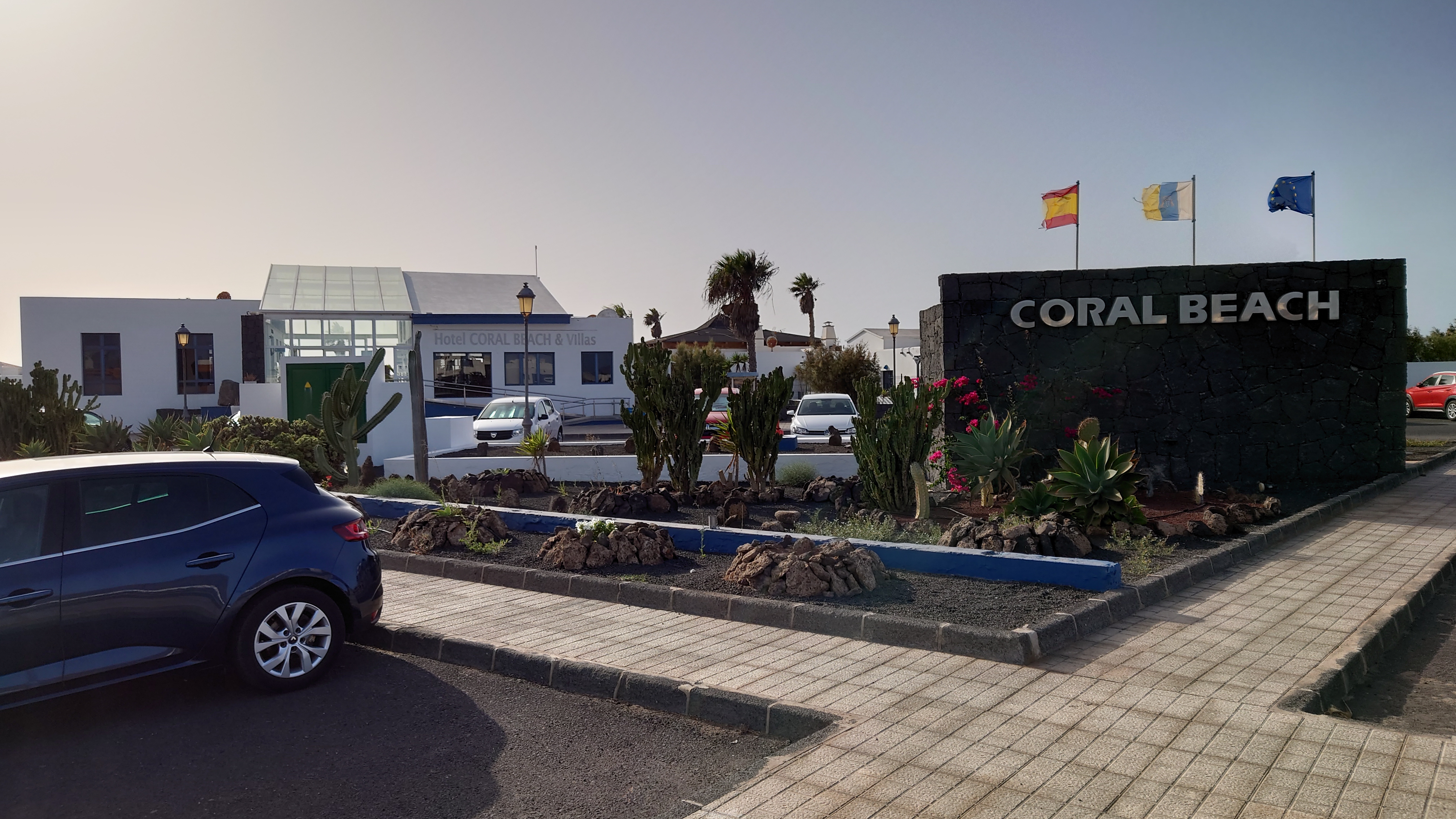 Mir fällt eine schachbrettartige Formation auf. Ein Bild meines Vaters zeigt das. Ich versuche die exakte Position anhand der Winkel auf seinem Foto auszumachen, bis ich sie nach etwa 20 Minuten auf einer Anhöhe schließlich habe und direkt auf einen schnurgeraden Weg mitten durch die Salzlagune schaue. Ein komisches Gefühl ist das gerade. Exakt hier hat Papa gestanden und Mama mit seiner schweineteuren SLR vor einem halben Jahrhundert abgelichtet, 17 Jahre jünger als ich jetzt bin. Plus minus ein bis zwei Meter, denn sonst stimmt der Winkel schon nicht mehr. Sehr sehr komisch fühlt sich das an. Ich stelle fest, in 50 Jahren hat sich nicht so viel verändert, außer dass natürlich die aktiven Salzfelder hin und herwandern.Weitere 15 Kilometer liegen noch in einer gelblicheren Wüste entlang der Küste vor mir. Meine Füße sagen "nicht dein Ernst jetzt, oder?!" und überzeugen mich davon, die parallel zur Schnellstraße verlaufende 701 zu laufen. Laaaaaaaangweilig. Aber immerhin... während alle Autos auf der großen Straße fahren, ist die Kleine fast für mich allein. Aber es ist ein totaler Brainfuck. 10 Kilometer geradeaus mit dem absoluten Highlight einer leichten Linksbiege bei Kilometer 5,5. Und dann hupen mich auch noch lauter Leute an so "Heeeey... ich hup dich an, weil du da läufst und das voll anstrengend ist und ich sitz hier im Auto heeeeey!" Oder was? Ich erschreck mich jedes Mal zu Tode. Ein Fahrradfahrer kommt mir bei der Biege entgegen und streckt mir Corona-stylisch die Faust entgegen: Boing! Na das fand ich dagegen motivierend: Fortan hopste ich pfeifend und leicht wie eine Feder vor mich hin, bis ich das Ortsschild von Playa Blaca passierte. Aaah, dann bin ich ja jetzt da!... bin ich nicht. Der Ort ist gewaltig gewachsen seit wir 1996 hier waren. Meine heutige Ferienanlage, das Coral Beach, liegt 5 Kilometer entfernt direkt am Leuchtturm Faro de Pechiguera, der am südwestlichsten Zipfel Lanzarotes steht. Ich laufe eine halbe Ewigkeit an duzenden von Appartmentanlagen und Clubhotels entlang, die bis auf den Hausvulkan Montaña Roja hinauf reichen. So viele, dass ich befürchte, der weiße Strand muss unter der Last der zu erwartenden Gäste förmlich absaufen. So viel Playa ist hier doch garnicht für alle. Egal. Mich interessiert nur noch der Pool meiner Anlage und ne Cola aus dem All-Inclusive-Kühlschrank, den mir der Rezeptionist bewundernderweise Schenkt, als er hört, warum genau ich nur eine Nacht hier bin. Morgen werde ich den Ort garnicht verlassen und nur 6 Kilometer weiter in den vielleicht noch ursprünglichen Ortskern zum Hafen von Playa Blanca ziehen, wo auch die Fähre in Richtung Fuerteventura ablegt. Da kann ich morgen früh noch das hiesige 7-Euro-Buffet verspeisen, den Rest einpacken lassen und den Pool beplanschen. Jetzt brauche ich natürlich auch noch Pool... und dann nur noch liegen.