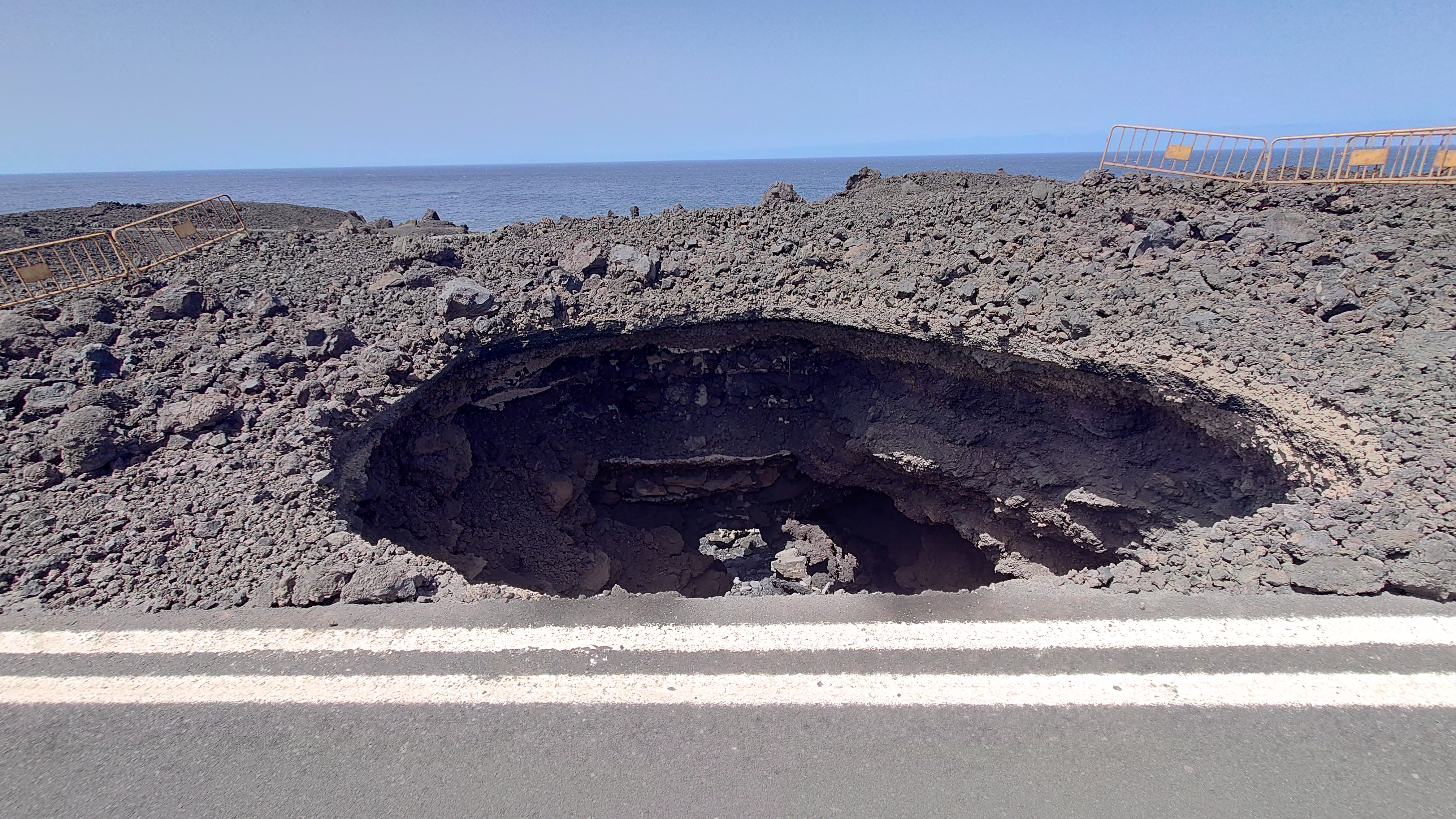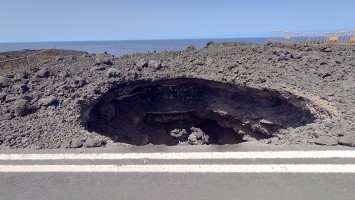 Er folgt mir und bleibt an jeder Biegung atehen, an der auch ich über die Klippen schaue, bis er irgendwann realisiert, dass ich gar nicht umdrehen will... und weg ist er. Ein paar Kilometer weiter realisiere ich dann schließlich, warum hier die Durchfahrt gesperrt wurde: ein etwa autogroßes Loch ist direkt an der Straße aufgebrochen und hat darunter eine Gasblase aufgetan, die bis ins Wasser reicht. Puh... dass bei dem "Blindgänger" da jahrzehnte lang nichts Schlimmeres passiert ist...