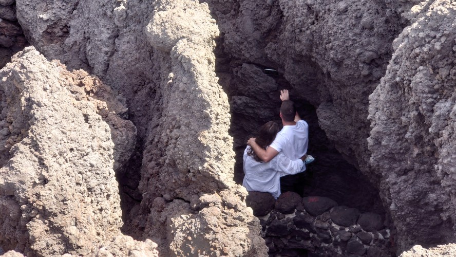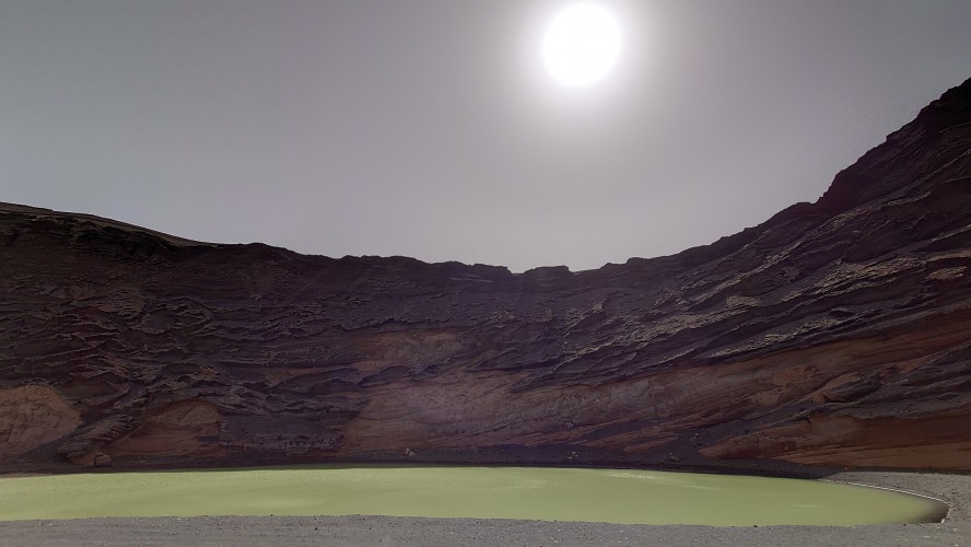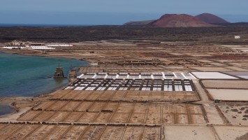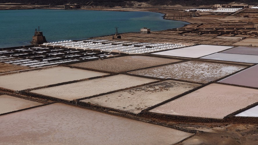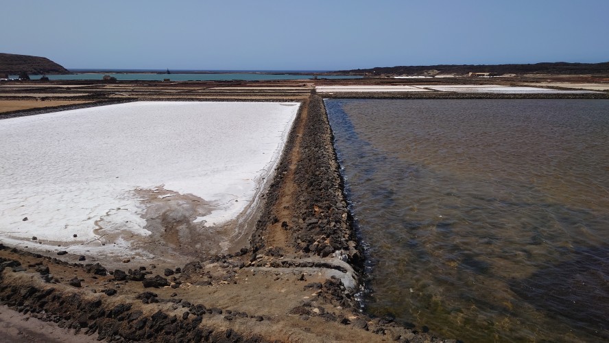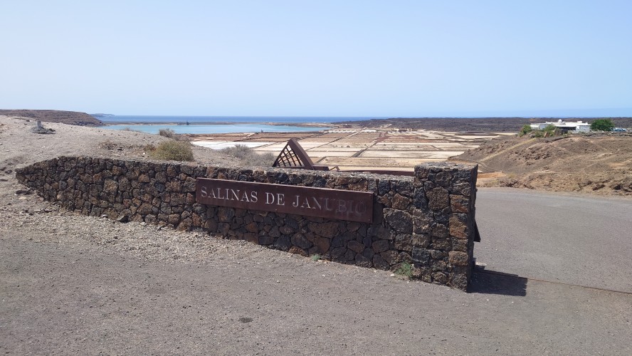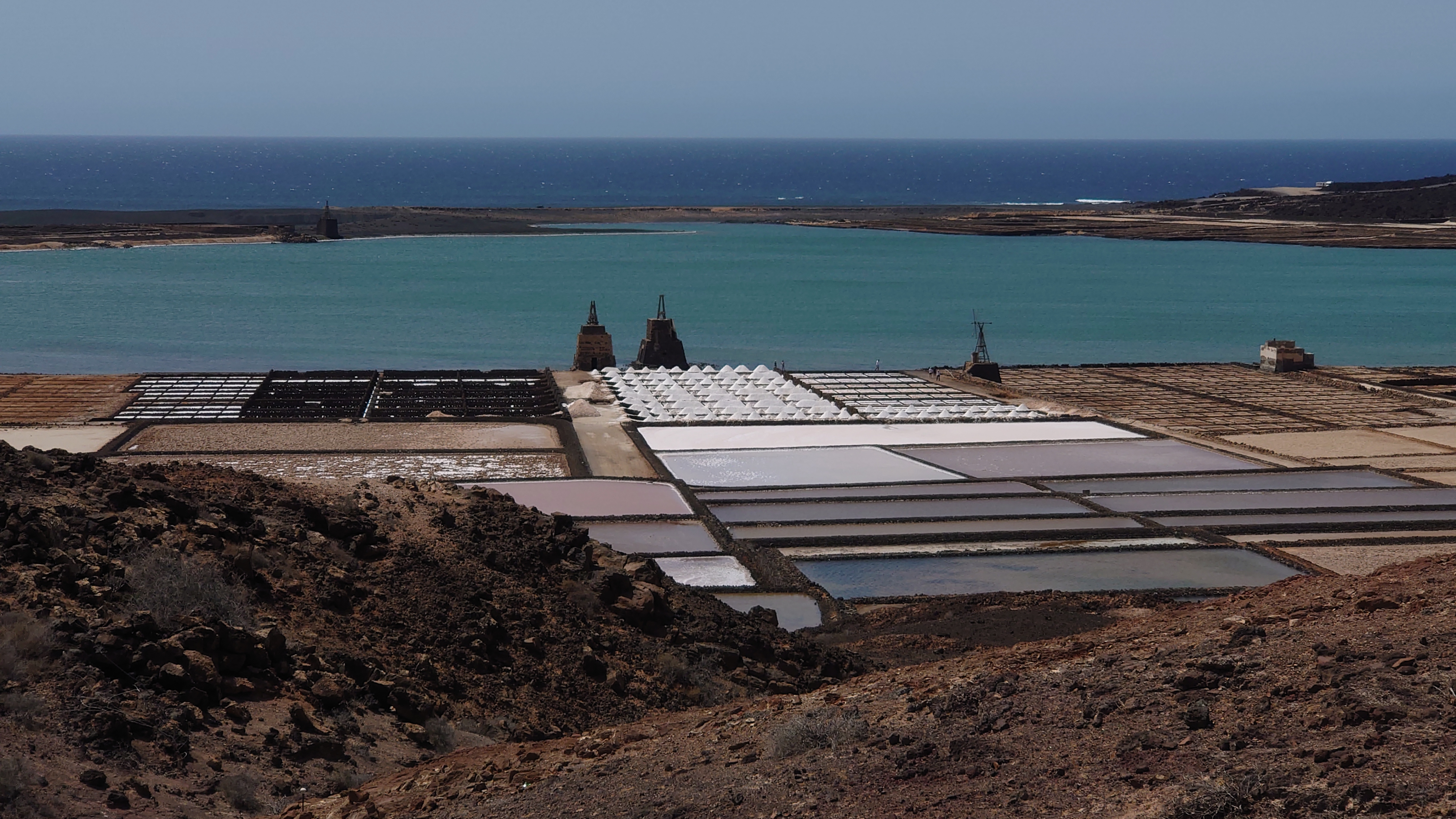 Unmittelbar nach dem Loch komme ich an die Salzgewinnungsfelder Salines de Janubio und die Straße ist von der anderen Seite her wieder freigegeben. Der Kameramann von eben ist schon da und schießt die Arbeiter in der Saline mit seinem Sniper-Tele ab, die gerade kleine Salzhütchen aus den Verdunstungsteichen heraus auftürmen. Diesmal samt Stativ. Die Frau sitzt solange im Miet-Polo und schmökert was Buntes. Ich erreiche das obere Ende der Salinen, wo man in einer Bodega alles rund um das hier gewonnene, kristalline Gut erwerben kann und Wasser! Letzteres ist mein Souvenir. Es ist heiß und ich hab schon wieder drei Liter versoffen.