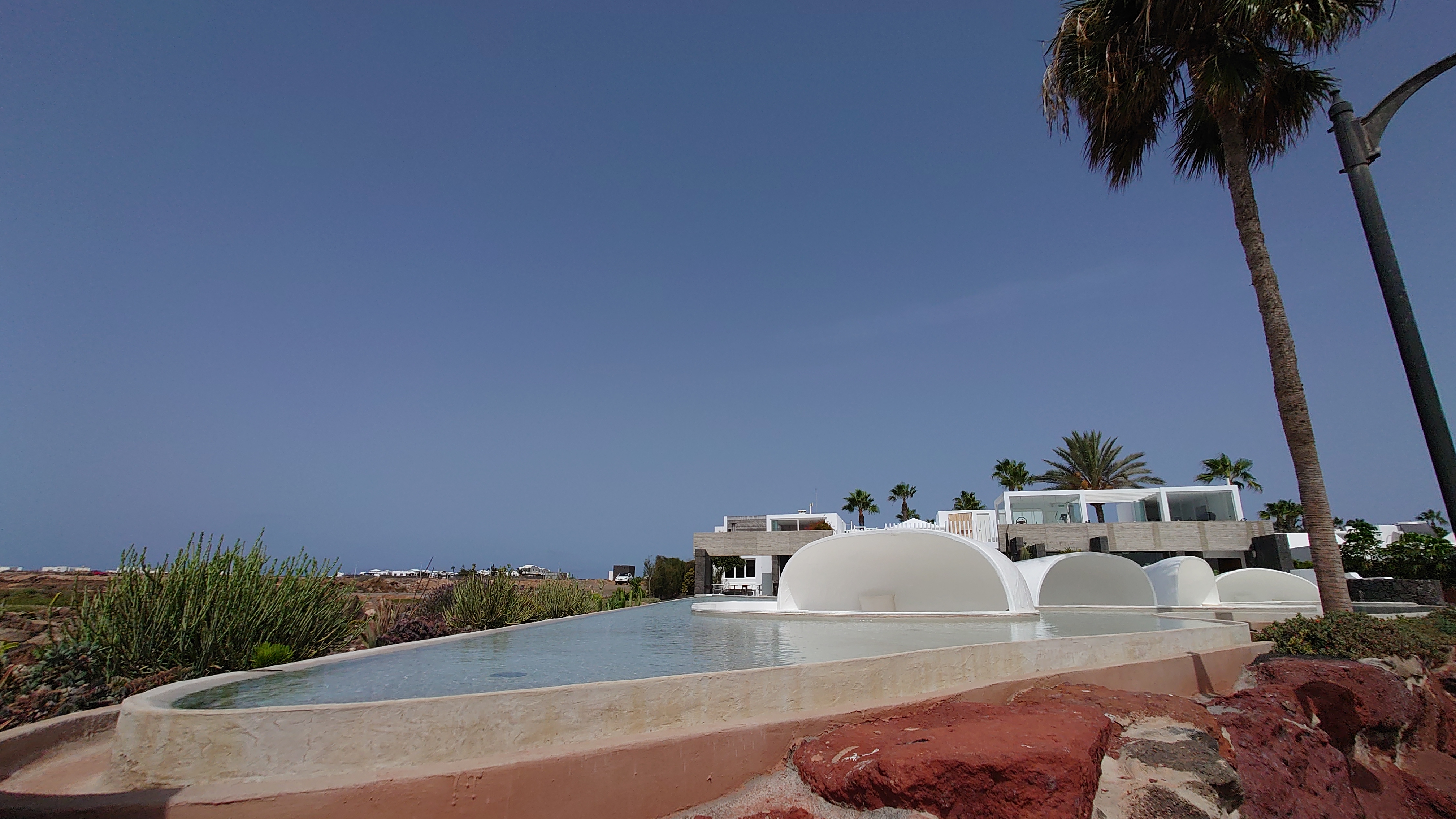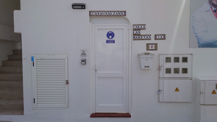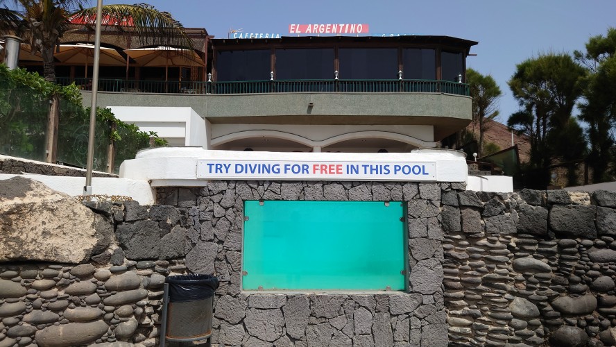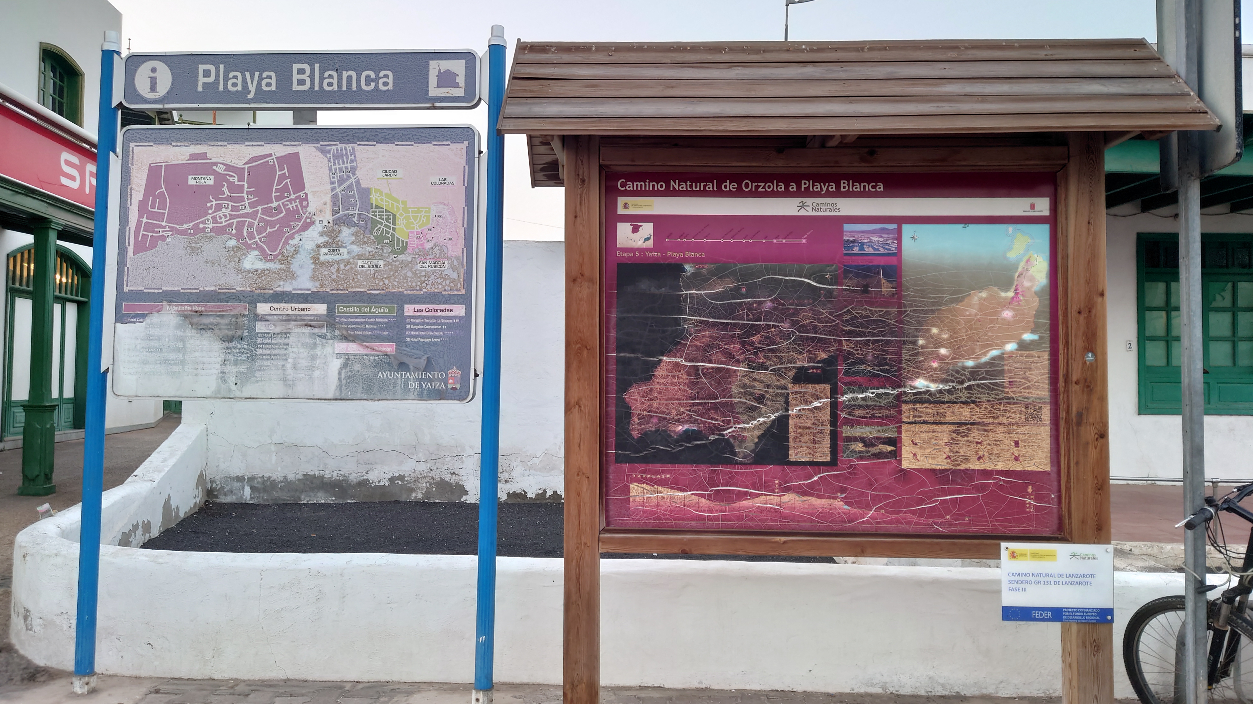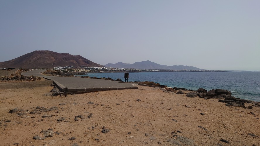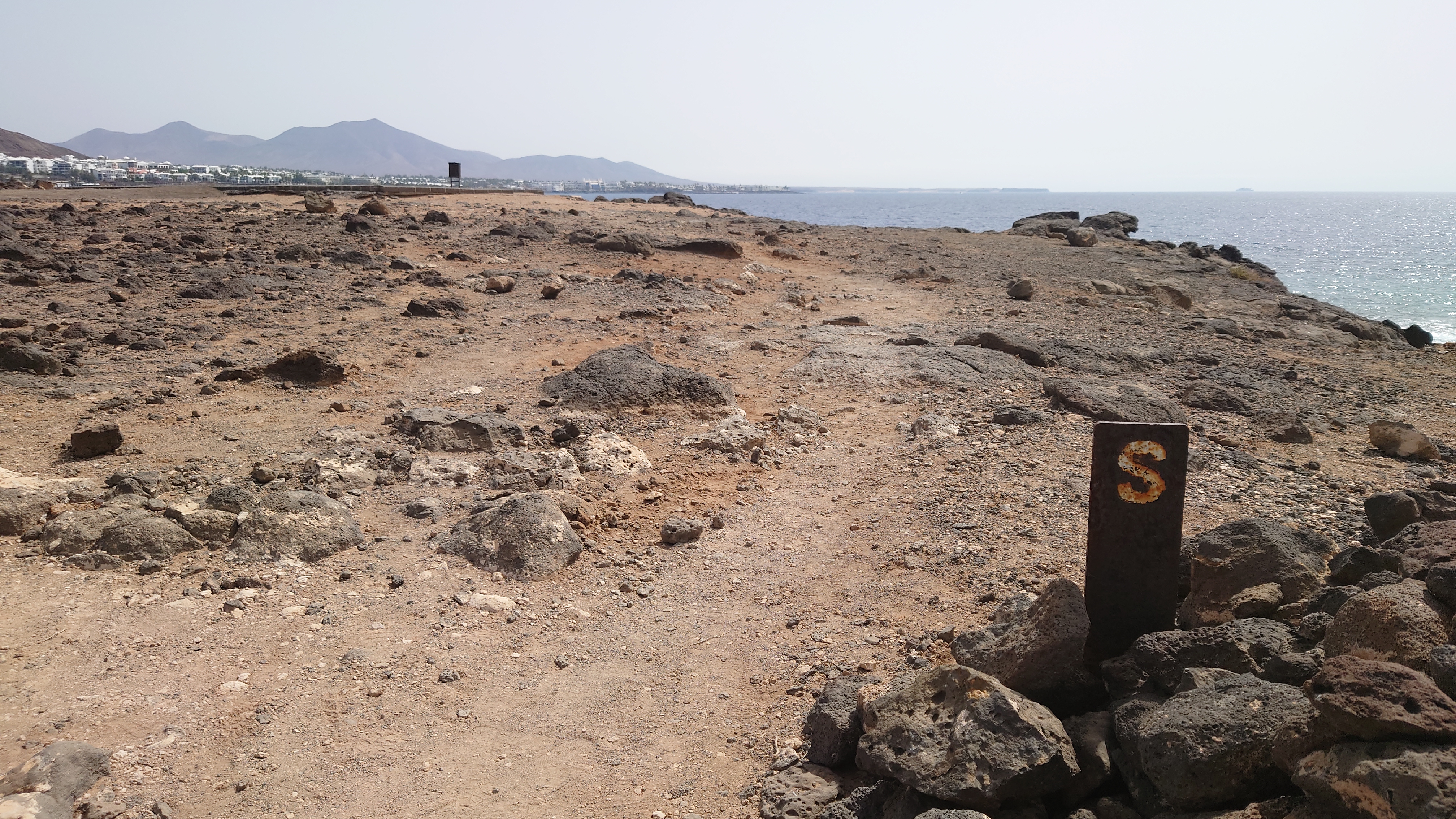 Das verrostete Wanderzeichen aus dem Norden taucht hier auch wieder auf. Ha! Ein klares Zeichen dafür, dass es einen Küstenweg von Nord nach Süd gegeben haben muss. Ein S ziert es hier noch. Gleich mal recherchieren, was das bedeutet... und ich werde endlich detaillierter fündig. Es gibt zwei bereits existierende Teile eines geplanten GR 135: N für Costa Noroeste und S für Costa Sureste. Und endlich finde ich auch mal Etappenbeschreibungen. Selbstzufrieden stelle ich fest, dass ich fast die selben Etappenziele ermittelt habe. Es gibt sogar ein Zertifikat?!? Hmmm... wohl nicht (mehr). Ein wanderwegarchäologisches Geheimnis ist somit gelüftet. Freu!! Weiter geht's.Hmm.... an Fremdplantschen ist aber micht zu denken. Alle Anlagen am Strand sind umzäunt. Die Küste selbst ist felsig. Angler versuchen ihr Glück. Zwei Models posieren für etwas, das sie hochhalten sollen. Na mal schauen, wie man hier so brät. Manche Anlagen sind schön anzusehen, einige wurden aber auch geschlossen und sind mit einer gelblichen Staubpatina überzogen. Vergilbte Abstandsschildchen kleben noch an den umgefallenen Sonnenschirmchen. Da war Corona wohl am Werk. Ich bin ein bisschen enttäuscht und schaue zum Montaña Roja... Ach weißte, warum nicht.
