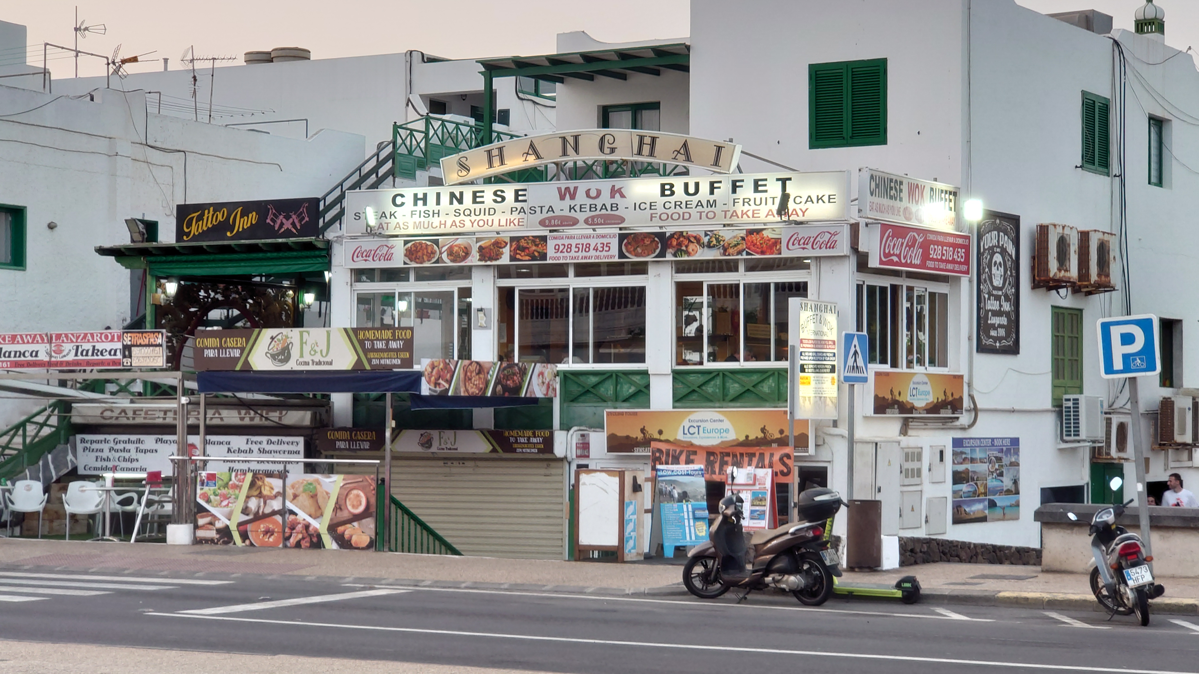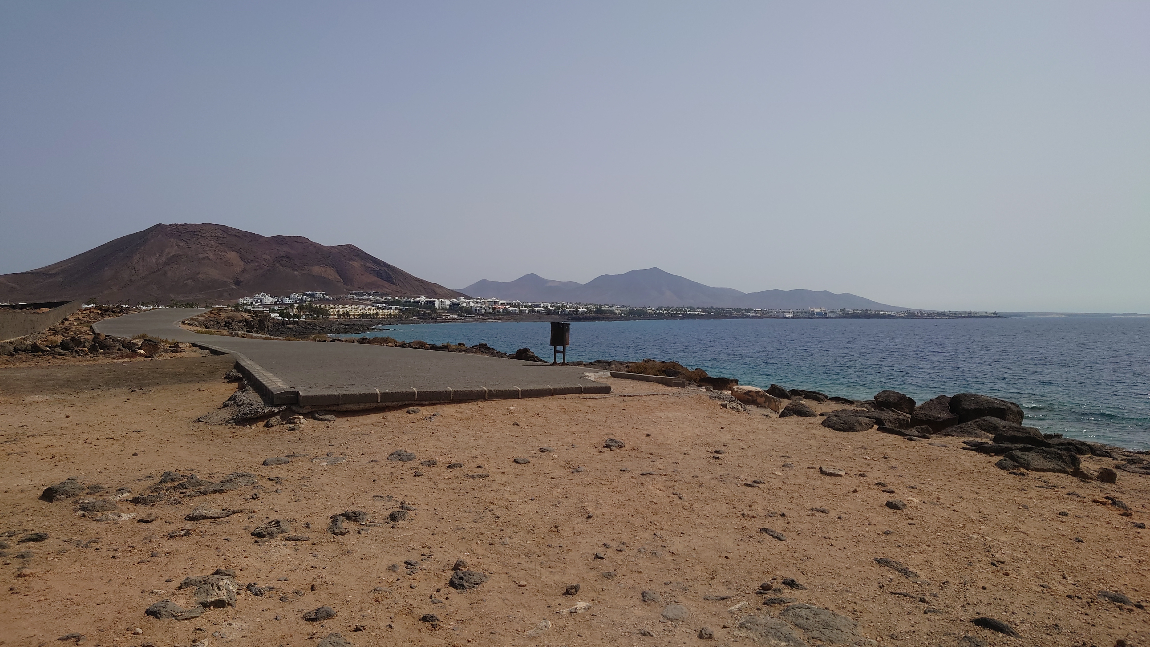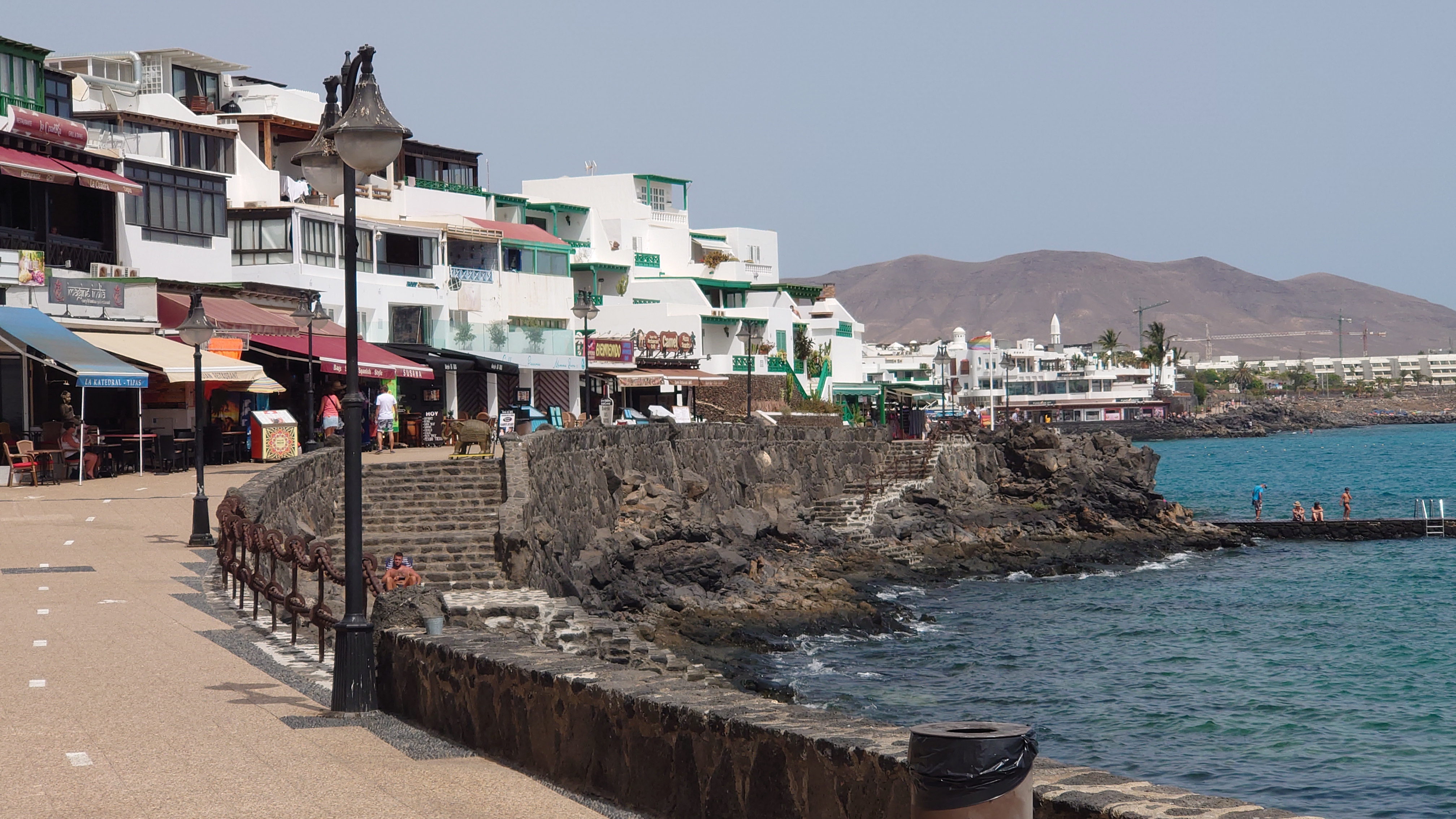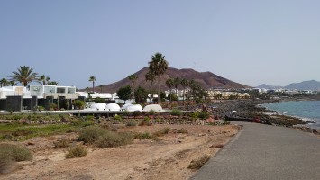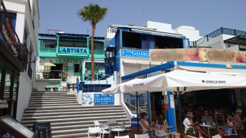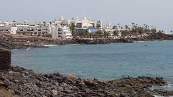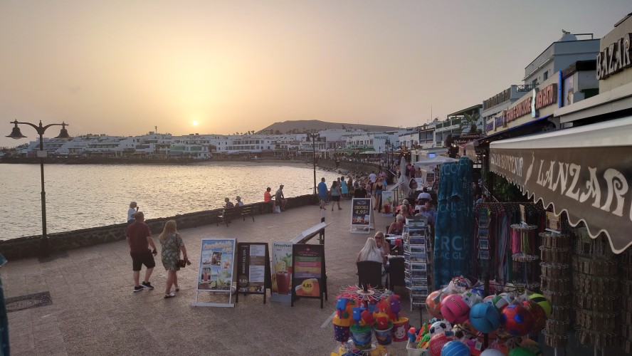 Unter mir erstreckt sich die durchgeplante Anlagen-Urbanisación. Sim City in Reinform. Von wegen der Ort sollte ursprünglich gehalten werden. Der eigentliche Ort ist gar nicht auszumachen. Mit Blick nach Norden kann ich sogar El Golfo ausmachen. Direkt vor mir, das muss die Anlage sein, in der wir damals waren, als über die hälfte der Bauten noch nicht existierte. Zwischen zwei Fünf-Sterne-Anlagen liegt ein älteres Gebäude herum, in dem es damals Restaurants gab. Heute auch: ein Grieche. Höhö.Der Krater selbst ist... naja auch ganz nett. Nicht so außerirdisch anmutig wie die anderen. Leute haben mit Steinen ihre Namen in den Krater gelegt. Das wirkt wie Graffiti. So, dann kann ich ja jetzt wieder abstiegen und die Promenade weiter bis zur Unterkunft gehen. Ich bin fast am Hafen, als die Anlagenszenerie ein plötzliches Ende findet: Tingeltangelbob ruft in abgeranzten Strandbauten auf zur billigen Unterhaltung. Die Soundkulisse gleicht einem Jahrmarkt und es wird ausgesprochen britisch. Popeye's Sportsbar. Beer: €1,50. Und da kommen auch die Teller-voll-toll-Chinabuffets wieder. Man könnte meinen, Briten mögen's billig. Abseits der Touristenmagneten hat mir die Insel aber eindrucksvoll bewiesen, dass man es nicht verallgemeinern kann. 1 zu 10.000.