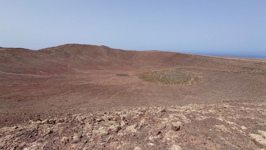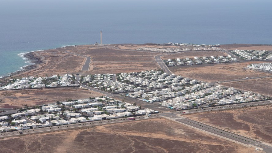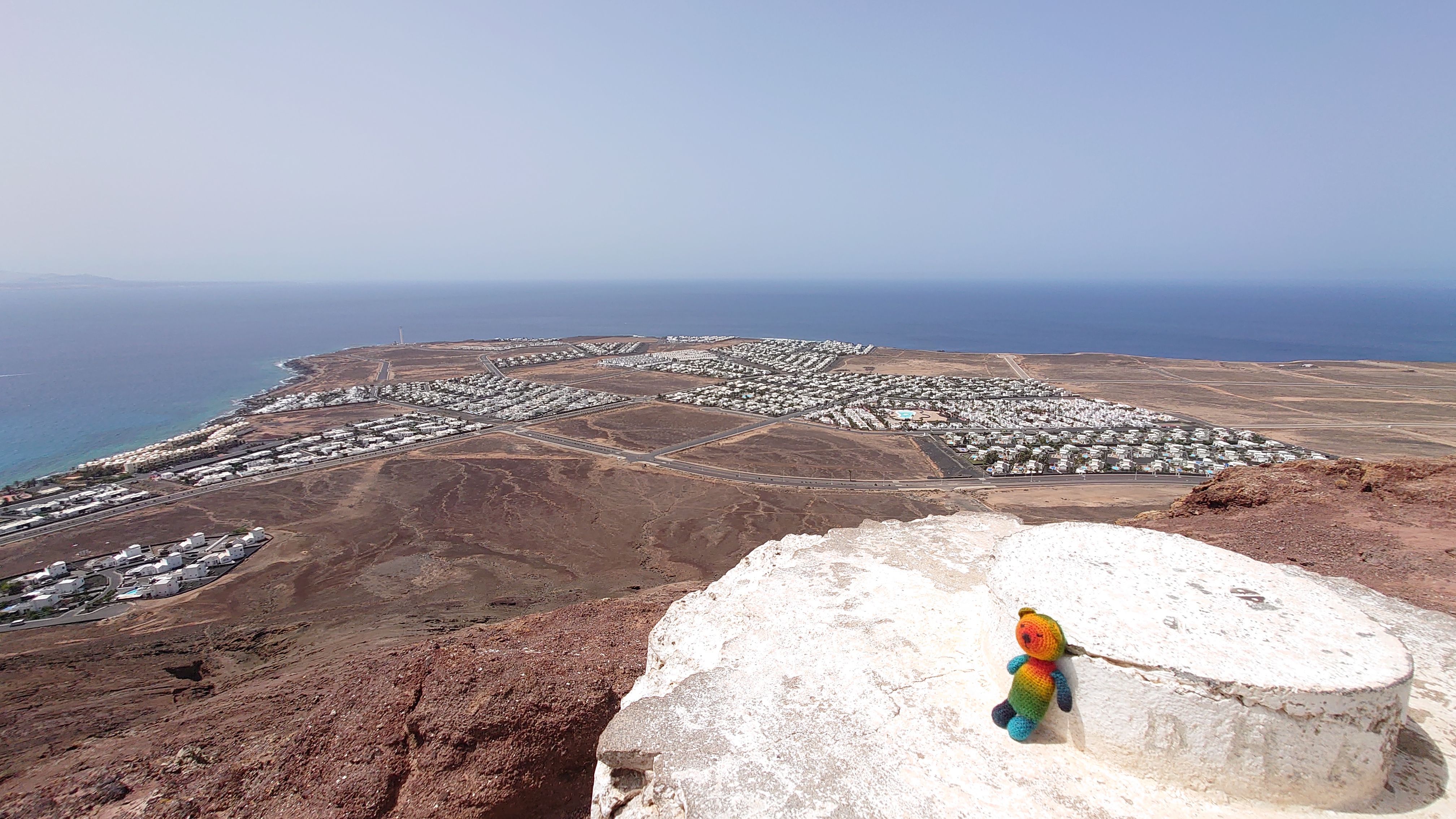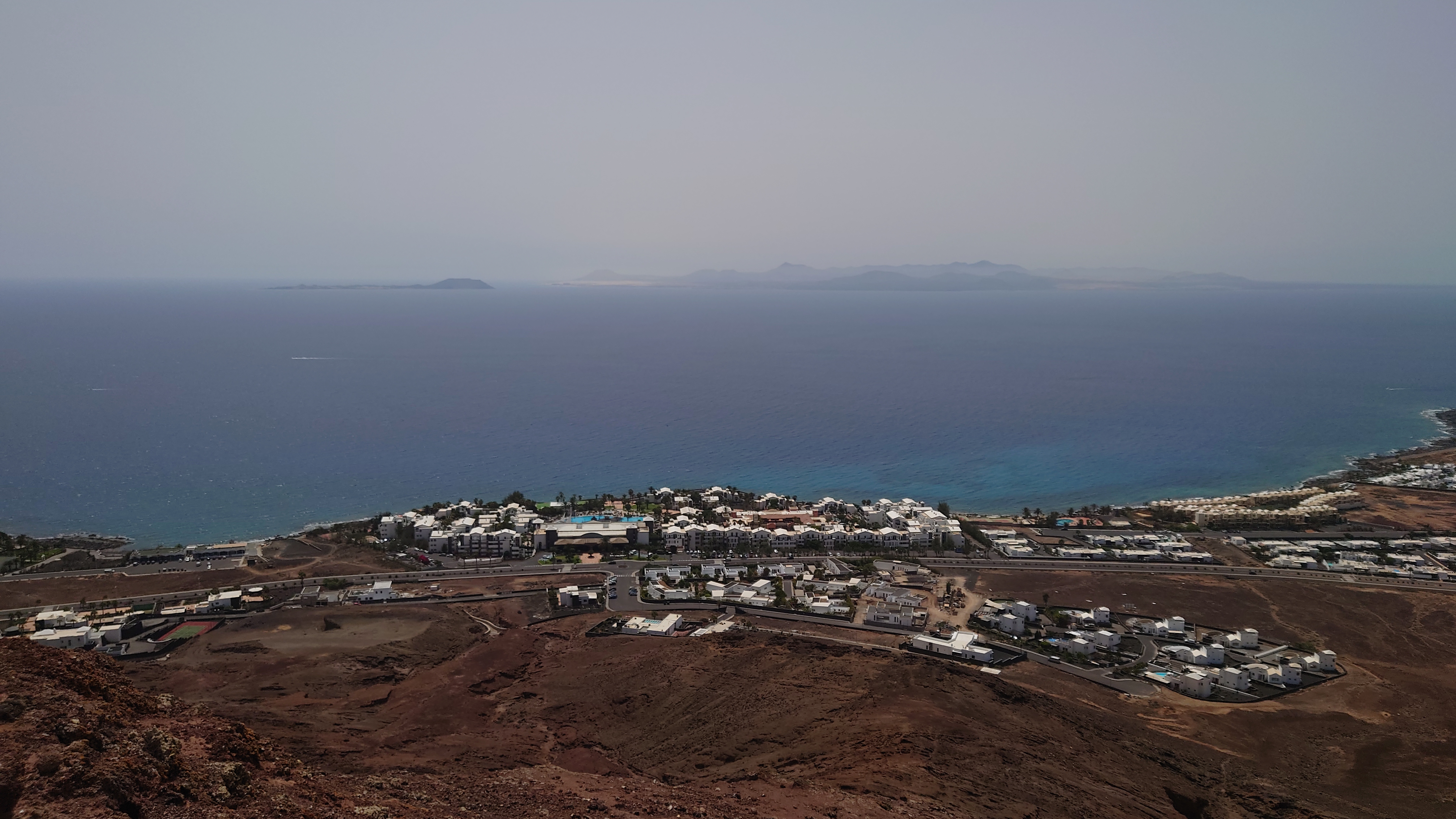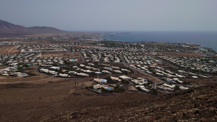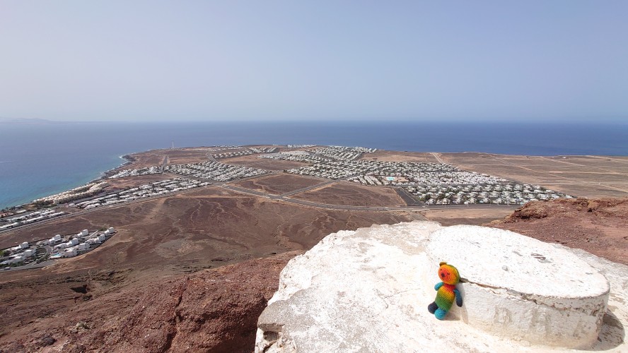 Eine Stunde später stehe ich auf dem Kraterrand und kann Playa Blaca in seiner Gesamtausdehung von 8 Kilometern überblicken. Hier oben ist alles vertraut staubig. Der Ort unter mir dröhnt leise vor sich hin. 10.000 Leute unten. Einer hier oben. Das scheint mir ein repräsentatives Verhältnis zu Bade- und Wanderurlaubern zu sein. In der Ferne sieht man die gewaltigen Dünen von Corralejo auf Fuerteventura und sogar das einsame Strandhotel ist erkennbar. Tja, dort oben bin ich vor fast 2 Jahren gen Süden gestartet.