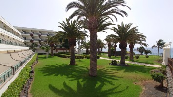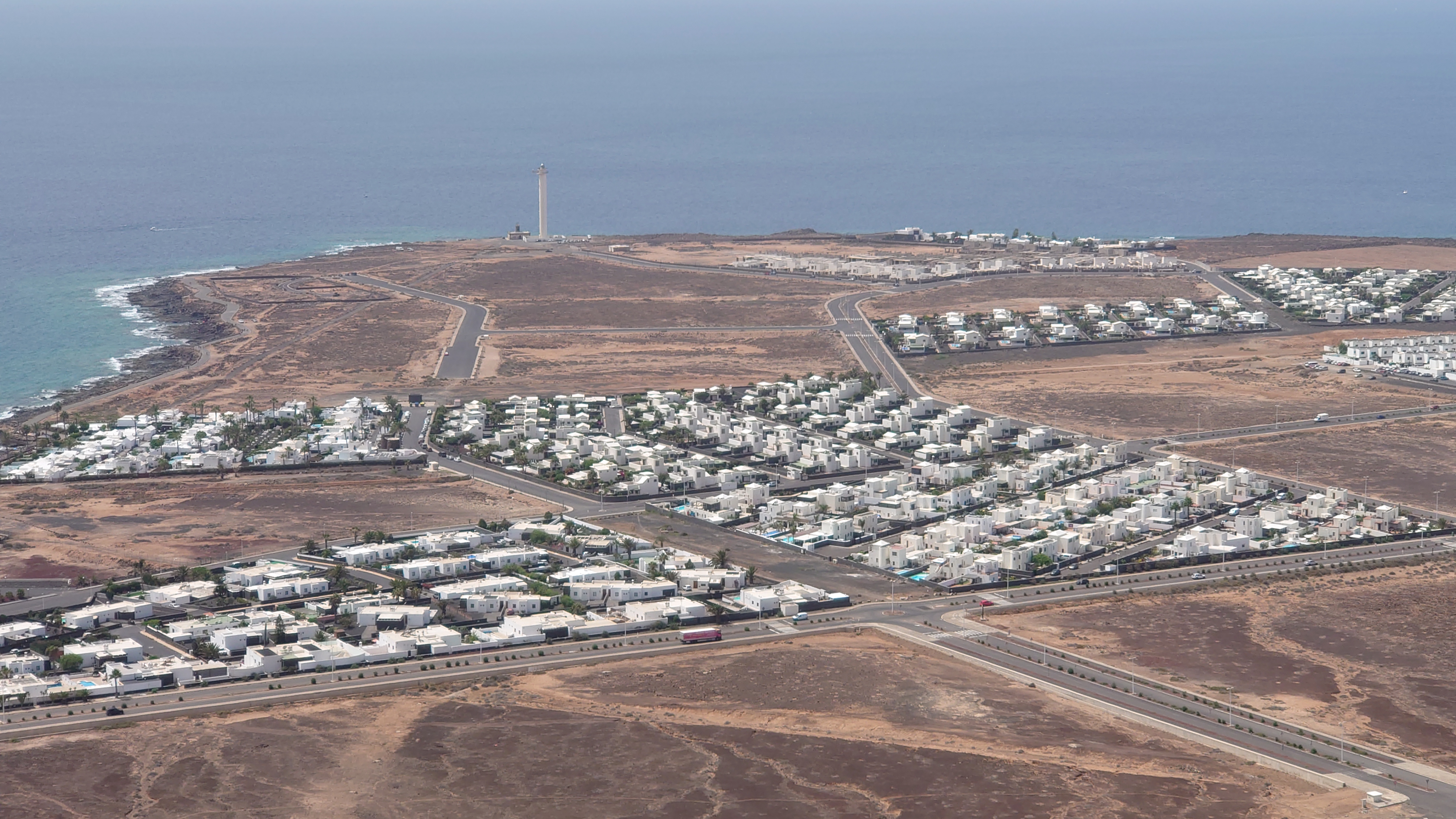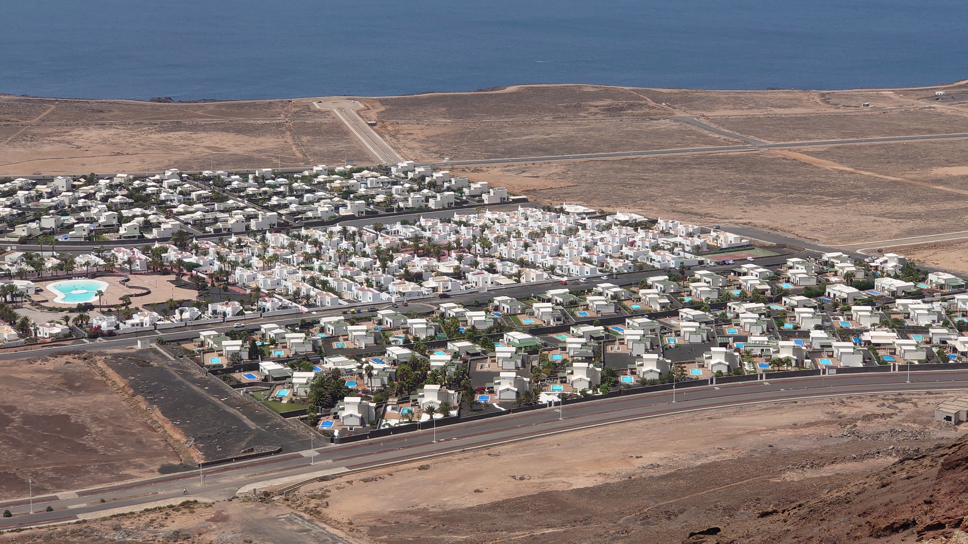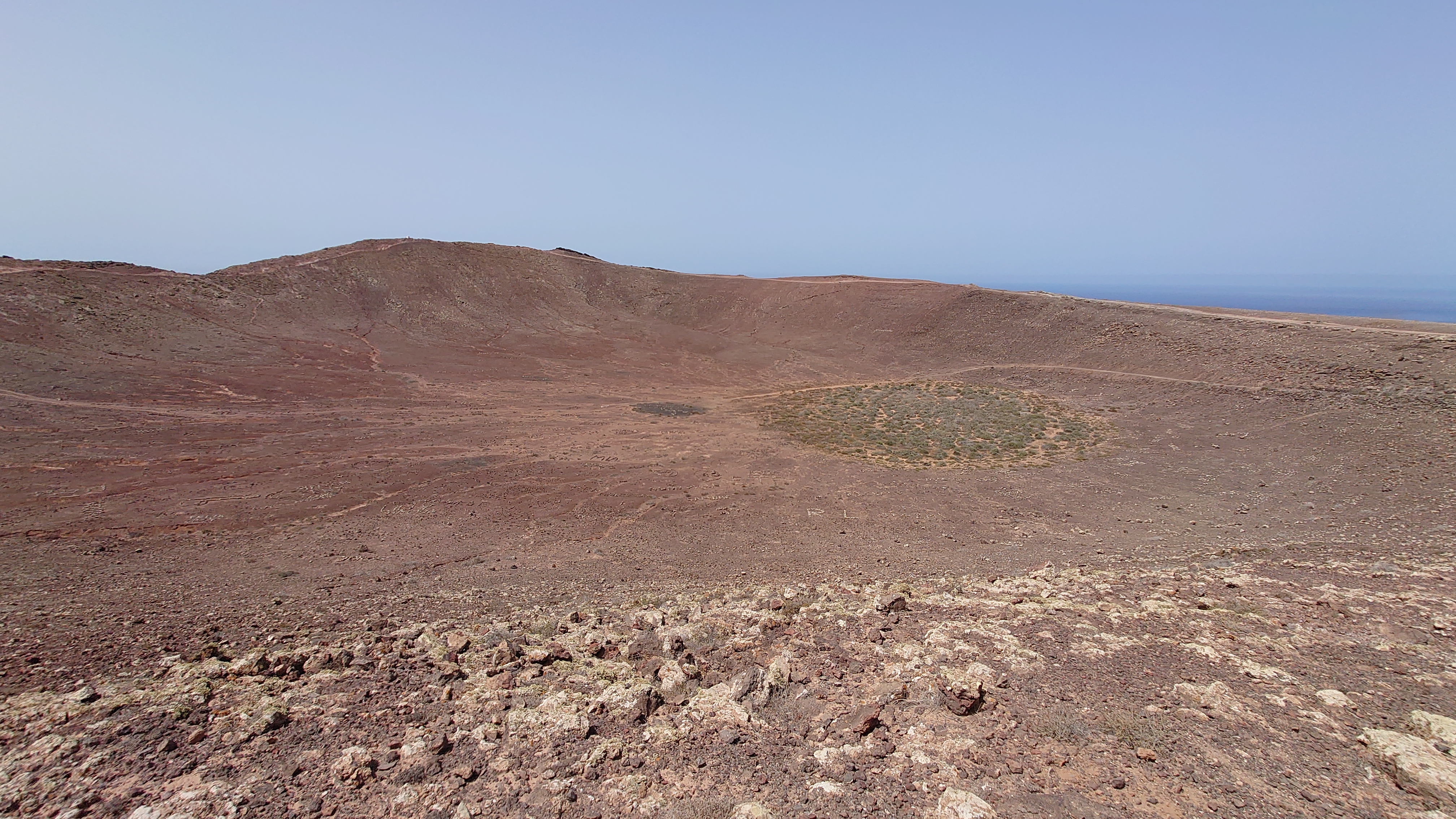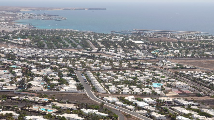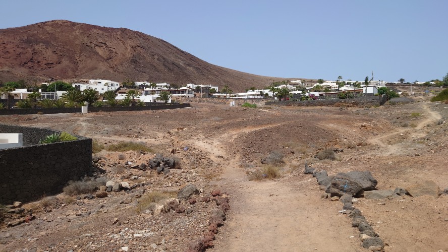 Eine Stunde später stehe ich auf dem Kraterrand und kann Playa Blaca in seiner Gesamtausdehung von 8 Kilometern überblicken. Hier oben ist alles vertraut staubig. Der Ort unter mir dröhnt leise vor sich hin. 10.000 Leute unten. Einer hier oben. Das scheint mir ein repräsentatives Verhältnis zu Bade- und Wanderurlaubern zu sein. In der Ferne sieht man die gewaltigen Dünen von Corralejo auf Fuerteventura und sogar das einsame Strandhotel ist erkennbar. Tja, dort oben bin ich vor fast 2 Jahren gen Süden gestartet.