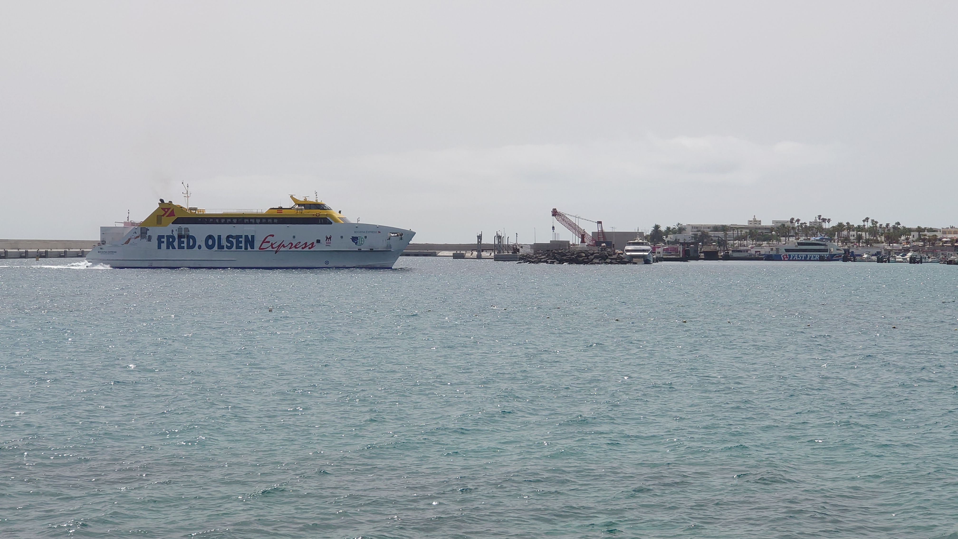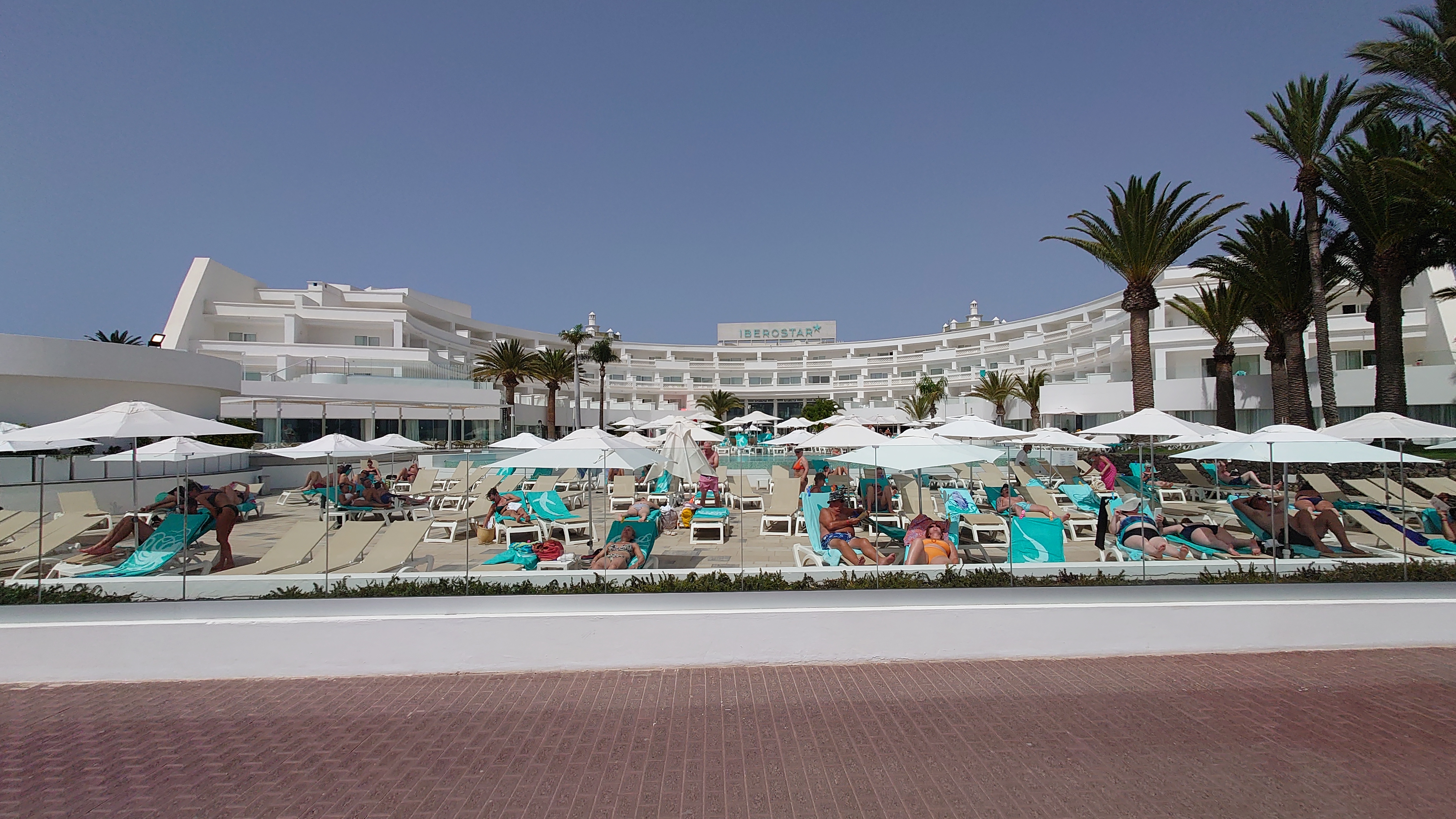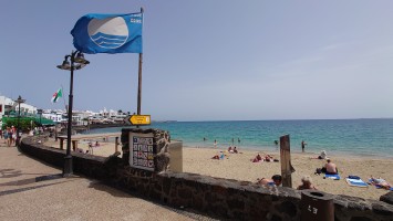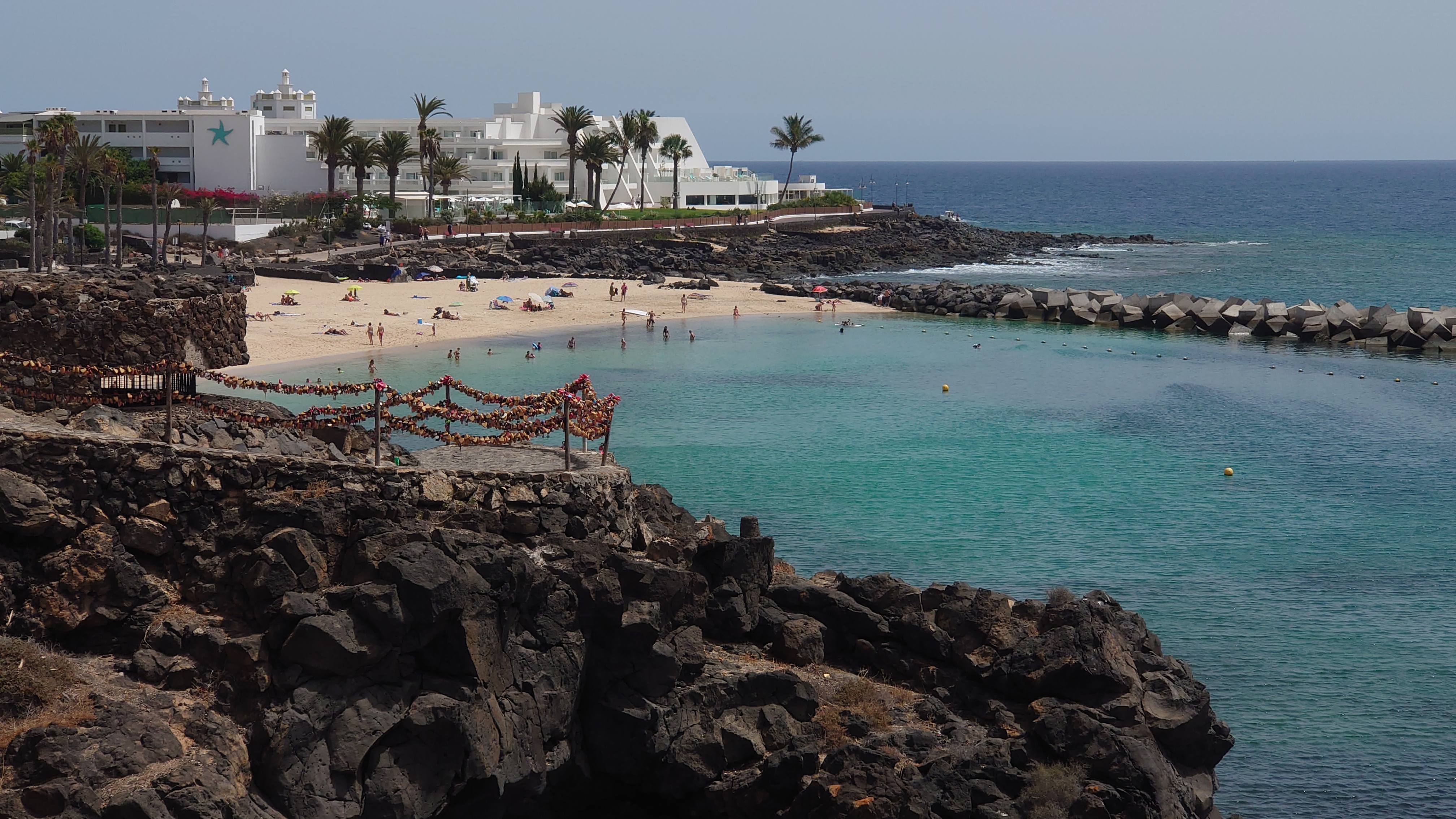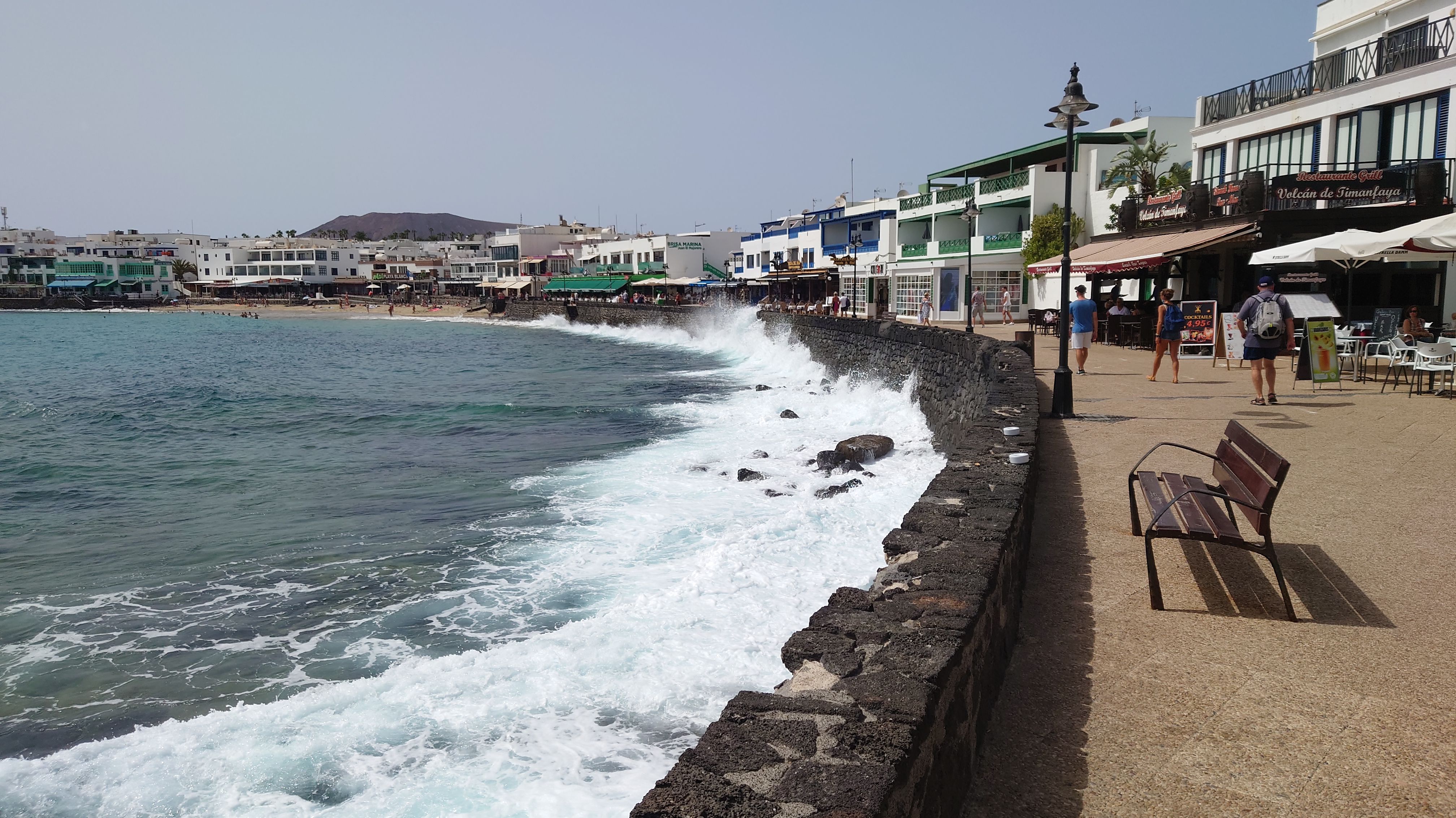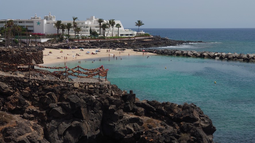 Hinter dem Hafen beginnt der Ort und es wird auch irgendwie ursprünglich. Und da! Daaaaa! Ja was denn? Ja daaa! Nimm mal die Lupe hier! Da isser: Playa Blanca! Oh Gott, der Arme. Der Strand ist tatsächlich weiß, liegt von der Promenade eingepfercht am Hafen und misst eine Gesamtausdehnung von 270 Metern. Er wird von zwei Mauern gefangen gehalten, damit er auch bloß nicht wegschwimmt, während die Olsen-Expressfähre bei der Ankunft regelmäßig eine gewaltige Welle über die Promenadenmauer direkt vor die Füße der hochschreckenden Restaurantbesucher prescht.