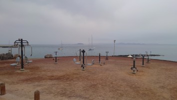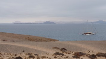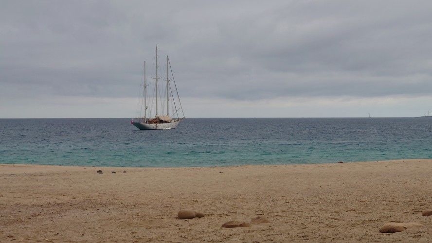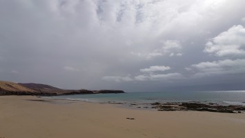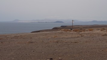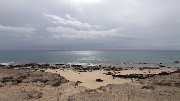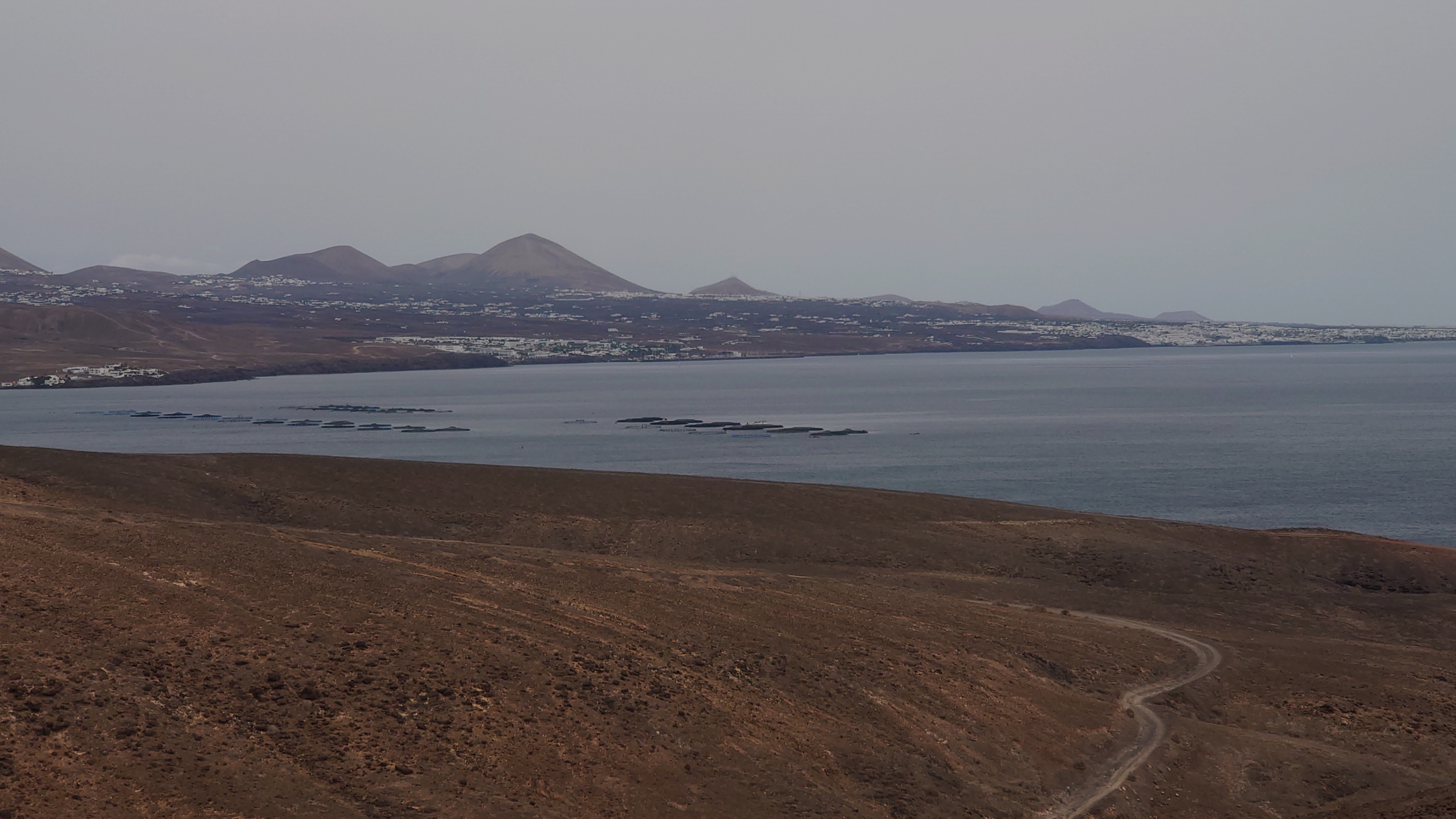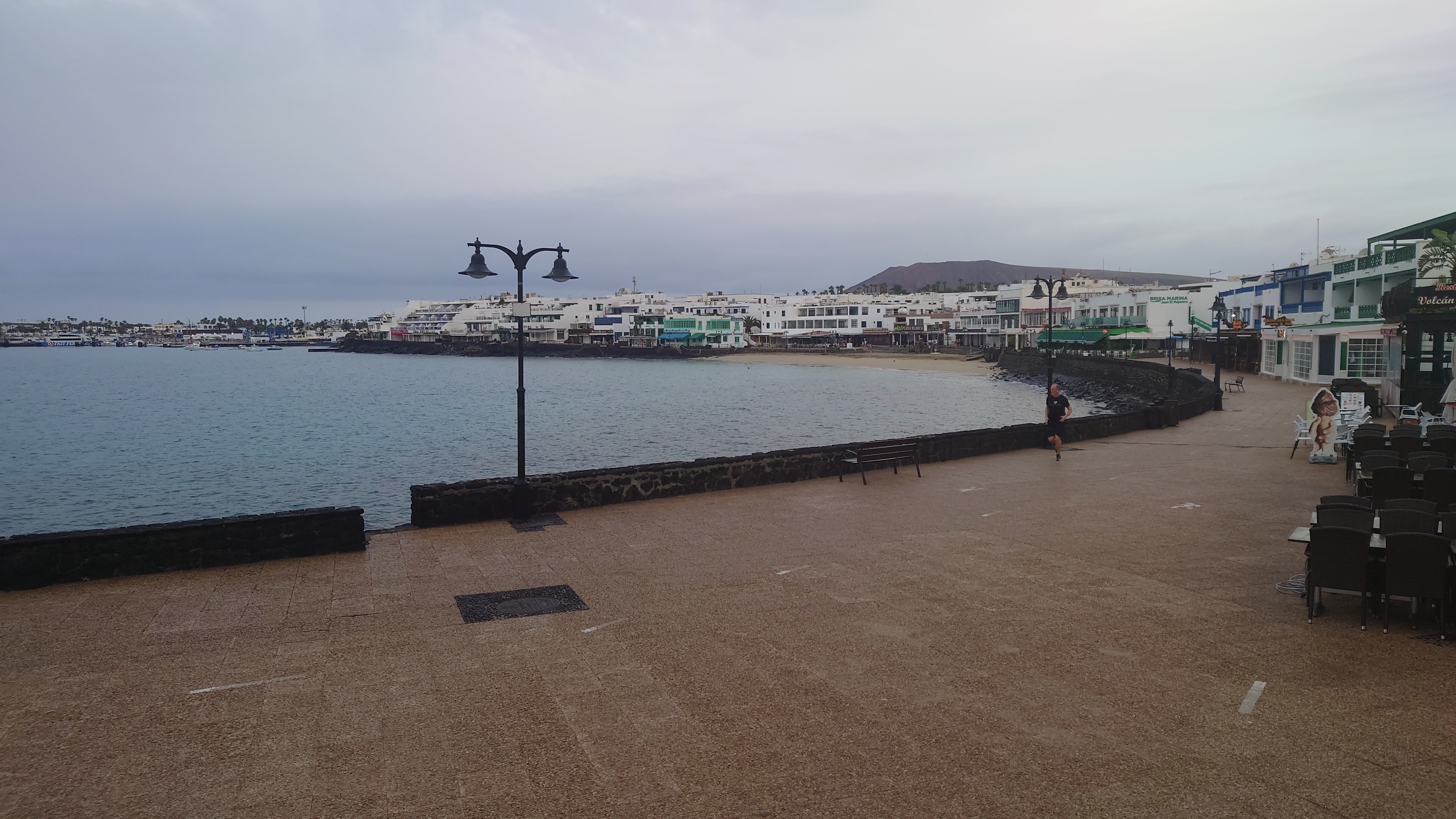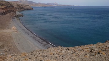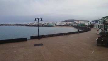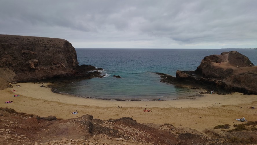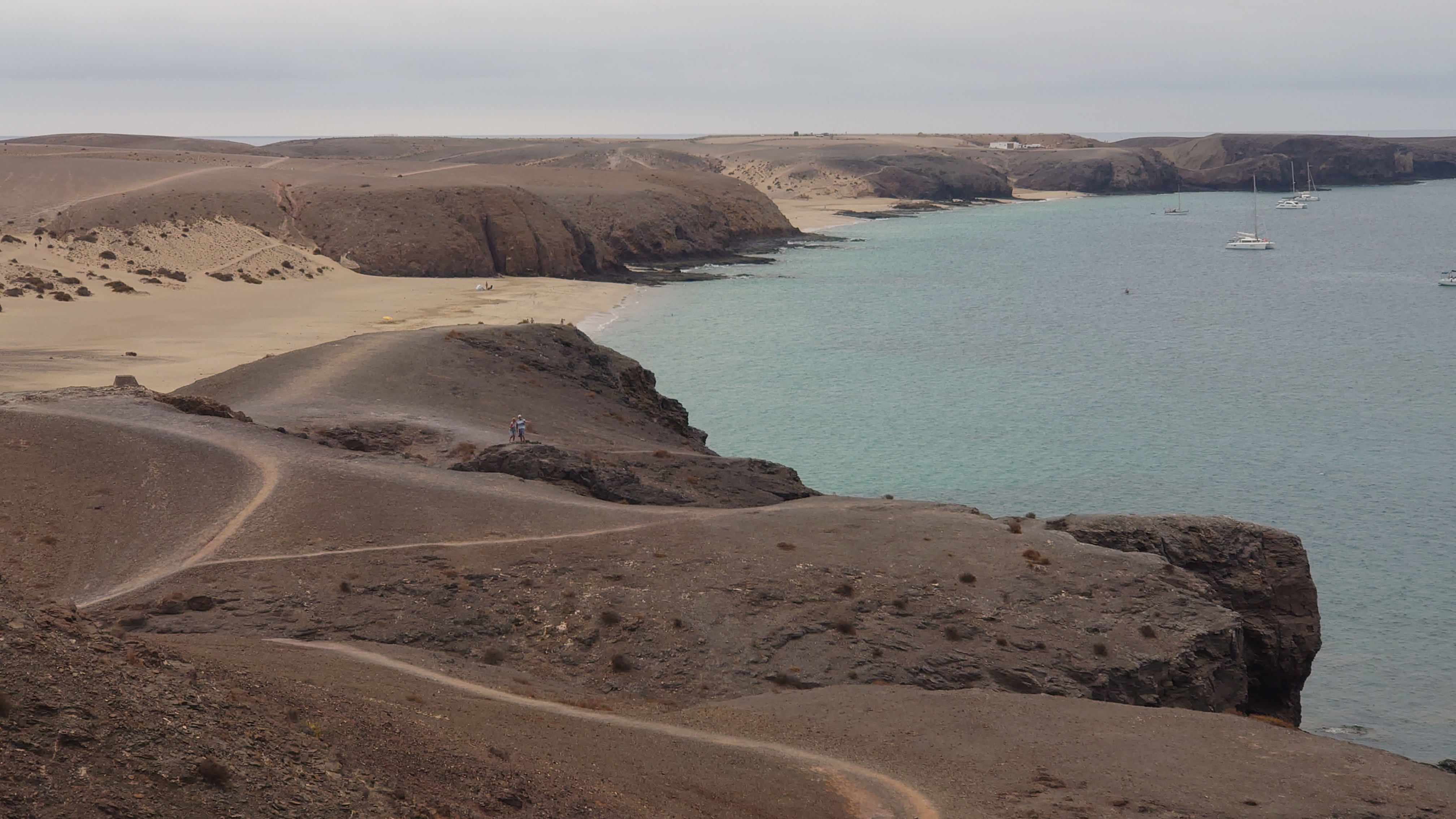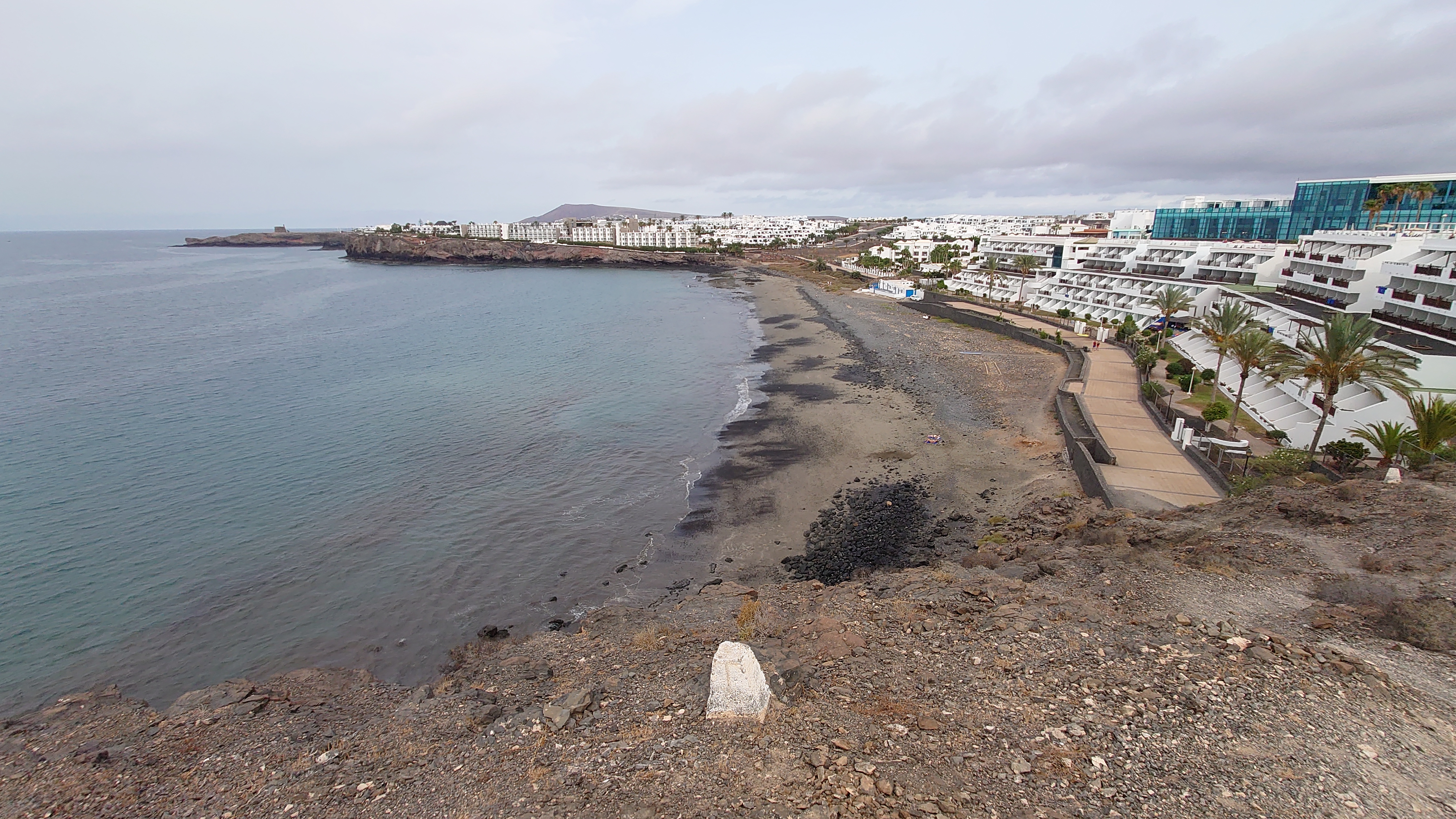 Im halb Acht werde ich wach und beschließe auch gleich aufzubrechen. Die Strecke wird lang und einsam durch die Wüste gehen und ich hab keine Lust auf Frust. Viel lieber will ich noch ein letztes Mal nackig wandern und jede Bucht zum Eintauchen nutzen können, bevor mich morgen bis zum Rückflug die Urbanización wieder gänzlich einnehmen wird. Doch erstmal heißt's noch die hiesige, nicht enden wollende Kakofonie hinter mich zu bringen. Das Elend findet nach drei weiteren Kilometern an einem offiziellen Hundestrand ein abruptes Ende, das das Monumento Natural Los Ajaches erzwingt. Hundestrand... Schilder zeigen an, dass die zwei Kugeln, die ein Hund so macht, von Herrchen mit Rückenleiden aufgesammelt werden müssen. Mensch, hier gehe ich aber so richtig gerne schwimmen jetzt. Schnell weiter. Seit 1994 sind die folgenden Papagayostrände und das komplette Hinterland Naturschutzgebiet. Keine Bebauung. Sonst wäre auch hier schon alles zubetoniert worden. So bleibt der einstige "Geheimtipp" eines jeden erdenklichen Reiseführers der 90er auch erhalten. Viel los ist nicht. Es ist das erste Mal so bewölkt, dass die Sonne keine Chance hat. Ich bin froh. Das kann ich gut gebrauchen für die Strecke. Bis zur südlichsten Spitze Lanzarotes geht's an den Stränden entlang. Afrikaner bringen sich in Stellung, um nackt badenden Ruhesuchenden kreischend bunte Wickeltücher anzudrehen. Ich gucke böse und sie ziehen gleich ab. Ein offizieller Zeltplatz ist hier in einen viereckigen Zaun eingepfercht. Camper im Freiluftgehege. Fehlt nur noch, dass sie Eier legen. Dem Geruch nach tun sie das in einem Betonverschlag abseits der Windrichtung. Tolle Szenerie. So richtig was für mich. Ich zieh' in den Wüstenstaub gen Norden. Ganz in der Ferne am Horizont erkennt man einen Klotz: das Grand Hotel von Arrecife. Zielgerade also. Je näher ich herankomme, desto mehr schält sich eine schneeweiße Küste aus dem wolkenverhangenen Zwielicht. Weiße Küste? Was ist das denn? Beton ist das... und zwar mit Namen Puerto del Carmen, meinem morgigen Ziel. Noch sieht es aus wie ein langer dicker weißer Strich am Horizont. Das kann auch erstmal so bleiben.Es geht rauf und runter. Eine einsame Bucht flogt der nächsten, um von mir beschwommen zu werden. Ich liebe das. Nackig wandern, zugestaubt an Buchten ankommen, Seesack fallen lassen und direkt ins Wasser, planschen, Seesack wieder auf den Rücken, nass weitergehen und von der Sonne trocknen lassen, bis die nächste Bucht kommt und das Spiel von vorn beginnt. Meine Vorstellung von Luxus ist sehr einfach und trotzdem nicht leicht zu bekommen.