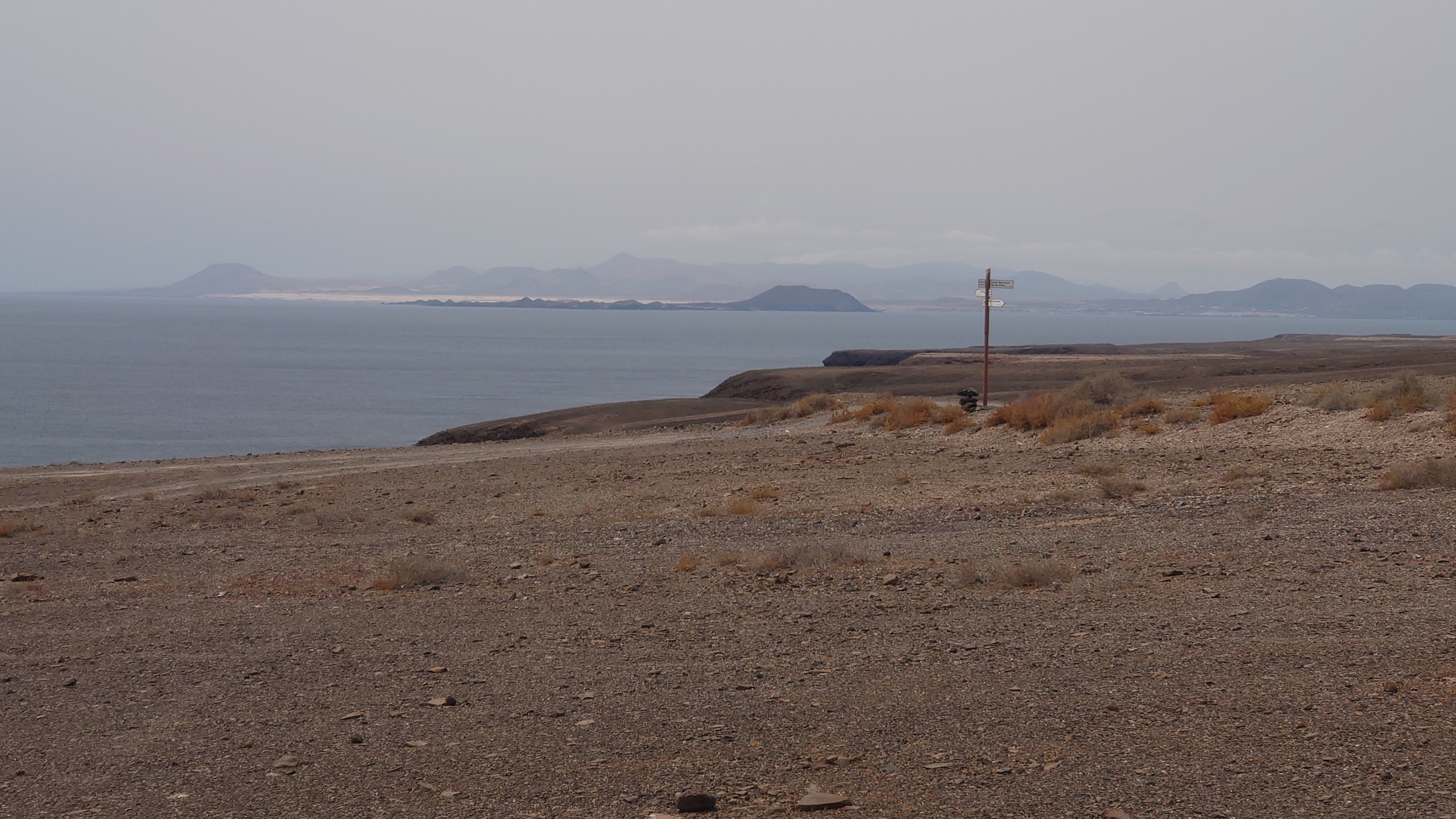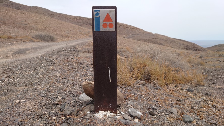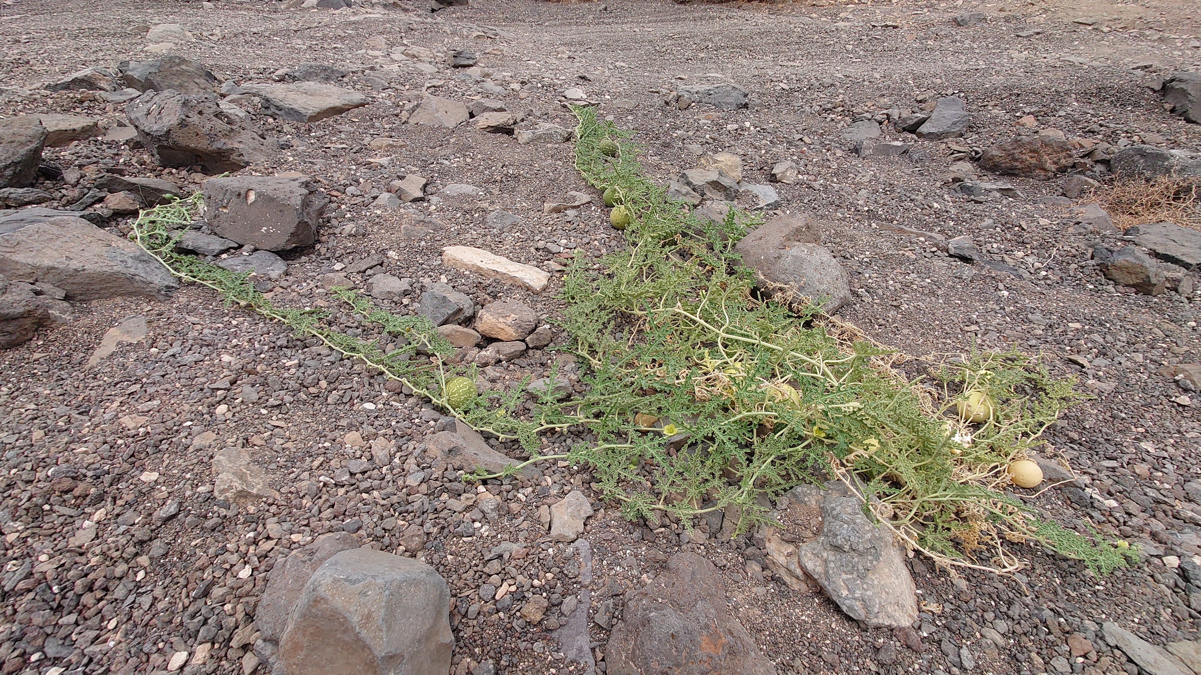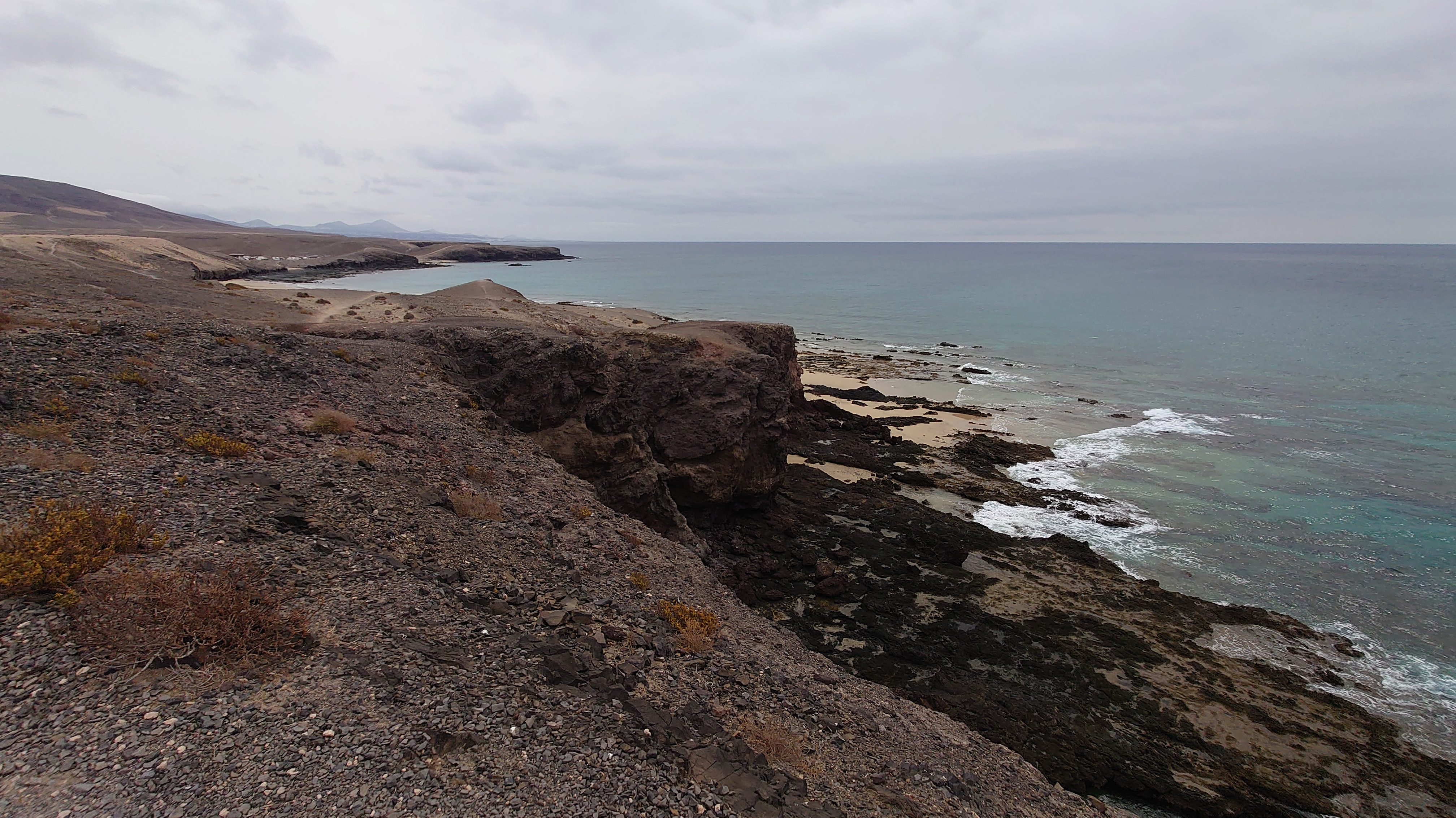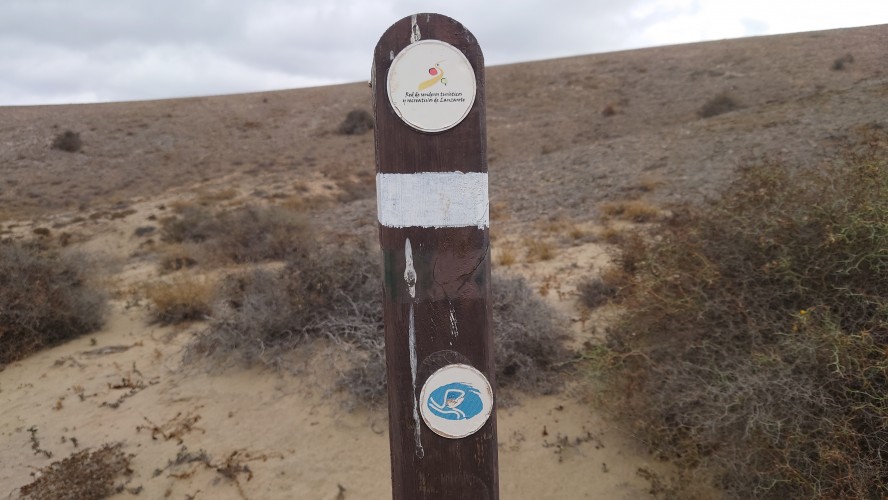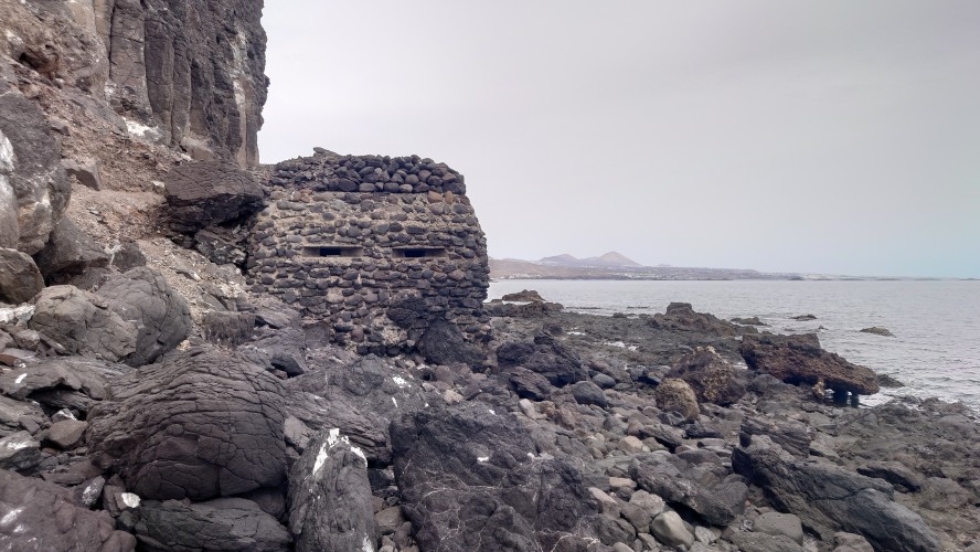 An größeren Stränden, hier und auch in Famara, sind mir immer wieder kleine Bunker aufgefallen, die mit ihren zwei Schießscharten die Bucht im Blick halten wie ein klobiges Beton-Beutetier. Überbleibsel eines Krieges. Nur welcher? Weltkrieg? Hier? Ein Wehrturm aus dem 18. Jahrhundert stand auch in Playa Blanca. Definitiv andere Epoche. Ein Hotspot von damals, der nicht leicht zu übersehen war.Die rostigen Stäbchen stecken ab und an auch wieder im Boden und endlich finde ich eins, auf dem noch das offizielle Zeichen klebt, das besagt, dass ich mich auf einer monumentalen Route befinde. Ich muss leoder feststellen: Wandermarkierungen und Wegweiser sind auf der Insel kaum zu gebrauchen. Sie stehen zwar hier und da gemeinsam mit total verwitterten Hinweisschildern herum, aber wir Wanderer sind offenkundig nicht das Zielpublikum mehr. So ist auch der GR 135 zwar seit 8 Jahren projektiert und mit den alten Zeichen in seiner Ausprägung auch schon da, aber suchen muss man ihn sich schlussendlich selbst... mitunter mit gefährlichen Sackgassen. Auch heute muss ich einen Abhang auf auf allen Vieren herunterrutschen wie auf Skiern, weil der Weg plötzlich einfach im Nichts verschwindet, weil ihn Jahre keiner mehr gegangen ist. Abhänge sind hier selten Fels und eher halb loses Geröll, das bei jeder Belastung sofort nachgibt. Aber so gelange ich in ein kleines Barranko, in dem eine bewundernswerte Kriechpflanze sei Unwesen treibt wie das Gestrüpp in Krieg der Welten, um Tennisballfrüchte zu erzeugen. Da soll man meinen, im Boden wäre kein Wasser. Da hat sich das Einstauben sogar gelohnt. Was solls, jede Bucht macht mich wieder sauber und so komme ich mach 10 Stunden im Zielort Playa Quemada an.