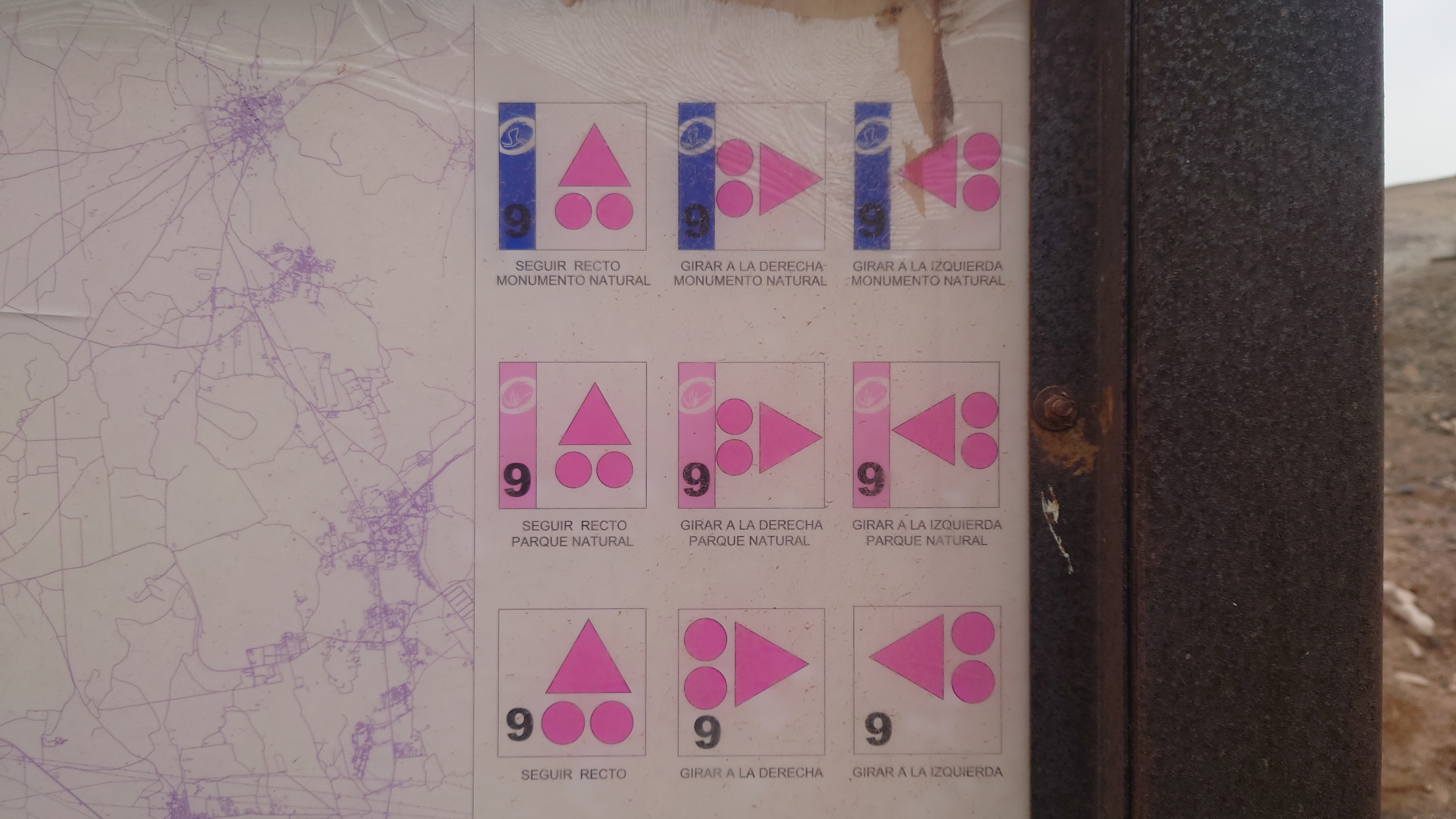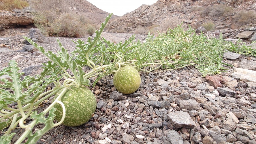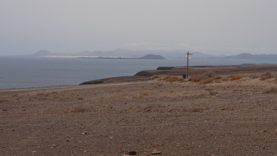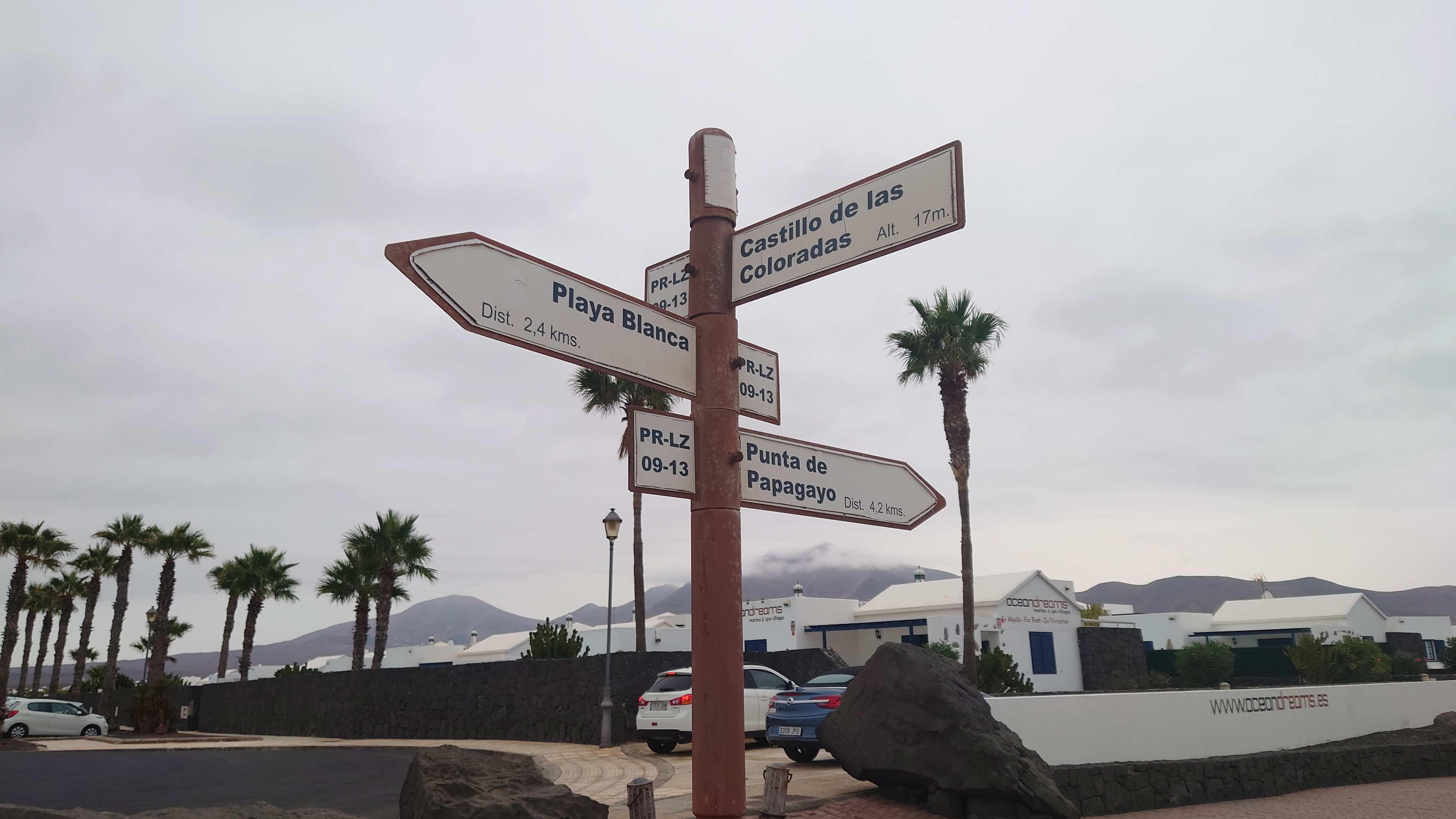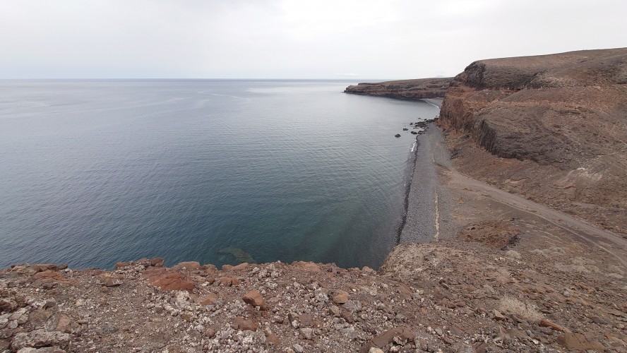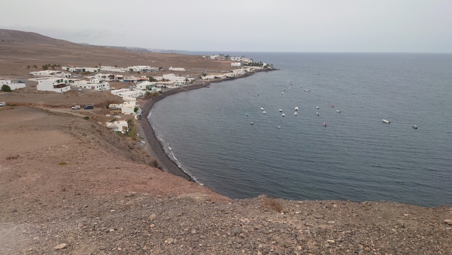 An größeren Stränden, hier und auch in Famara, sind mir immer wieder kleine Bunker aufgefallen, die mit ihren zwei Schießscharten die Bucht im Blick halten wie ein klobiges Beton-Beutetier. Überbleibsel eines Krieges. Nur welcher? Weltkrieg? Hier? Ein Wehrturm aus dem 18. Jahrhundert stand auch in Playa Blanca. Definitiv andere Epoche. Ein Hotspot von damals, der nicht leicht zu übersehen war.Die rostigen Stäbchen stecken ab und an auch wieder im Boden und endlich finde ich eins, auf dem noch das offizielle Zeichen klebt, das besagt, dass ich mich auf einer monumentalen Route befinde. Ich muss leoder feststellen: Wandermarkierungen und Wegweiser sind auf der Insel kaum zu gebrauchen. Sie stehen zwar hier und da gemeinsam mit total verwitterten Hinweisschildern herum, aber wir Wanderer sind offenkundig nicht das Zielpublikum mehr. So ist auch der GR 135 zwar seit 8 Jahren projektiert und mit den alten Zeichen in seiner Ausprägung auch schon da, aber suchen muss man ihn sich schlussendlich selbst... mitunter mit gefährlichen Sackgassen. Auch heute muss ich einen Abhang auf auf allen Vieren herunterrutschen wie auf Skiern, weil der Weg plötzlich einfach im Nichts verschwindet, weil ihn Jahre keiner mehr gegangen ist. Abhänge sind hier selten Fels und eher halb loses Geröll, das bei jeder Belastung sofort nachgibt. Aber so gelange ich in ein kleines Barranko, in dem eine bewundernswerte Kriechpflanze sei Unwesen treibt wie das Gestrüpp in Krieg der Welten, um Tennisballfrüchte zu erzeugen. Da soll man meinen, im Boden wäre kein Wasser. Da hat sich das Einstauben sogar gelohnt. Was solls, jede Bucht macht mich wieder sauber und so komme ich mach 10 Stunden im Zielort Playa Quemada an.