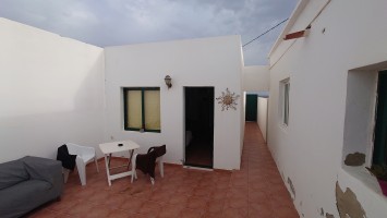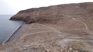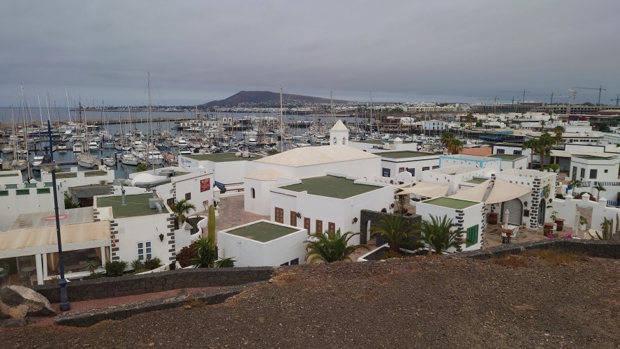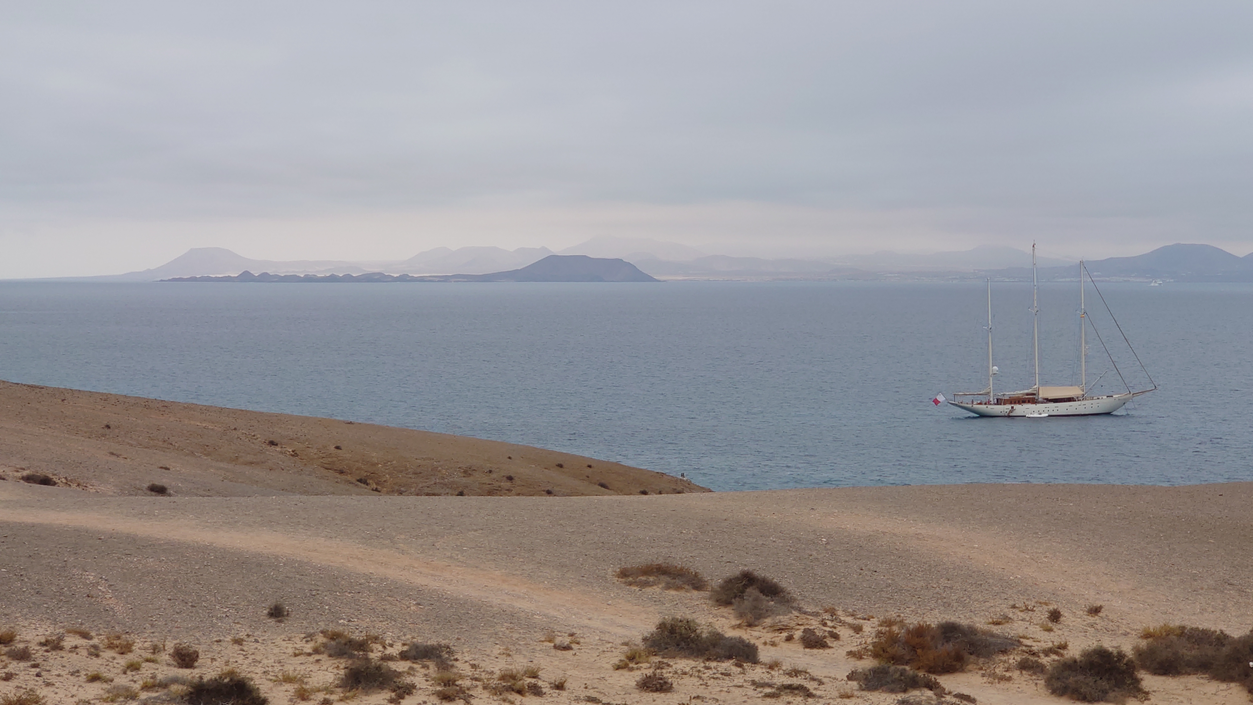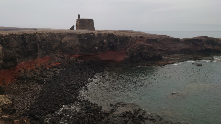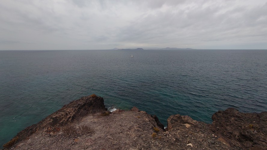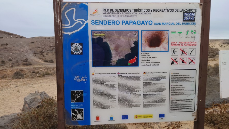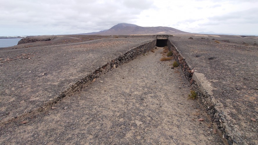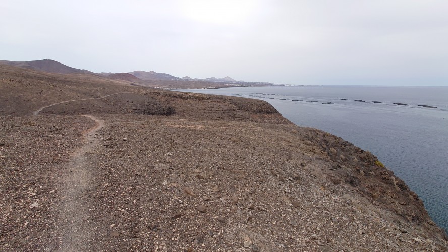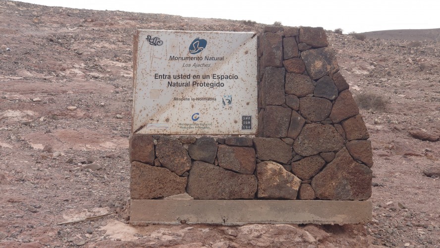 An größeren Stränden, hier und auch in Famara, sind mir immer wieder kleine Bunker aufgefallen, die mit ihren zwei Schießscharten die Bucht im Blick halten wie ein klobiges Beton-Beutetier. Überbleibsel eines Krieges. Nur welcher? Weltkrieg? Hier? Ein Wehrturm aus dem 18. Jahrhundert stand auch in Playa Blanca. Definitiv andere Epoche. Ein Hotspot von damals, der nicht leicht zu übersehen war.Die rostigen Stäbchen stecken ab und an auch wieder im Boden und endlich finde ich eins, auf dem noch das offizielle Zeichen klebt, das besagt, dass ich mich auf einer monumentalen Route befinde. Ich muss leoder feststellen: Wandermarkierungen und Wegweiser sind auf der Insel kaum zu gebrauchen. Sie stehen zwar hier und da gemeinsam mit total verwitterten Hinweisschildern herum, aber wir Wanderer sind offenkundig nicht das Zielpublikum mehr. So ist auch der GR 135 zwar seit 8 Jahren projektiert und mit den alten Zeichen in seiner Ausprägung auch schon da, aber suchen muss man ihn sich schlussendlich selbst... mitunter mit gefährlichen Sackgassen. Auch heute muss ich einen Abhang auf auf allen Vieren herunterrutschen wie auf Skiern, weil der Weg plötzlich einfach im Nichts verschwindet, weil ihn Jahre keiner mehr gegangen ist. Abhänge sind hier selten Fels und eher halb loses Geröll, das bei jeder Belastung sofort nachgibt. Aber so gelange ich in ein kleines Barranko, in dem eine bewundernswerte Kriechpflanze sei Unwesen treibt wie das Gestrüpp in Krieg der Welten, um Tennisballfrüchte zu erzeugen. Da soll man meinen, im Boden wäre kein Wasser. Da hat sich das Einstauben sogar gelohnt. Was solls, jede Bucht macht mich wieder sauber und so komme ich mach 10 Stunden im Zielort Playa Quemada an.