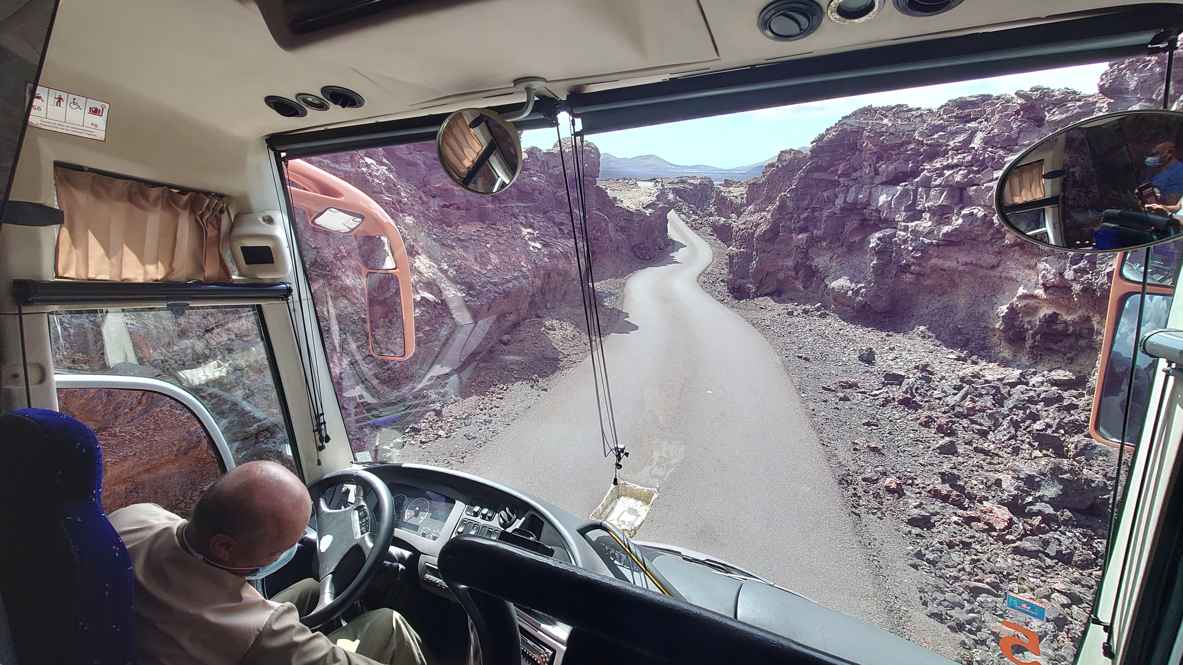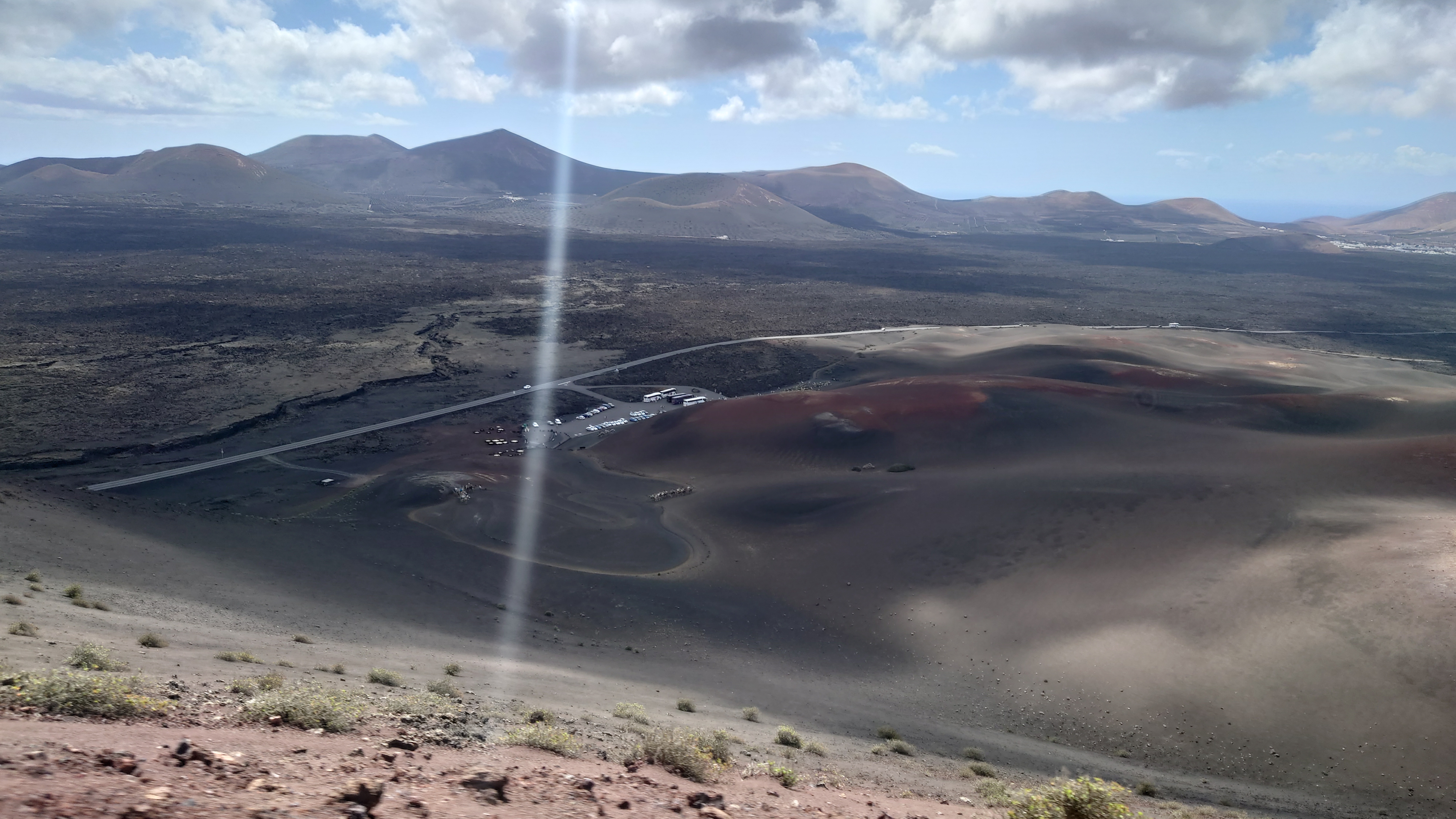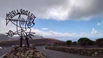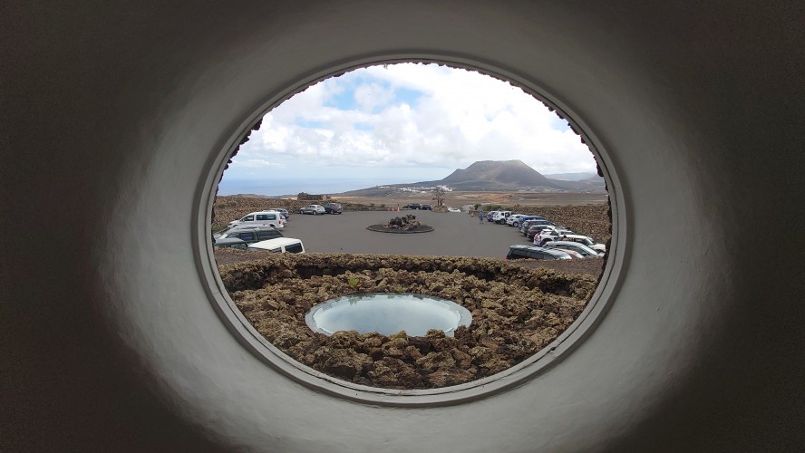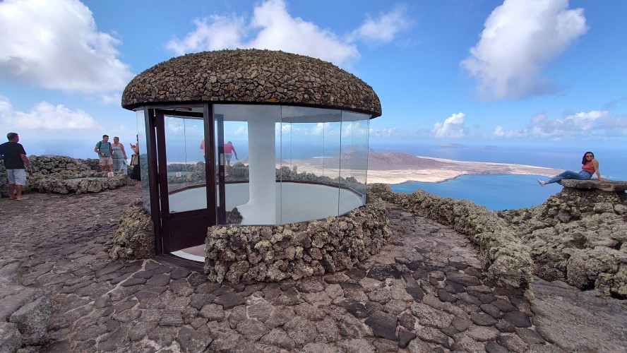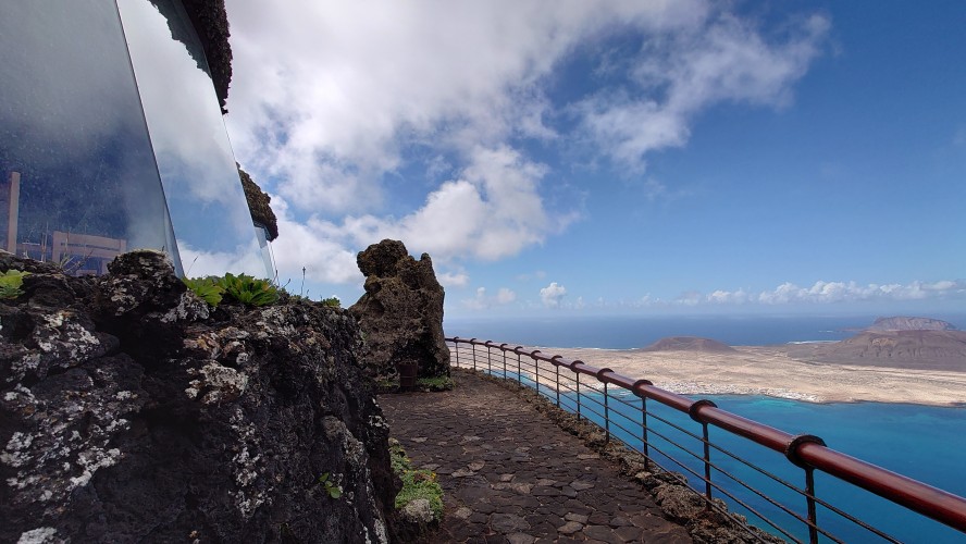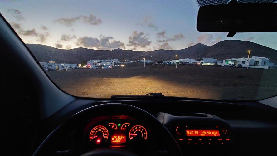 Damals haben wir ein paar Meter daneben geparkt, um uns den Eintritt zu sparen. Aber der Mirador klebt halt direkt auf dem Abgrund und es ist eine andere Nummer. Ein bisschen wehmütig werde ich, als ich den tropischen Strand auf der gegenüberliegenden Seite des Inselchens erspähen kann. Der ist unübertroffen. Trotzdem parke ich auch danach ein paar Meter daneben, um meiner eigenen Version von damals einen aktuellen Stand zu verselfien.Es ist halb 5 und mich zieht es zurück ins Hotel, noch einmal ins Saunaraumschiff gehen und ich würfle mich zurück in Richtung Arrecife an schräg klingenden Orten vorbei... Ye... Soo... Uga...