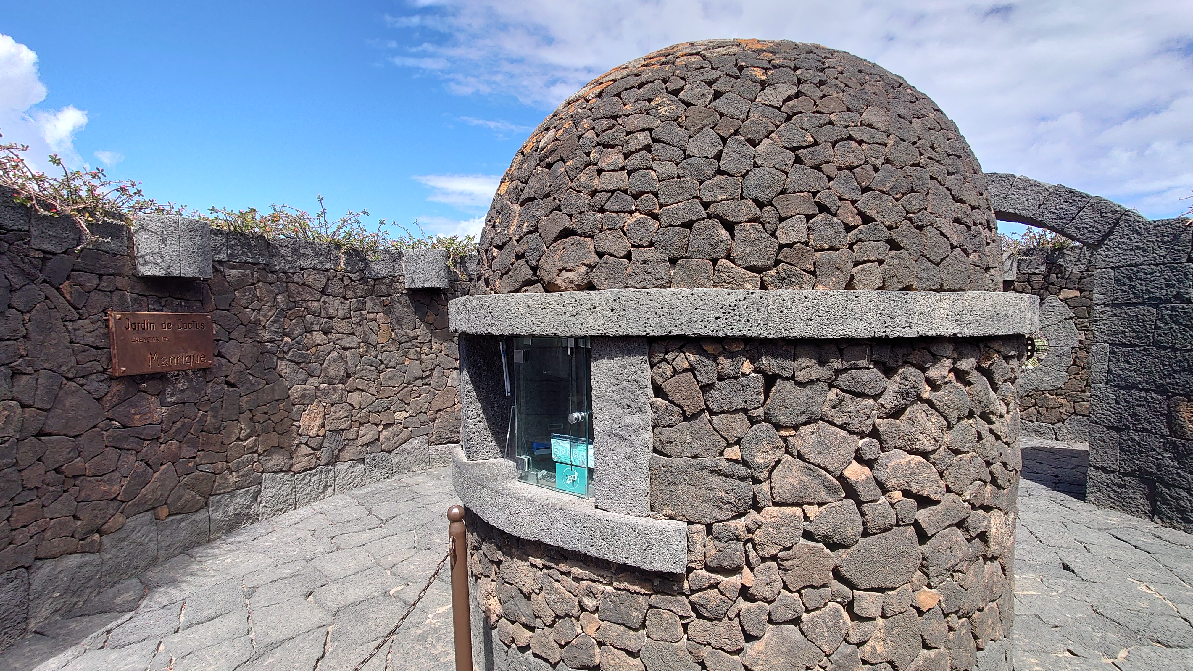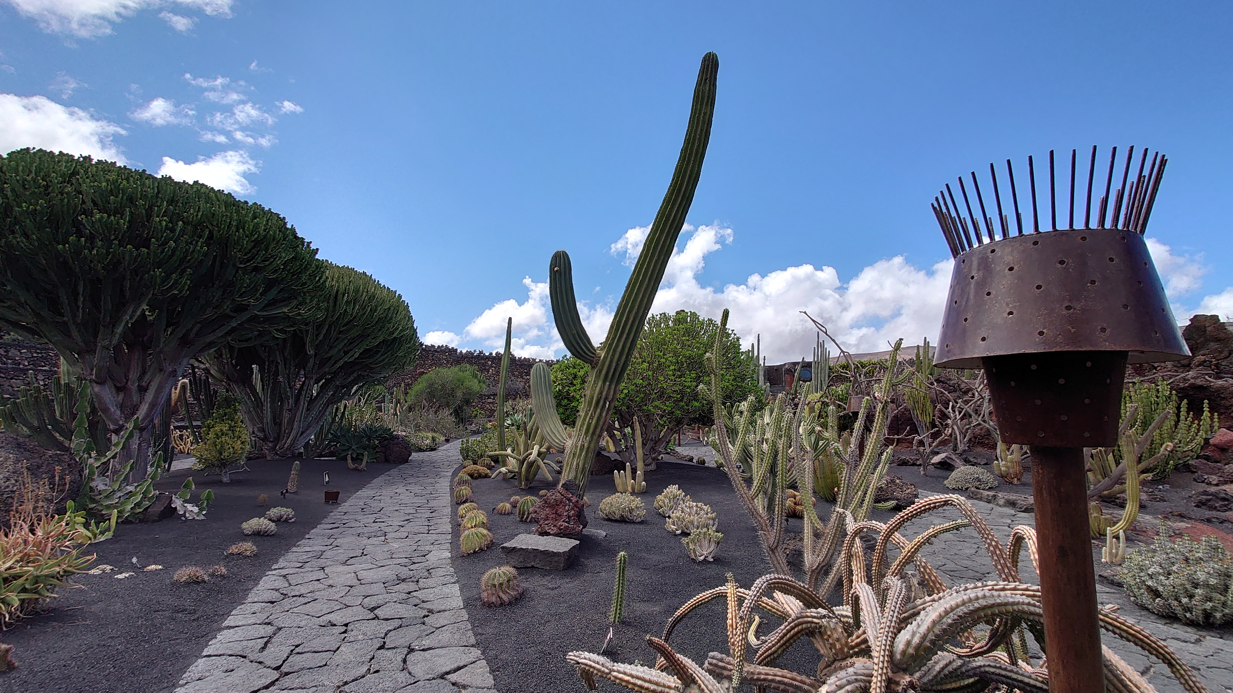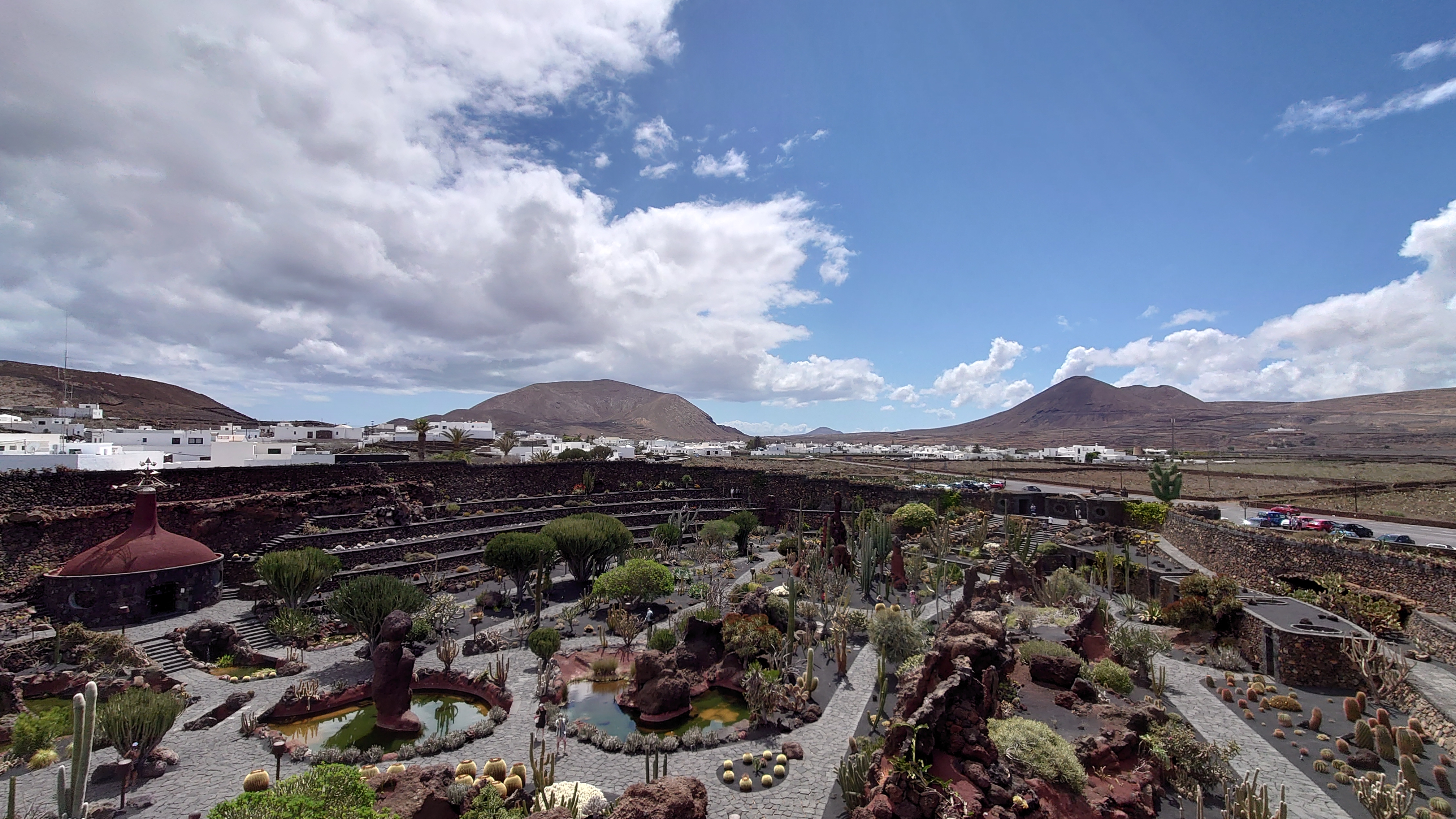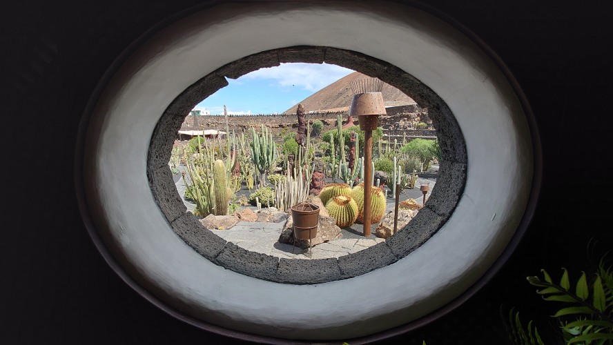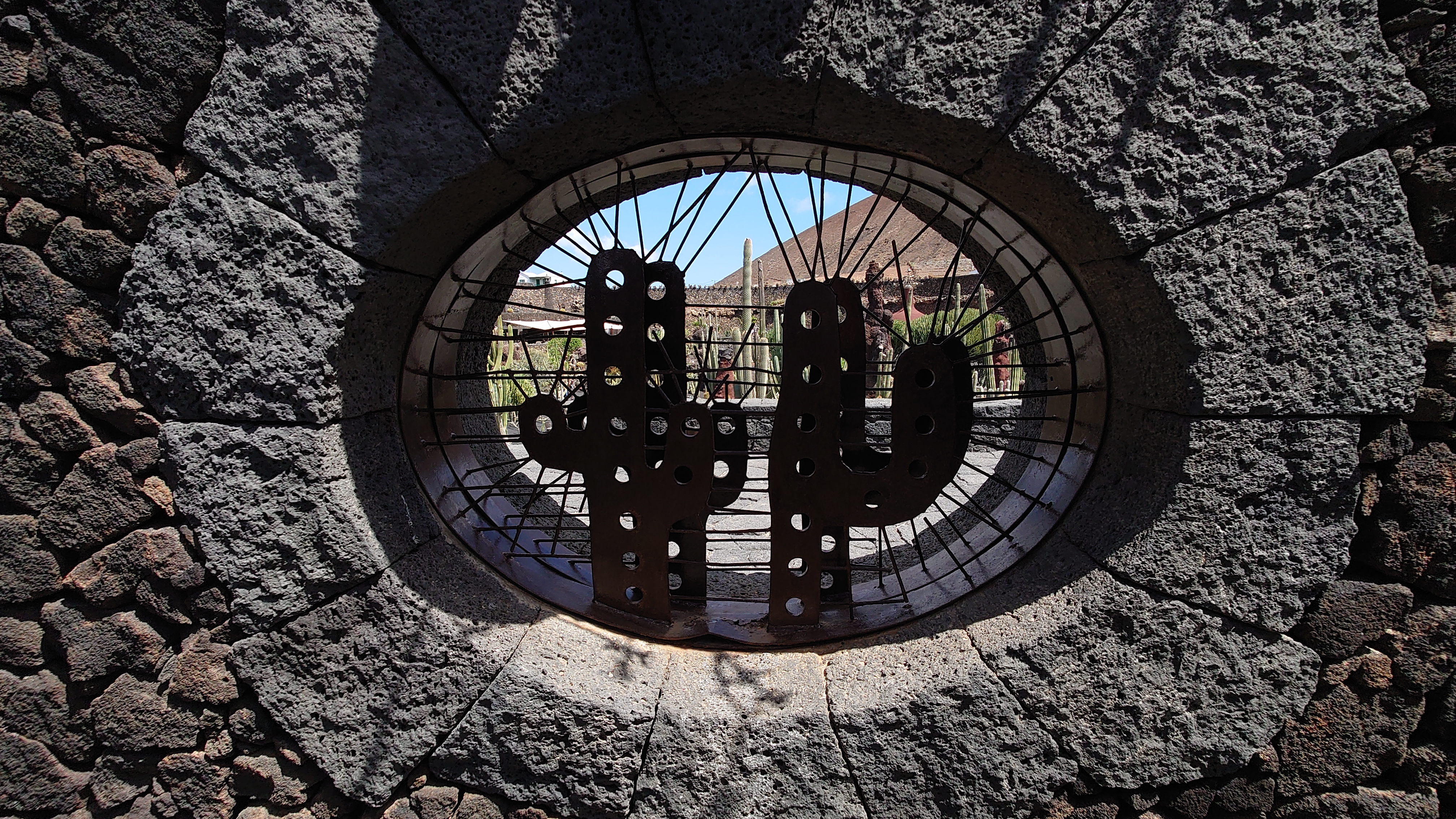 Und nu? Hm... da ist ein Ort namens Nazaret. Ich fahre nur hin, weil der Orr so heißt. Statt Jesus entdecke ich das Lagomar, das Ferienhaus von Omar Sharif. Leider geschlossen. Schade, da wäre doch wieder so ein heftig türkiser Pool drin gewesen. Also geht's weiter zur ehemaligen Inselhauptstadt Teguise. Sehr pittoresque mit dem Zwiebelturmkirchlein und dem Marktplatz, das von patschuli riechenden Art- und Nature Shops umgeben ist. Ich gehe mal in einen rein. Dachte ichs mir doch. Fernost-Ethno-Kram, den es auf jedem Weihnachtsmarkt genauso gibt. Kunst ist das nicht. Der Rest des Orts ist halt Ort... mit weißem Beton und grünen Fenstern as usual, also weiter. Einmal quer über den Kamm auf die Ostseite und schon bin ich beim Jardin de Cactus. Hier war ich vor 25 Jahren auch. Es ist mit die letzte Atteaktion, die Manrique vor seinem Tod noch ersonnen hat. Damals war es gerade eröffnet worden. Alle Kakteen waren ganz klein. Das hat sich sehr geändert und ich muss sagen, es ist die bisher eindrucksvollste Kreation des Künstlers und durch und durch stimmig. Tolle Pflanzen kann man in diesem ovalen Hitzekessel bestaunen. Über eine Stunde lichte ich viele spannende Gewächse ab, bis ich schweißnass weiter fahre, denn zum Mirador del Rio ist es von hier jetzt auch nicht mehr weit. Zack, stehe ich wieder vor einem Manrique-Monument, das für ne schmale Mark einen wirklich wirklich beeindruckenden Blick auf ganz La Graciosa und die Famara-Steilküste samt abgerundeter Skybar liefert.