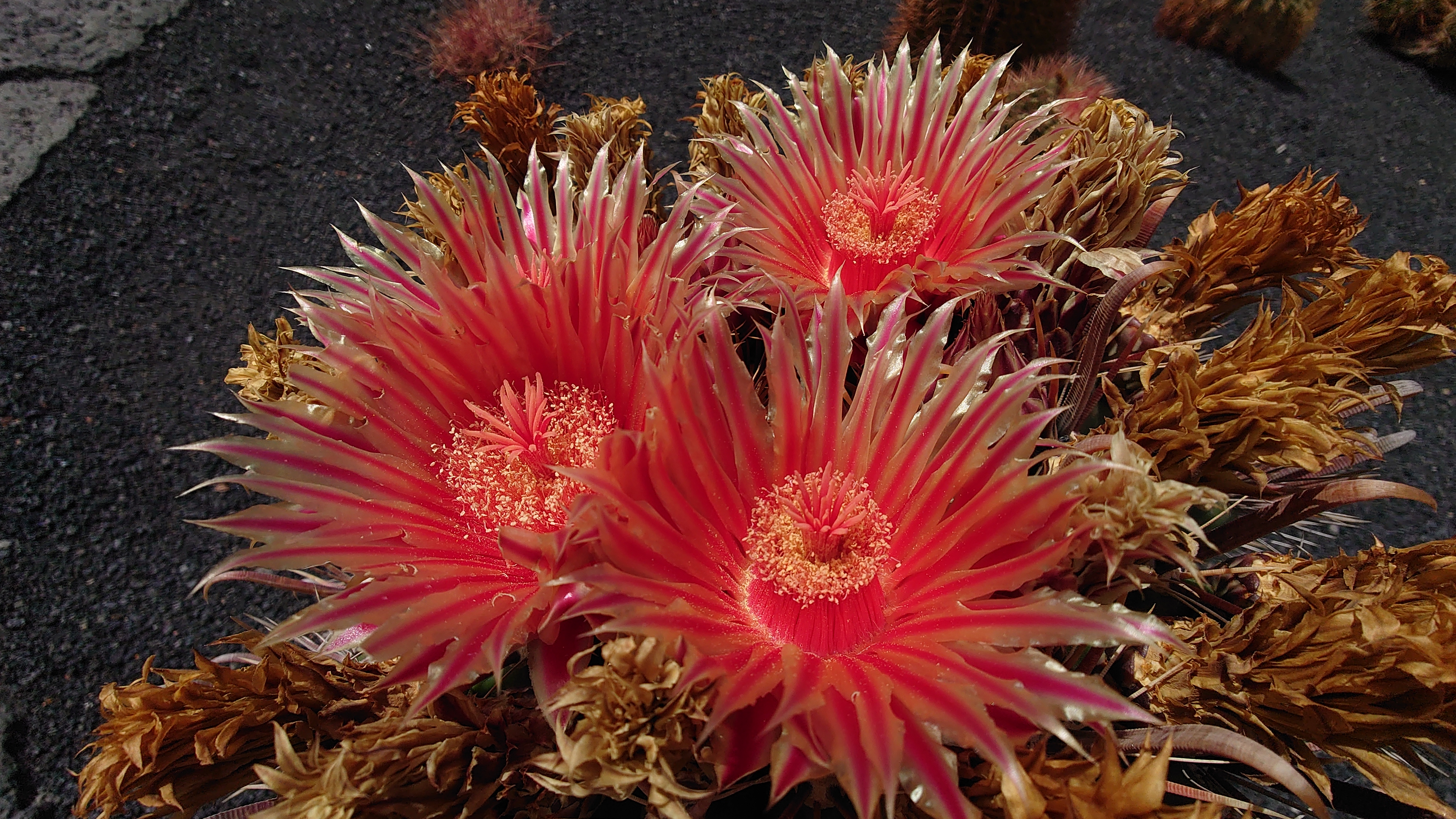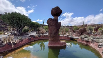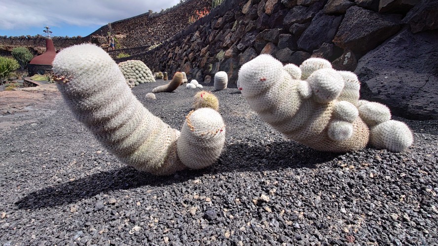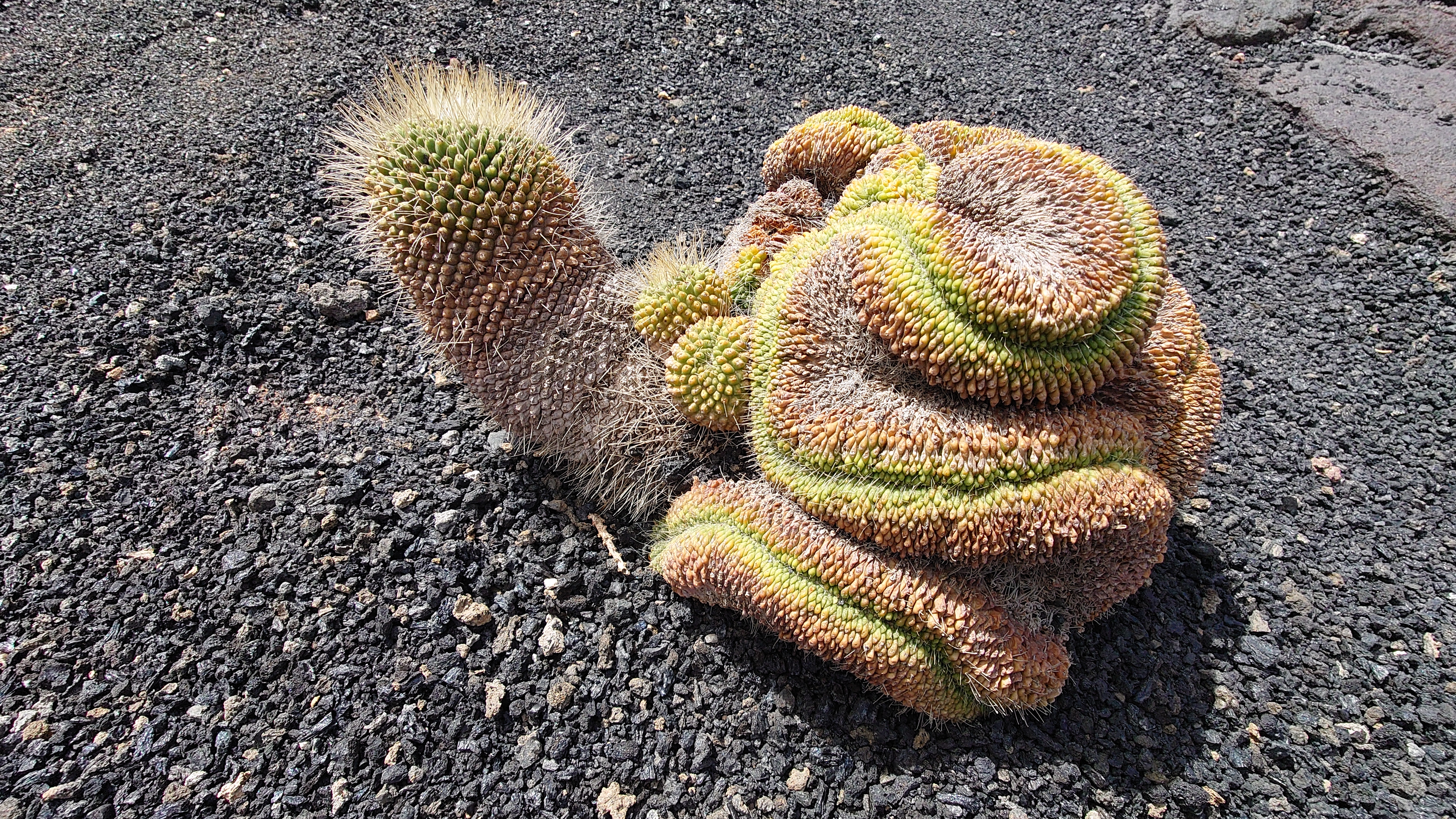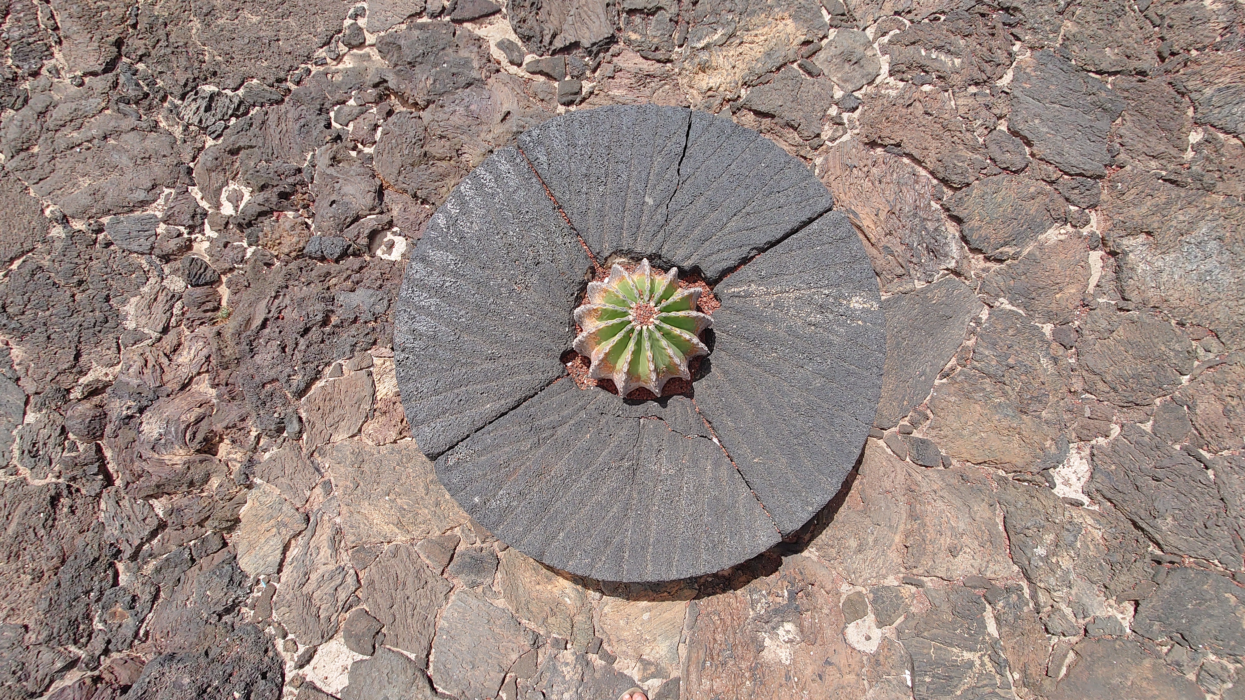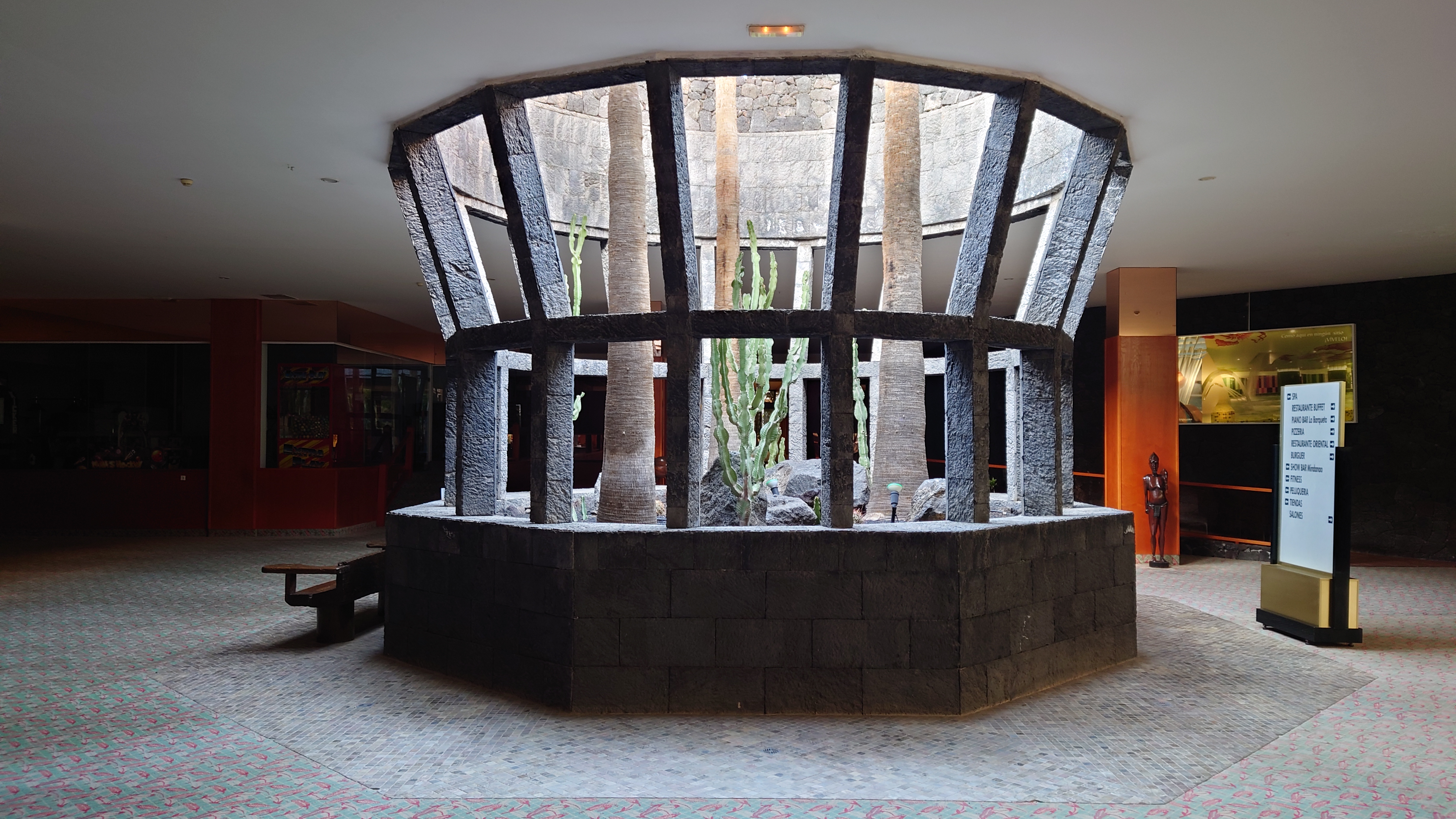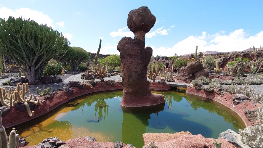 Und nu? Hm... da ist ein Ort namens Nazaret. Ich fahre nur hin, weil der Orr so heißt. Statt Jesus entdecke ich das Lagomar, das Ferienhaus von Omar Sharif. Leider geschlossen. Schade, da wäre doch wieder so ein heftig türkiser Pool drin gewesen. Also geht's weiter zur ehemaligen Inselhauptstadt Teguise. Sehr pittoresque mit dem Zwiebelturmkirchlein und dem Marktplatz, das von patschuli riechenden Art- und Nature Shops umgeben ist. Ich gehe mal in einen rein. Dachte ichs mir doch. Fernost-Ethno-Kram, den es auf jedem Weihnachtsmarkt genauso gibt. Kunst ist das nicht. Der Rest des Orts ist halt Ort... mit weißem Beton und grünen Fenstern as usual, also weiter. Einmal quer über den Kamm auf die Ostseite und schon bin ich beim Jardin de Cactus. Hier war ich vor 25 Jahren auch. Es ist mit die letzte Atteaktion, die Manrique vor seinem Tod noch ersonnen hat. Damals war es gerade eröffnet worden. Alle Kakteen waren ganz klein. Das hat sich sehr geändert und ich muss sagen, es ist die bisher eindrucksvollste Kreation des Künstlers und durch und durch stimmig. Tolle Pflanzen kann man in diesem ovalen Hitzekessel bestaunen. Über eine Stunde lichte ich viele spannende Gewächse ab, bis ich schweißnass weiter fahre, denn zum Mirador del Rio ist es von hier jetzt auch nicht mehr weit. Zack, stehe ich wieder vor einem Manrique-Monument, das für ne schmale Mark einen wirklich wirklich beeindruckenden Blick auf ganz La Graciosa und die Famara-Steilküste samt abgerundeter Skybar liefert.